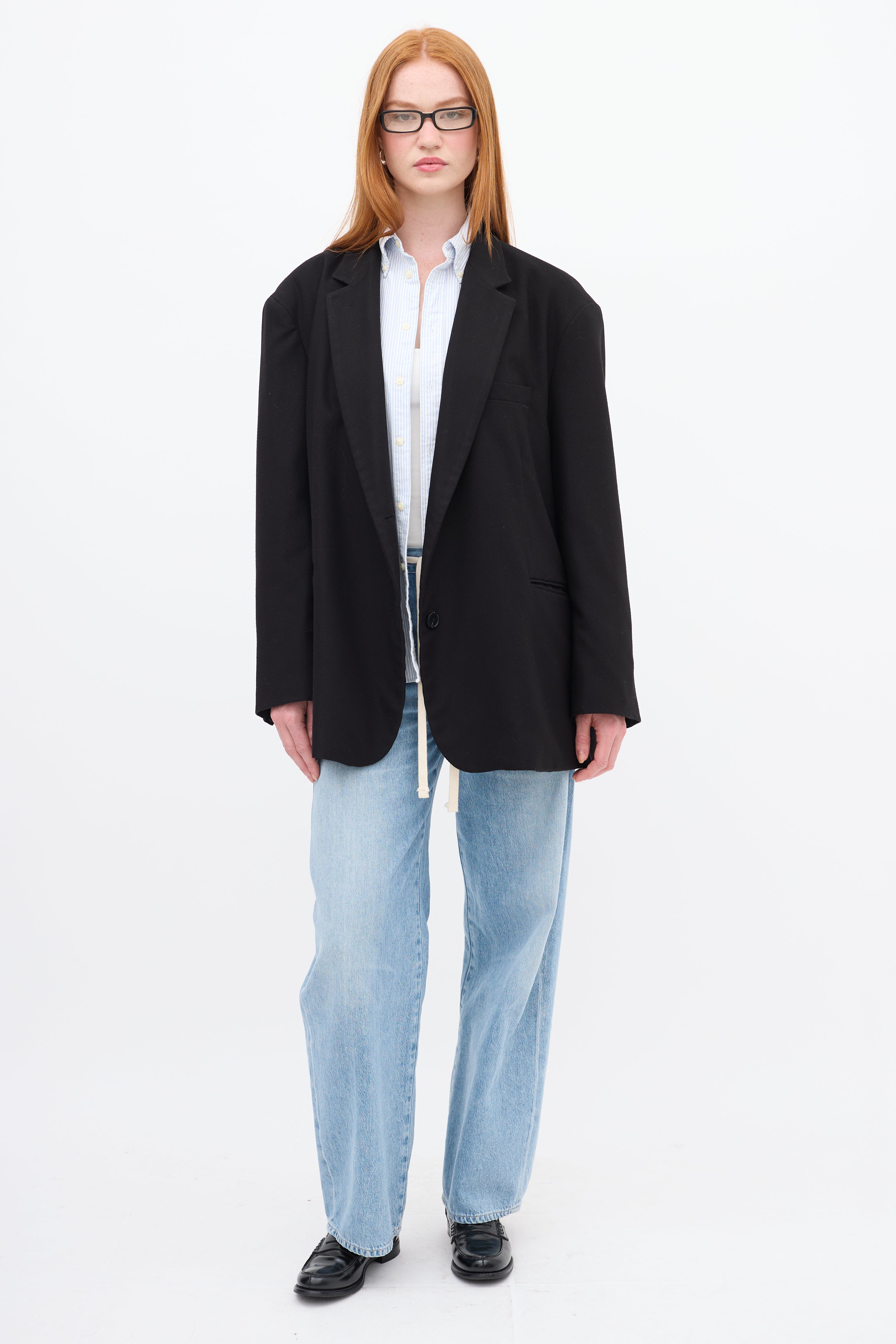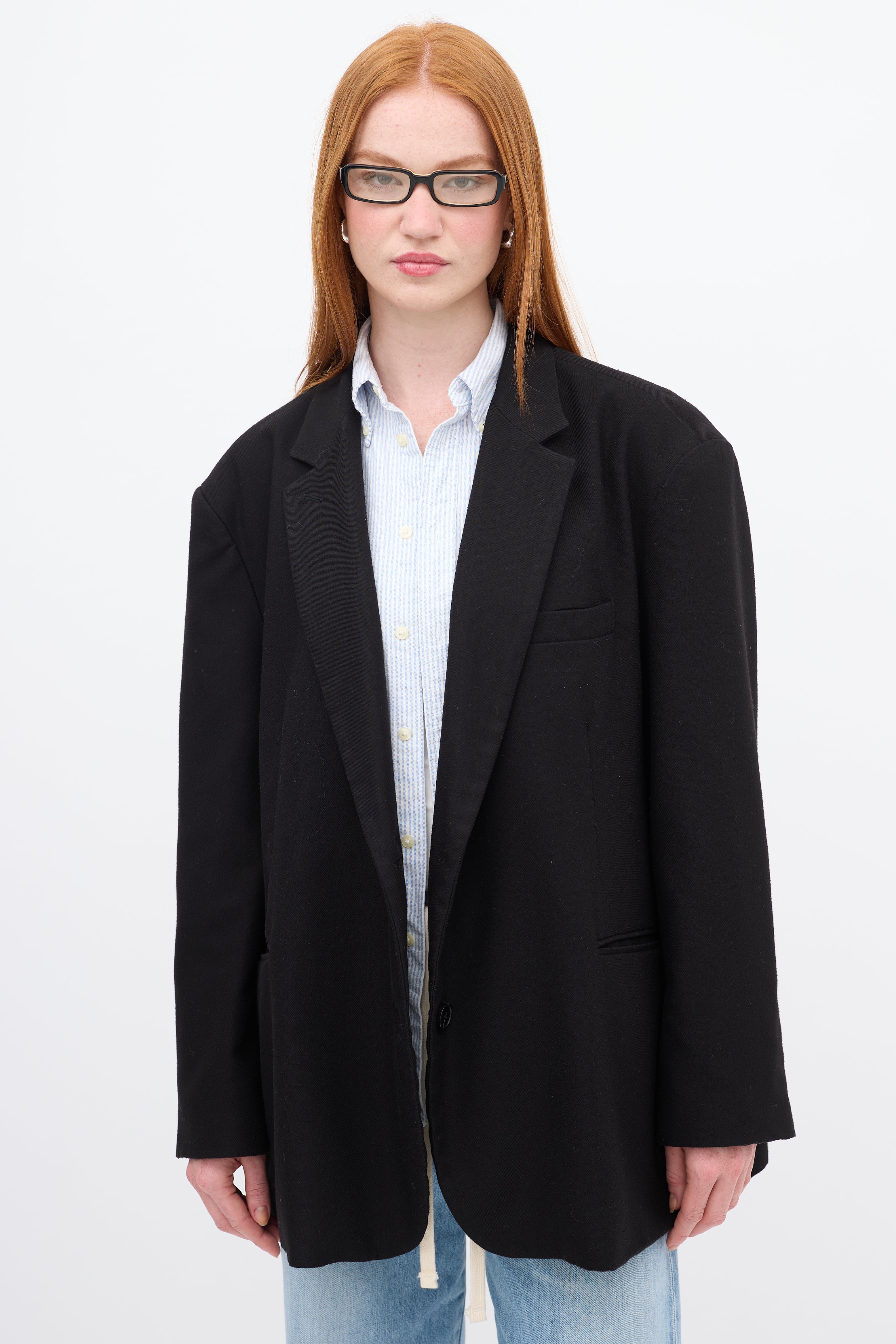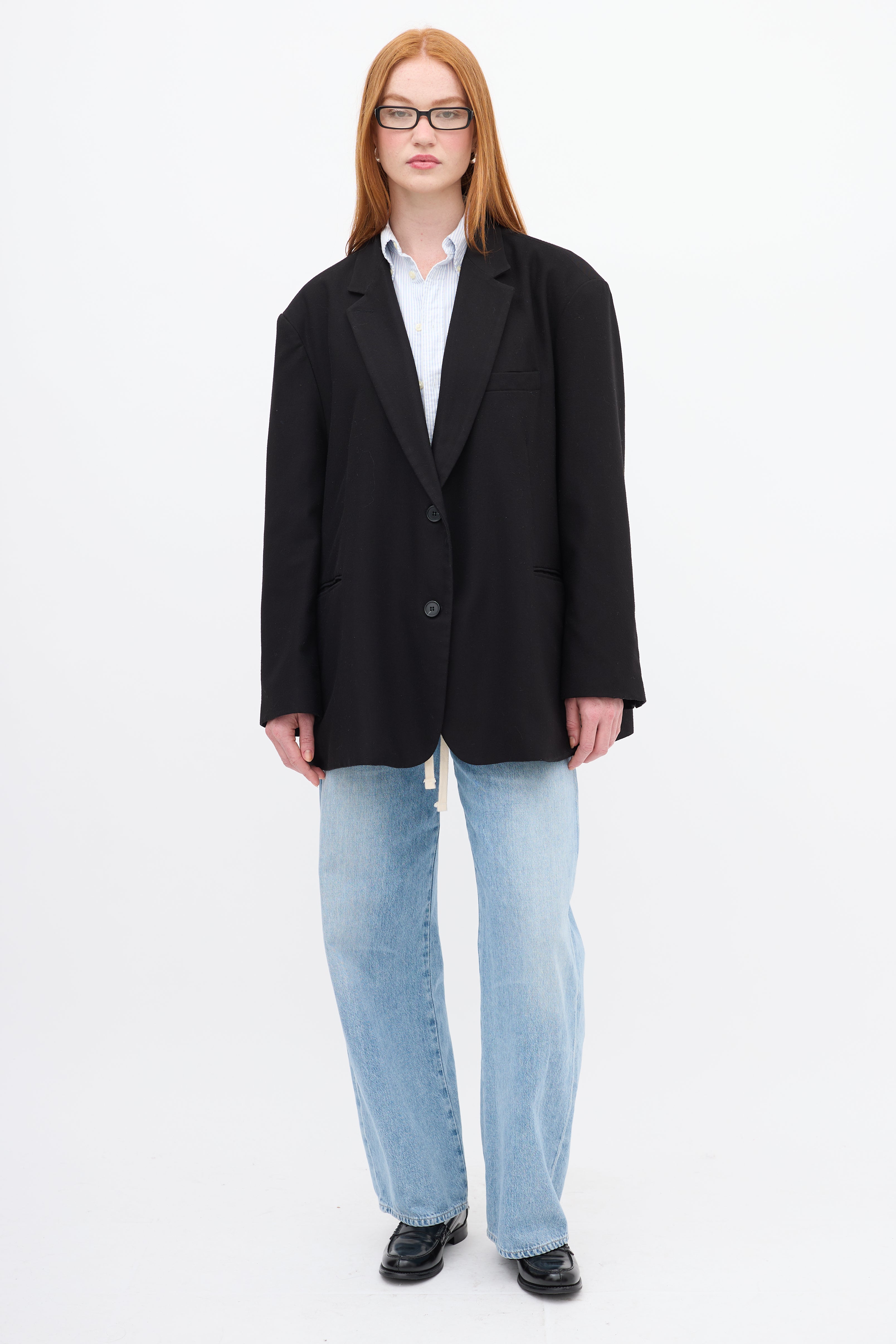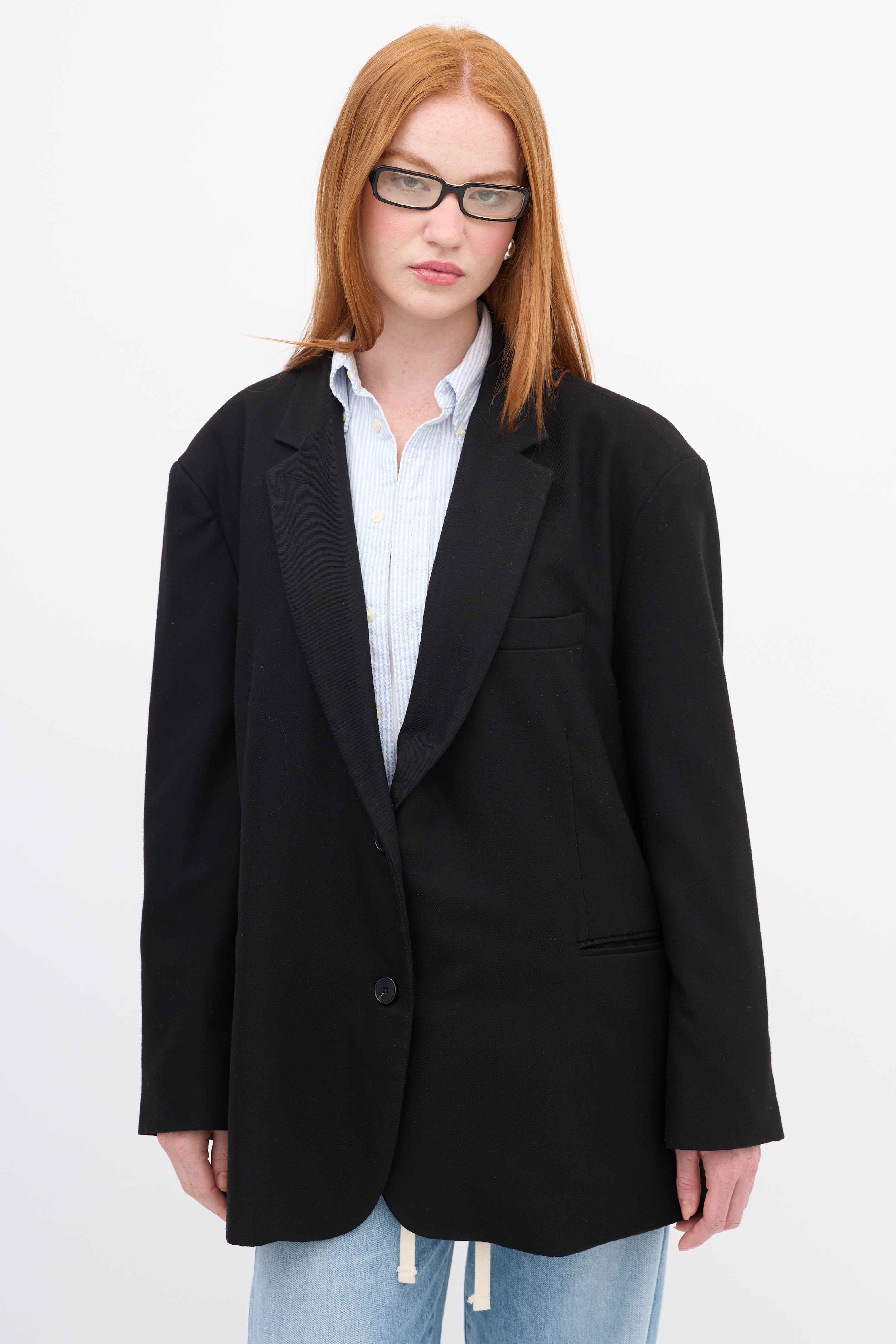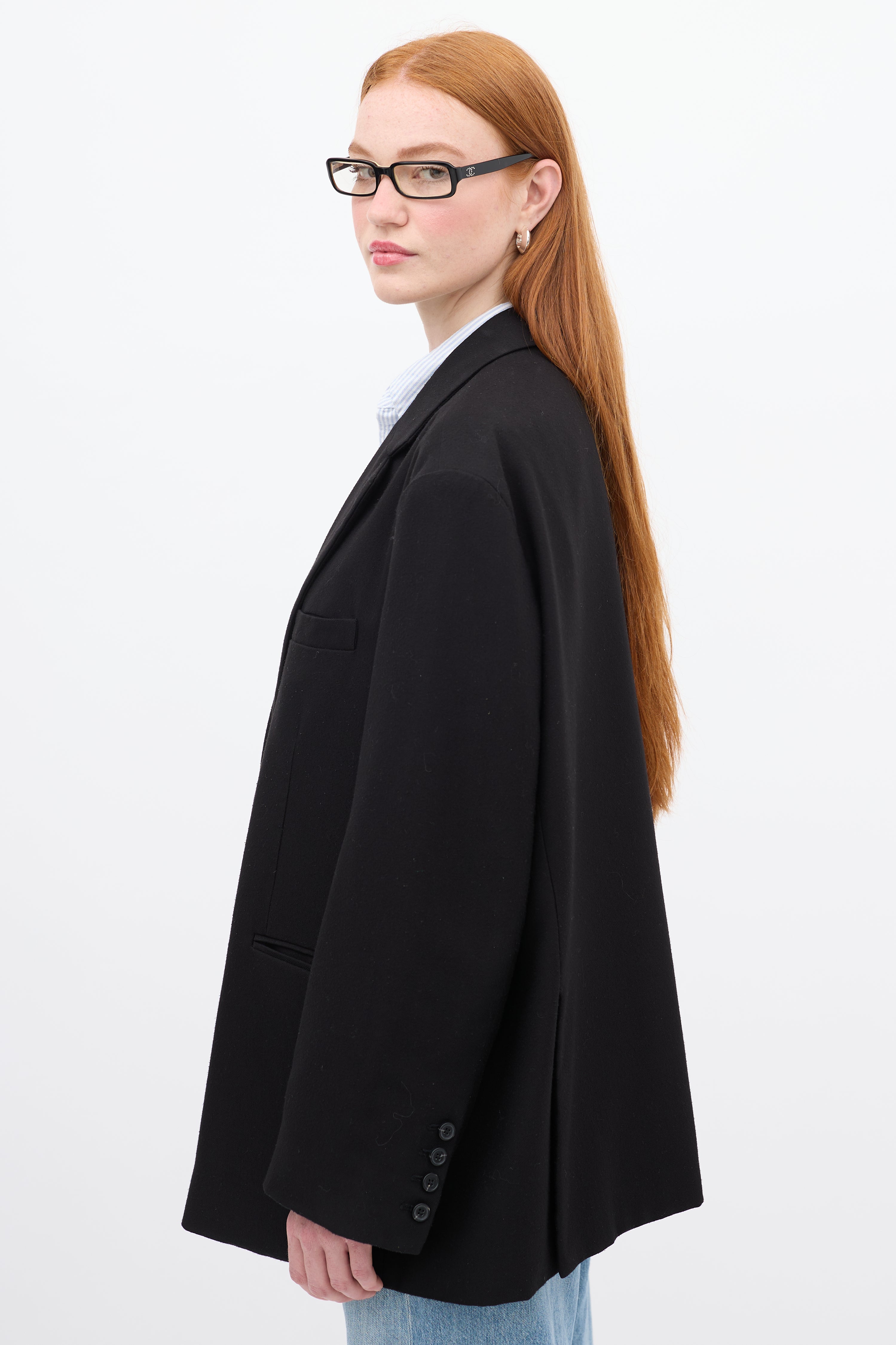 Pre-owned The Frankie Shop black Oversized Boyfriend blazer featuring a notched collar, button up front, one welt pocket at left chest, two flap welt pockets at front hip, back double vent, padded shoulders, and long sleeves with buttoned cuffs. Lined.