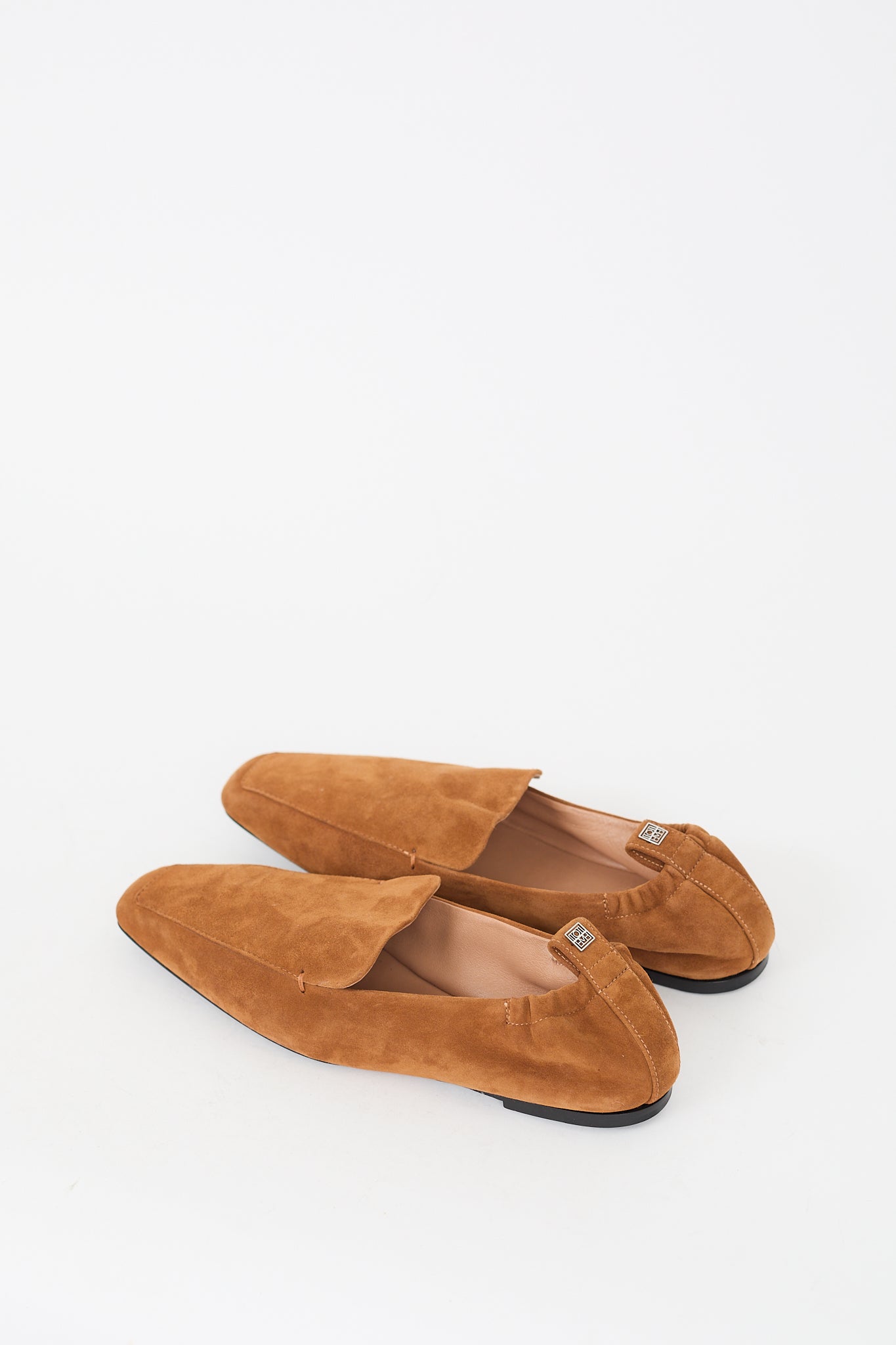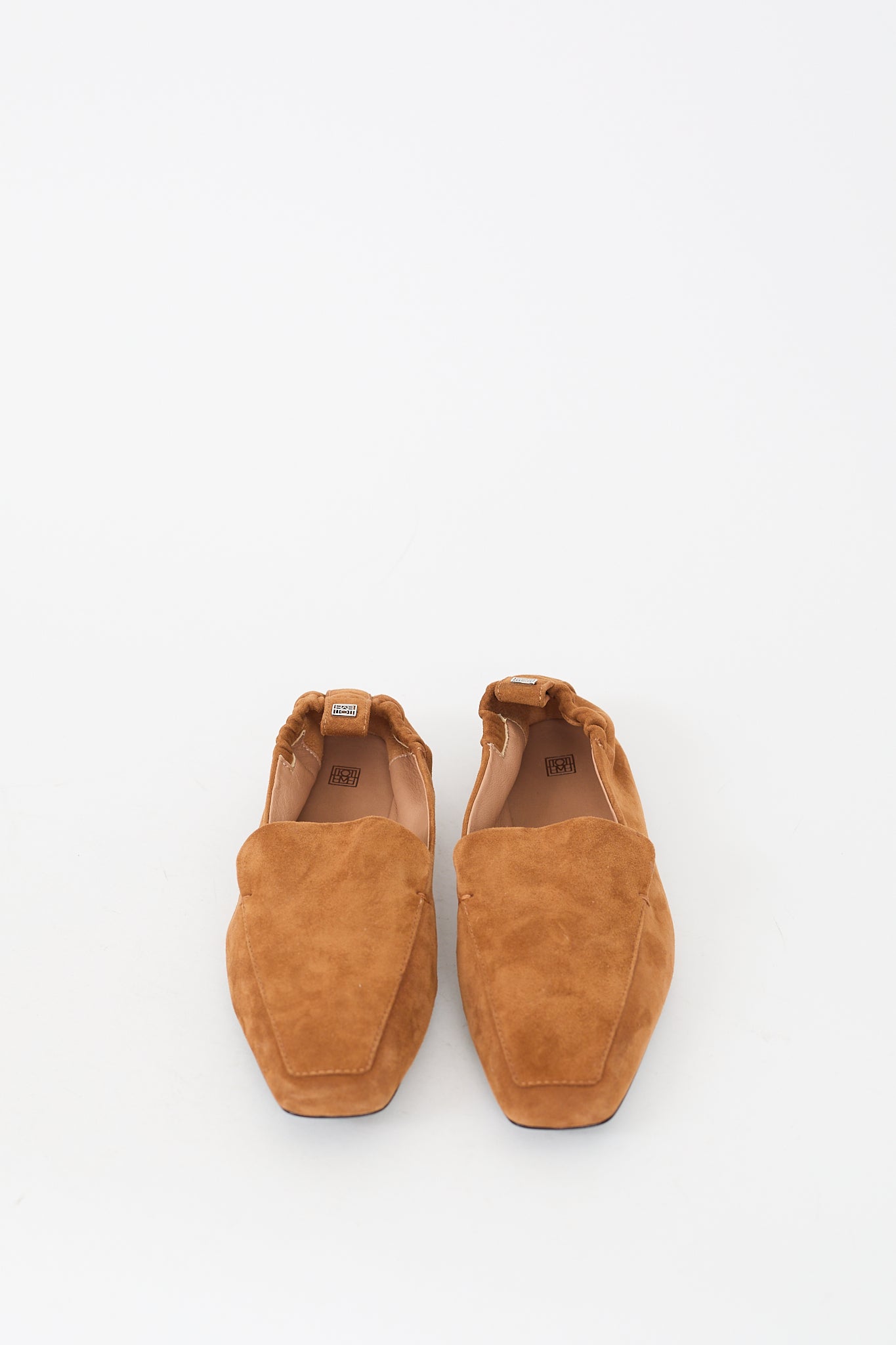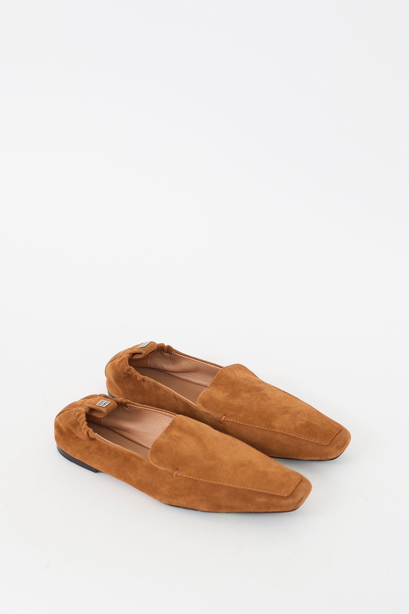 Pre-owned Toteme brown suede flats featuring a square toe, stacked heel, and elasticized collar with silver tone logo hardware. Comes with original dust bag.