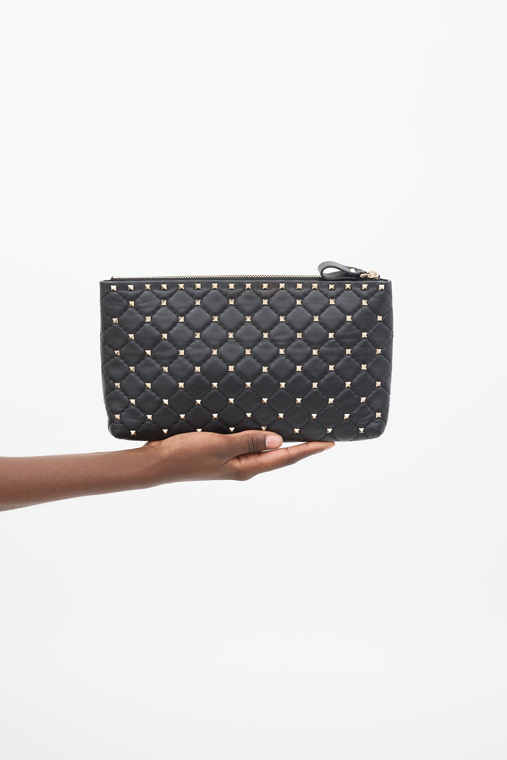 Pre-owned Valentino black quilted leather clutch featuring flat handle at one side, silver tone Rockstud embellishments throughout body and handle, top zip, and one main compartment with one zip pockets and two slip pockets. Comes with original dust bag.