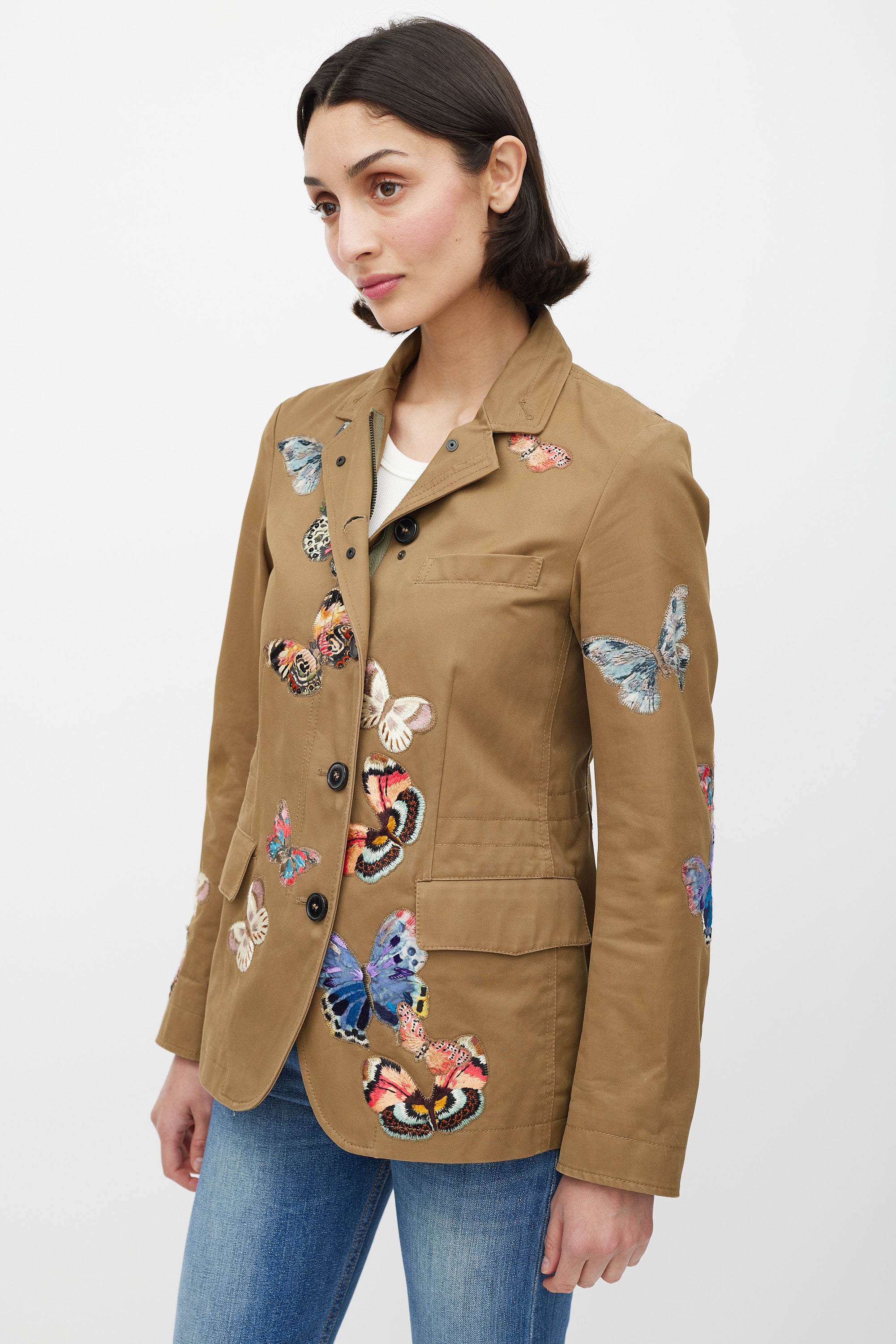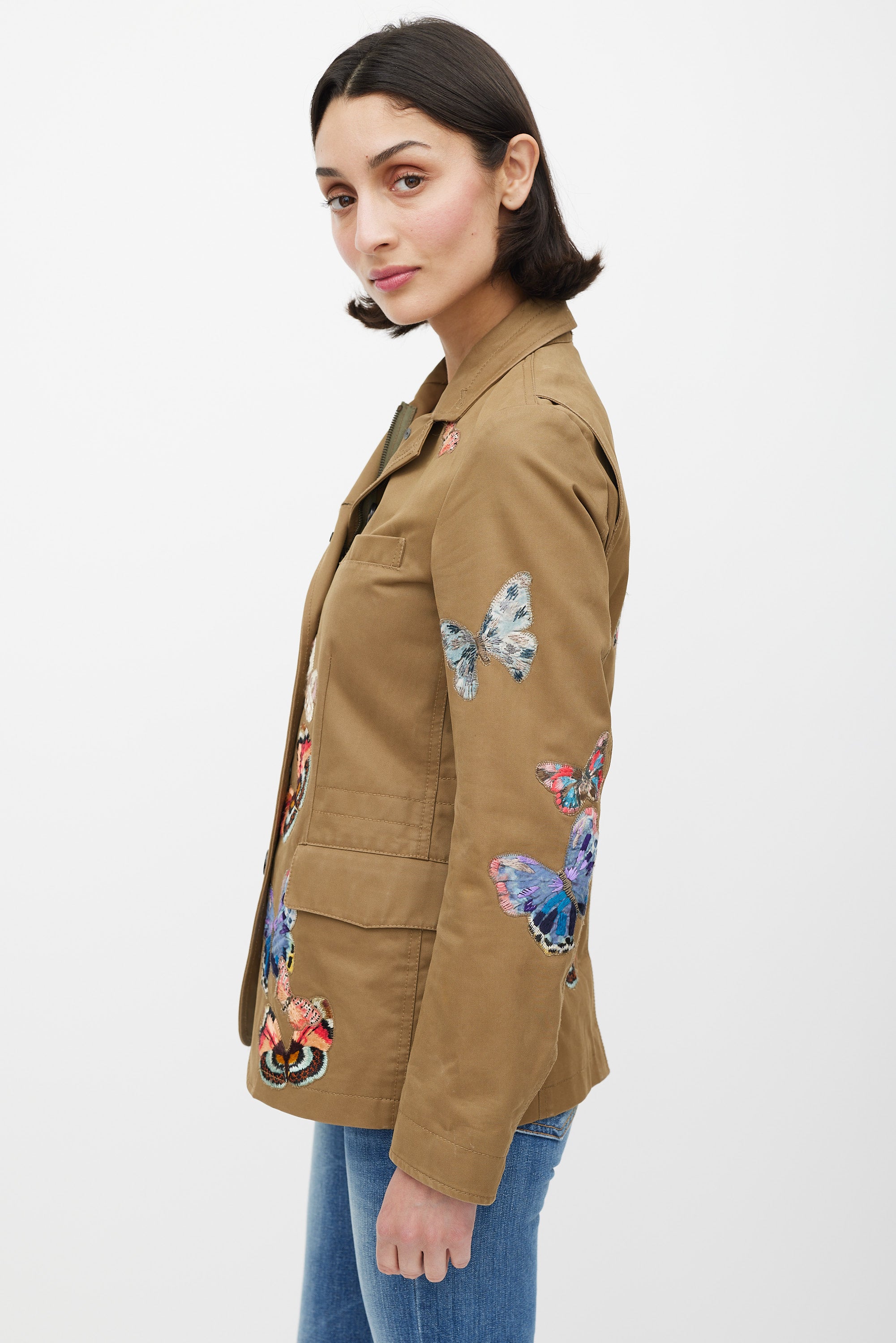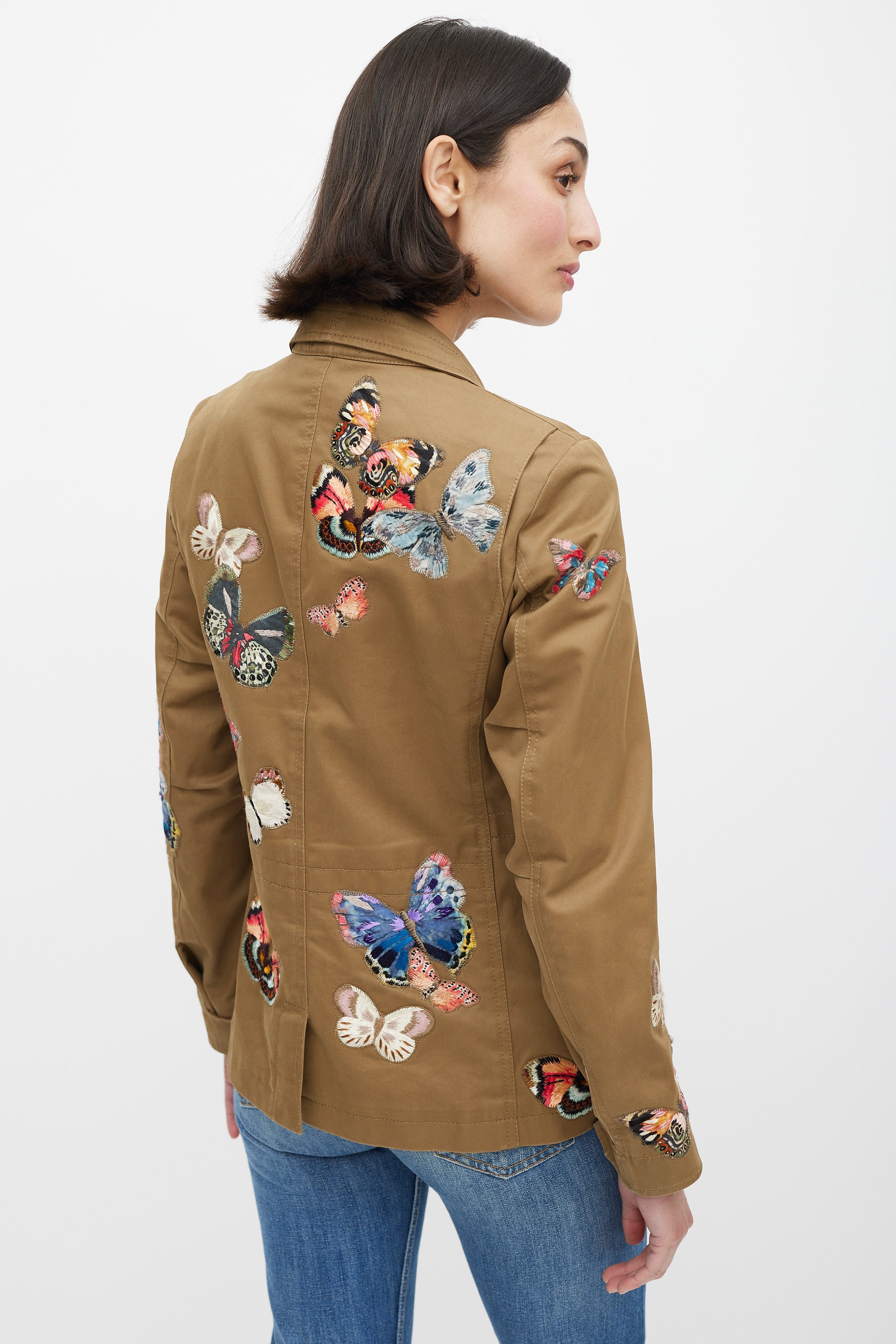 Pre-owned Valentino khaki green cotton jacket featuring multicolour embroidered butterfly motif patches throughout, collared neck, concealed double zip and button up front, slip pocket at left chest, two front flap pockets, back vent, and long sleeves with velcro cuffs. Lined.