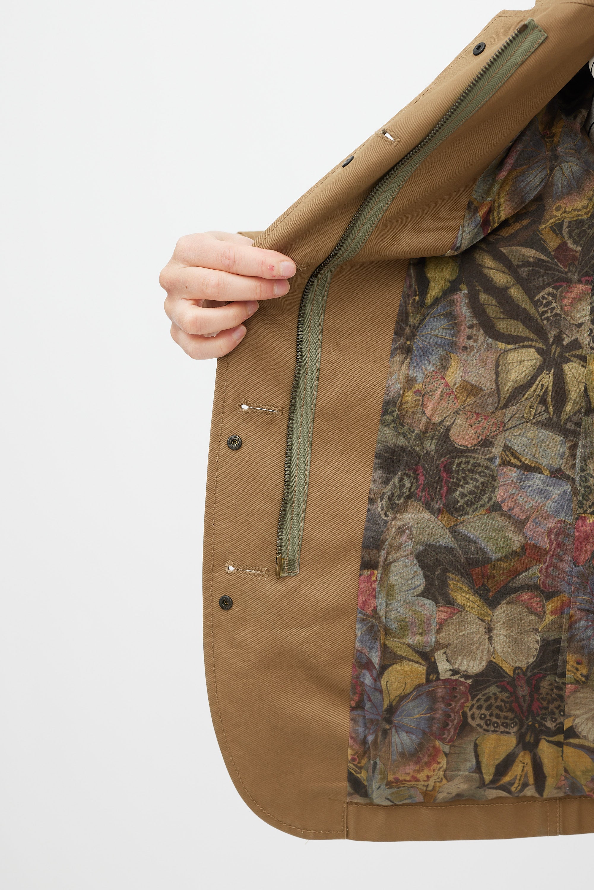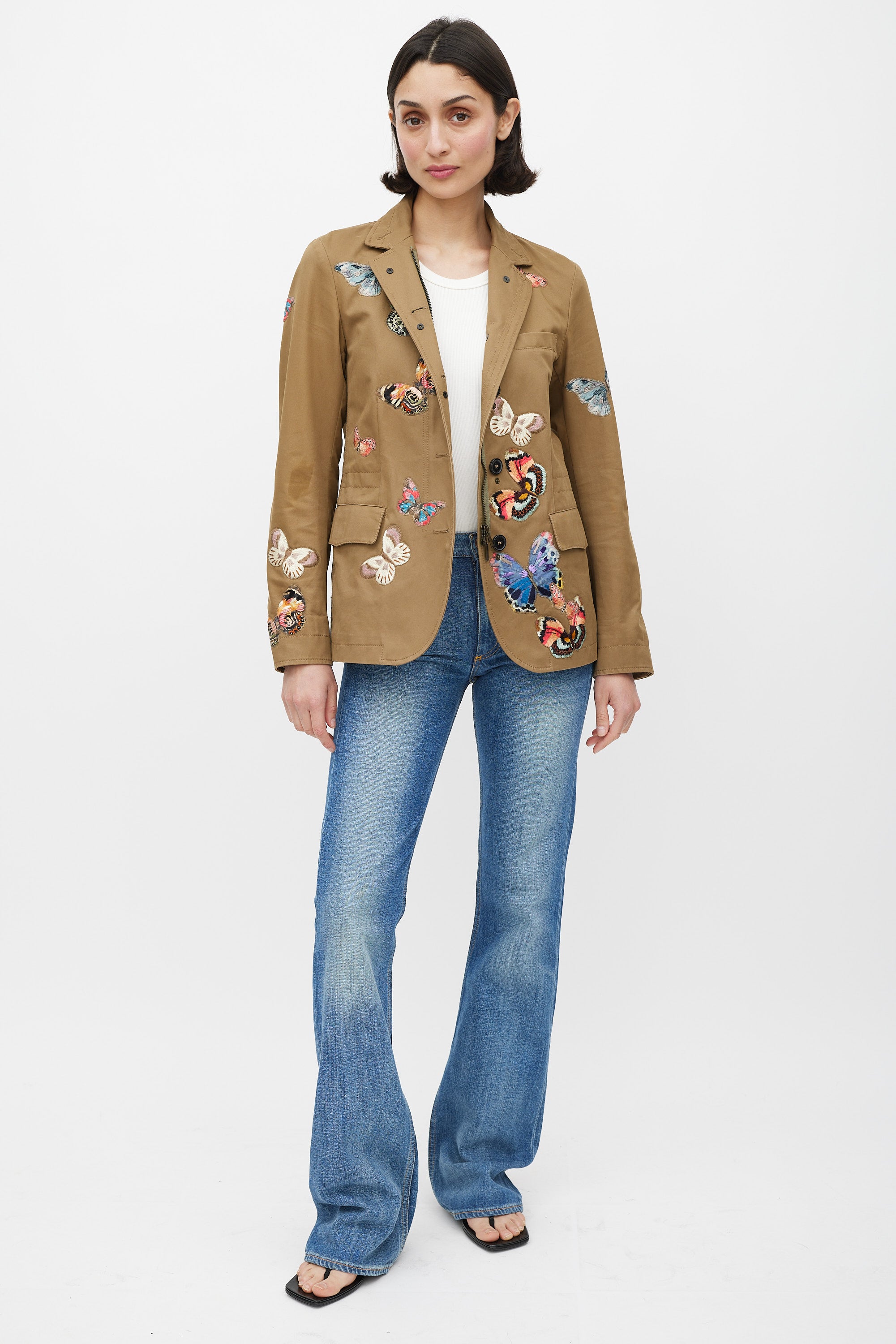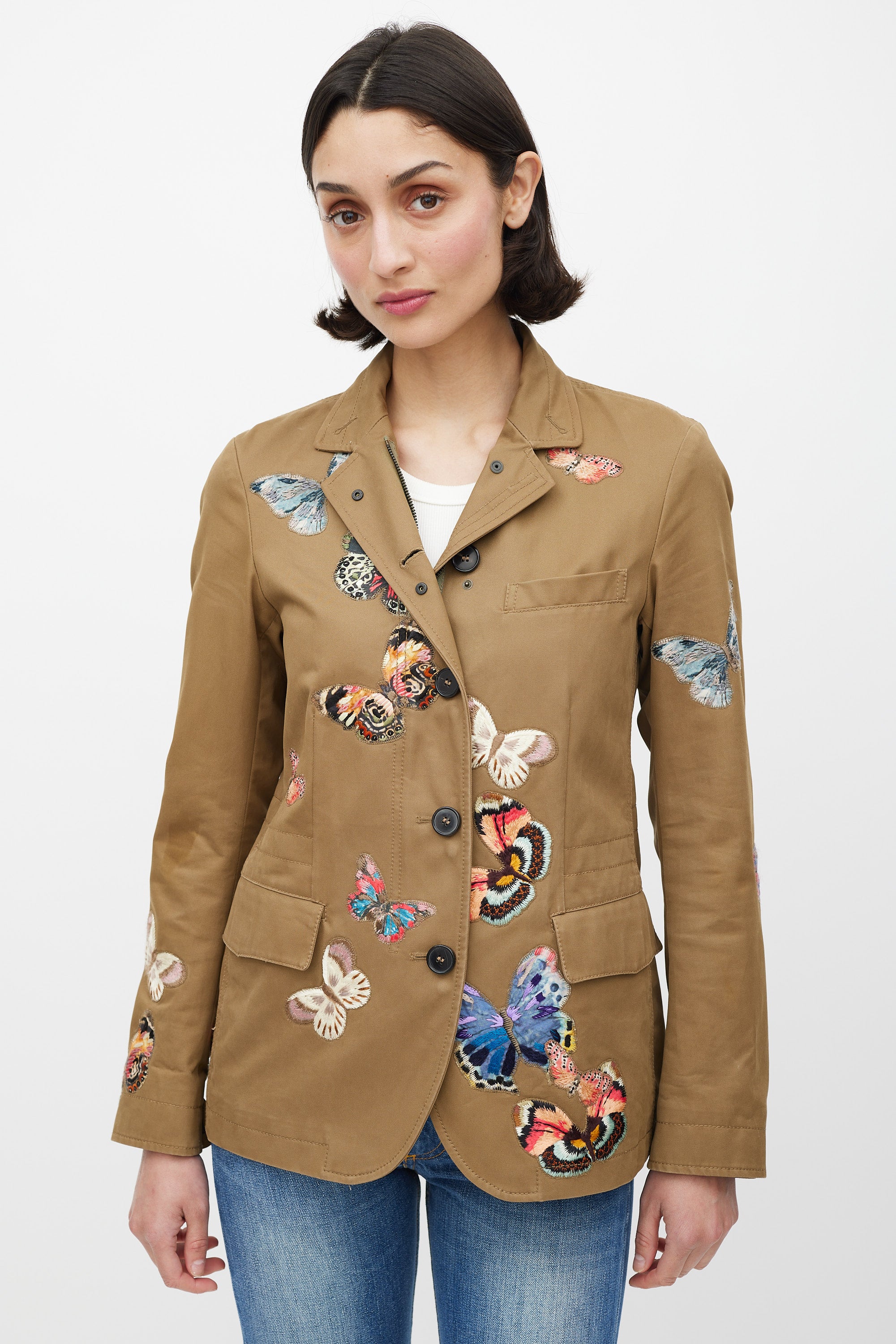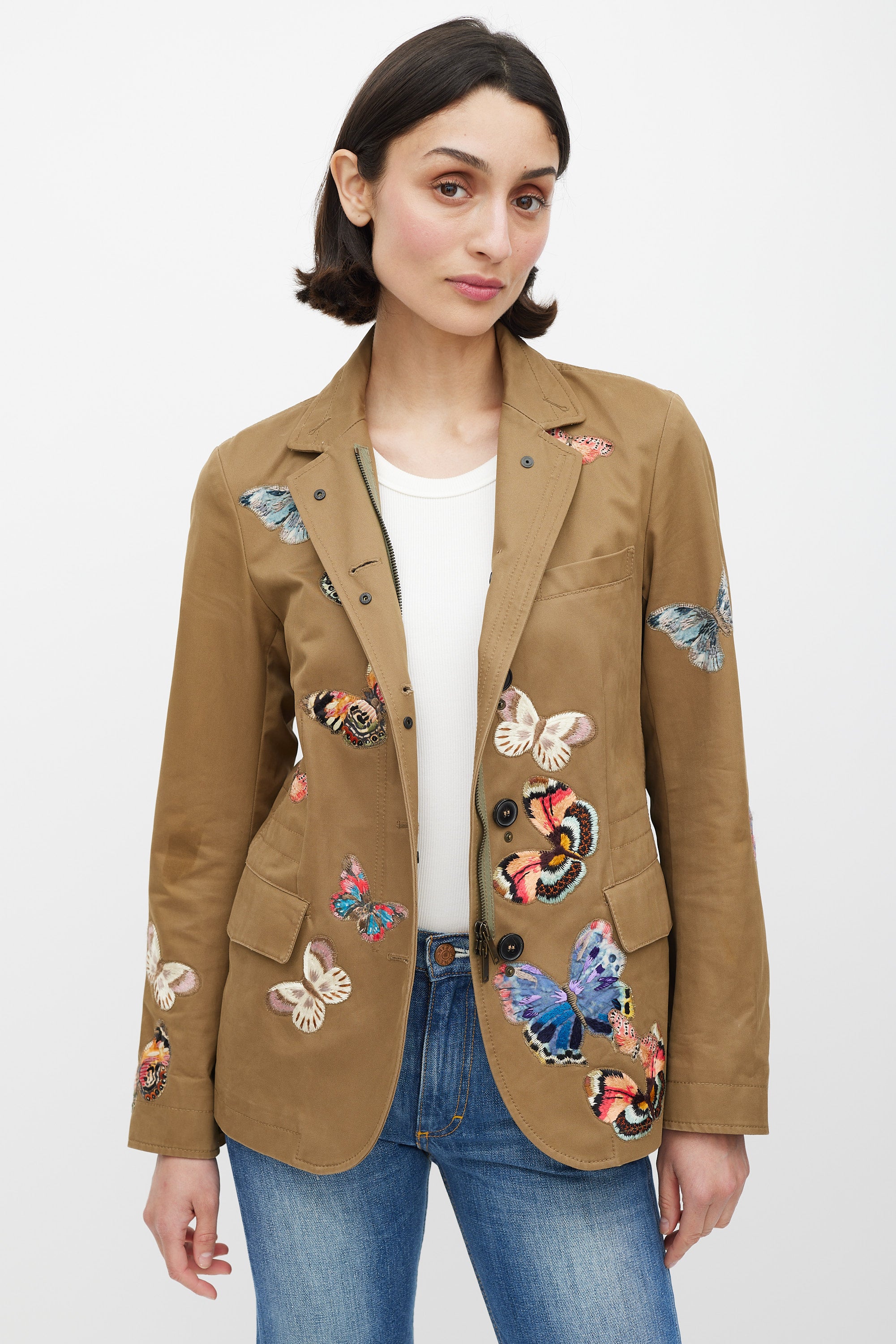 Pre-owned Valentino khaki green cotton jacket featuring multicolour embroidered butterfly motif patches throughout, collared neck, concealed double zip and button up front, slip pocket at left chest, two front flap pockets, back vent, and long sleeves with velcro cuffs. Lined.