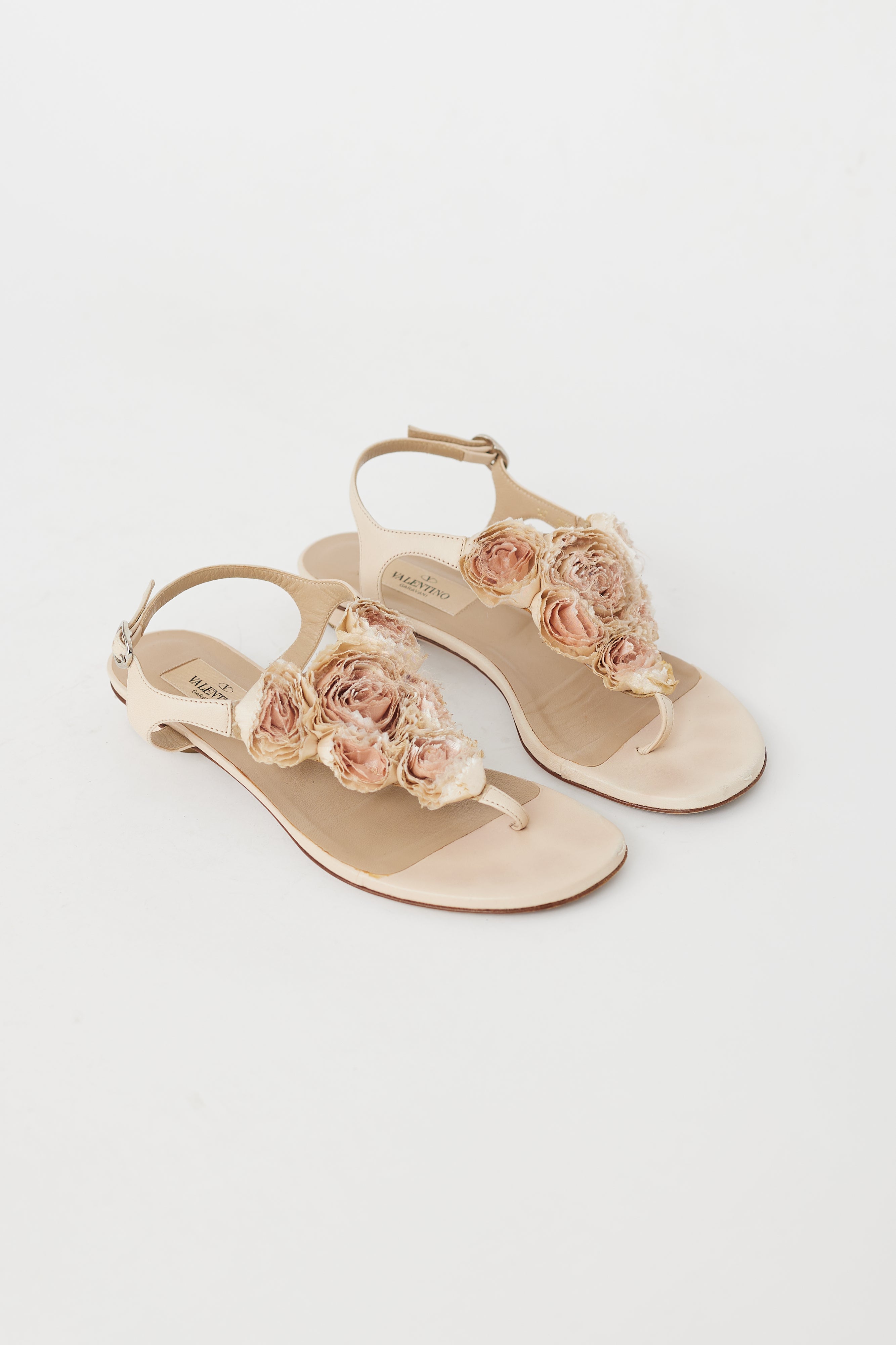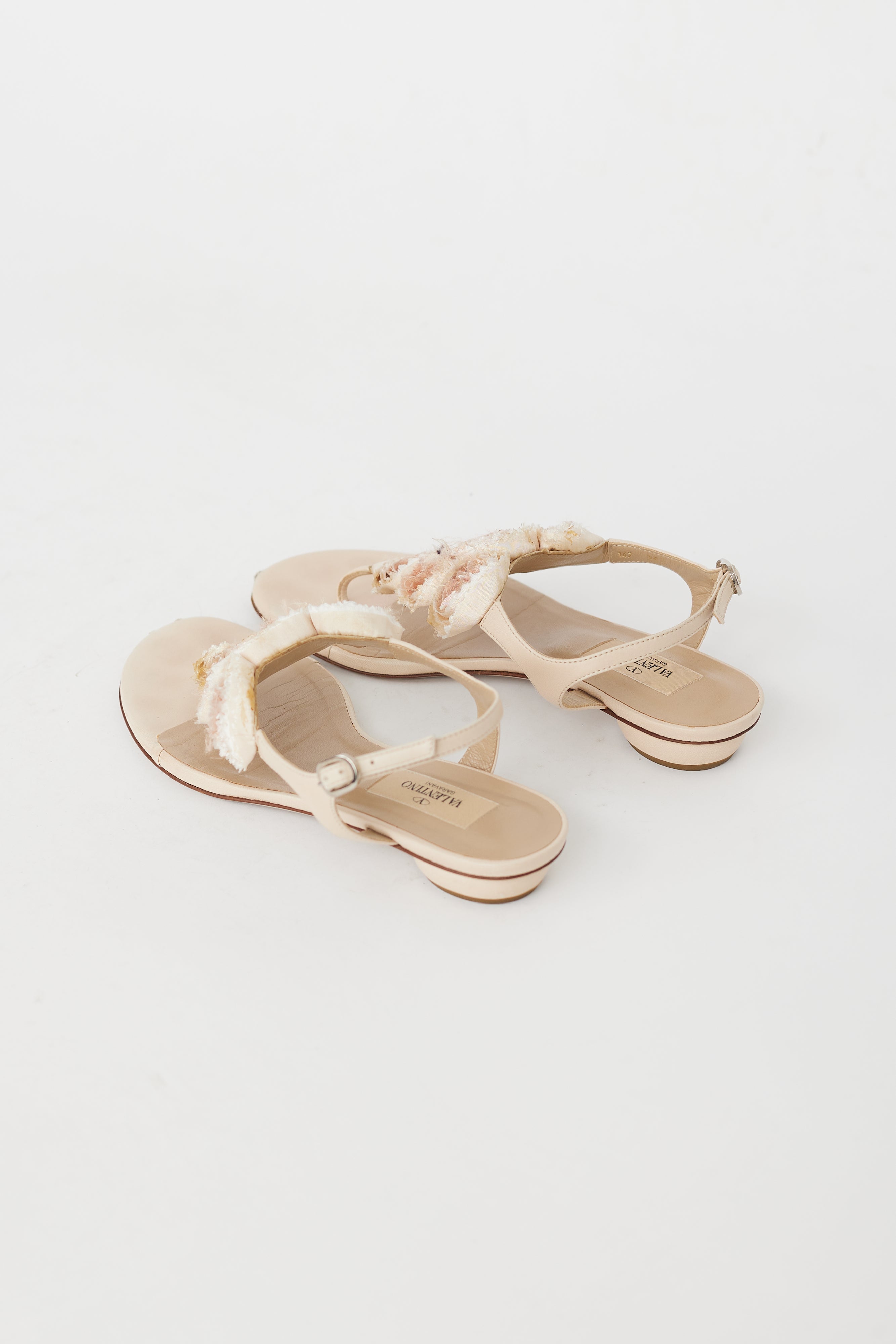 Pre-owned Valentino pastel pink sandals featuring open rounded toe, T-strap, ankle strap with buckle fastening, and tonal satin rose embellishment at front.