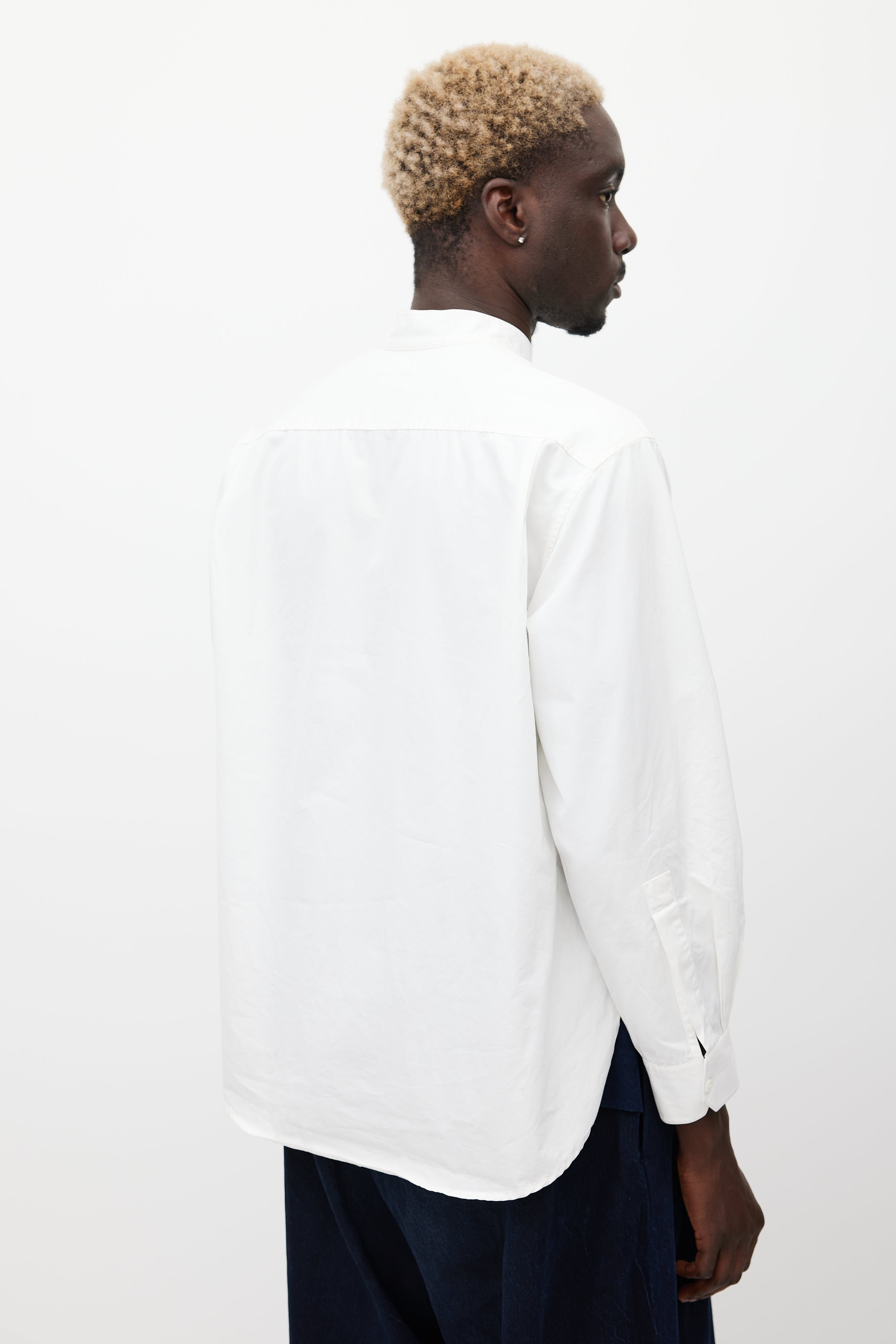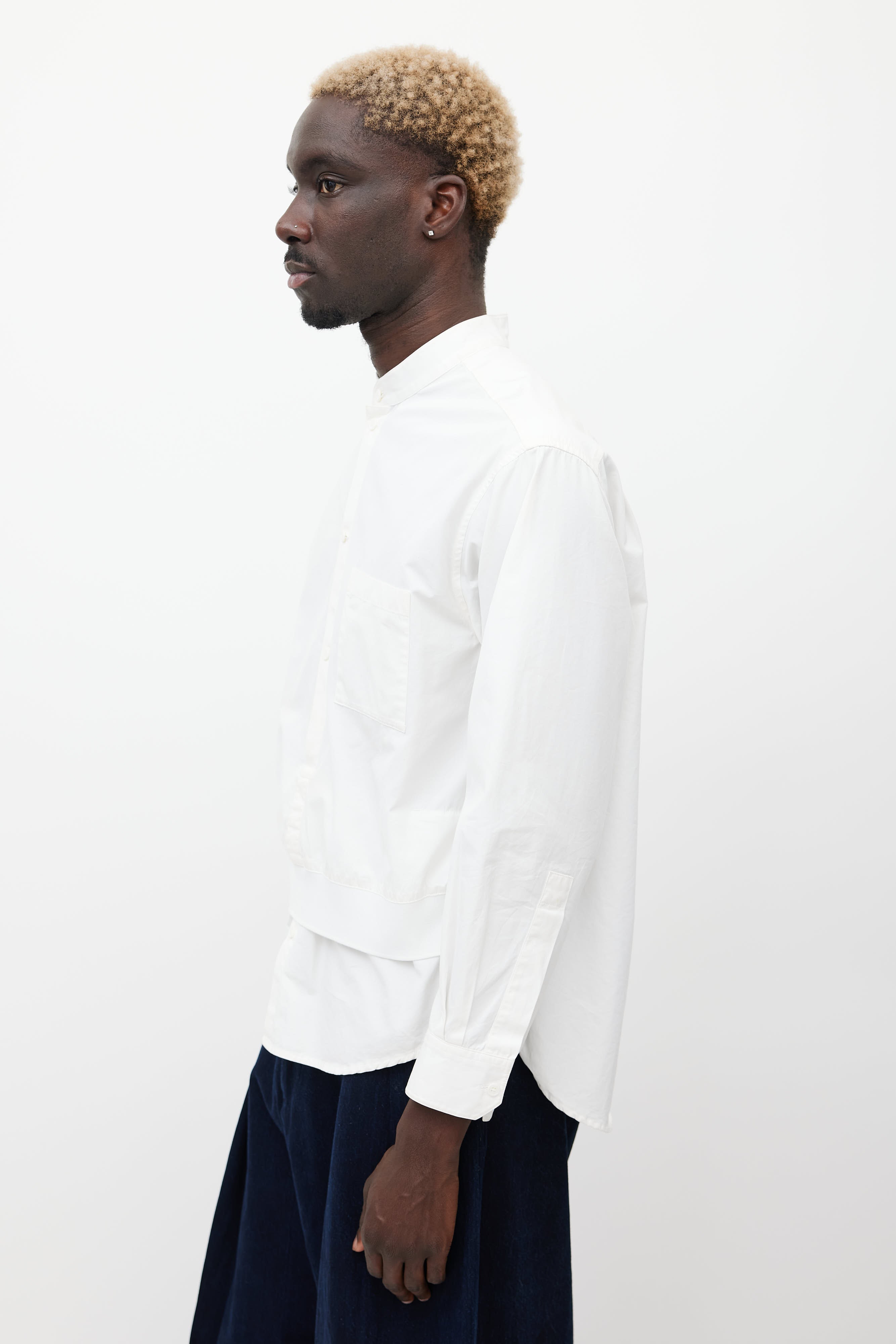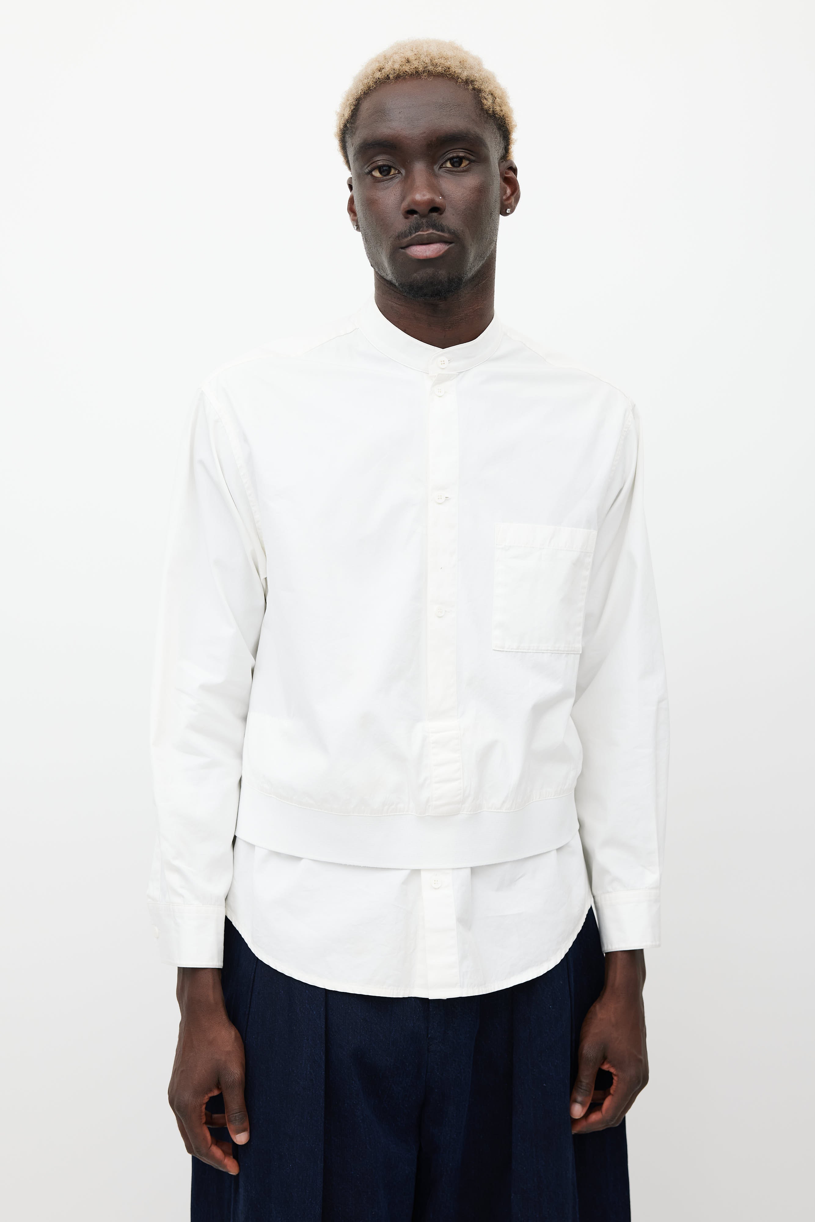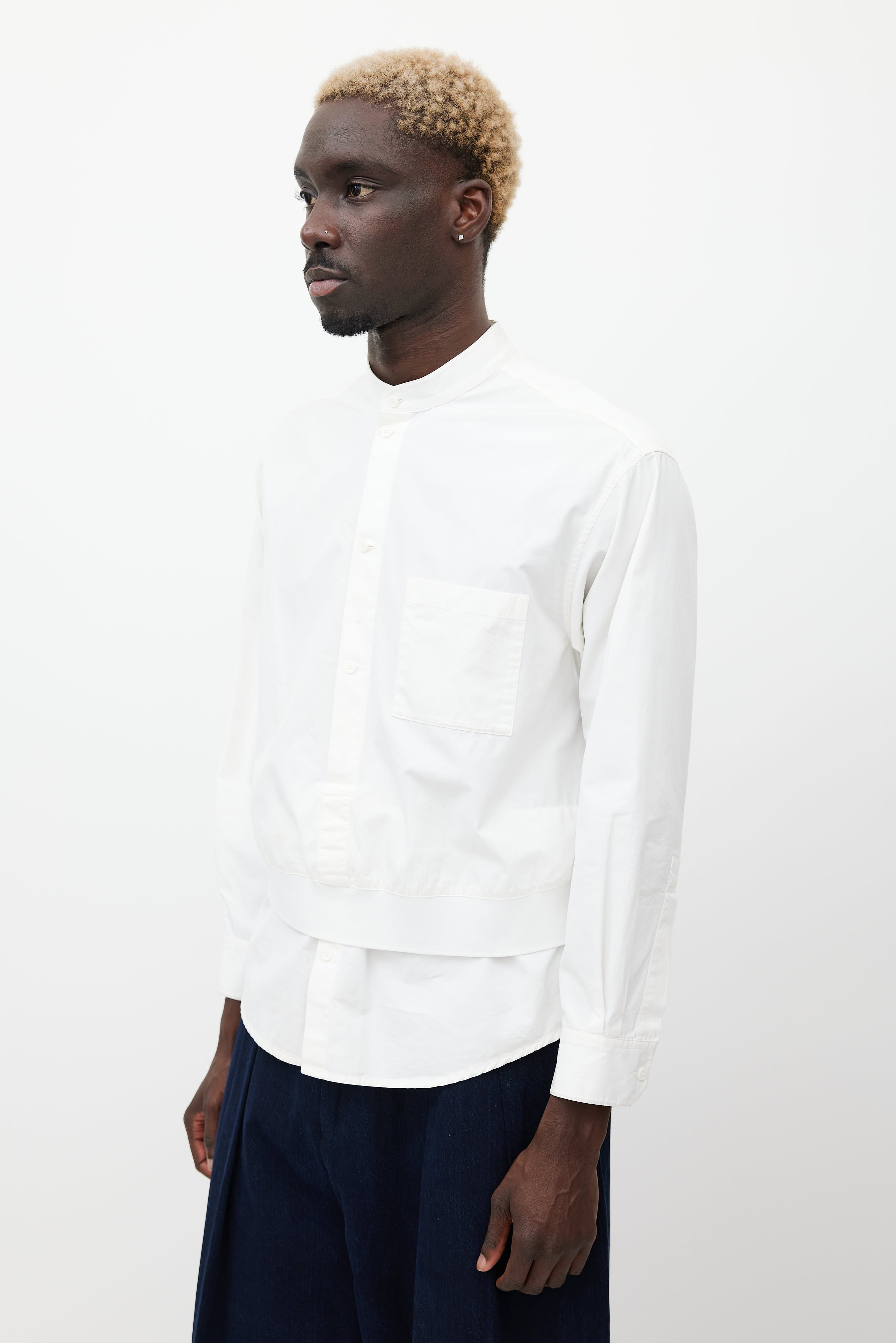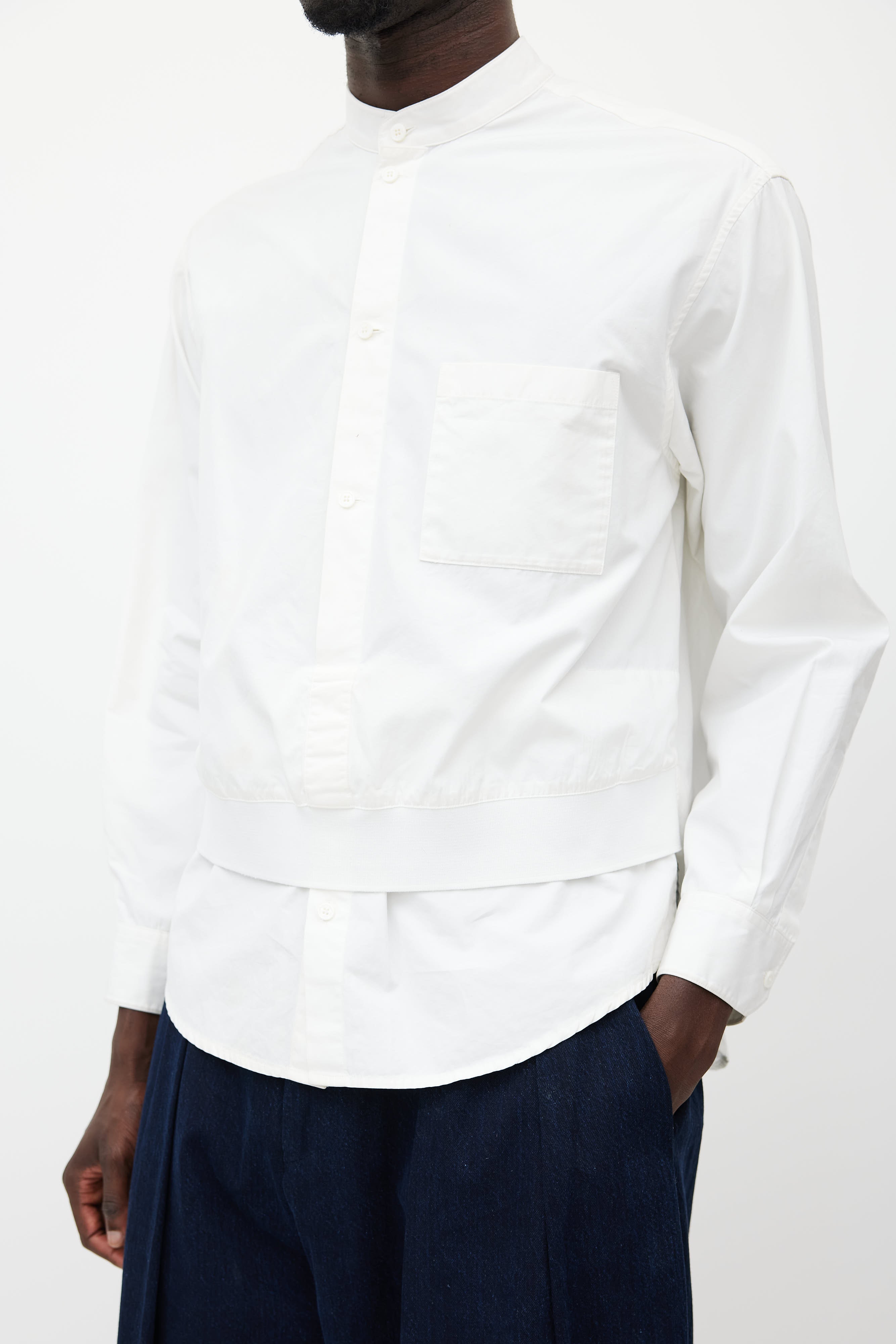 Pre-owned Wooyoungmi white shirt featuring a round collar, long sleeves with buttoned cuffs, one patch pocket at chest, layered front, and button up closure.