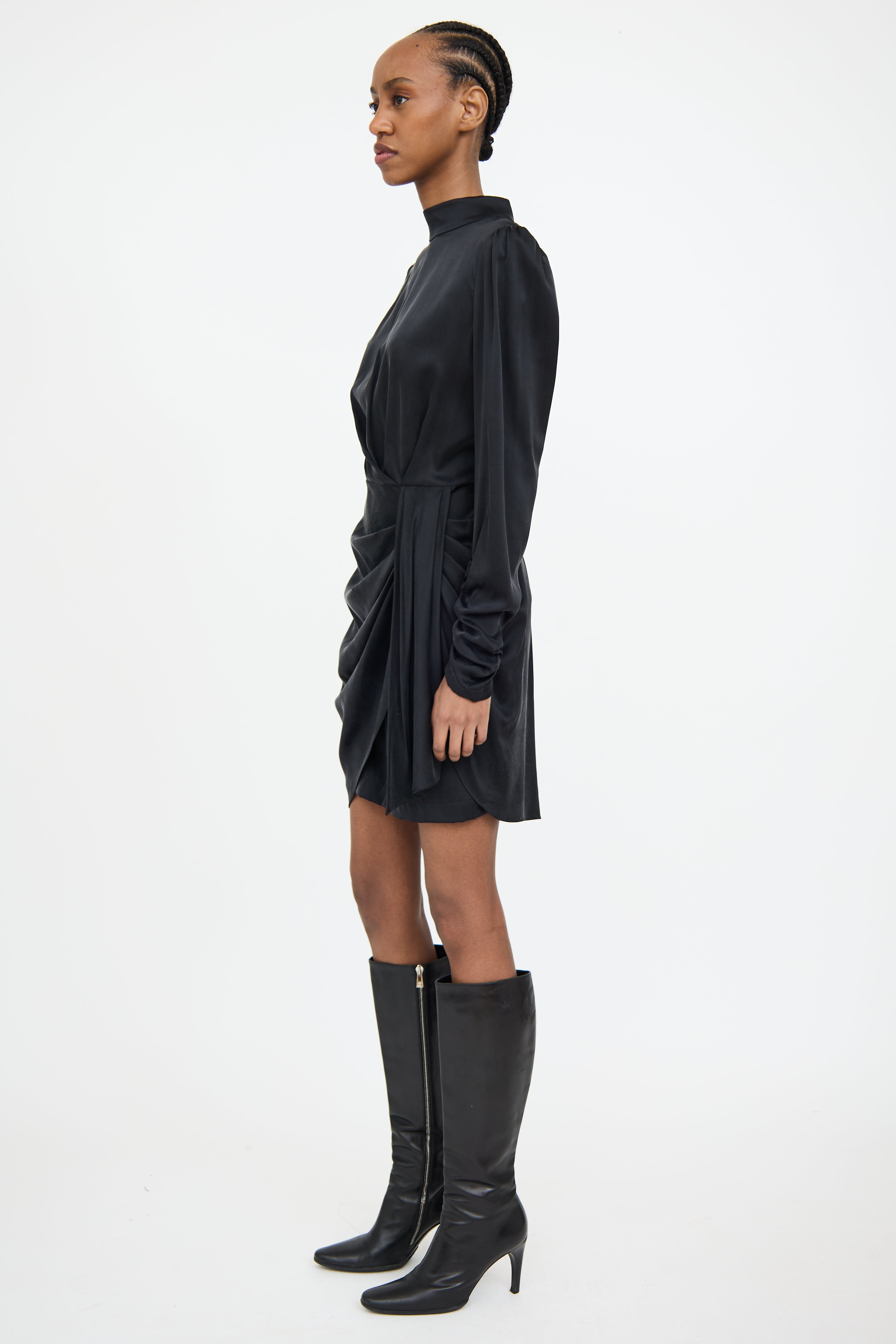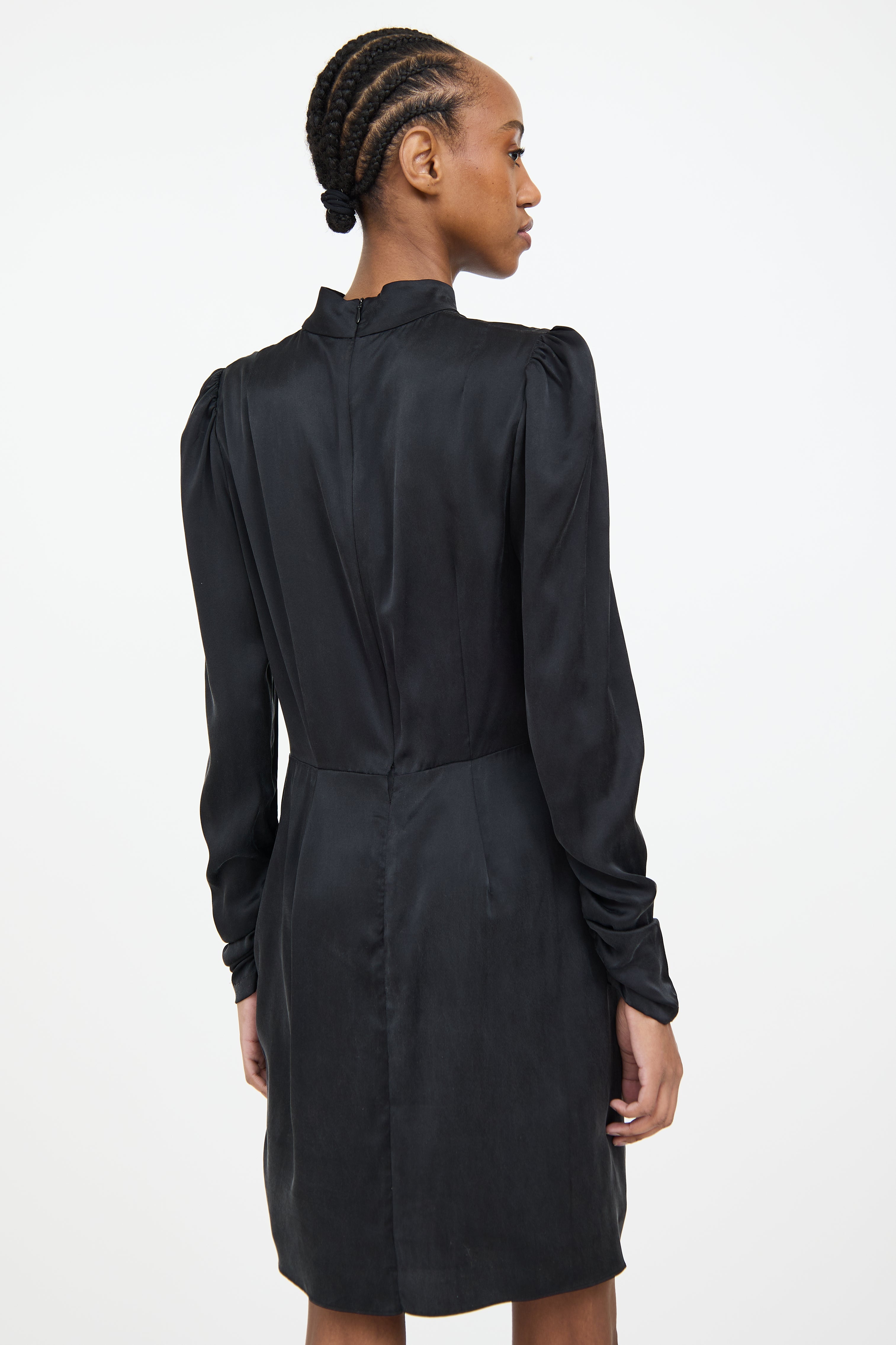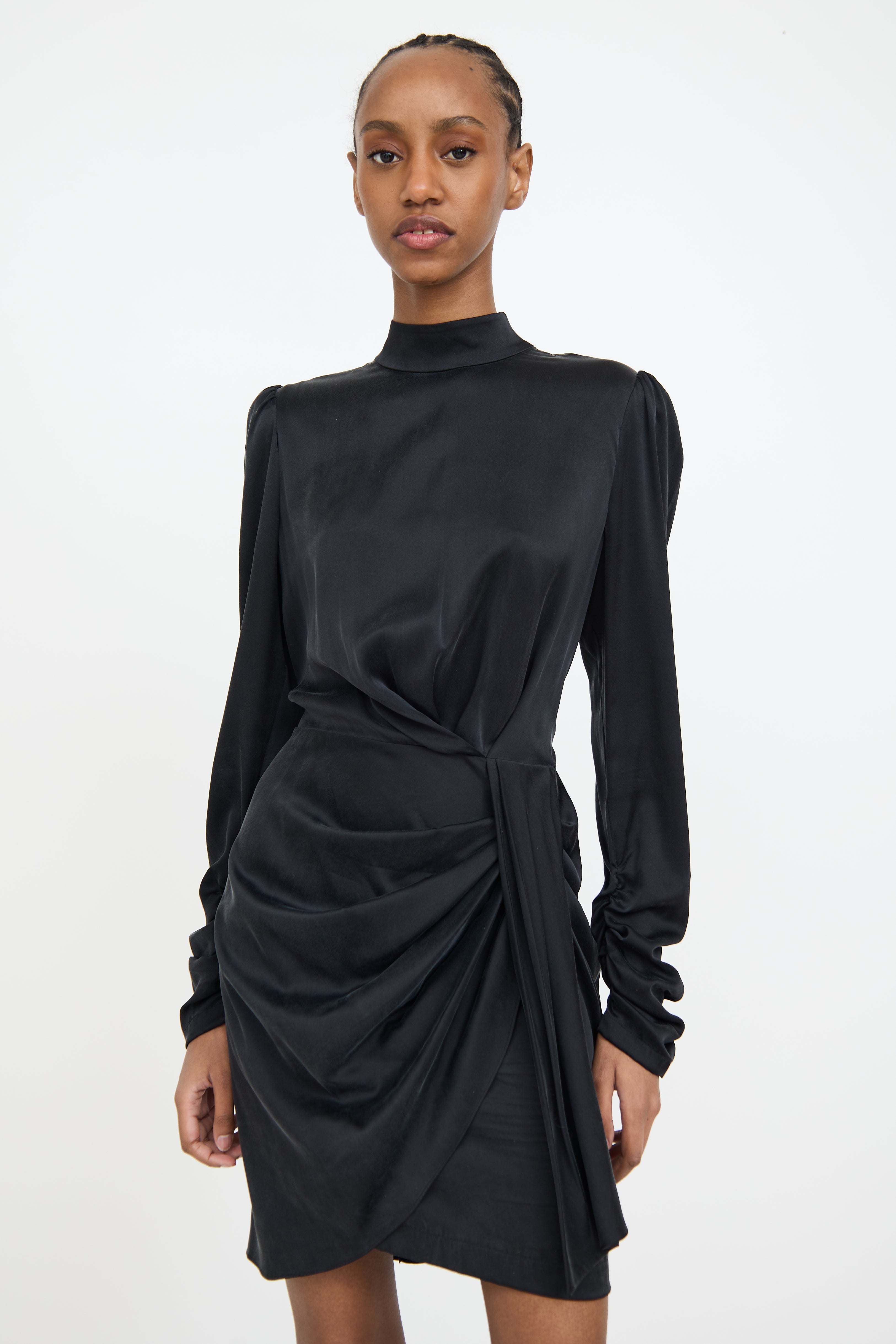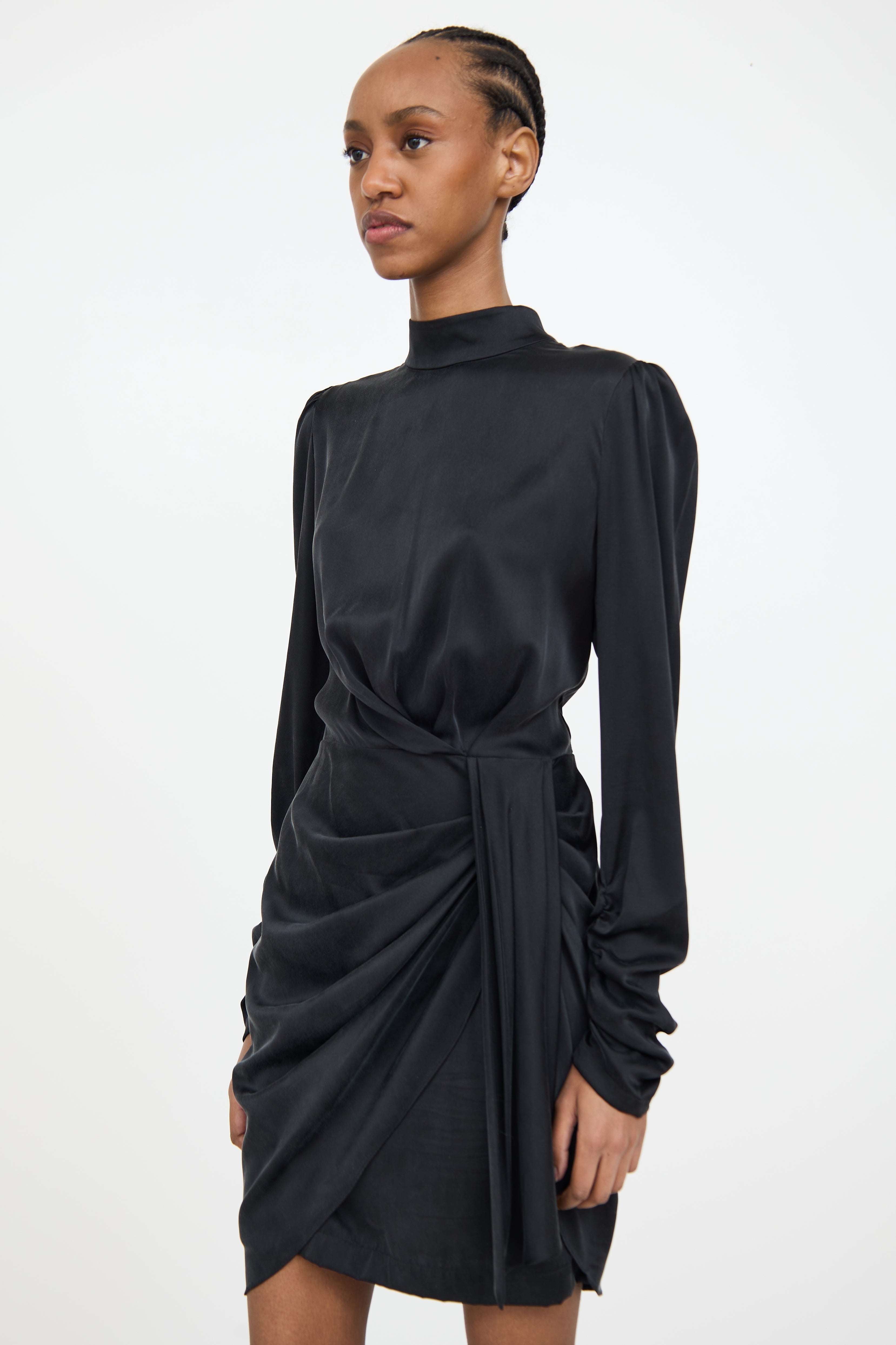Pre-owned Zimmermann black silk midi dress featuring a mock neck collar, long gathered sleeves, draping at waist with gathered detail, and zip closure at back.