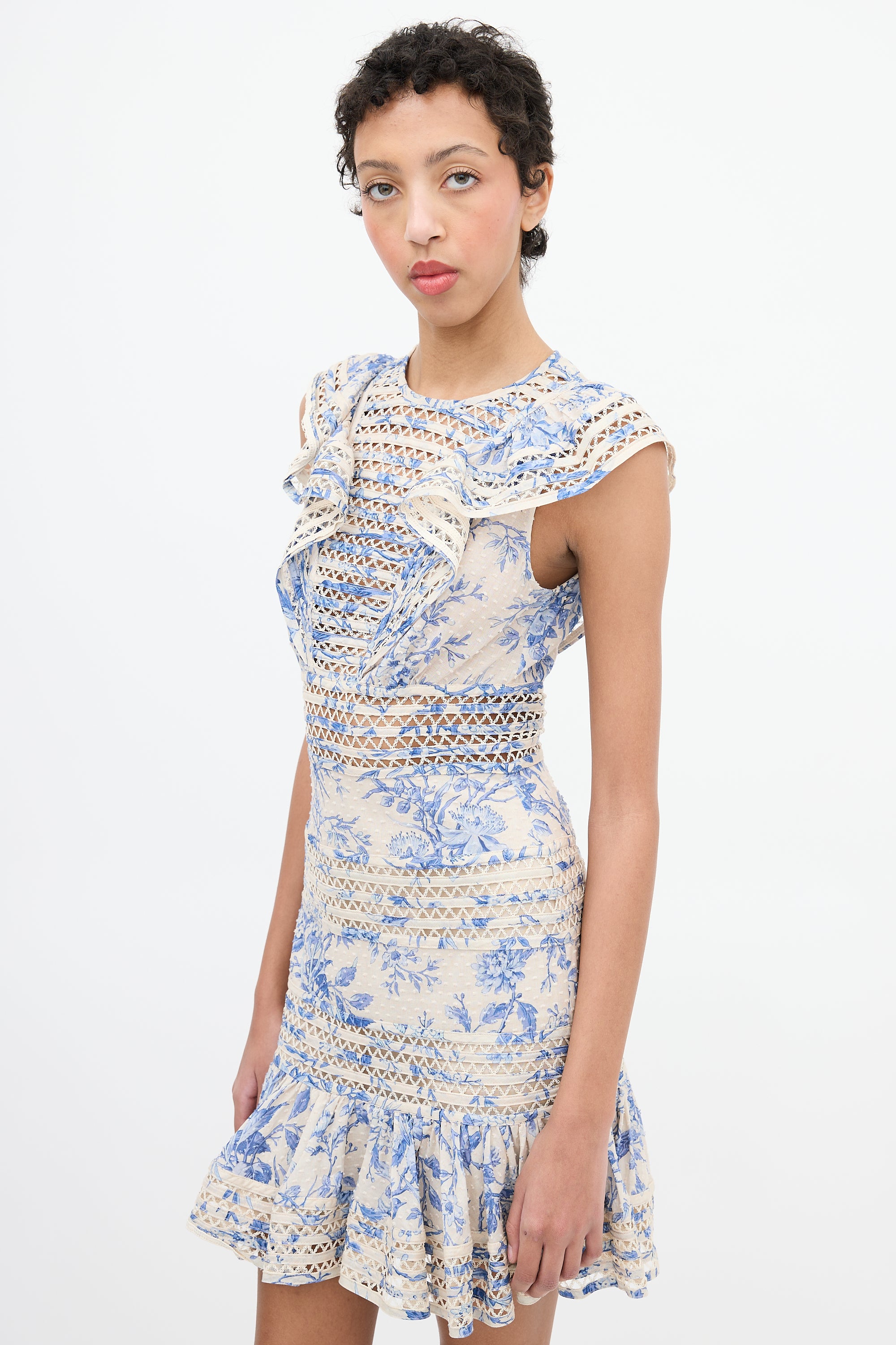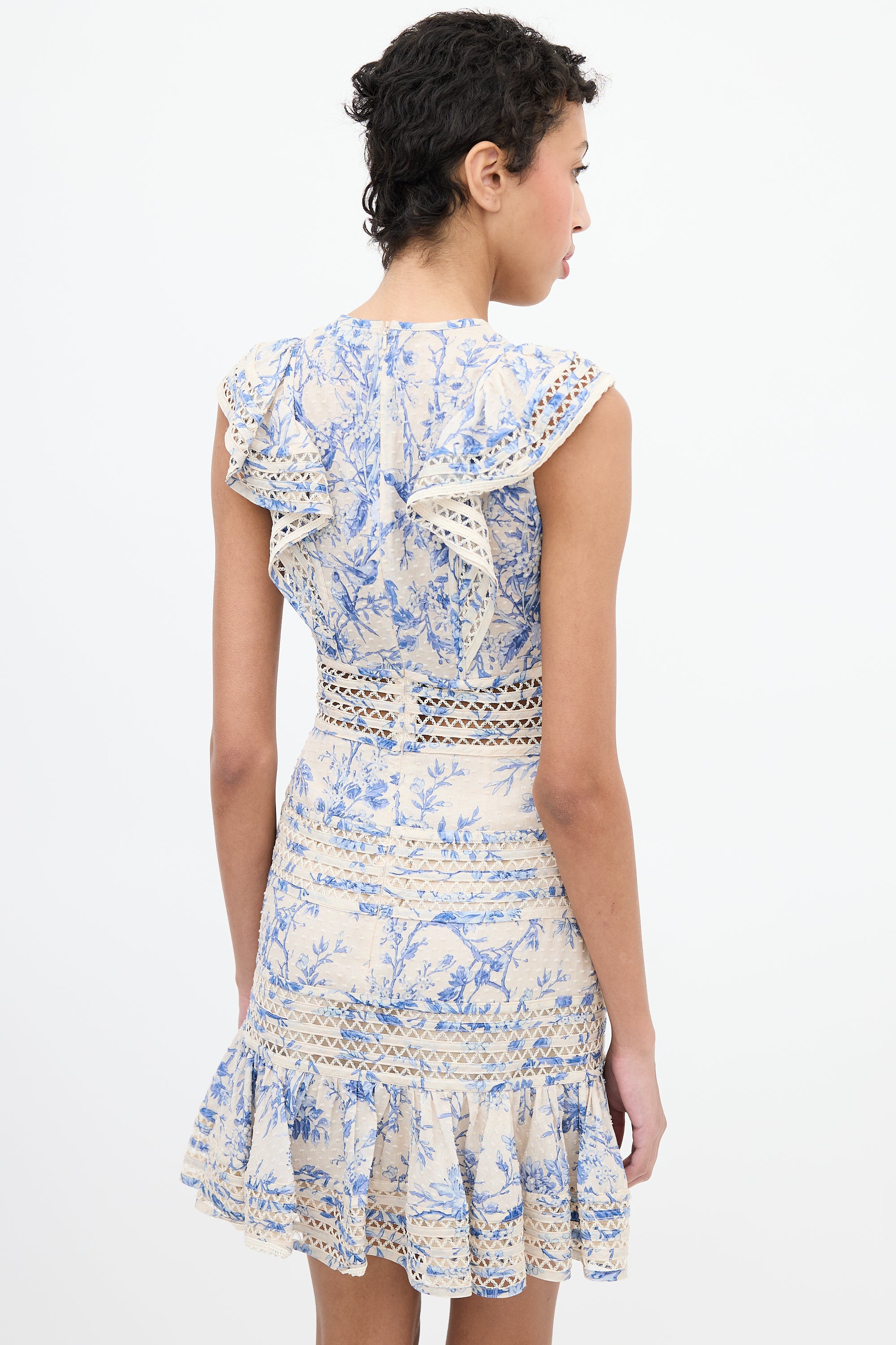 Pre-owned Zimmermann cream and blue midi dress featuring a round neckline, cut out stripe panels with crochet lace detail, ruffle sleeves and frill hem, and concealed back zip closure. Lined.