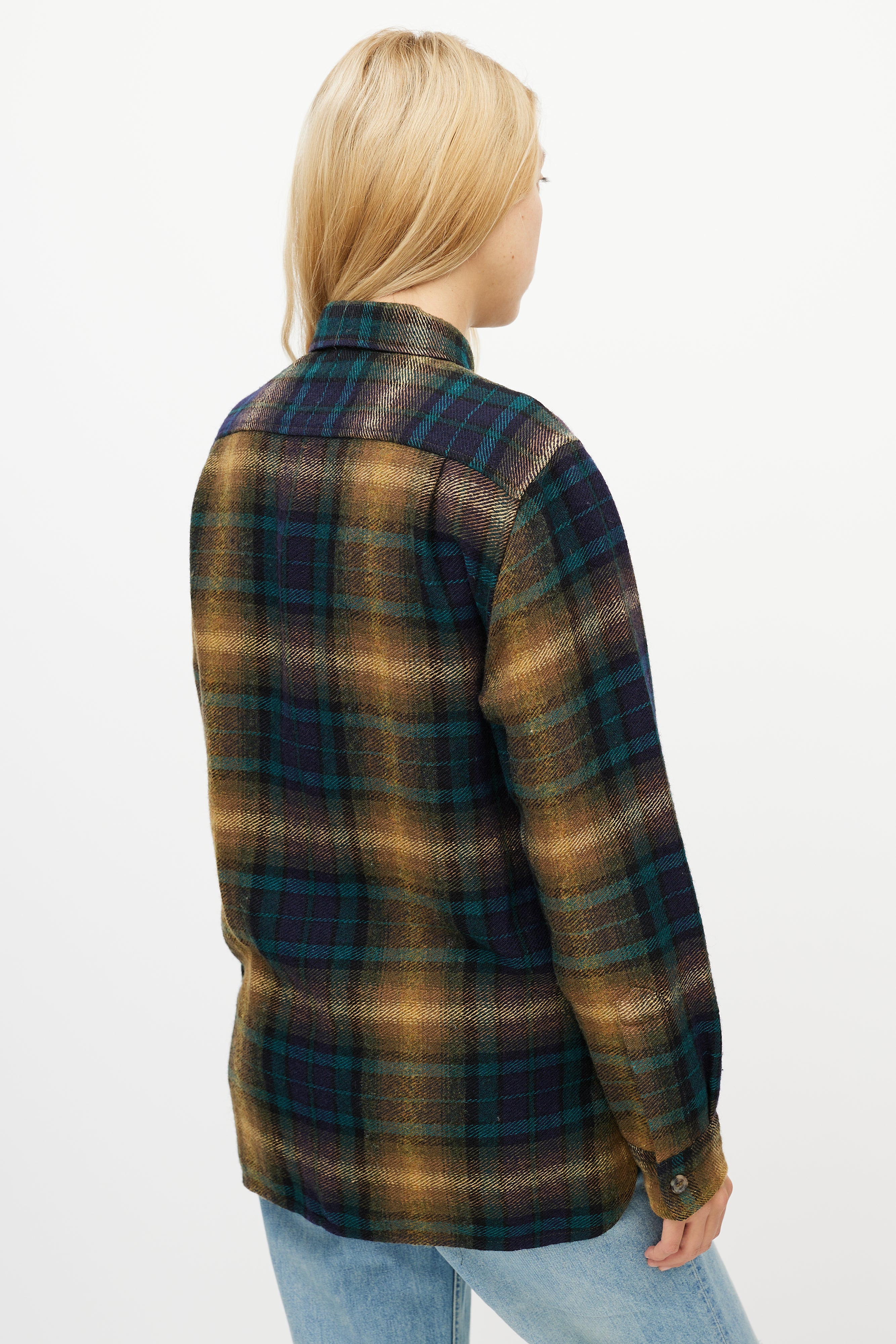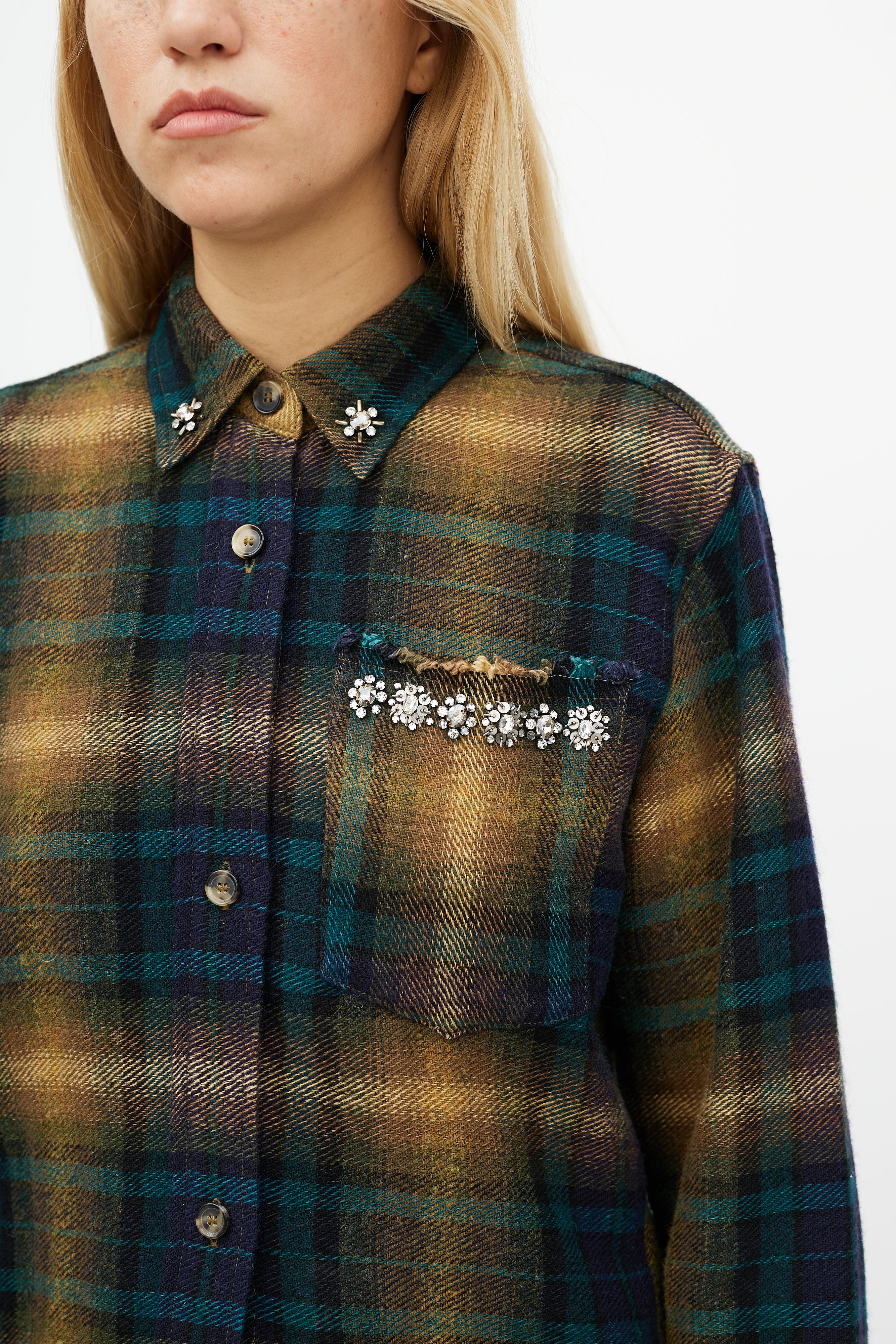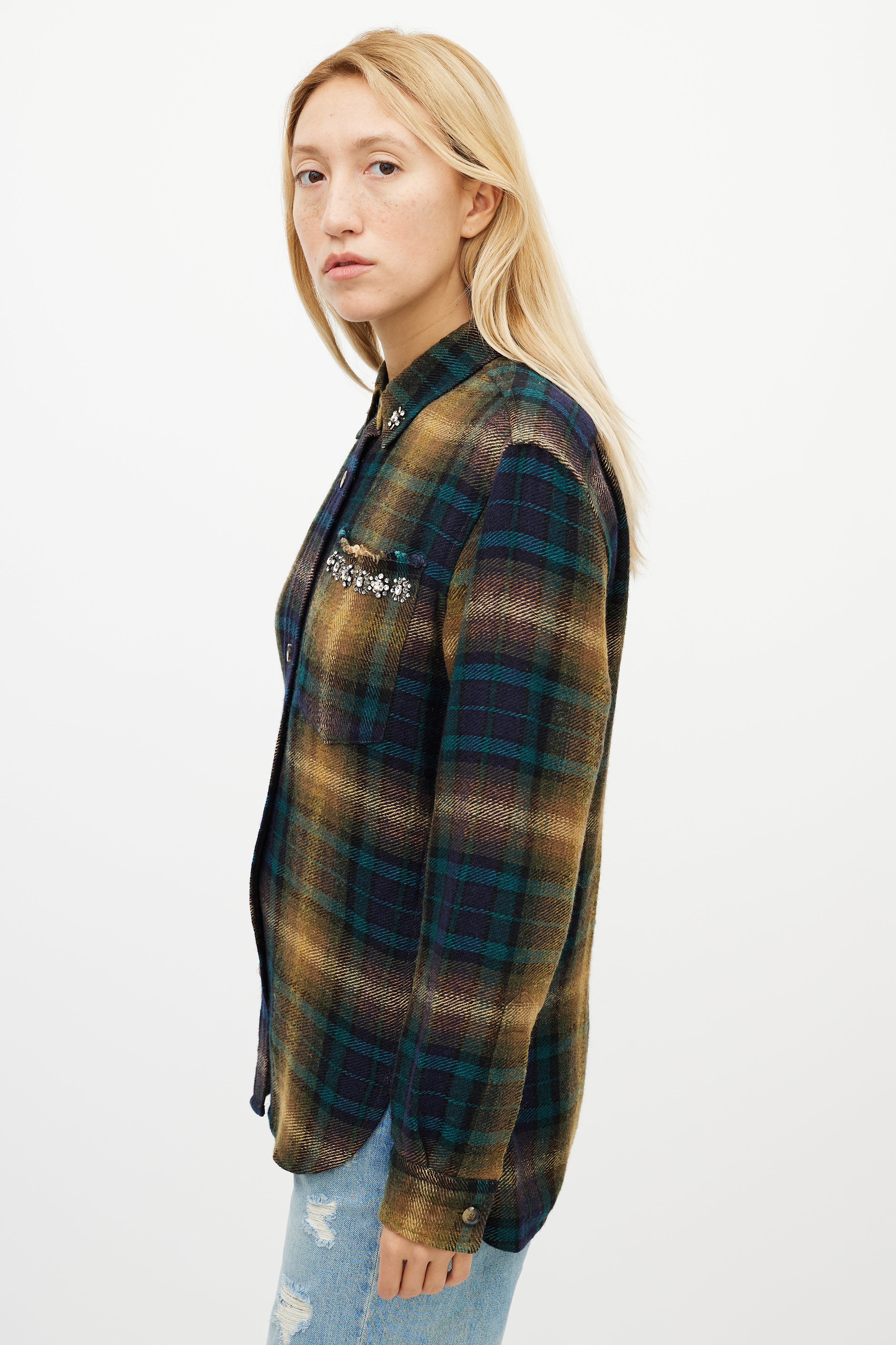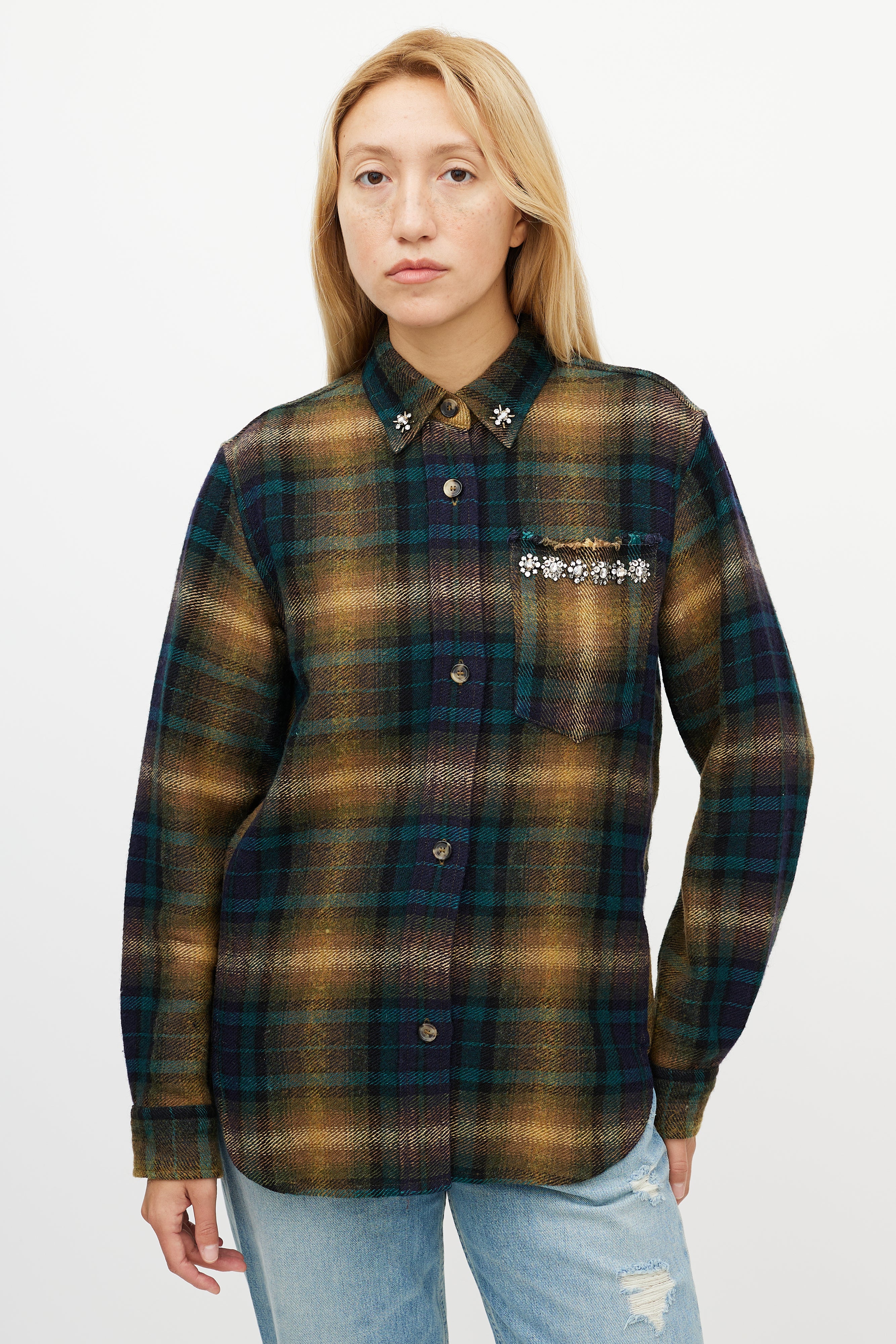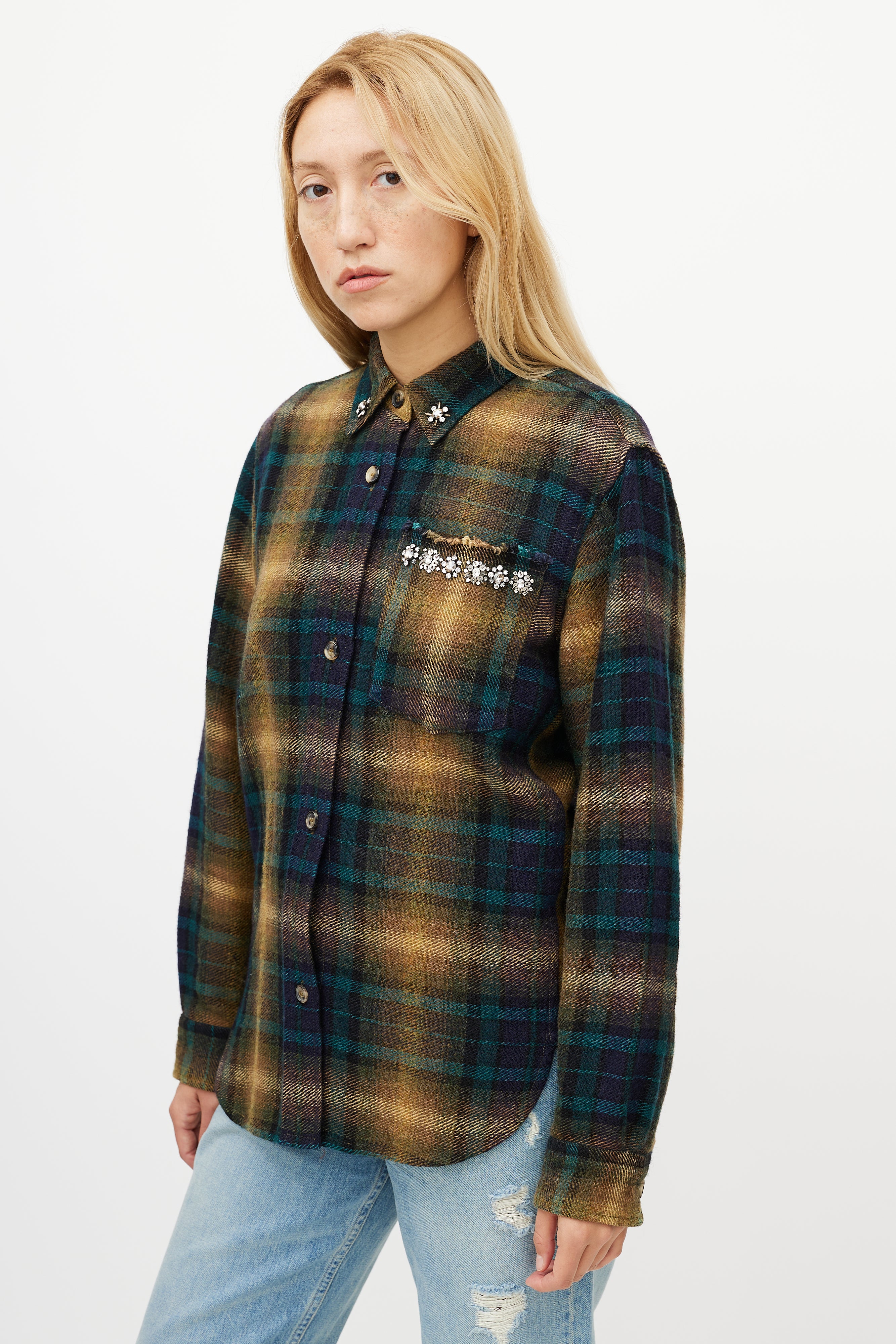 Pre-owned Isabel Marant beige wool shirt featuring a green plaid pattern, pointed collar, long sleeves with buttoned cuffs, one patch pocket at chest, jewel embellishment throughout, and button up closure.