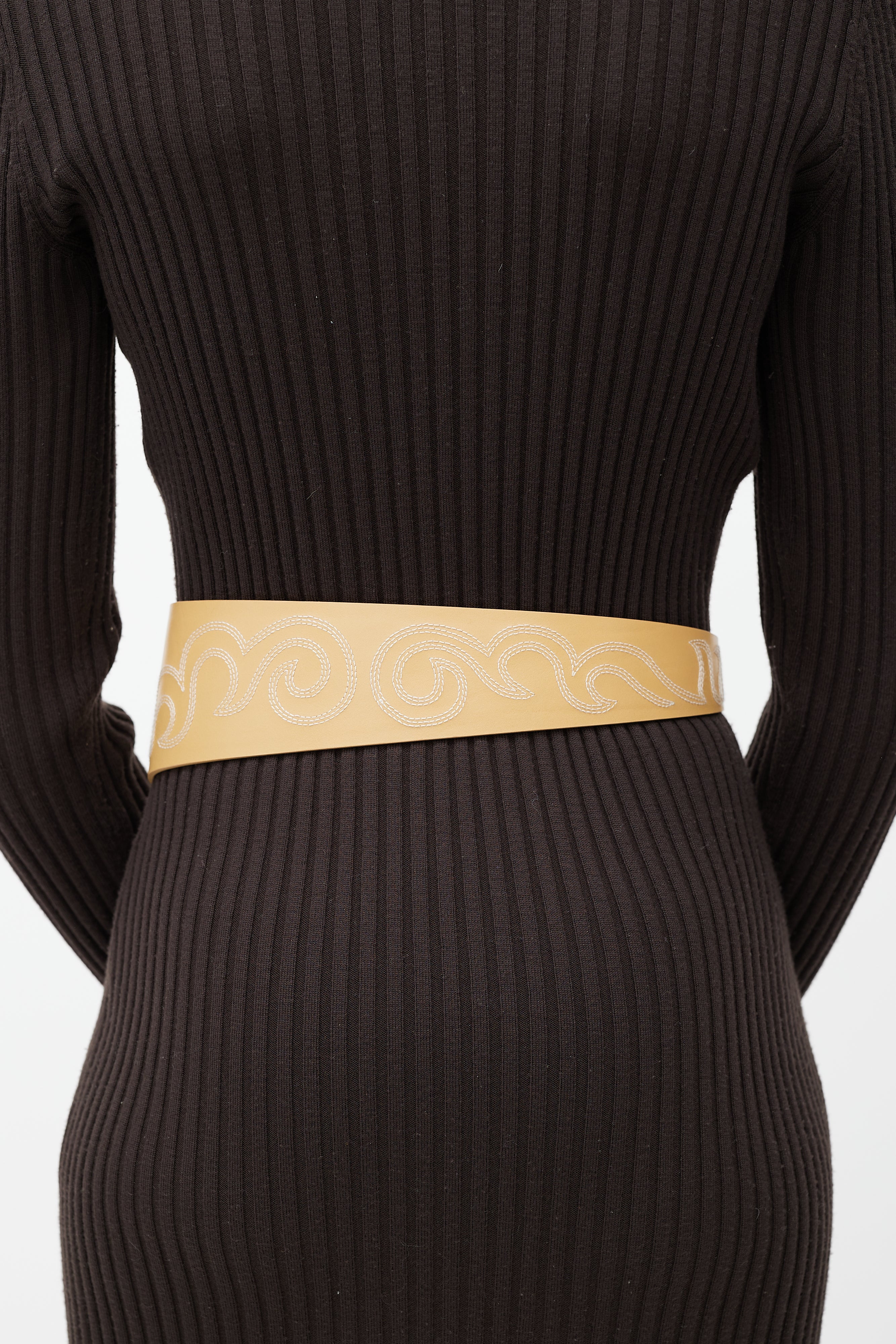 Pre-owned Isabel Marant beige asymmetrical leather belt featuring white western embroidered pattern throughout, brushed silver tone hardware, and adjustable notches. Comes with original dust bag.