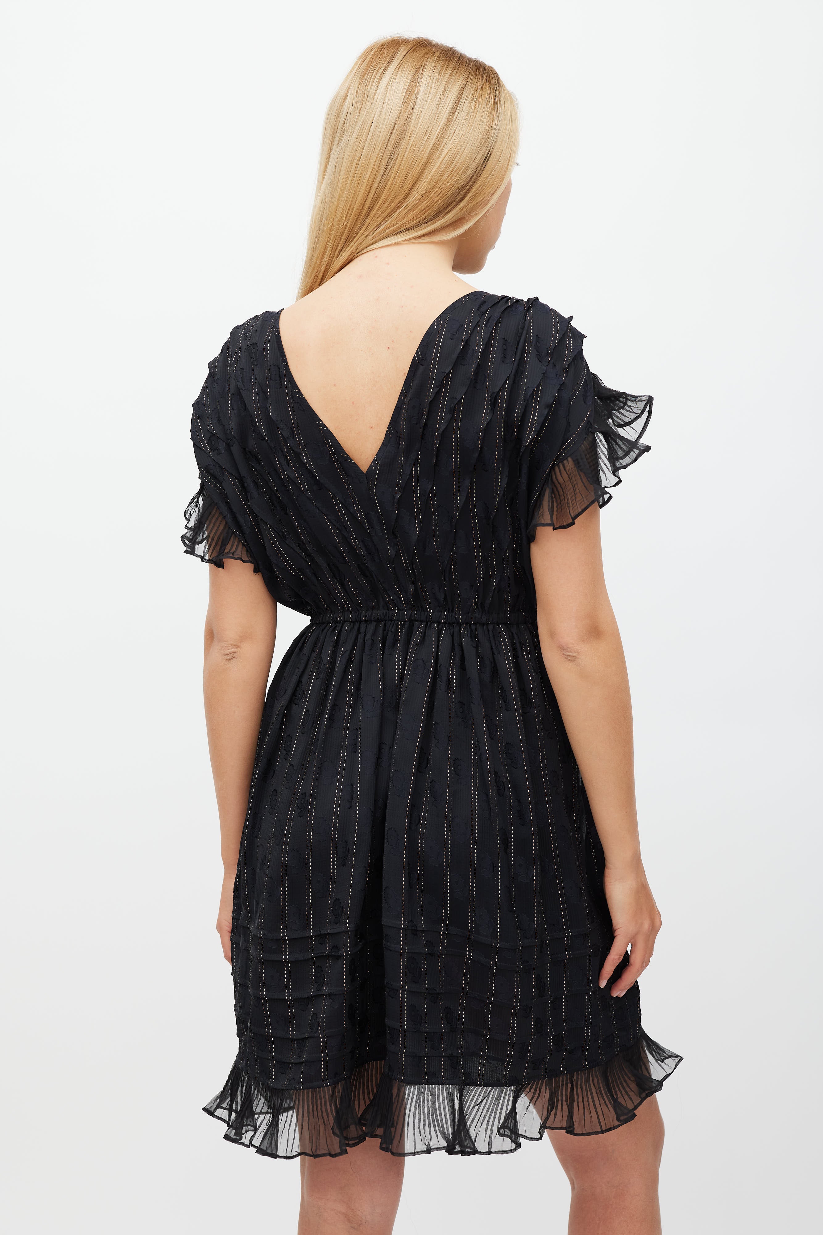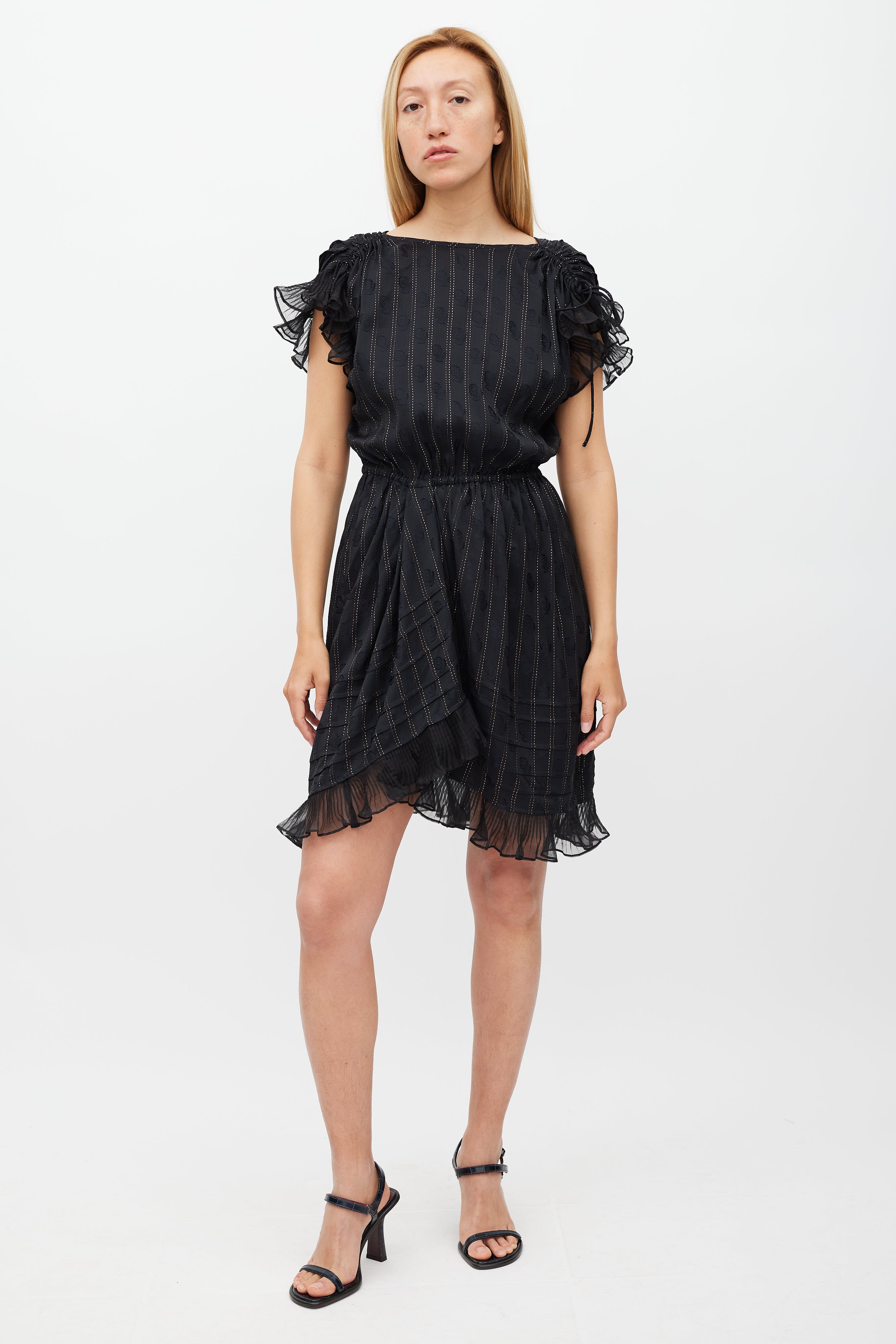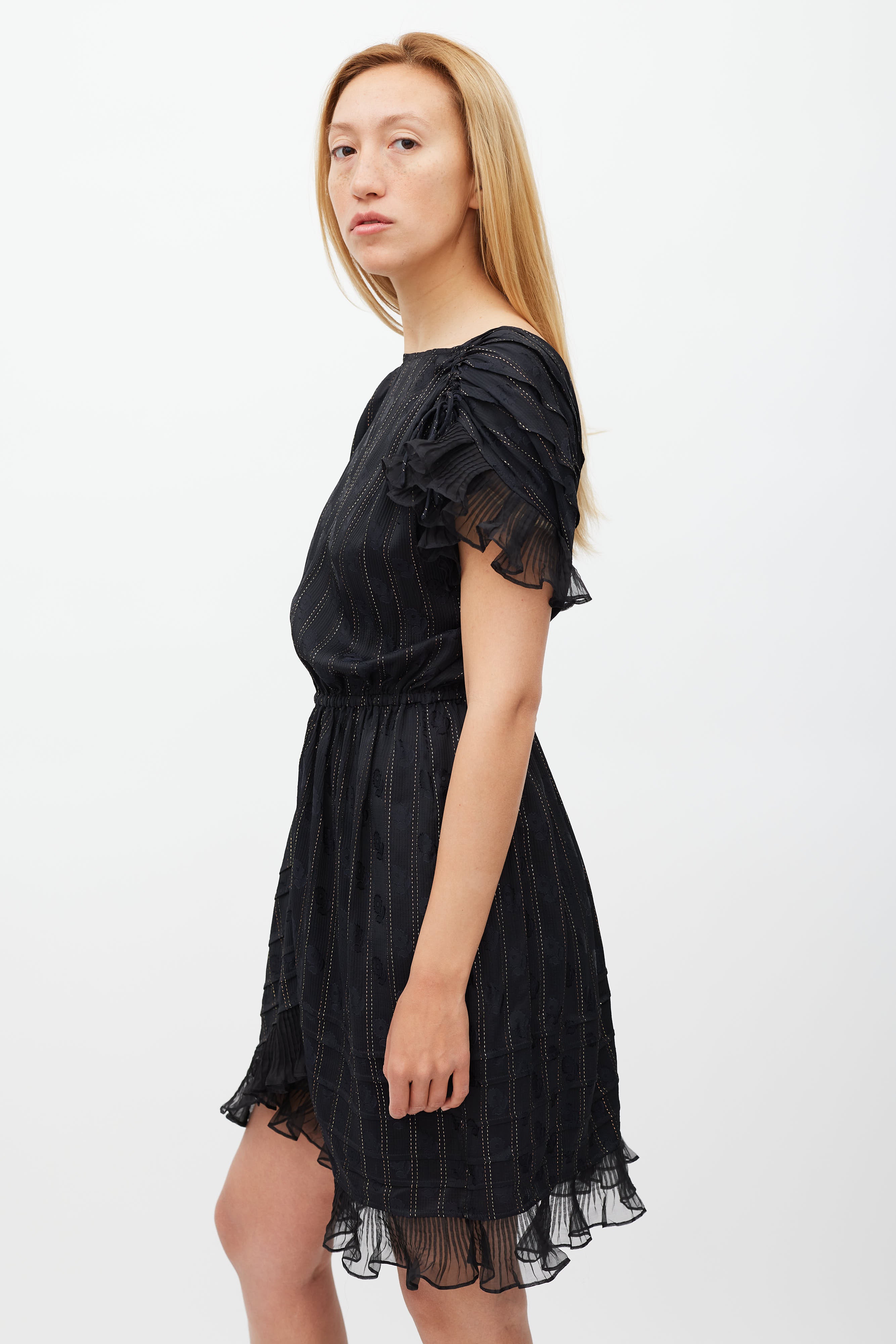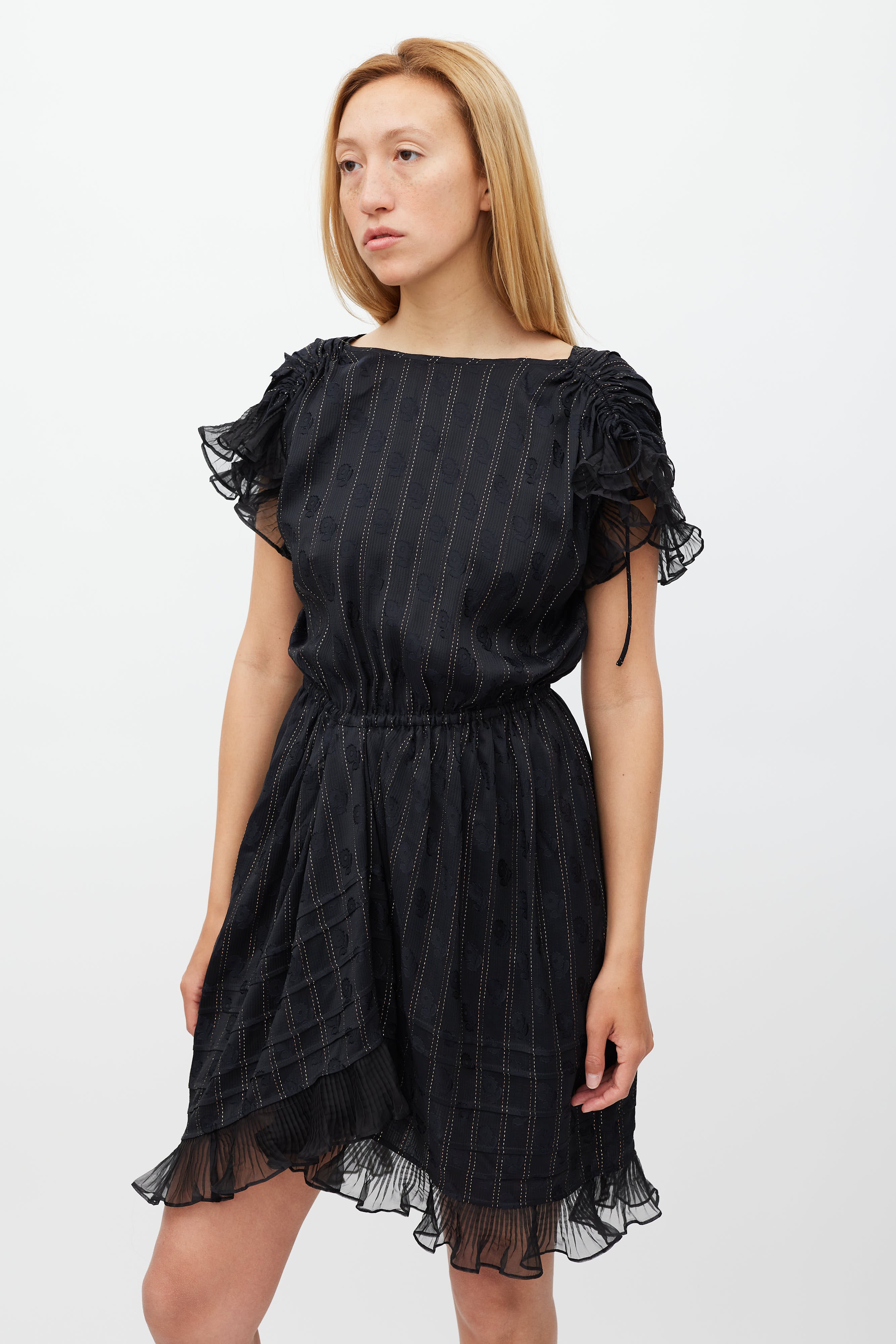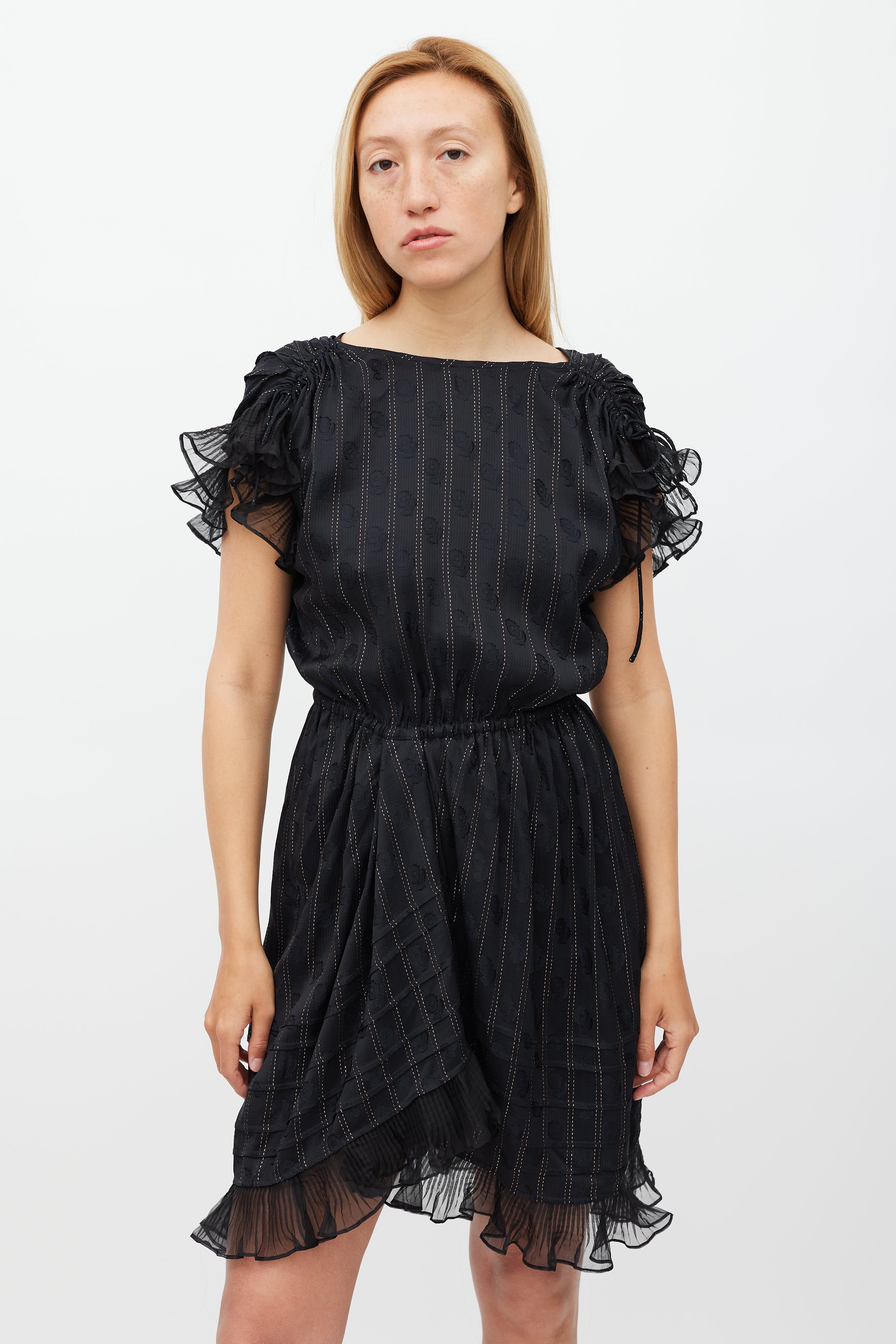 Pre-owned Isabel Marant black and gold Marisa dress featuring round neckline, ruched shoulders with drawstring fastening, elasticized waist, gold pinstripes, tonal floral pattern throughout, ruffled sleeves and hem, asymmetrical skirt, and V-neck back.