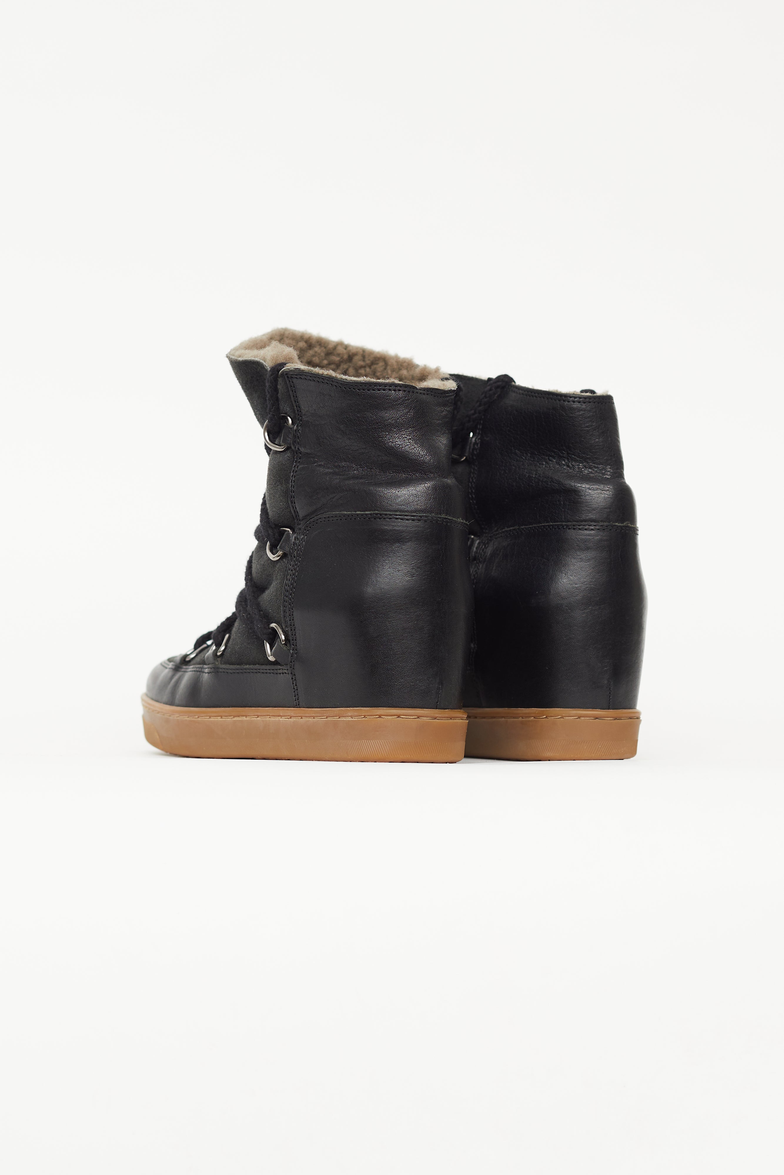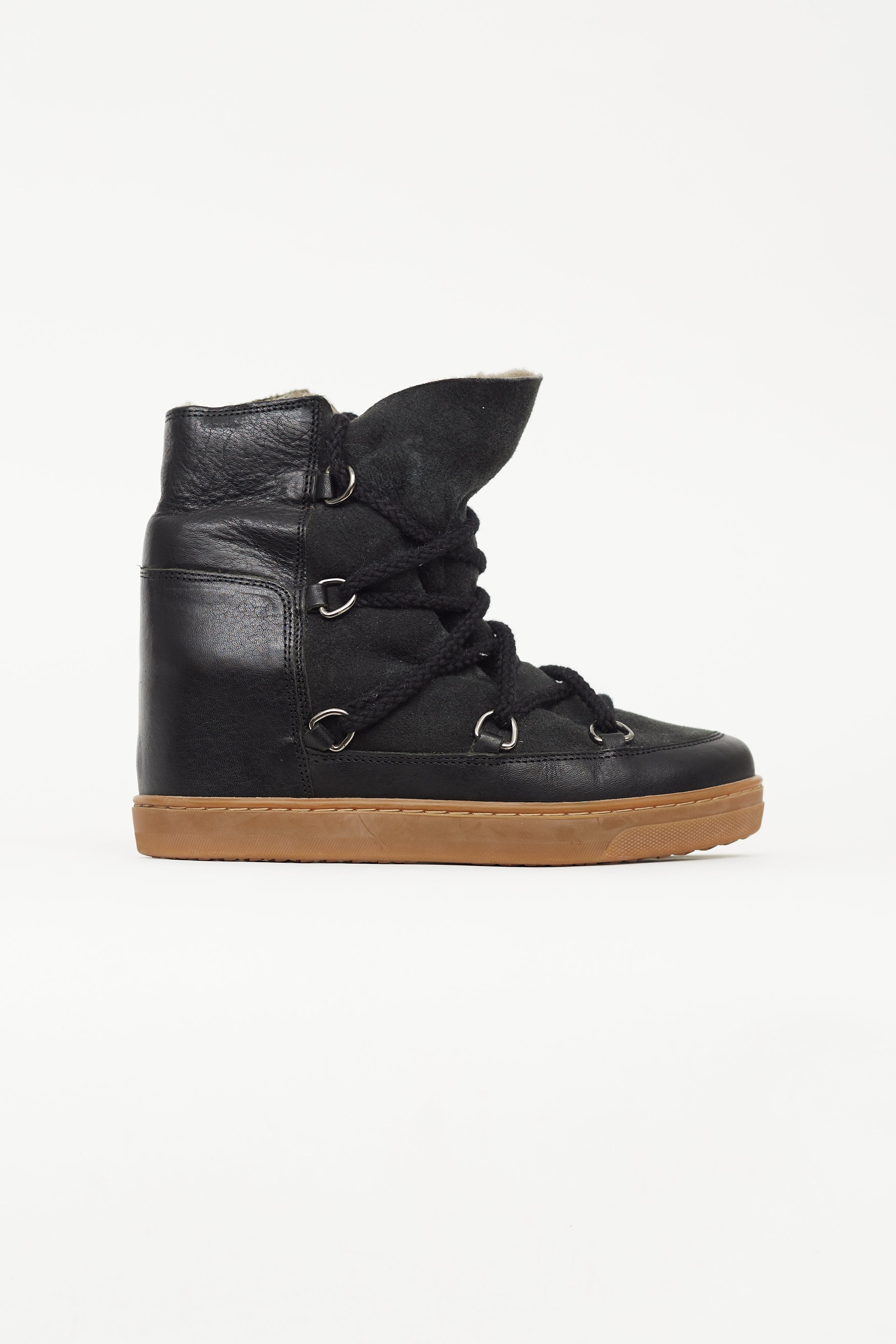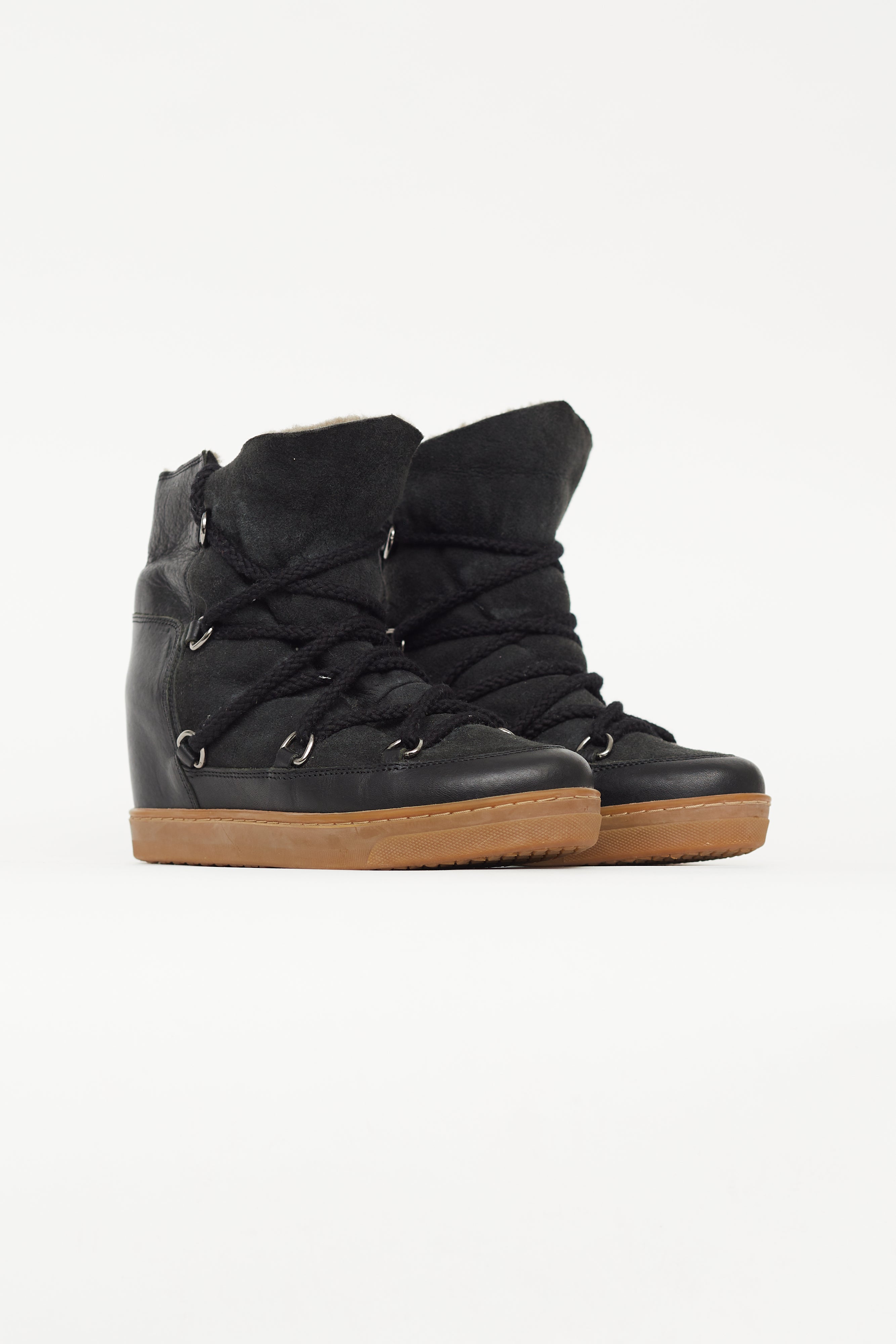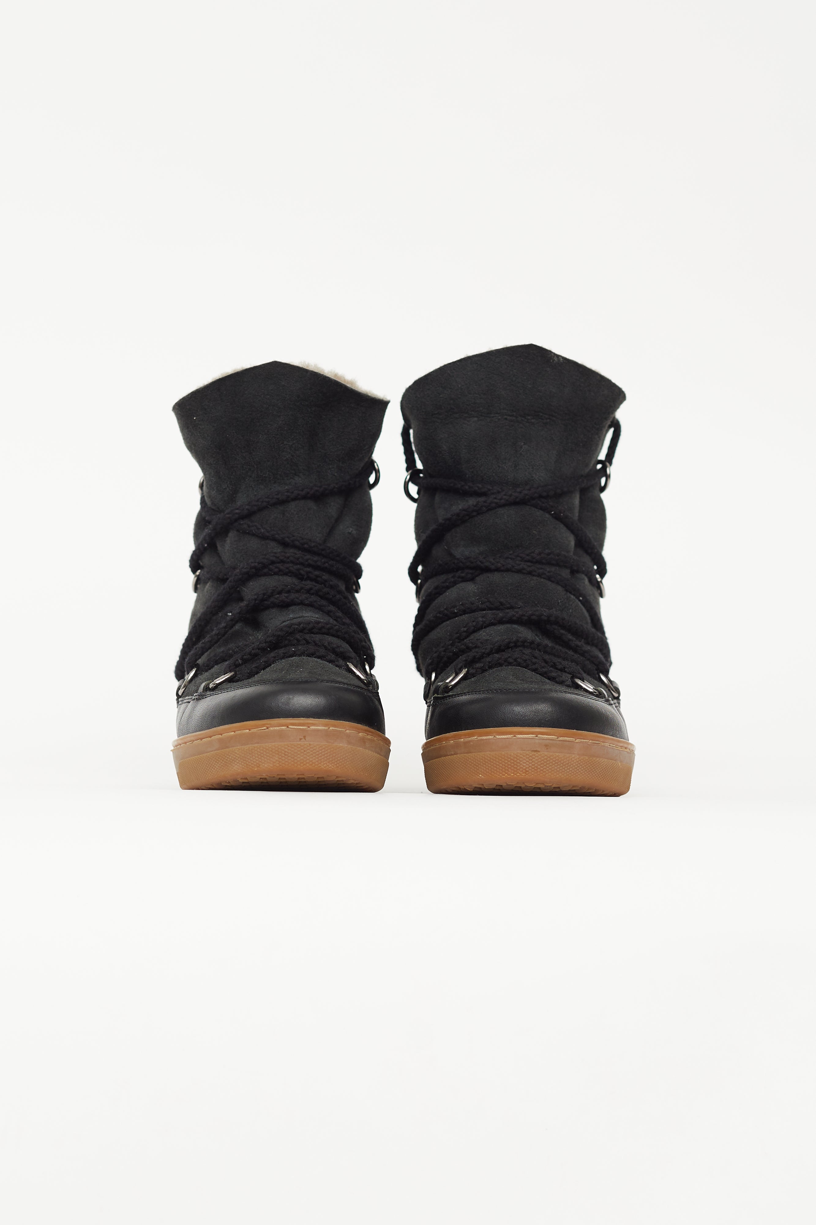 Pre-owned Isabel Marant Nowles boot featuring hidden wedge heel, round toe, treaded rubber sole, lace up vamp with silver tone hardware and shearling insole. Comes with original dust bag.