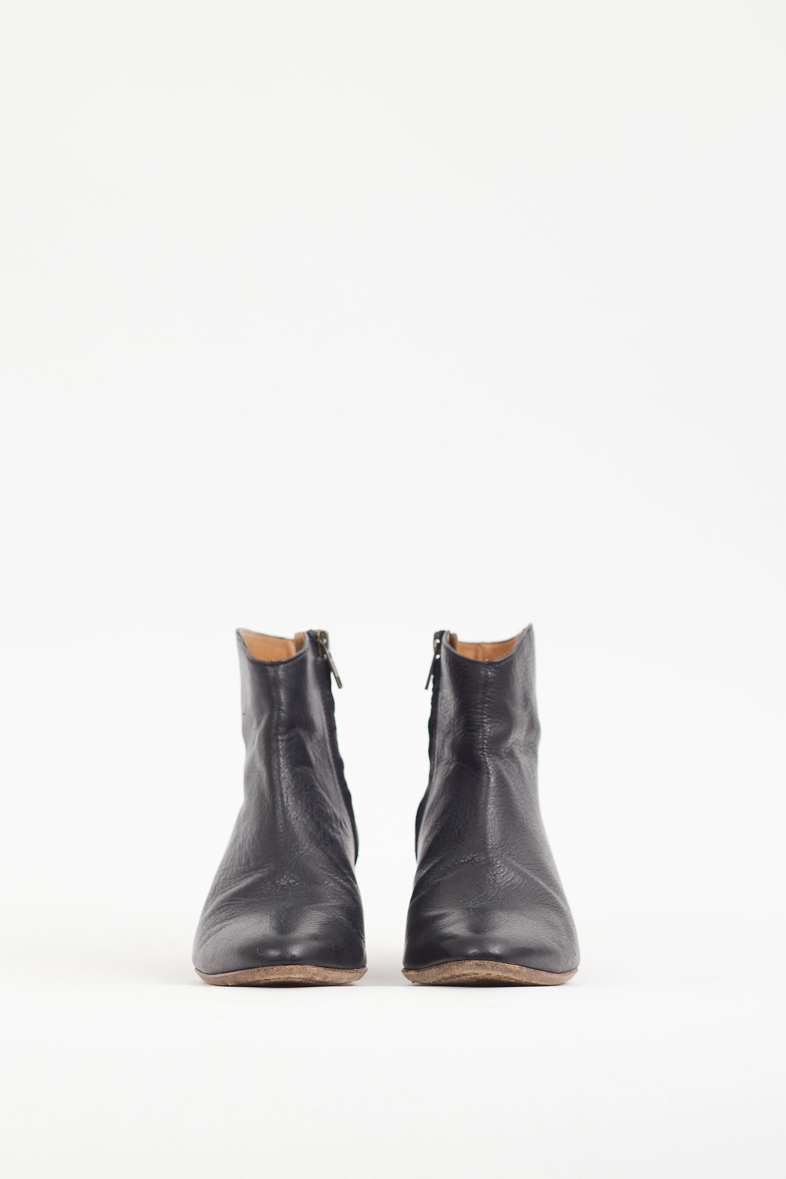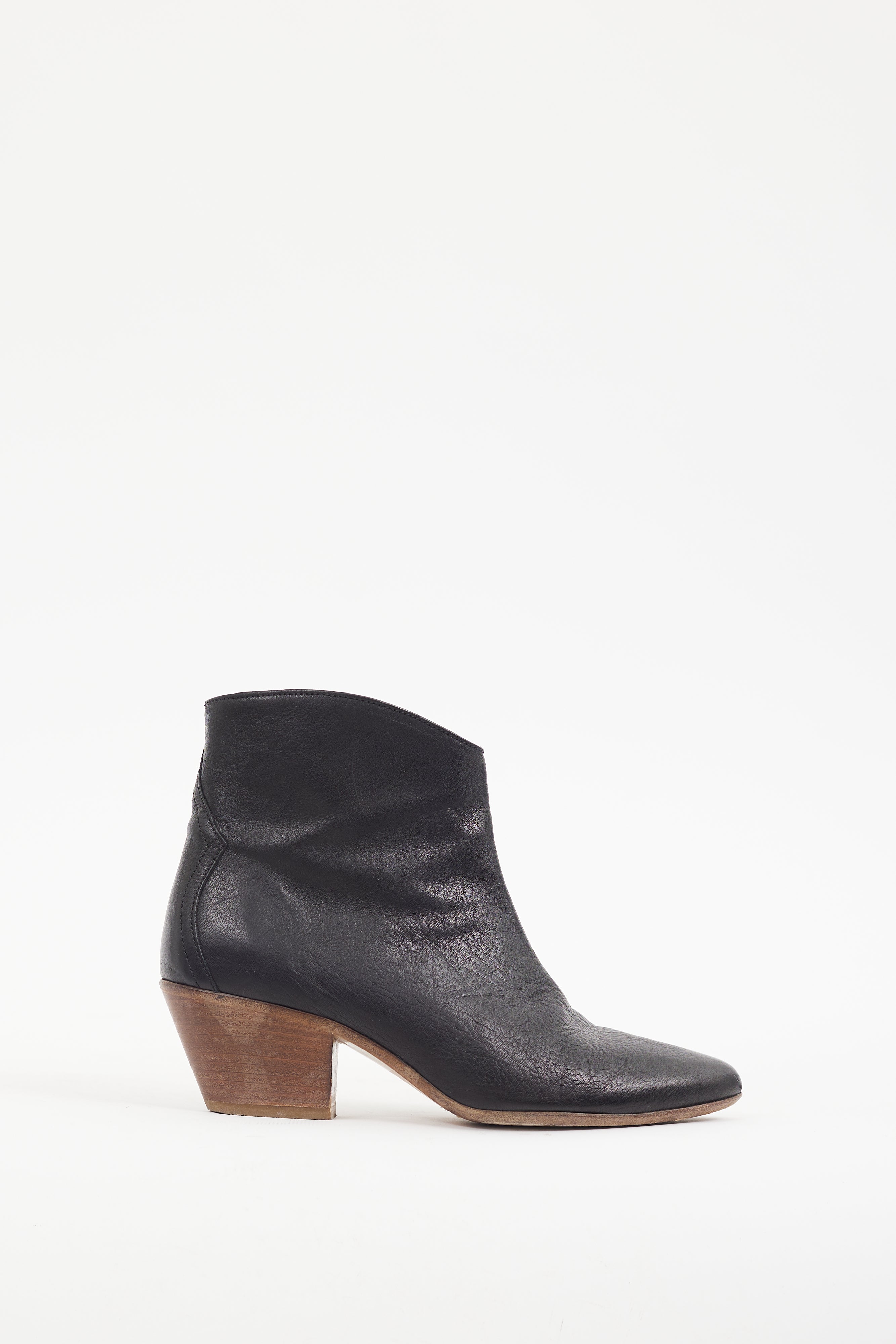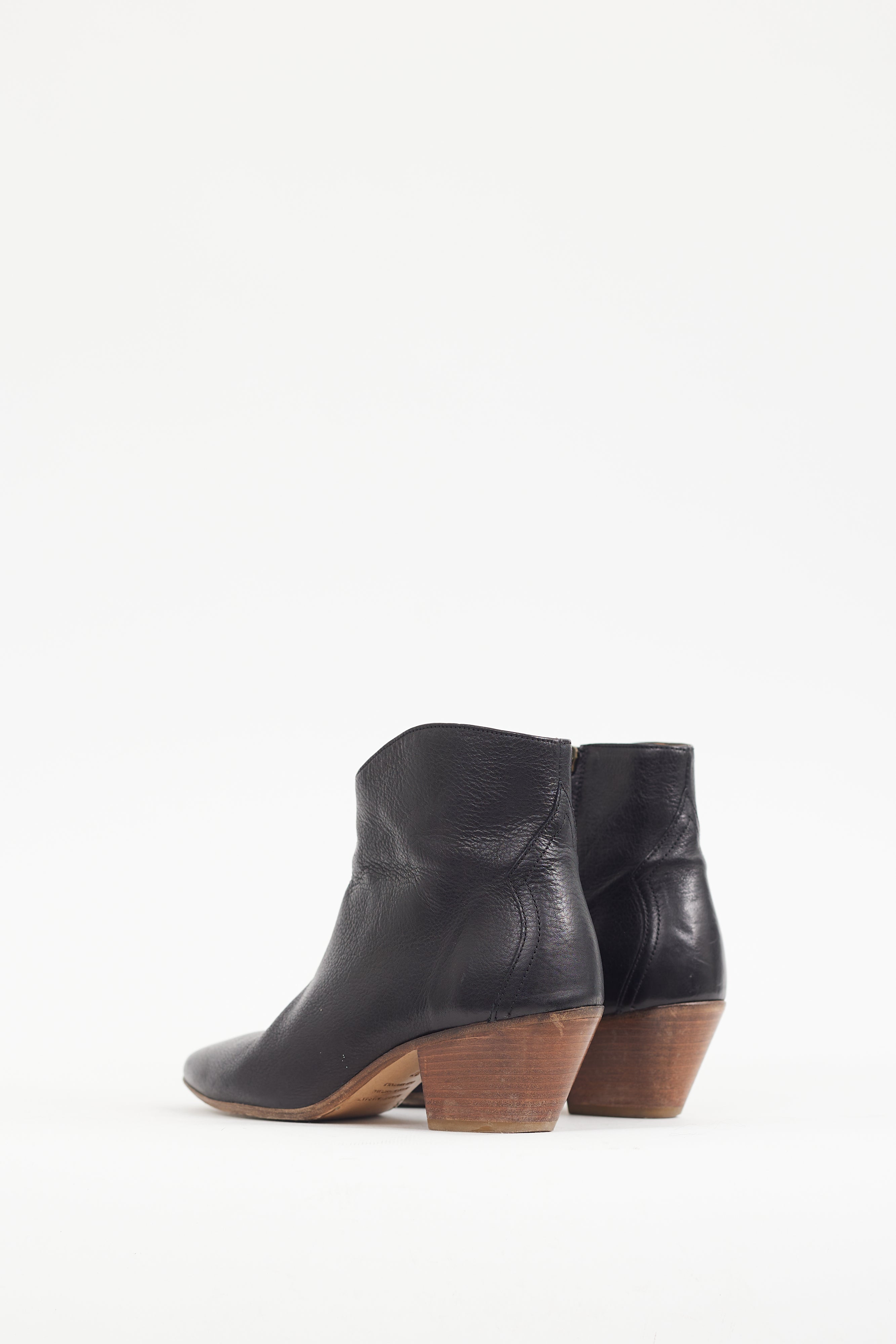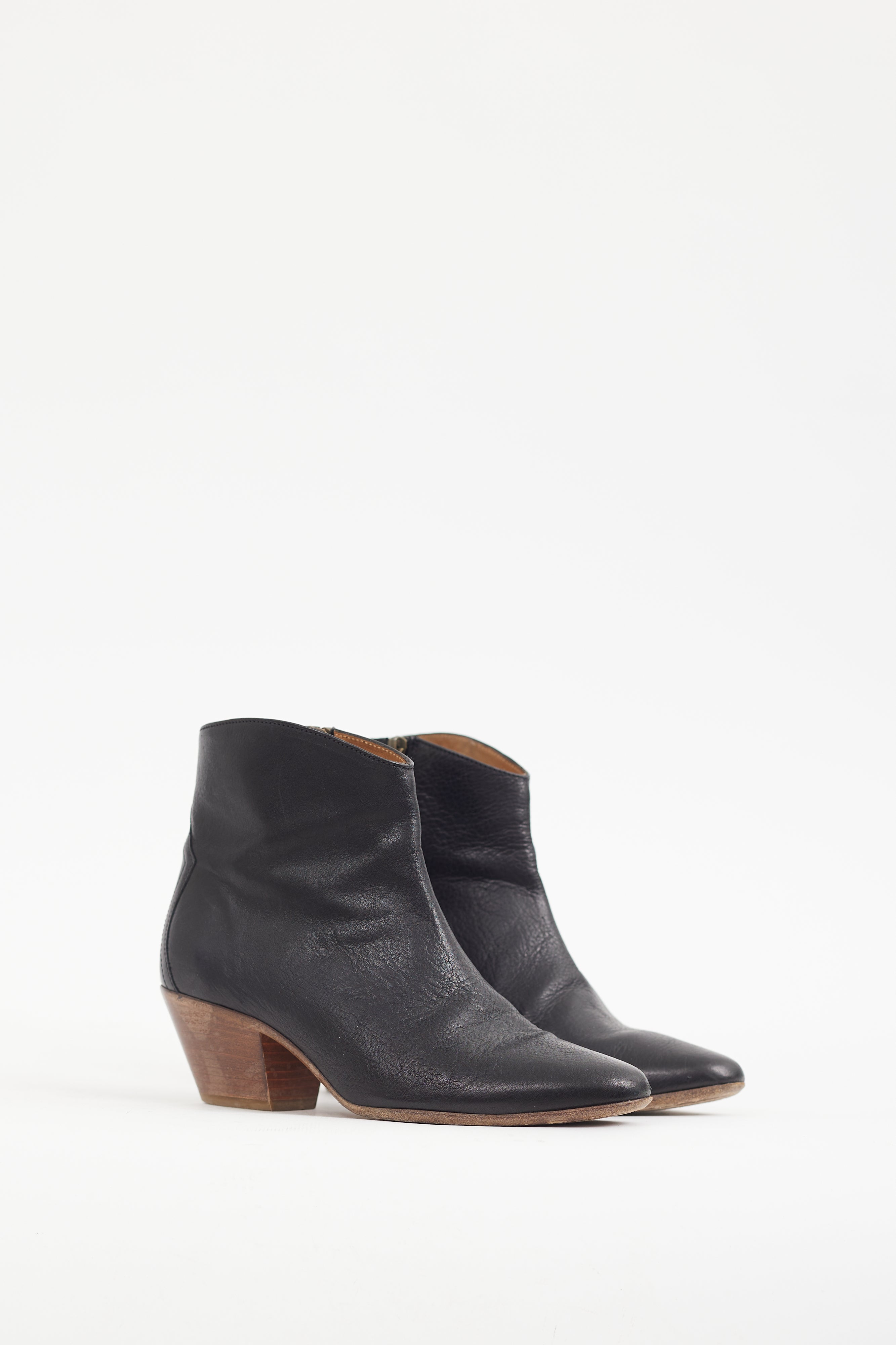 Pre-owned Isabel Marant brown Dacken ankle boots featuring an almond toe, leather uppers, western stitch styling at counter, inner side zip closure, and a short stacked heel.
