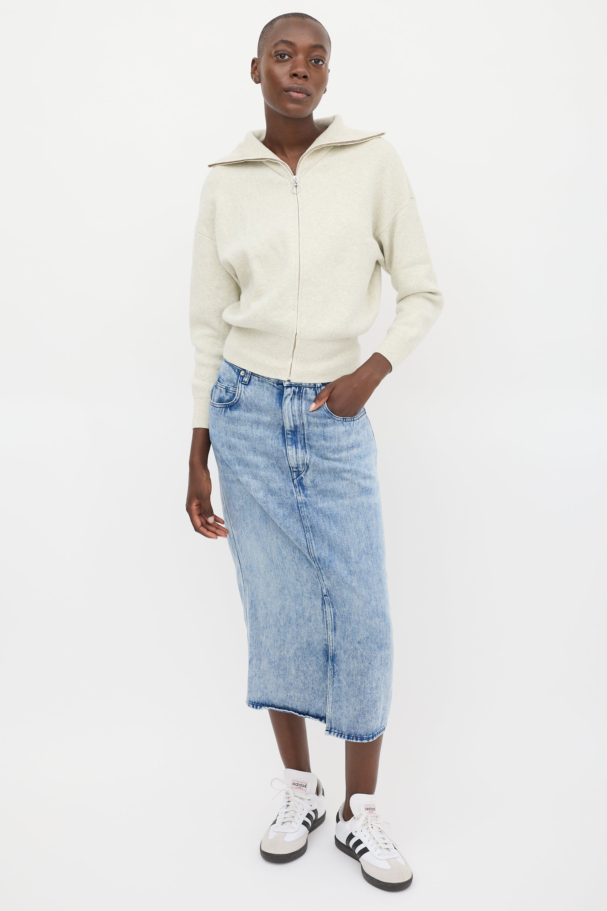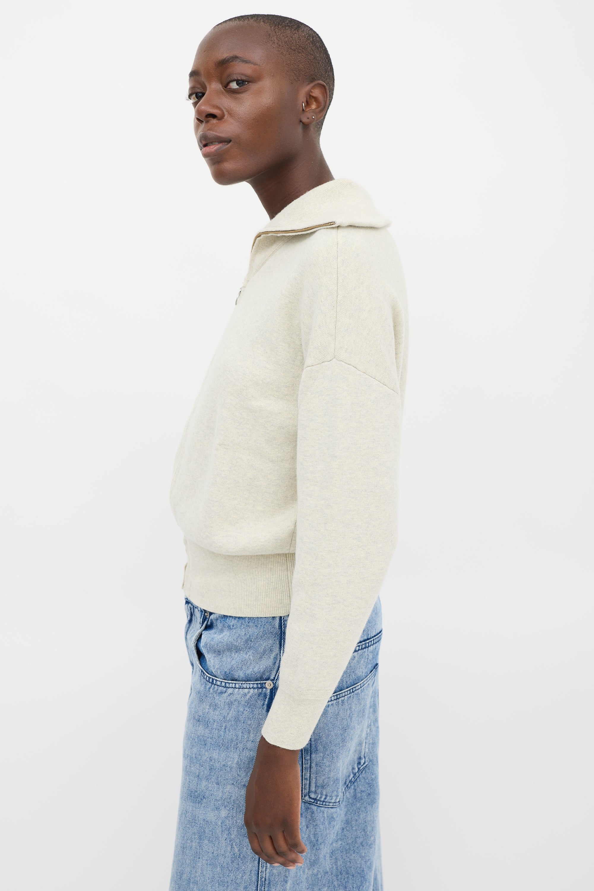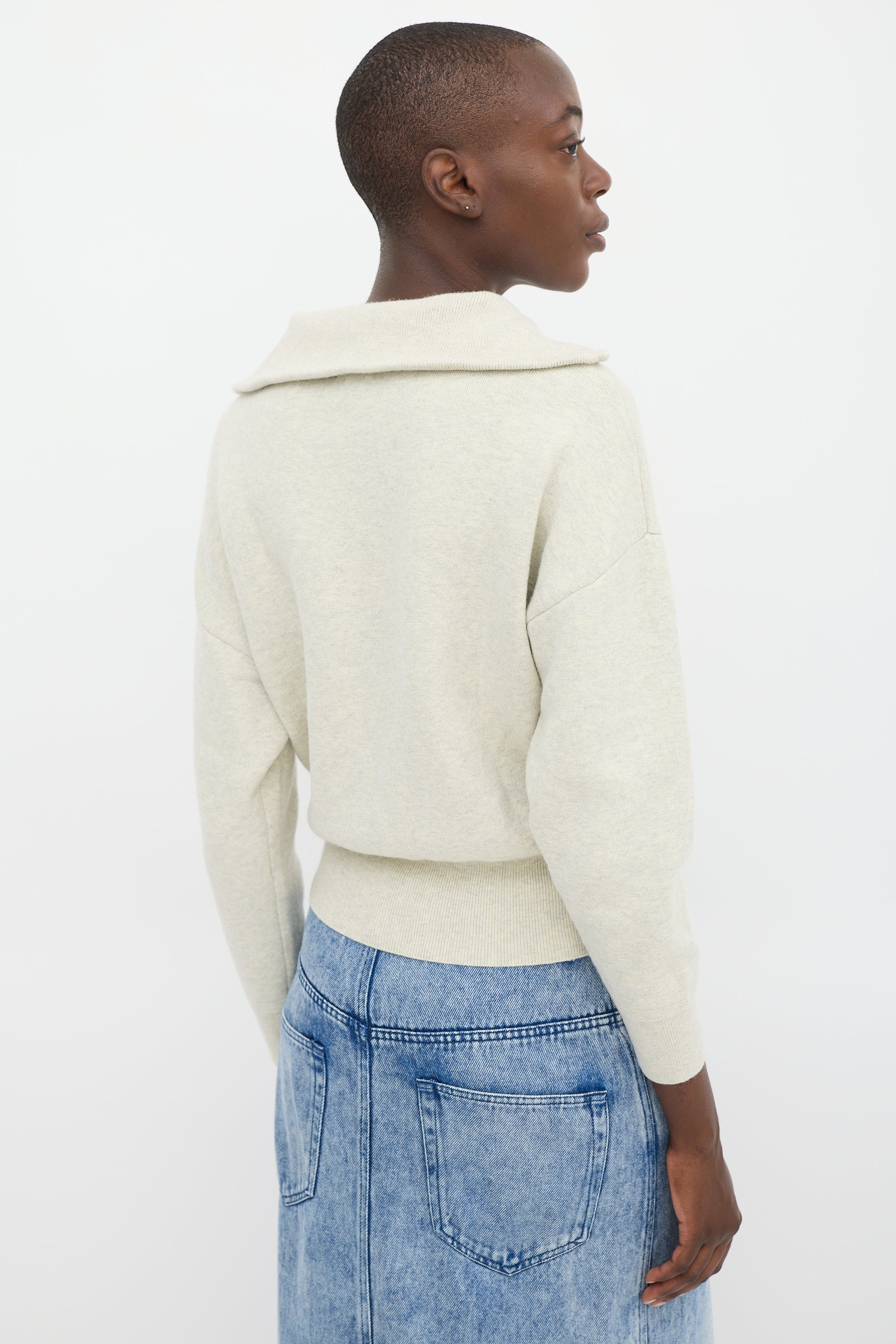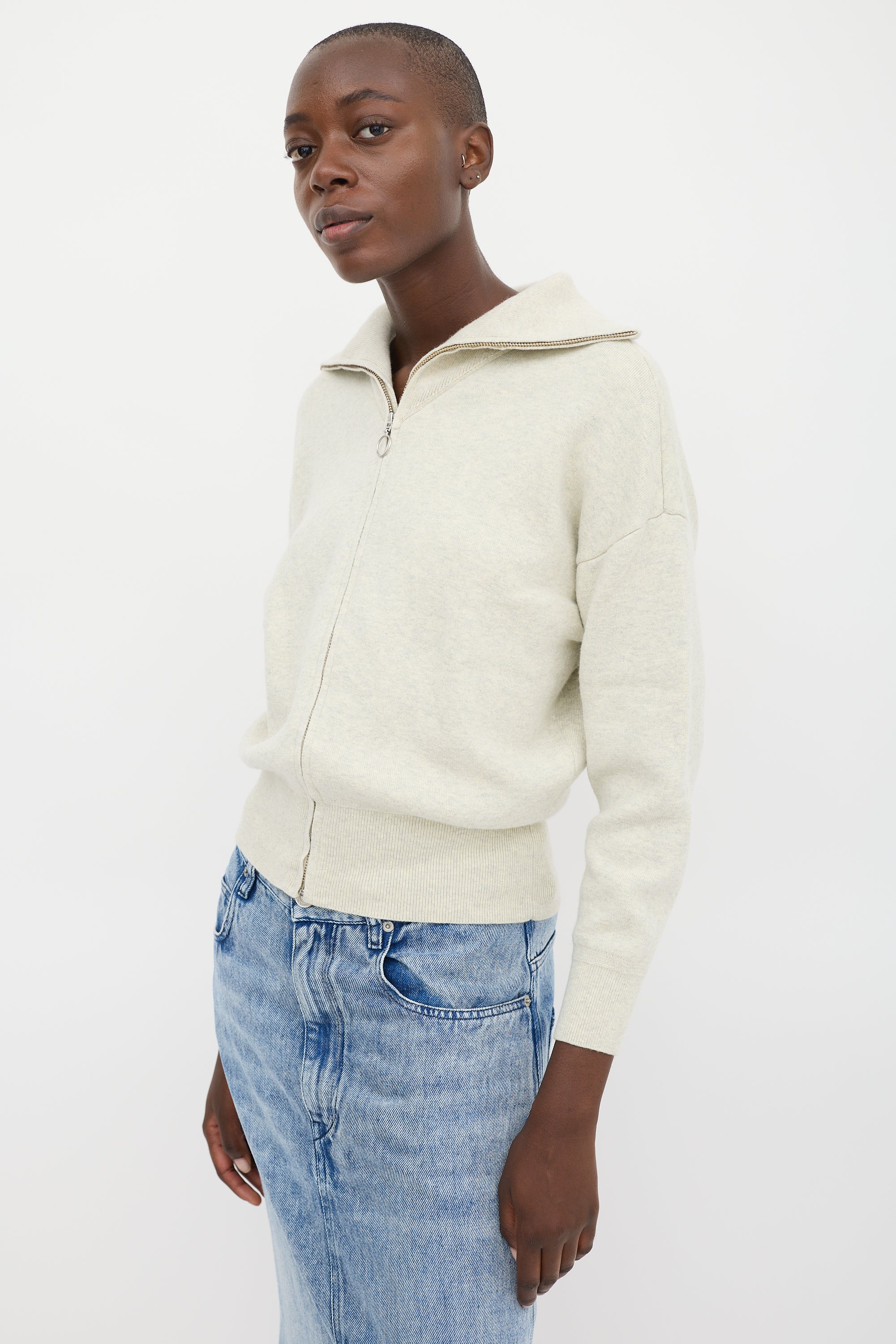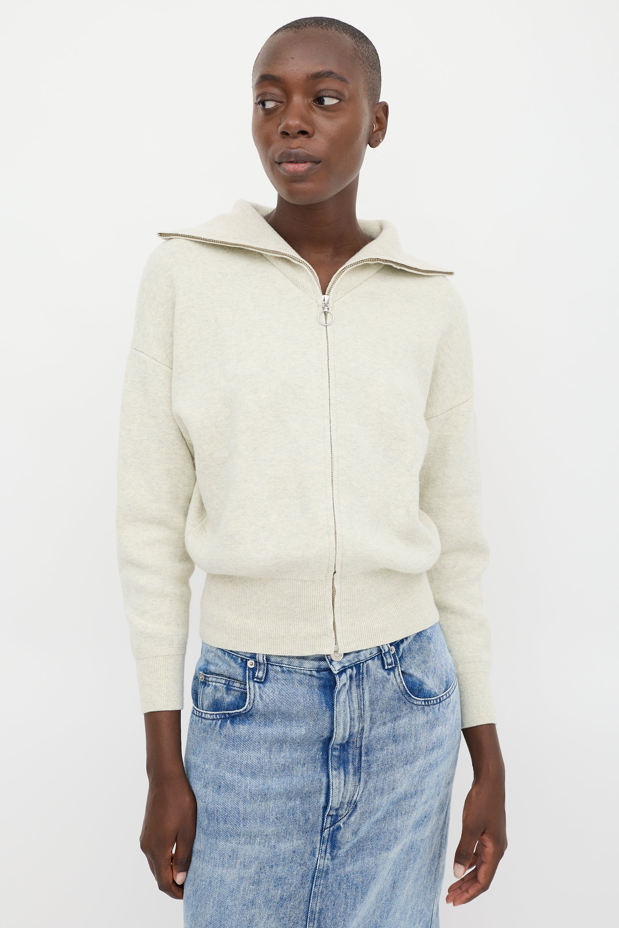 Pre-owned Isabel Marant Étoile beige cotton and wool blend cardigan featuring a sailor collar, full zip, dropped shoulders, long sleeves, and ribbing at collar, hem, and cuffs.