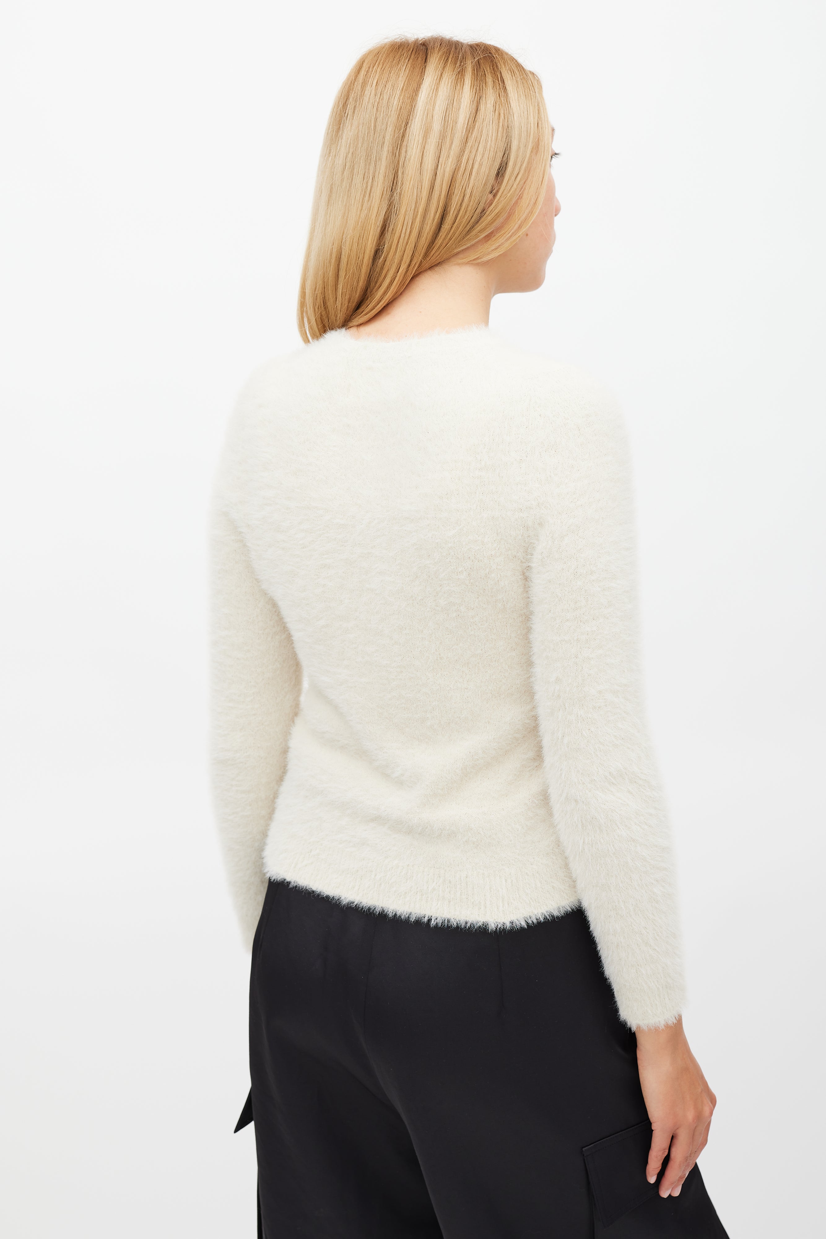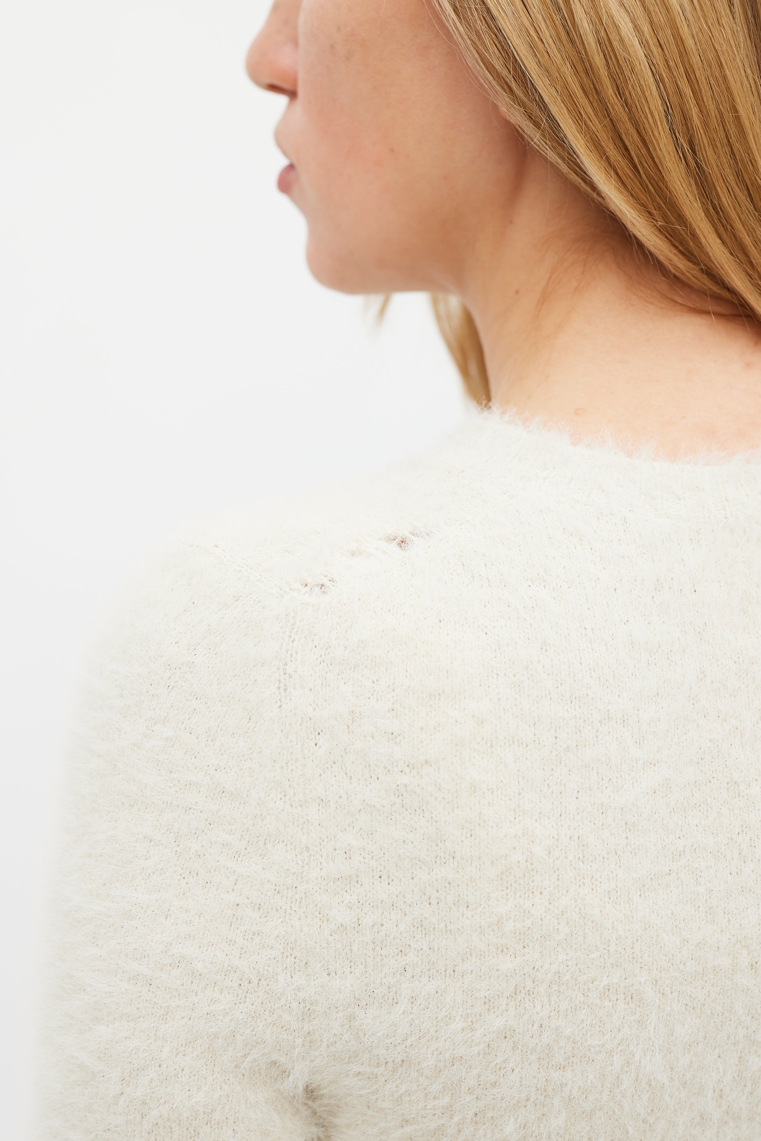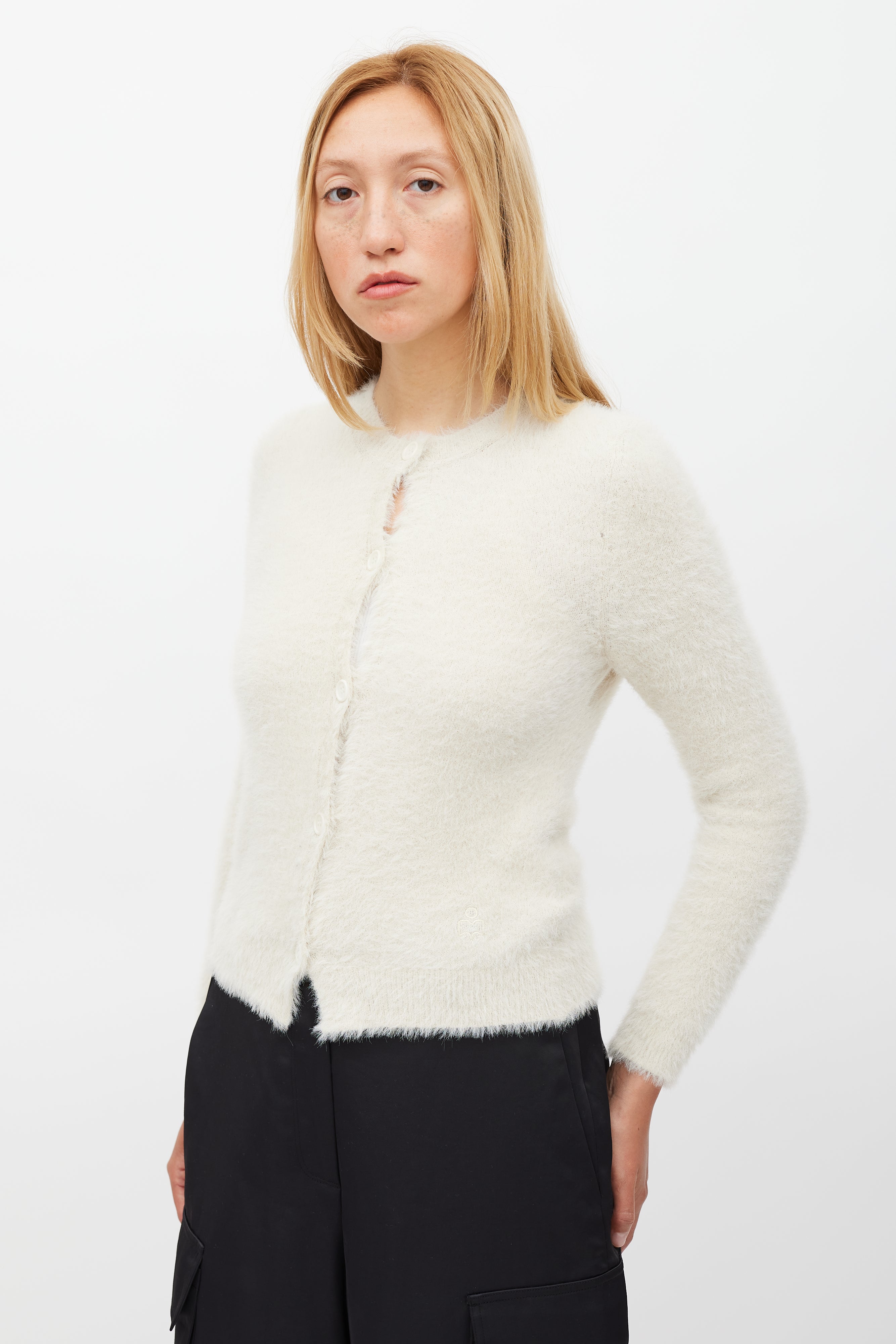 Pre-owned Isabel Marant Étoile beige fuzzy Olena cardigan featuring a round neckline, button up front, tonal embroidered logo at front left hem, and ribbing at neck, hem, and cuffs.