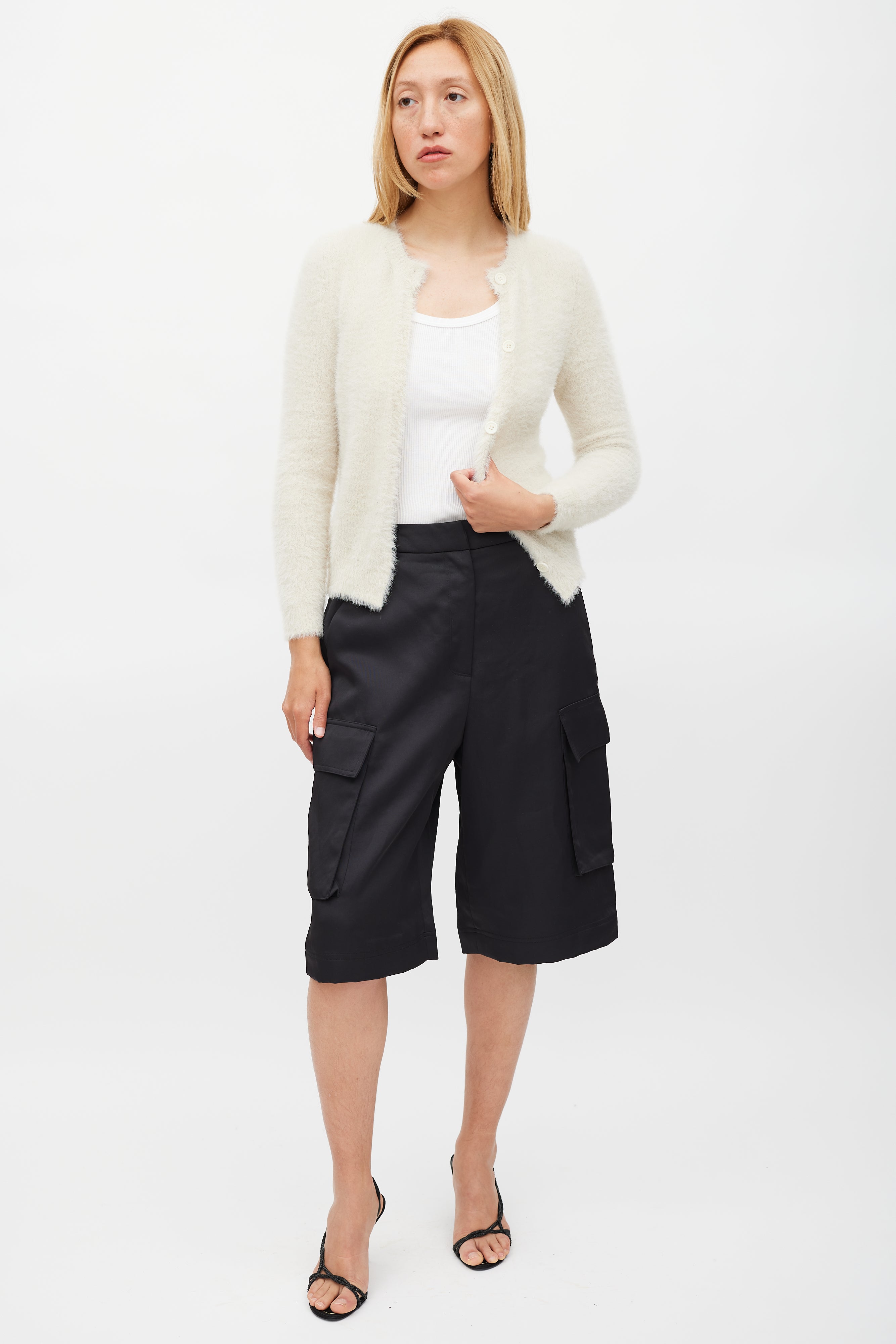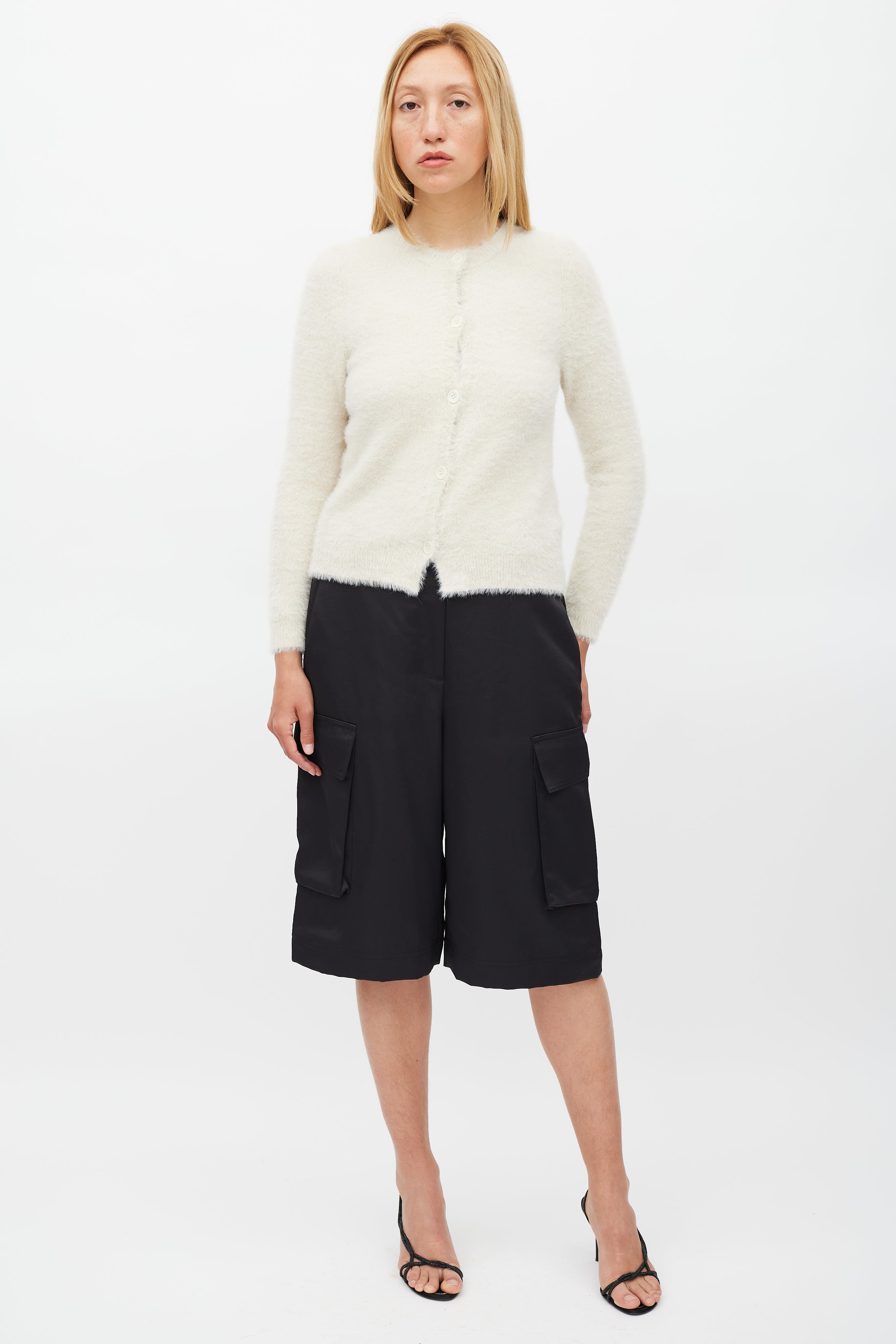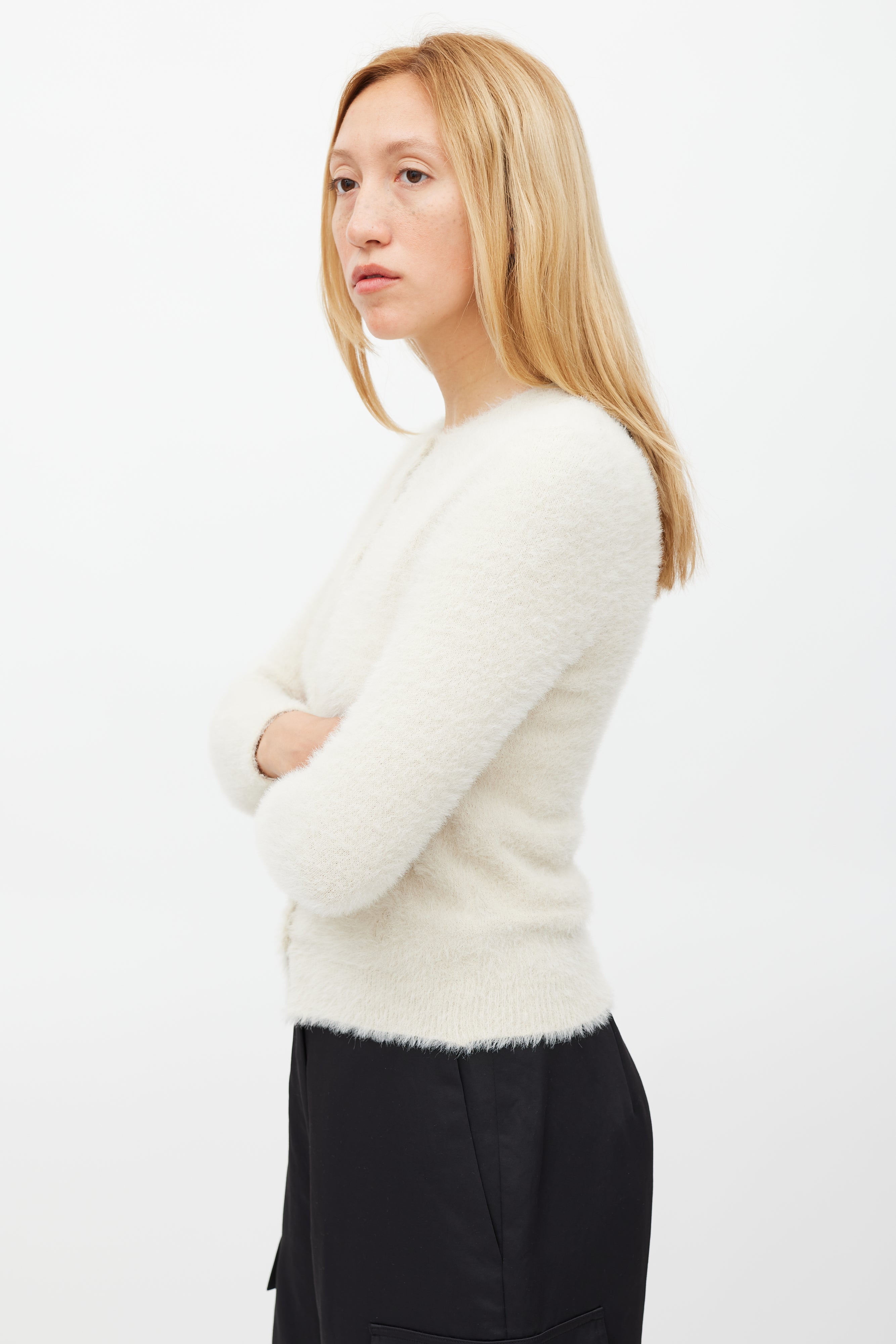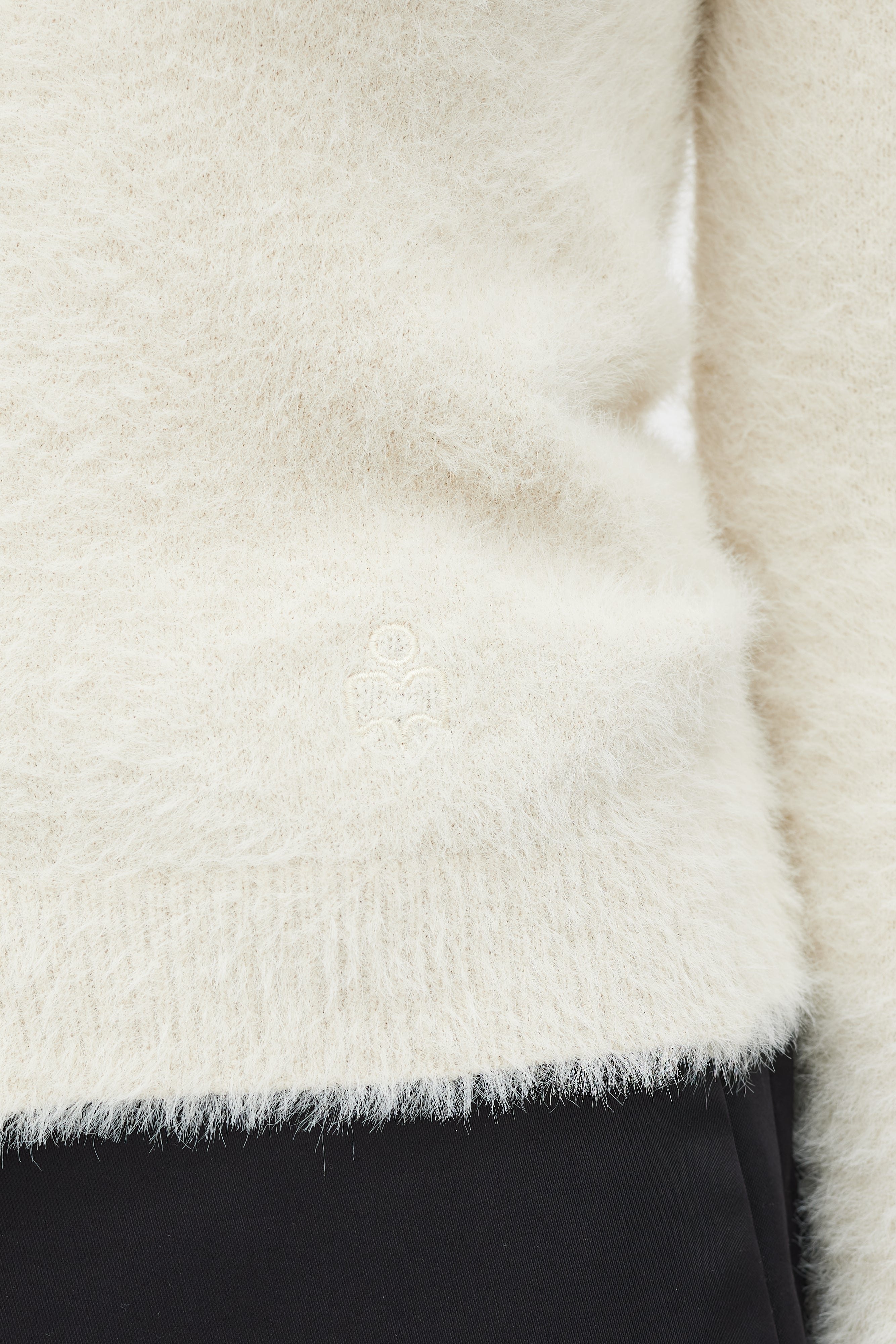 Pre-owned Isabel Marant Étoile beige fuzzy Olena cardigan featuring a round neckline, button up front, tonal embroidered logo at front left hem, and ribbing at neck, hem, and cuffs.