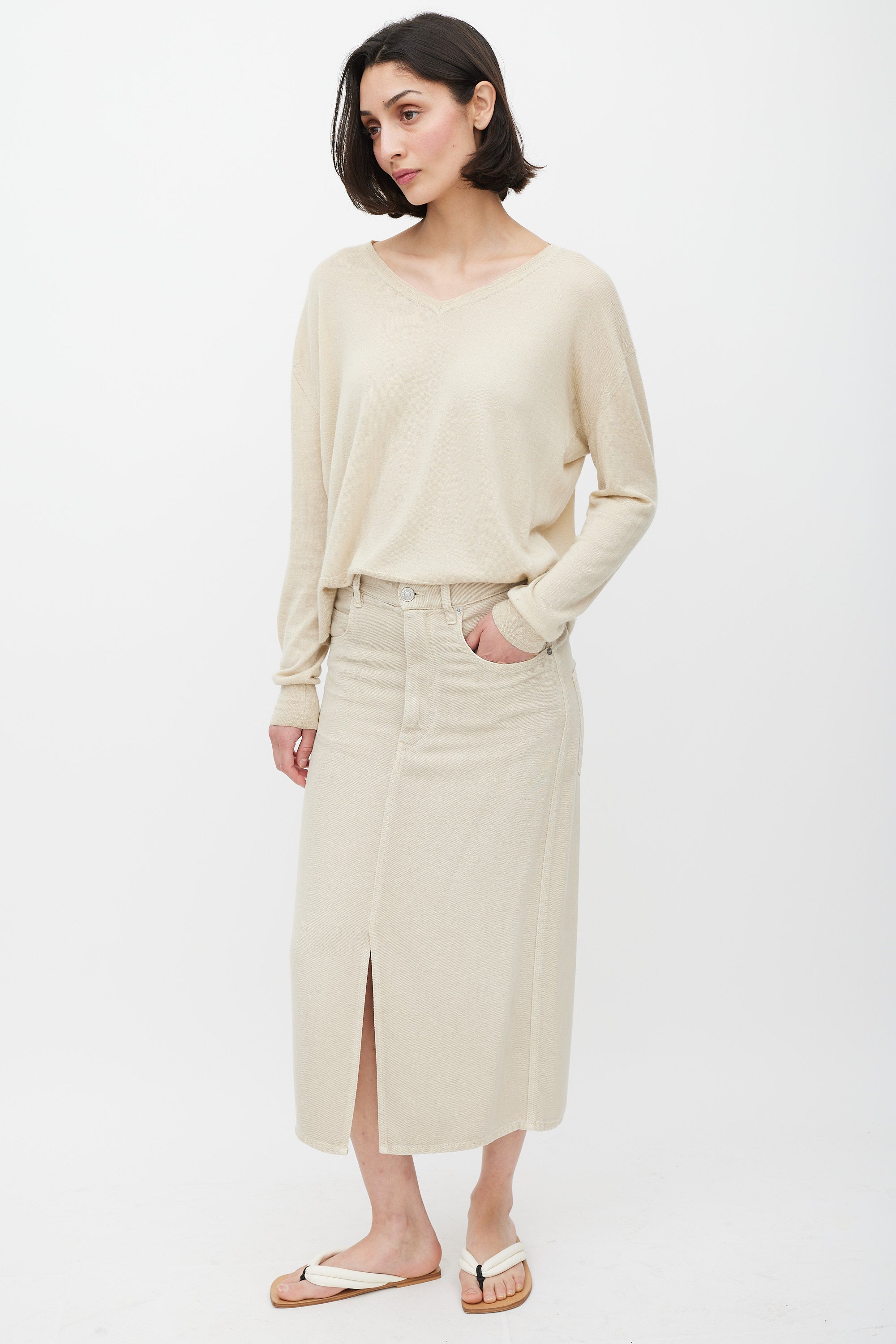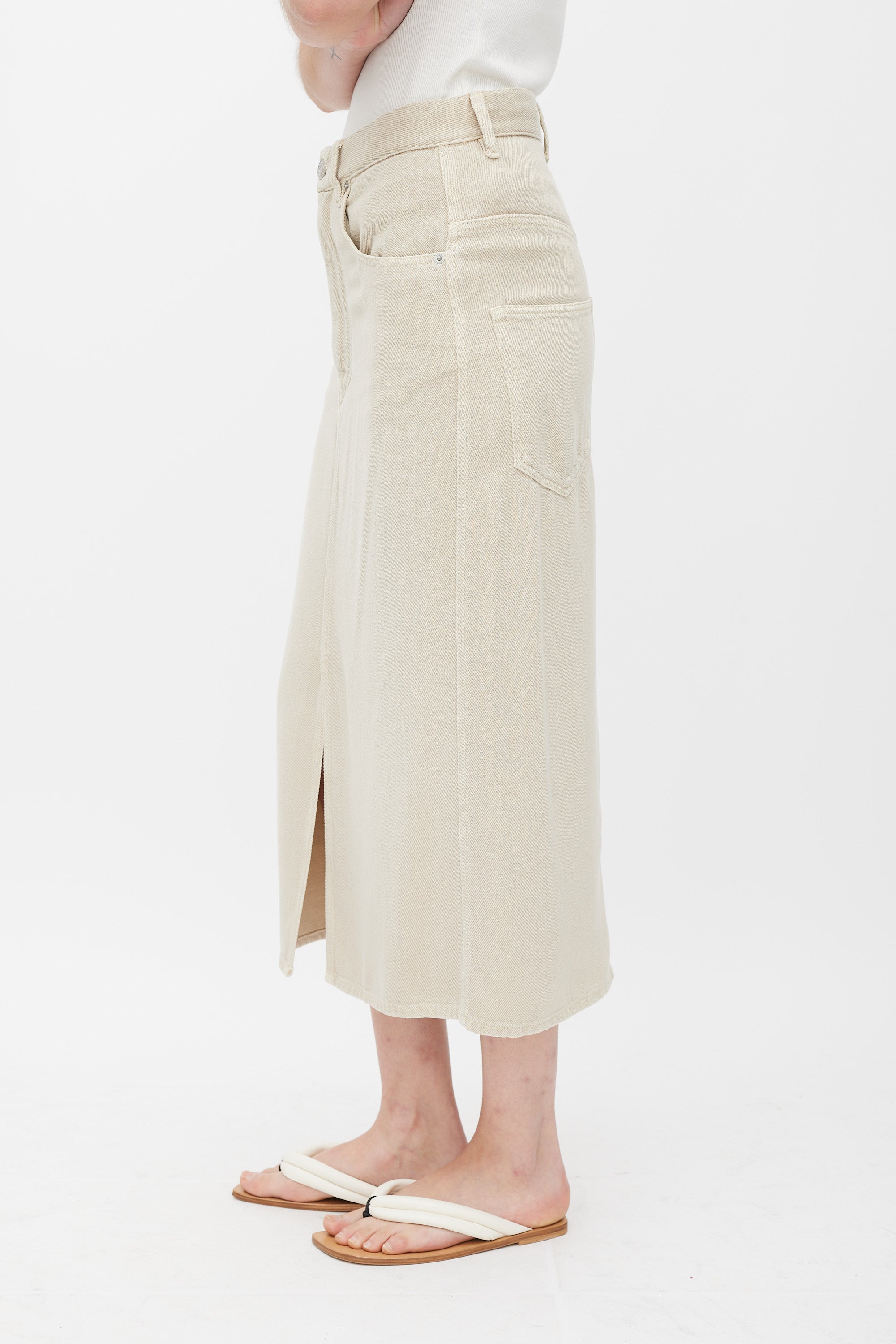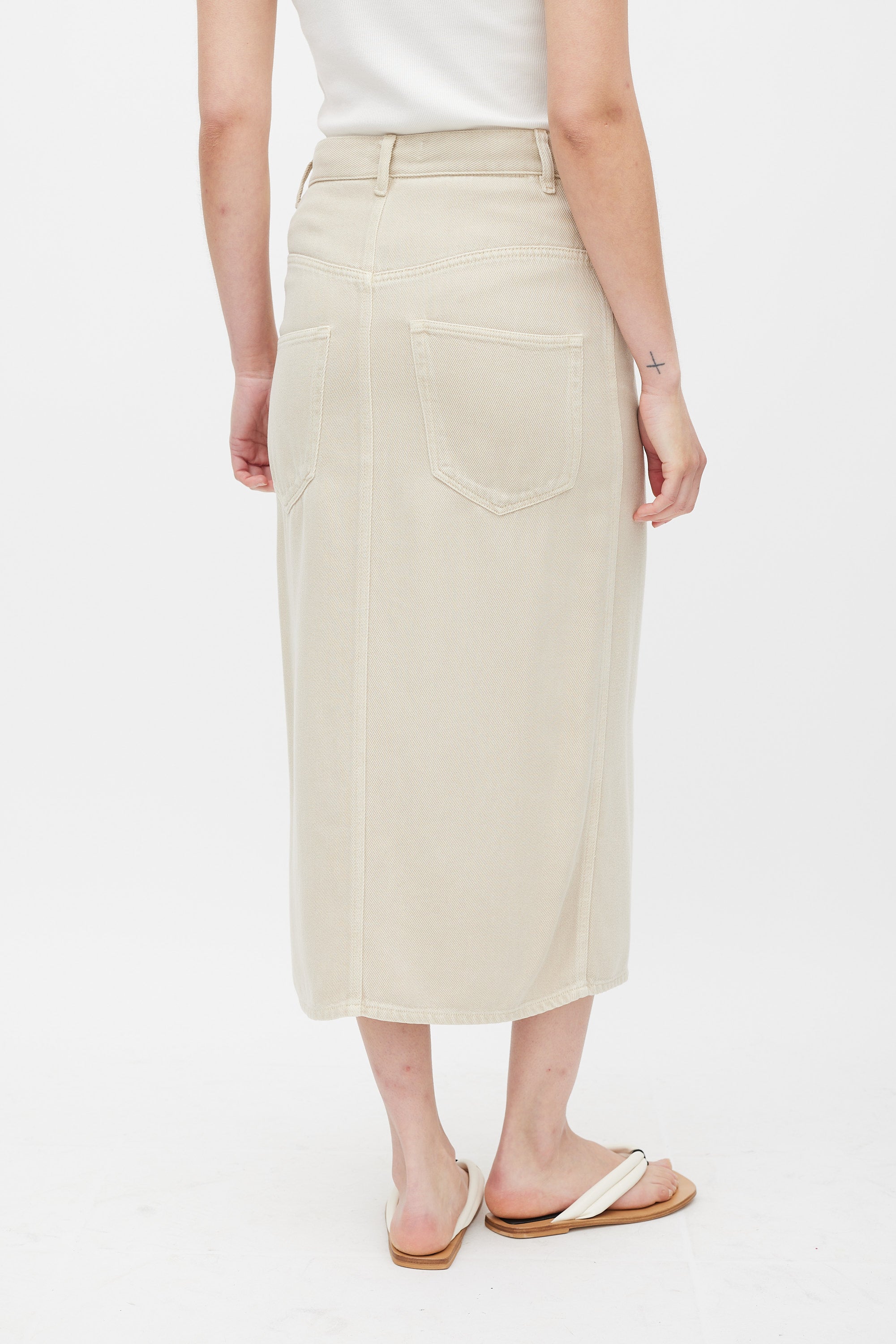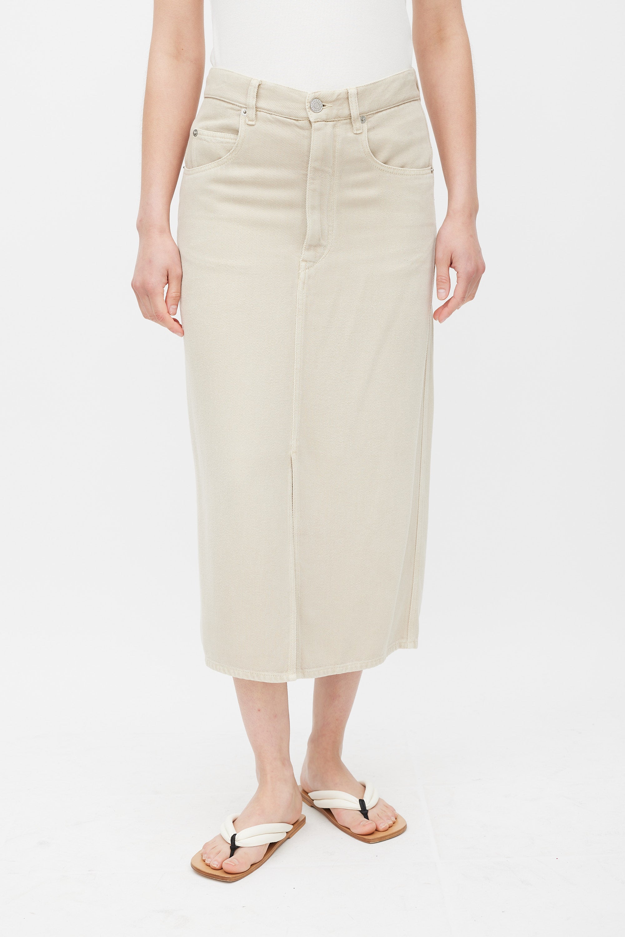Isabel Marant Étoile beige maxi skirt featuring five pocket styling, slit at hem, and zip fly with button closure.