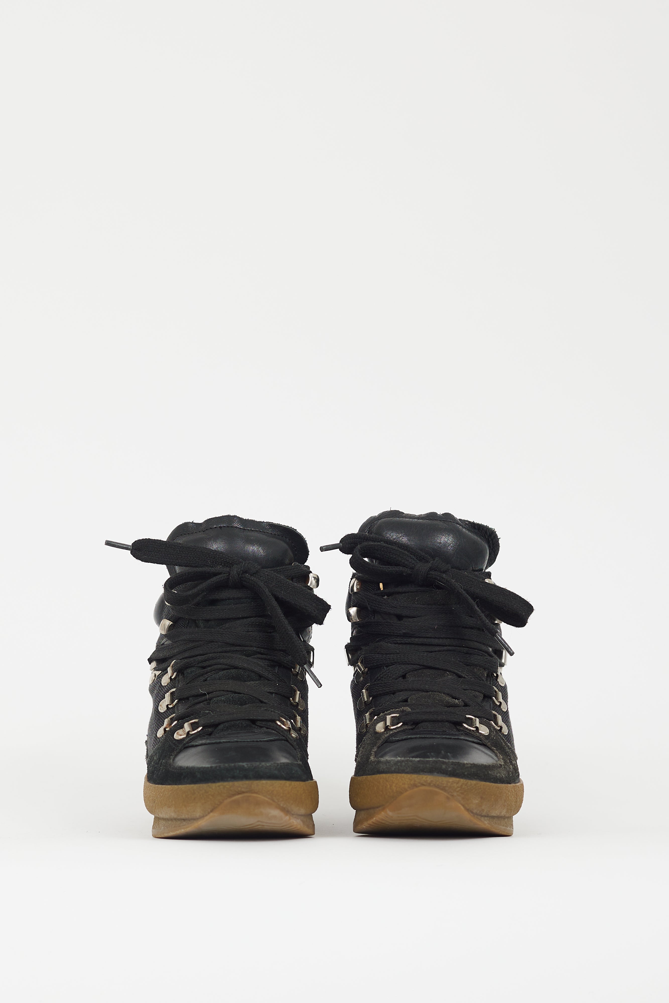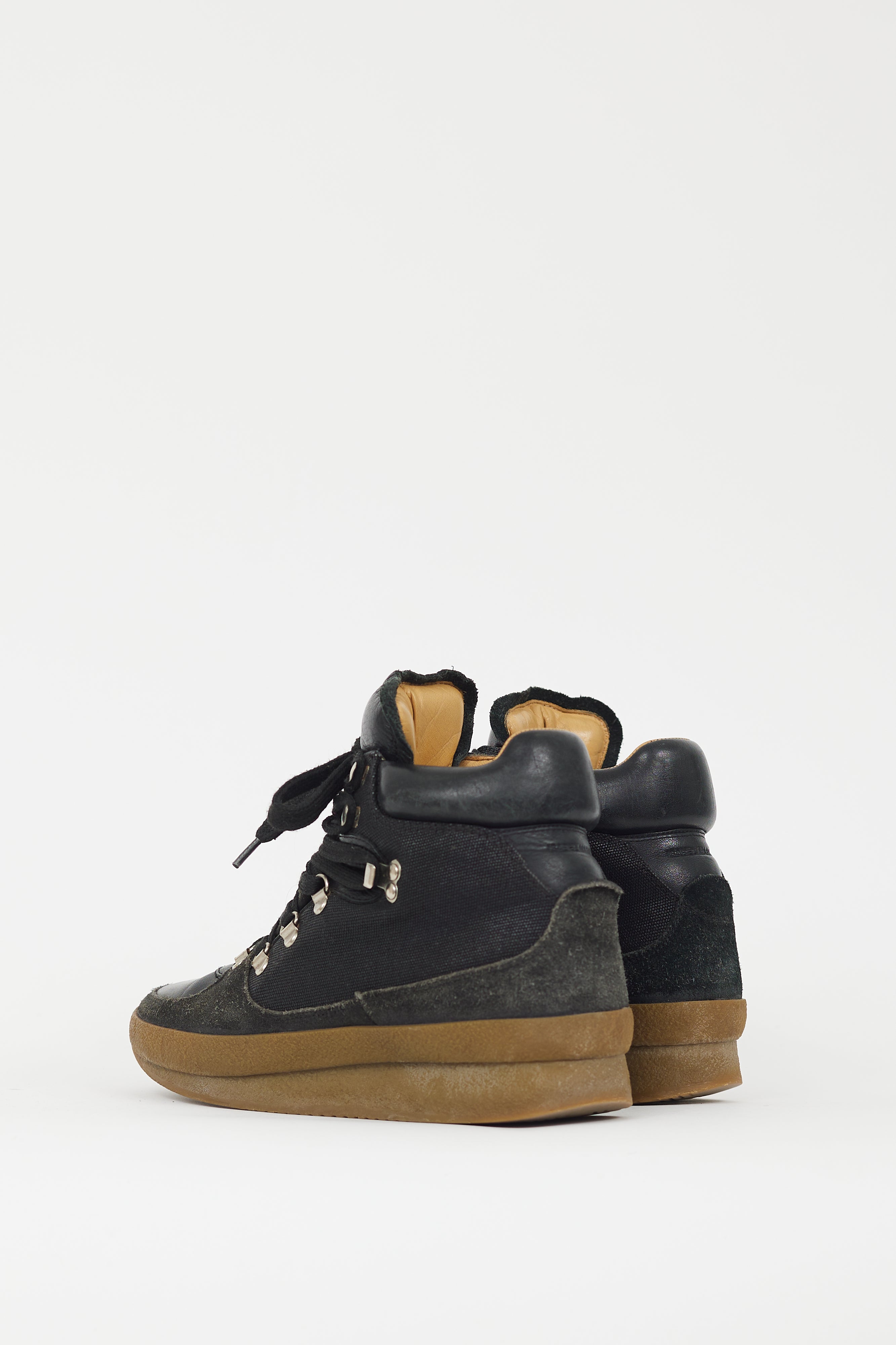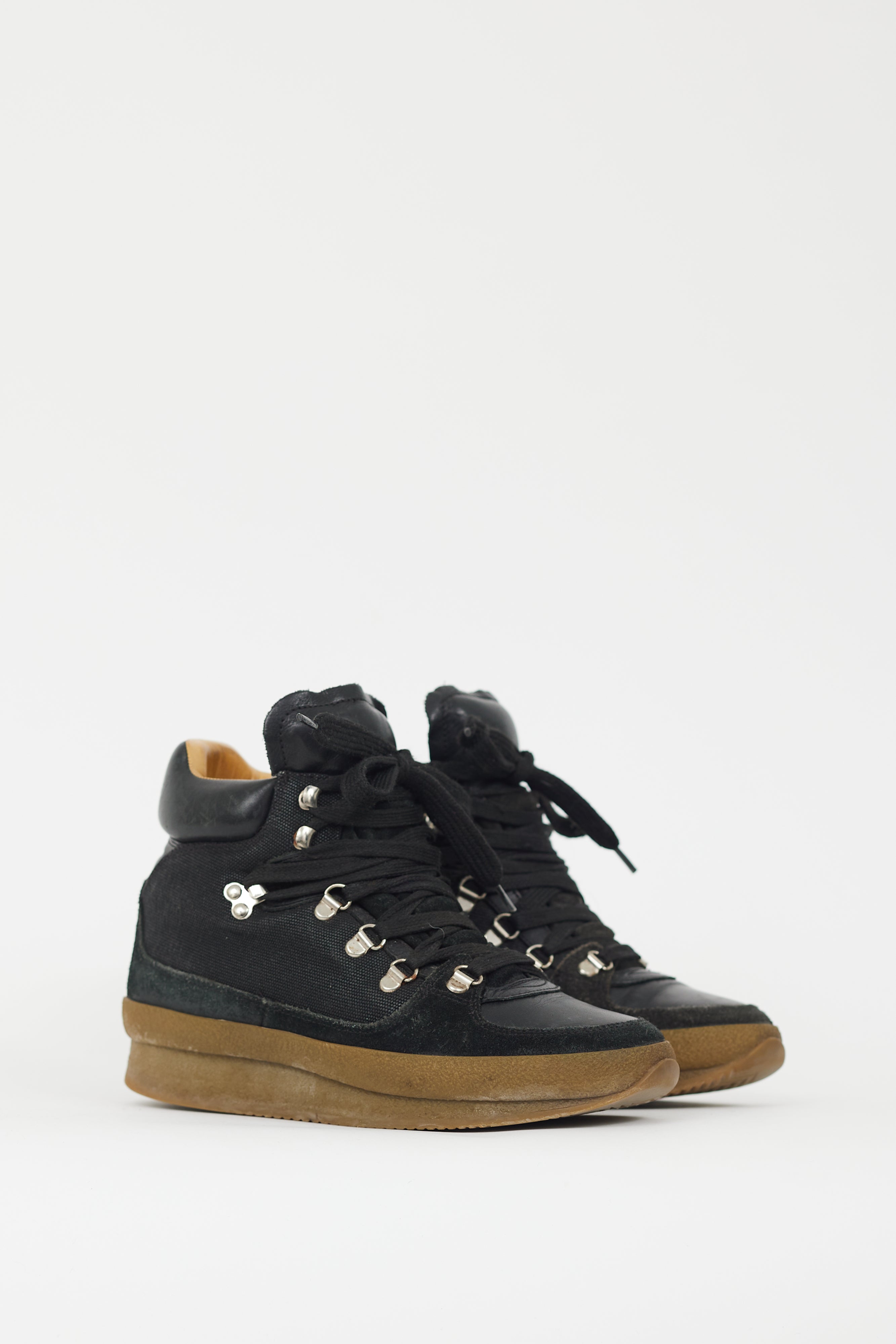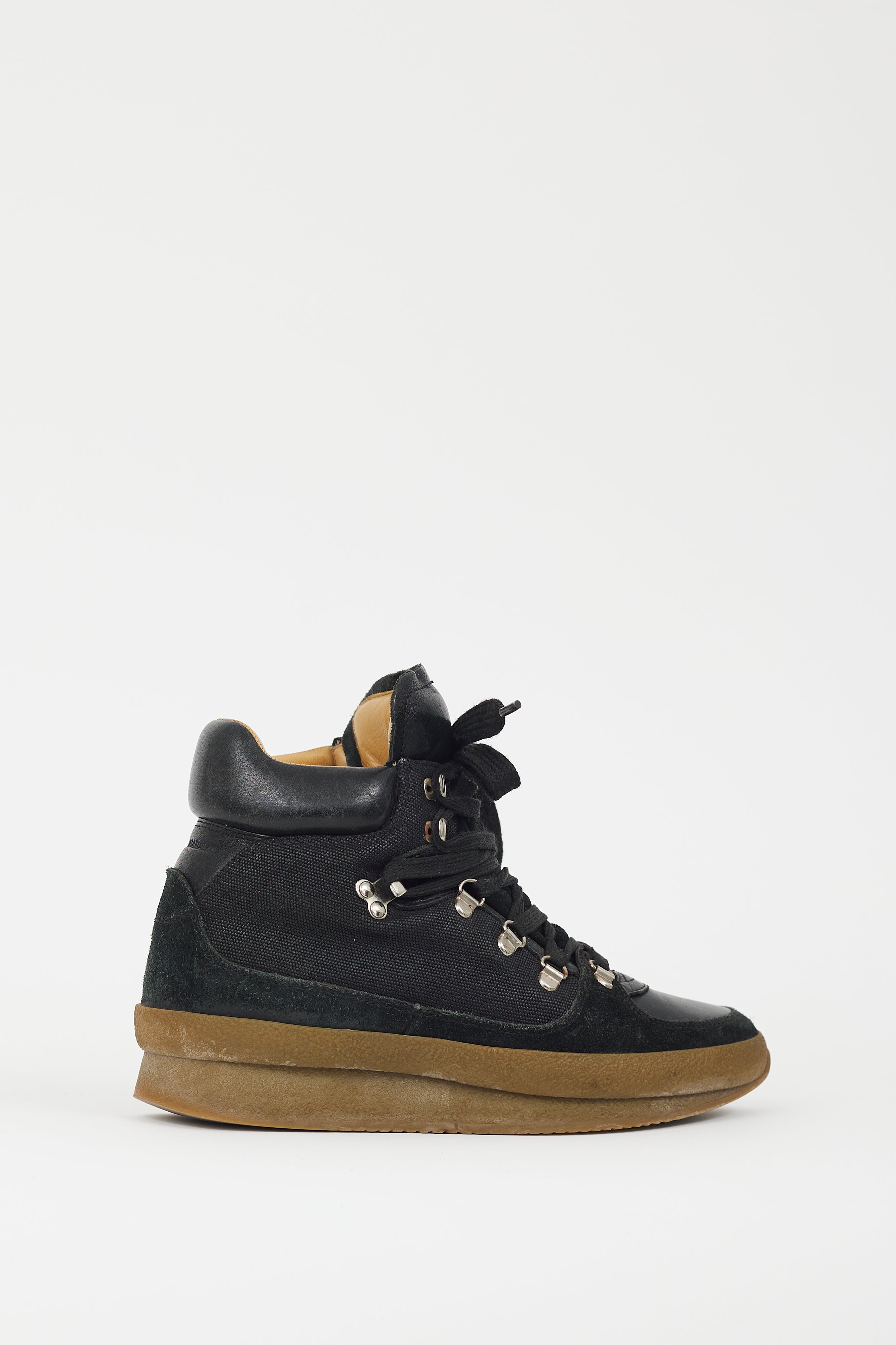 Pre-owned Isabel Marant Étoile black Brent hiking boots featuring a rounded toe, leather, suede, and canvas uppers, lace up front with silver tone hardware, and a brown platform gum sole. Comes with original dust bags.