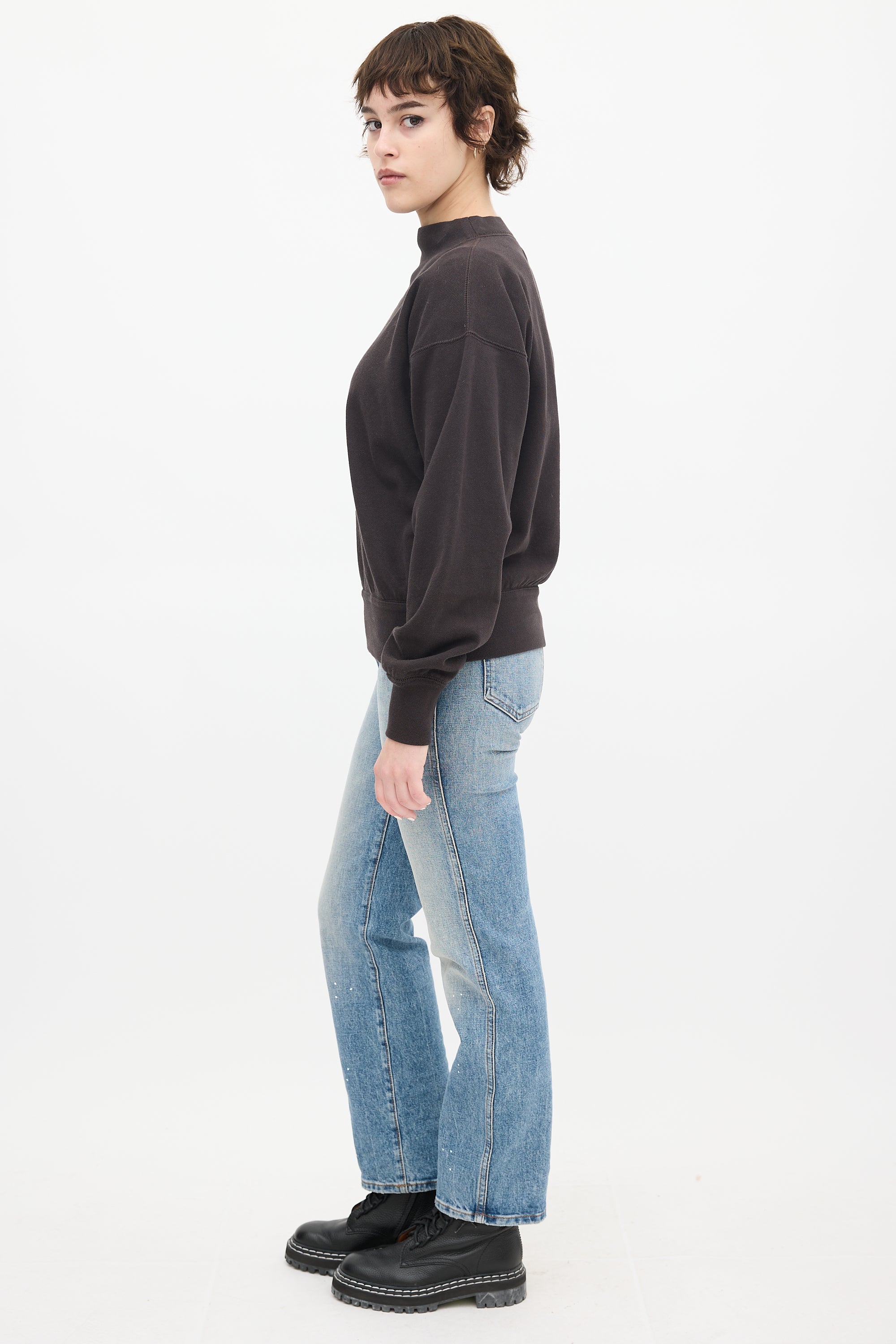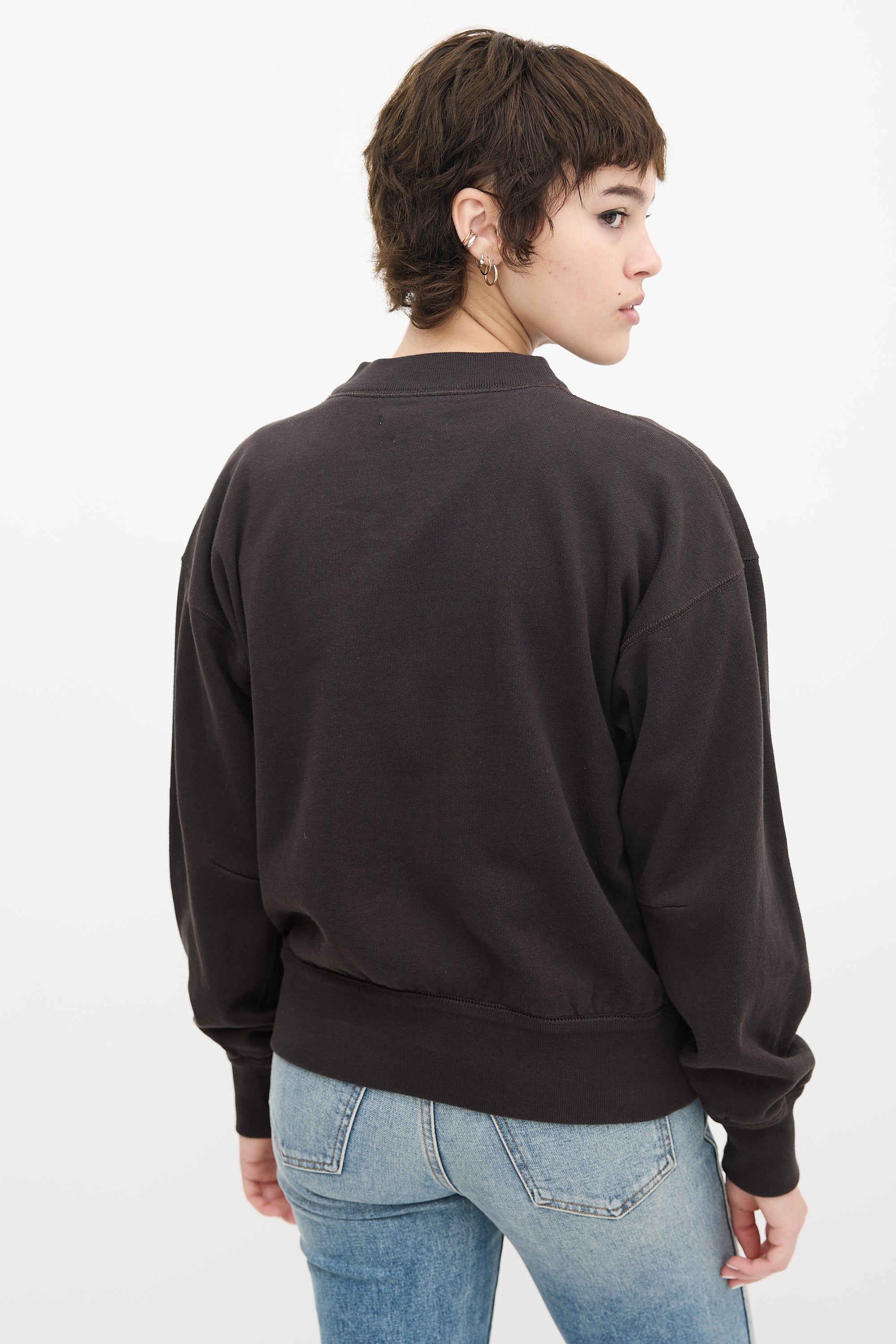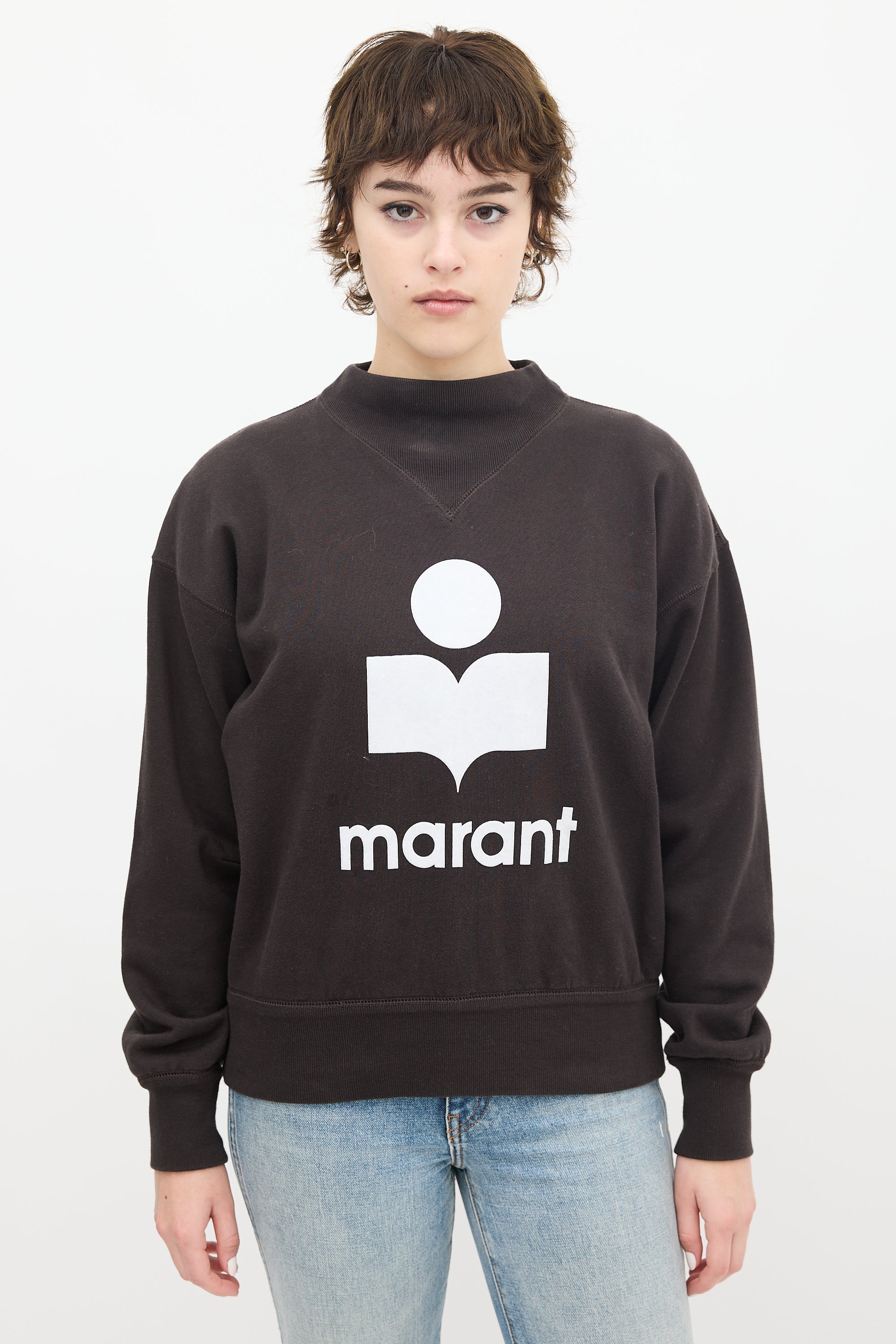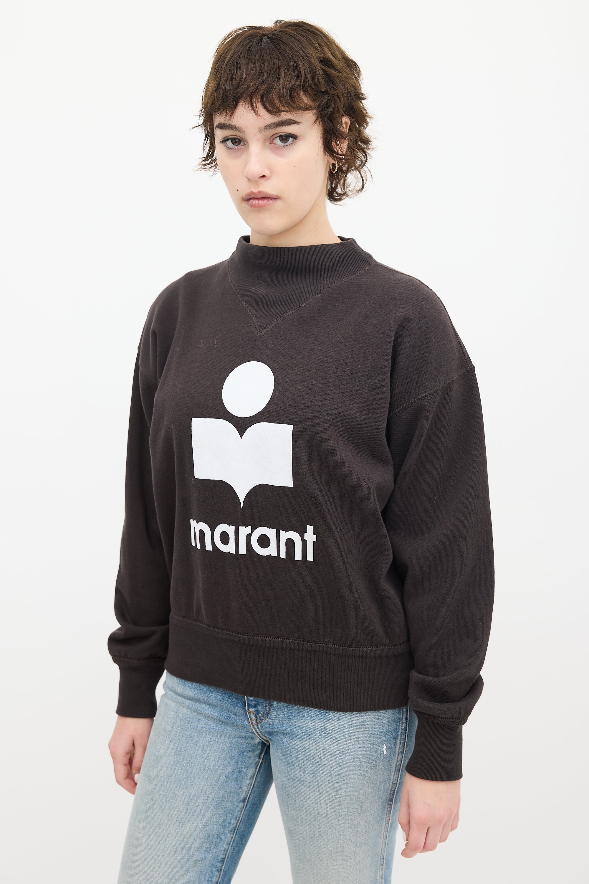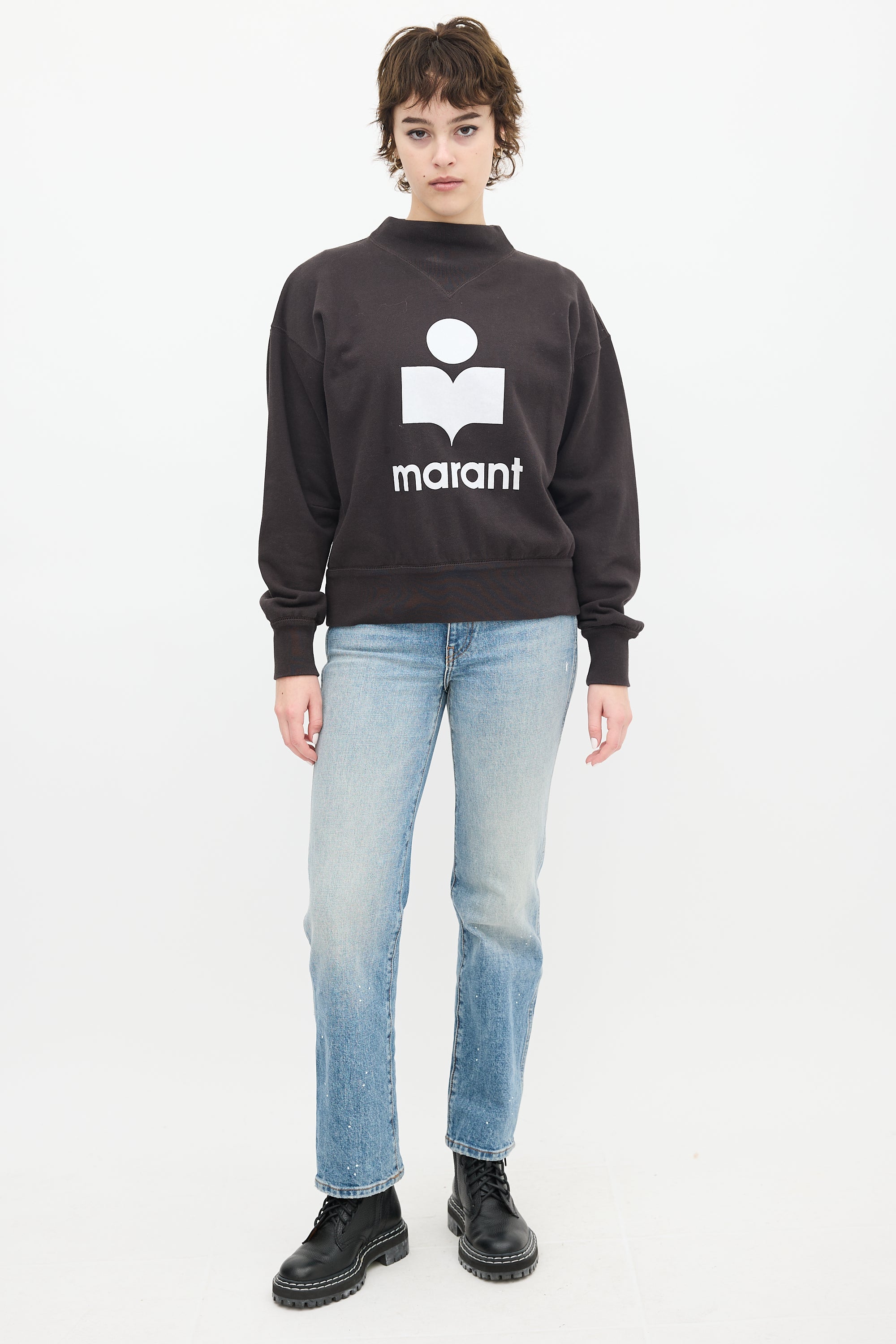 Pre-owned Isabel Marant Etoile black Moby sweatshirt featuring a mock neck panel, white logo front, even hem, dropped shoulders, long sleeves, and ribbing at neck, hem, and cuffs.