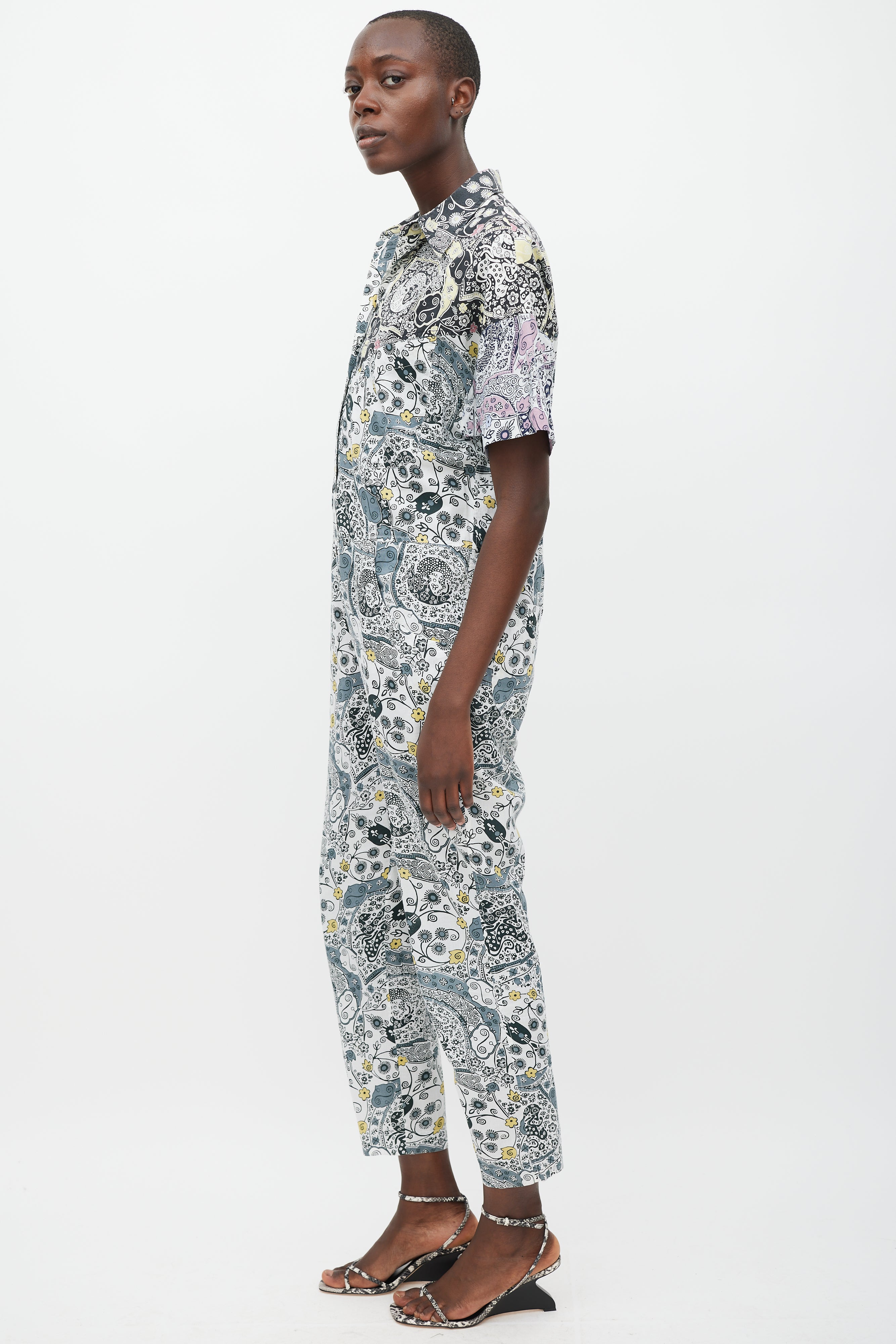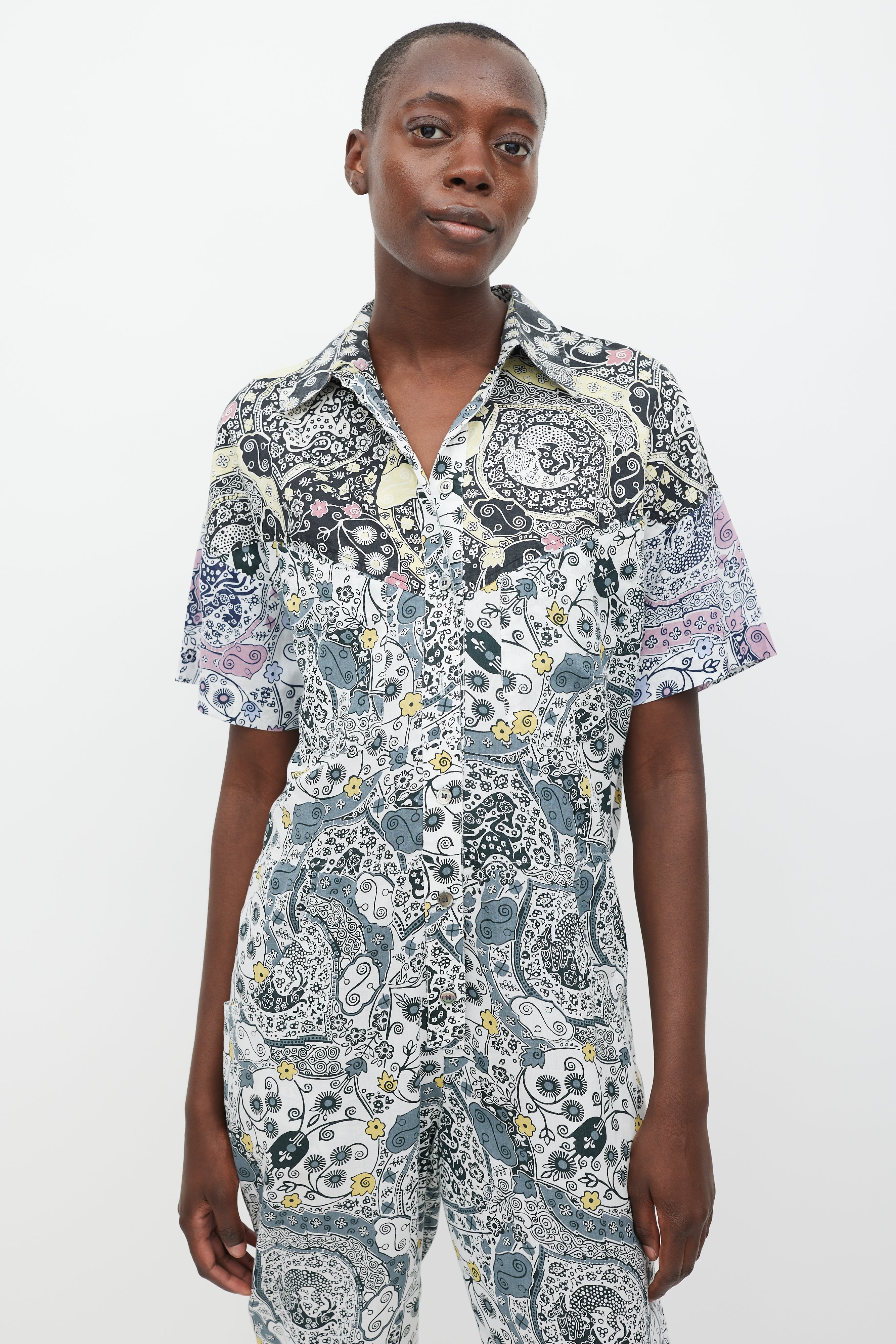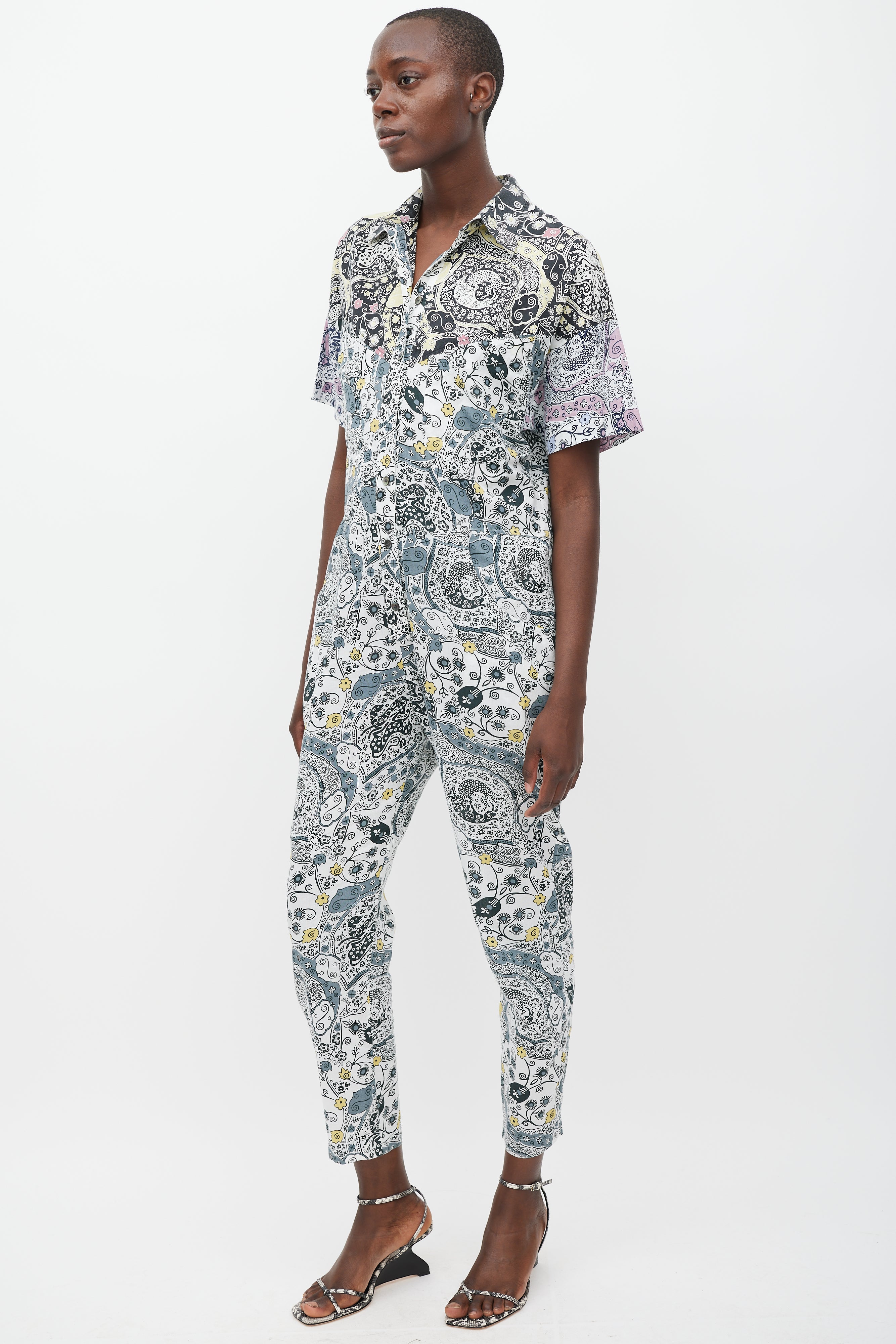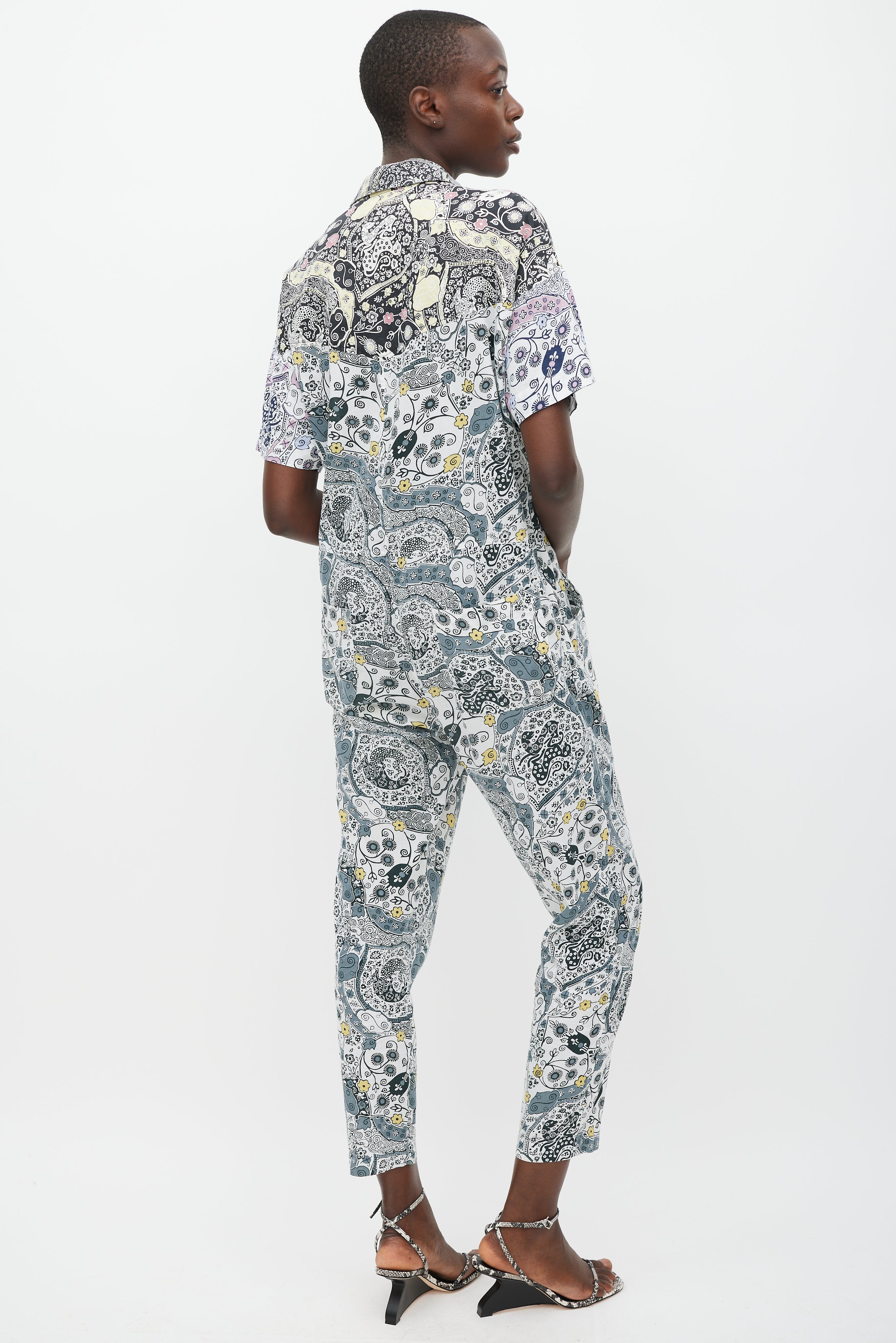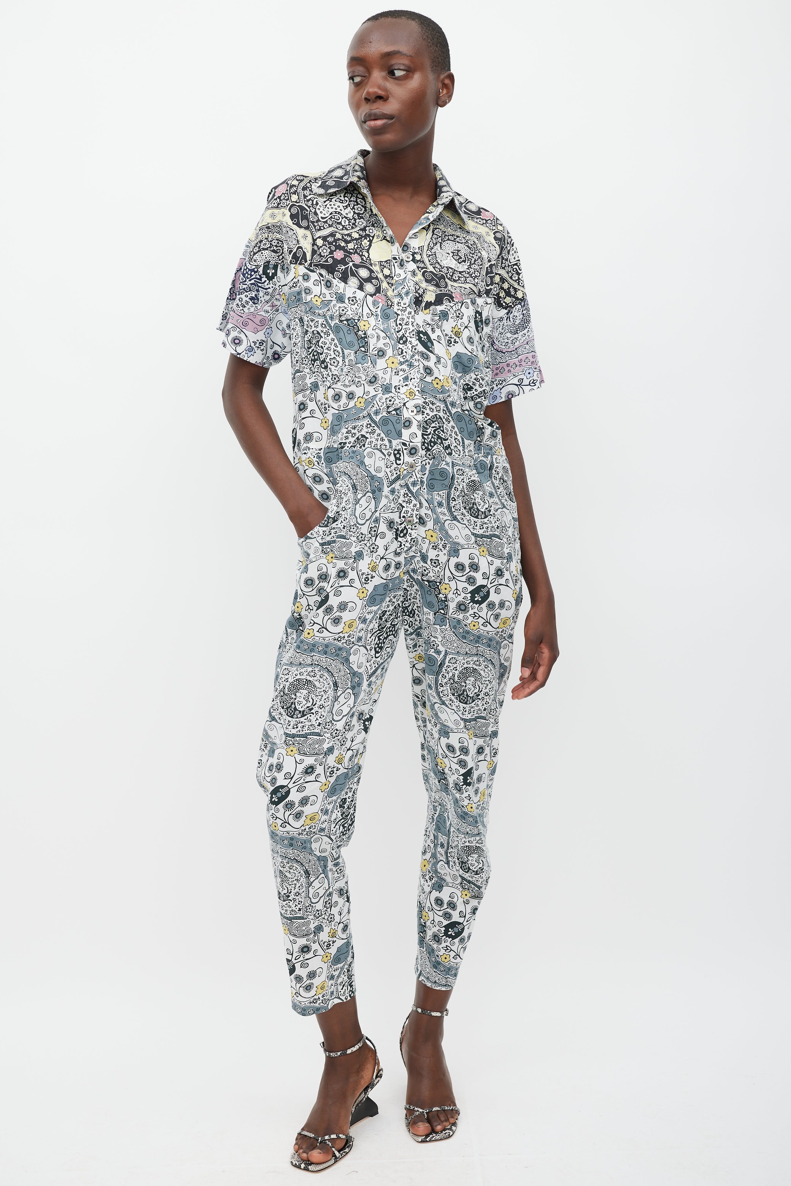 Pre-owned Isabel Marant Étoile black jumpsuit featuring a multicolour floral pattern throughout, pointed collar, short sleeves, two slip pockets at chest, two slip pockets at hip, tapered leg, and button up closure.