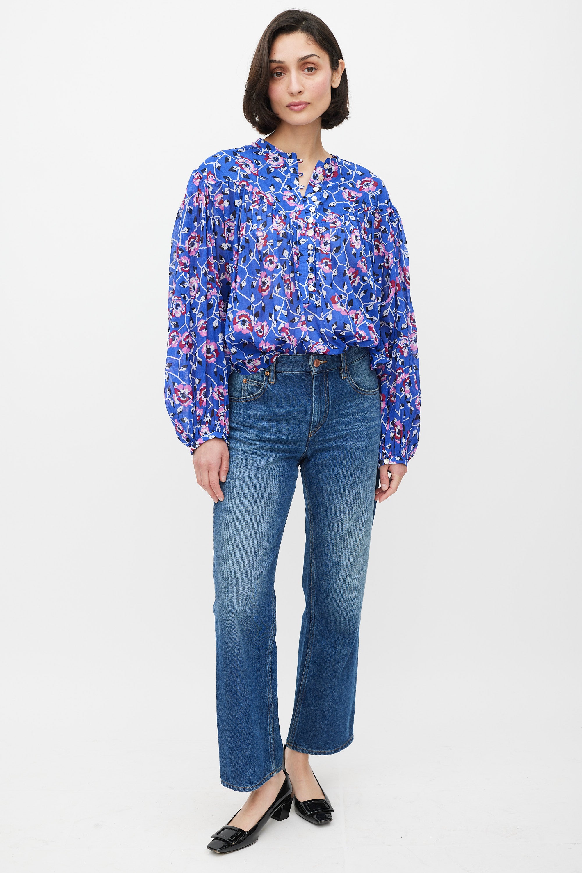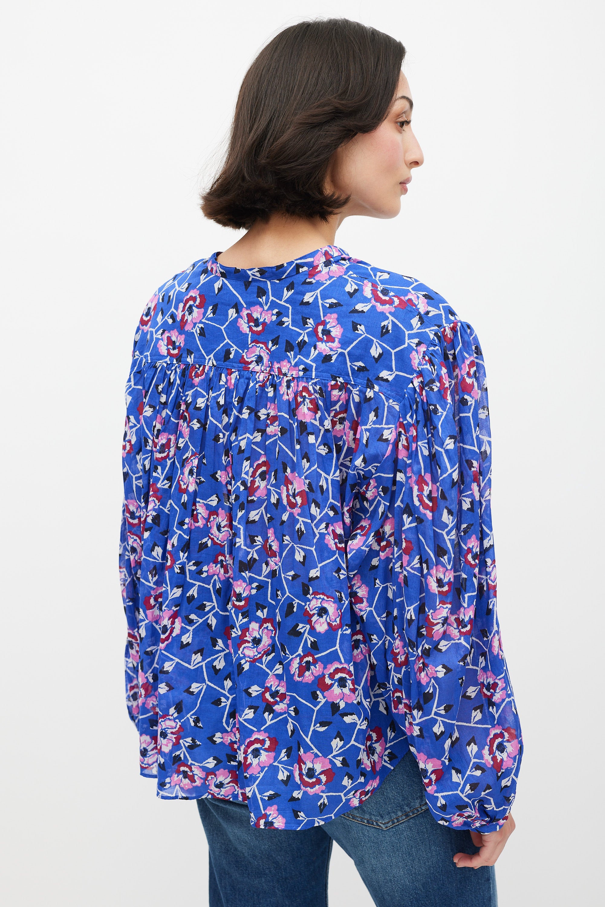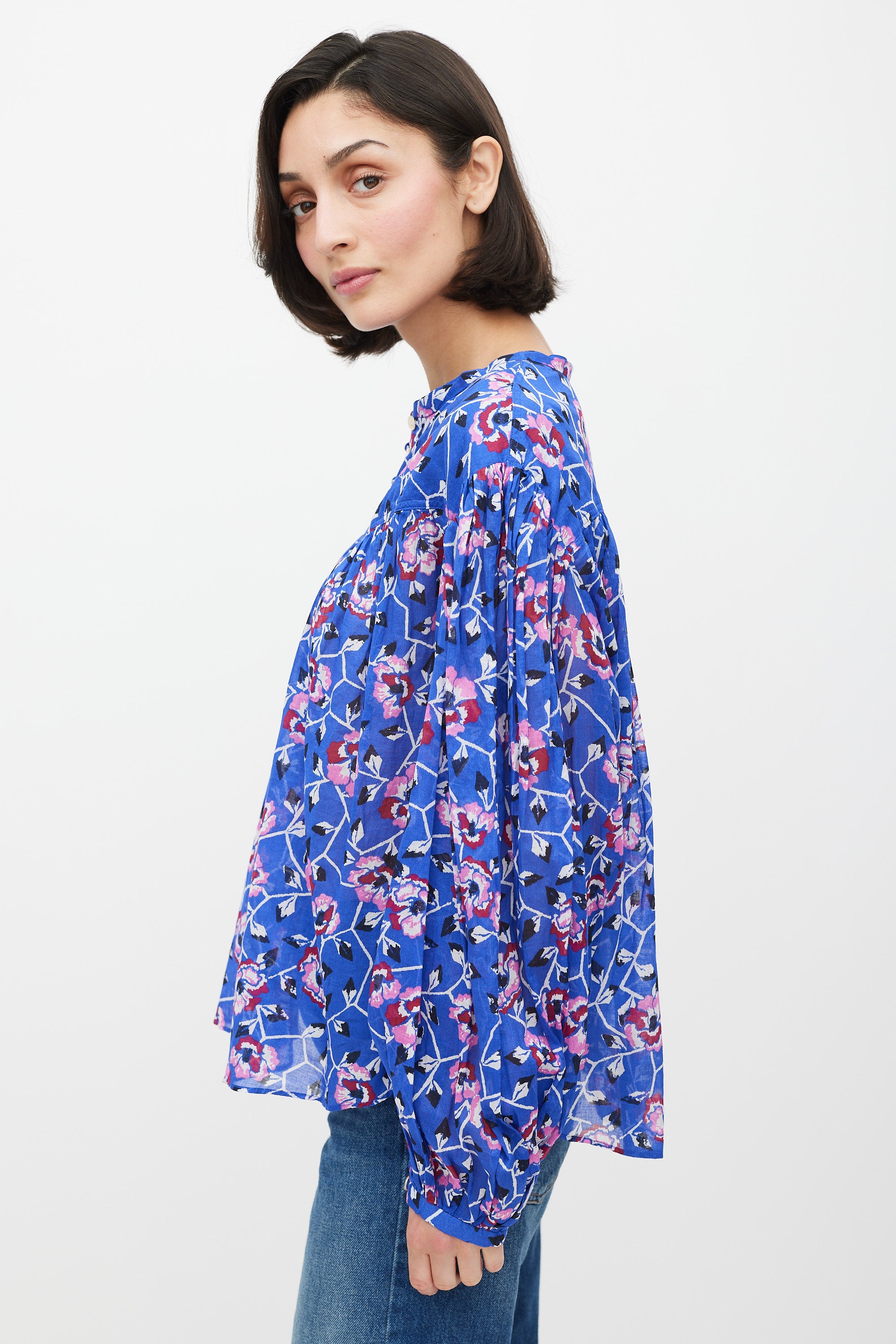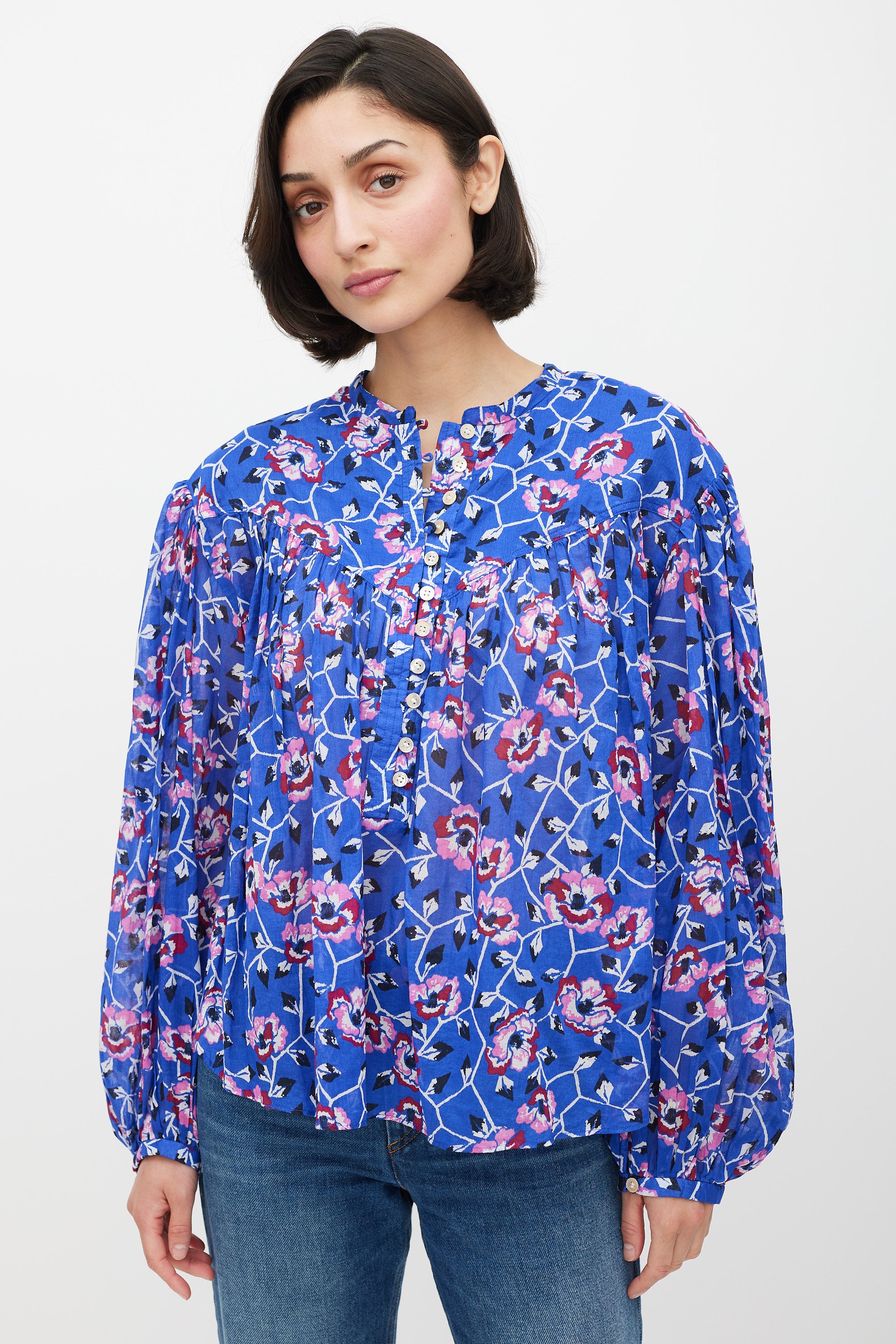 Pre-owned Isabel Marant Étoile blue top featuring a multicolour floral pattern throughout, round neckline, long gathered sleeves, ruffled detailing, and quarter button closure.