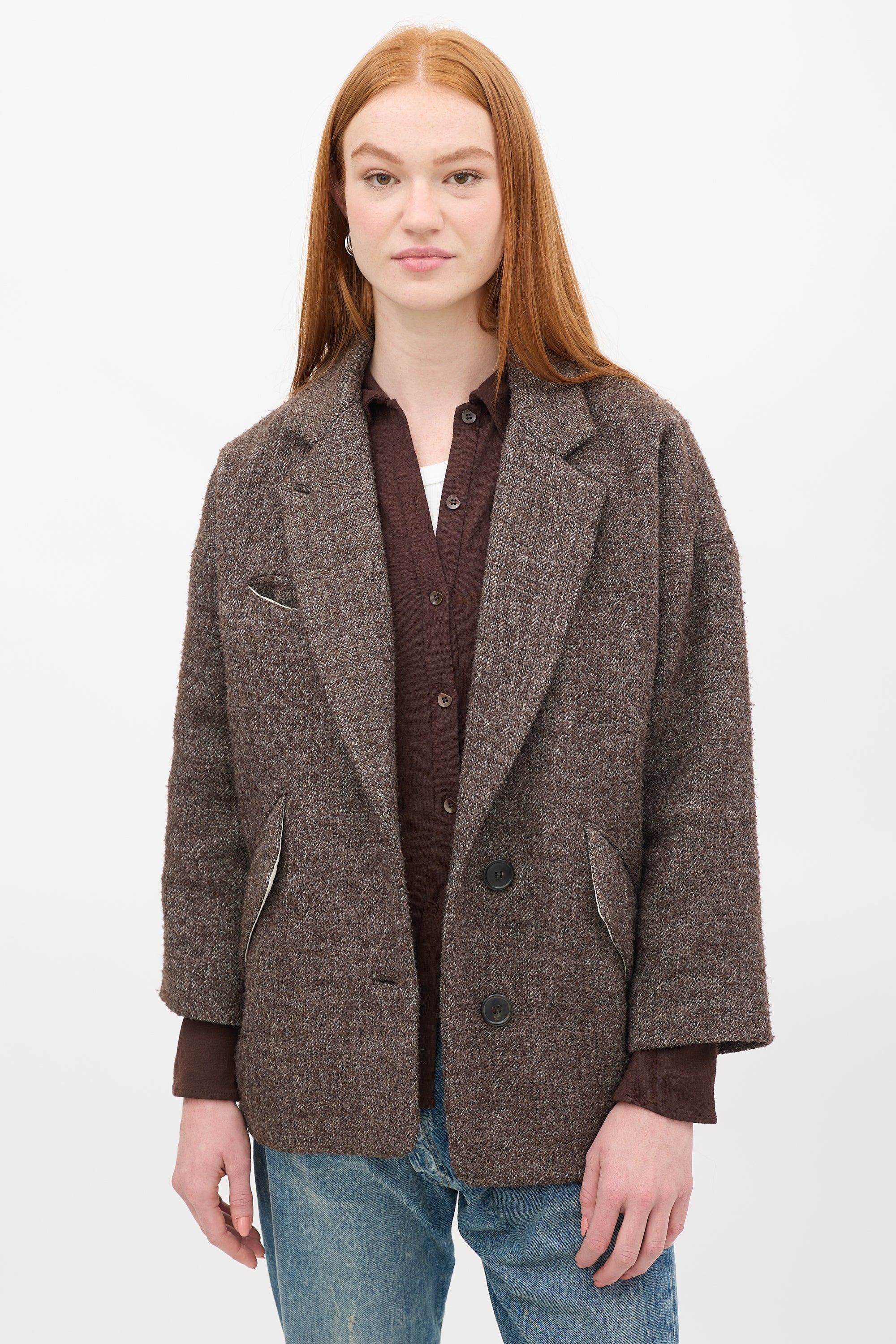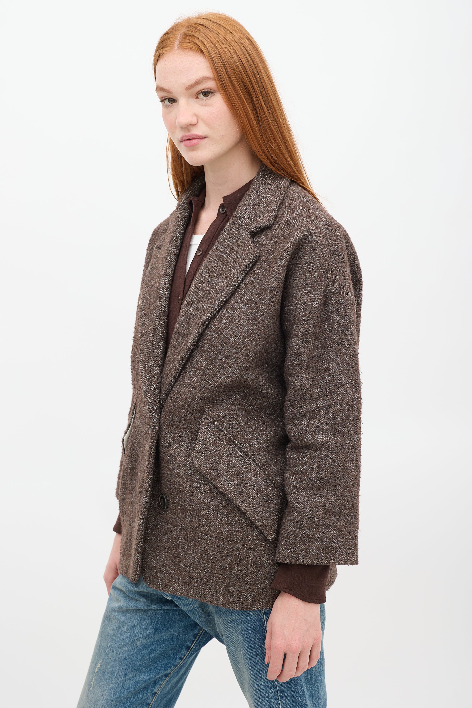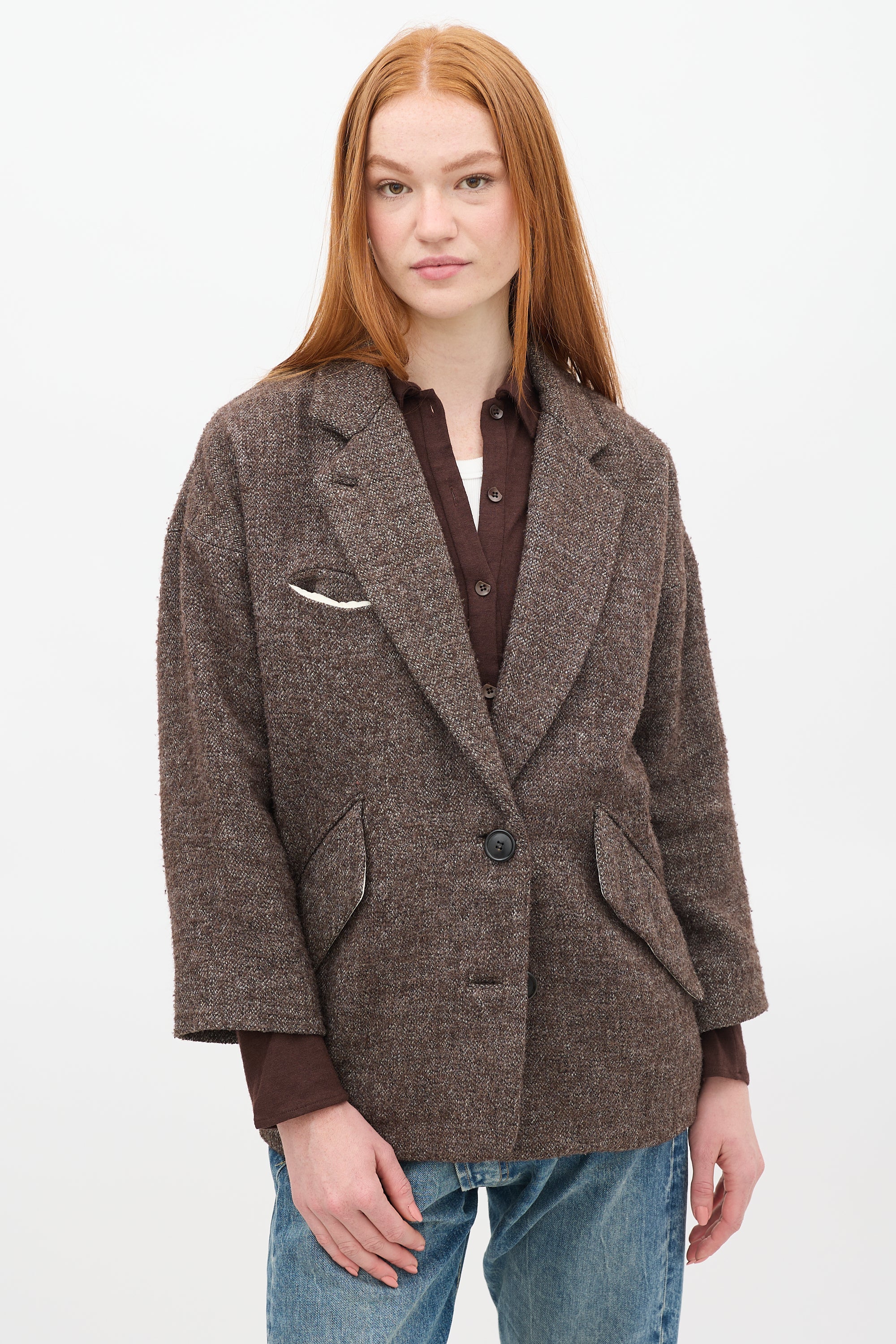 Pre-owned Isabel Marant Étoile brown and cream wool blazer featuring notched lapel, button up front, one chest welt pocket, and two flap pockets at hips. Lined.