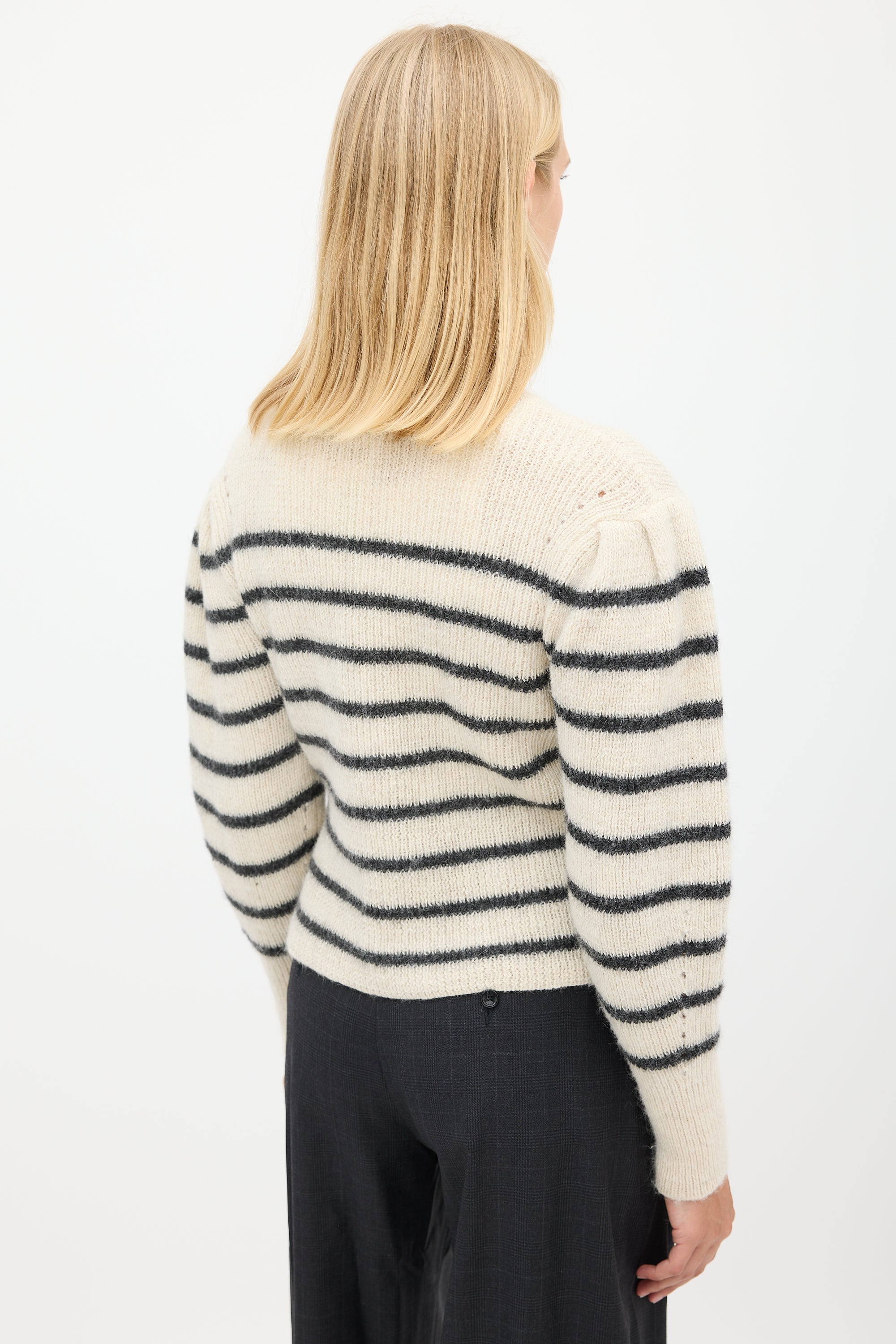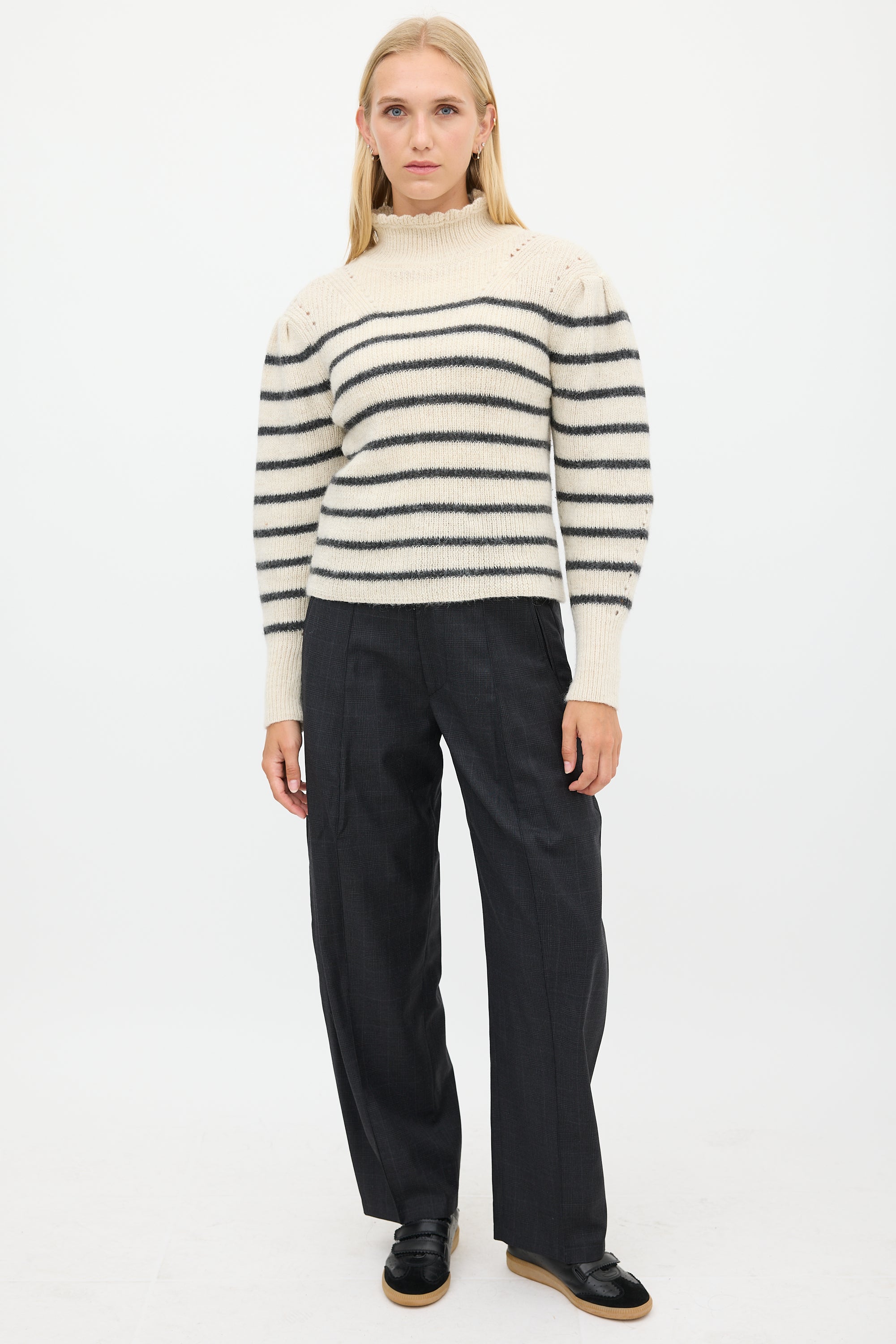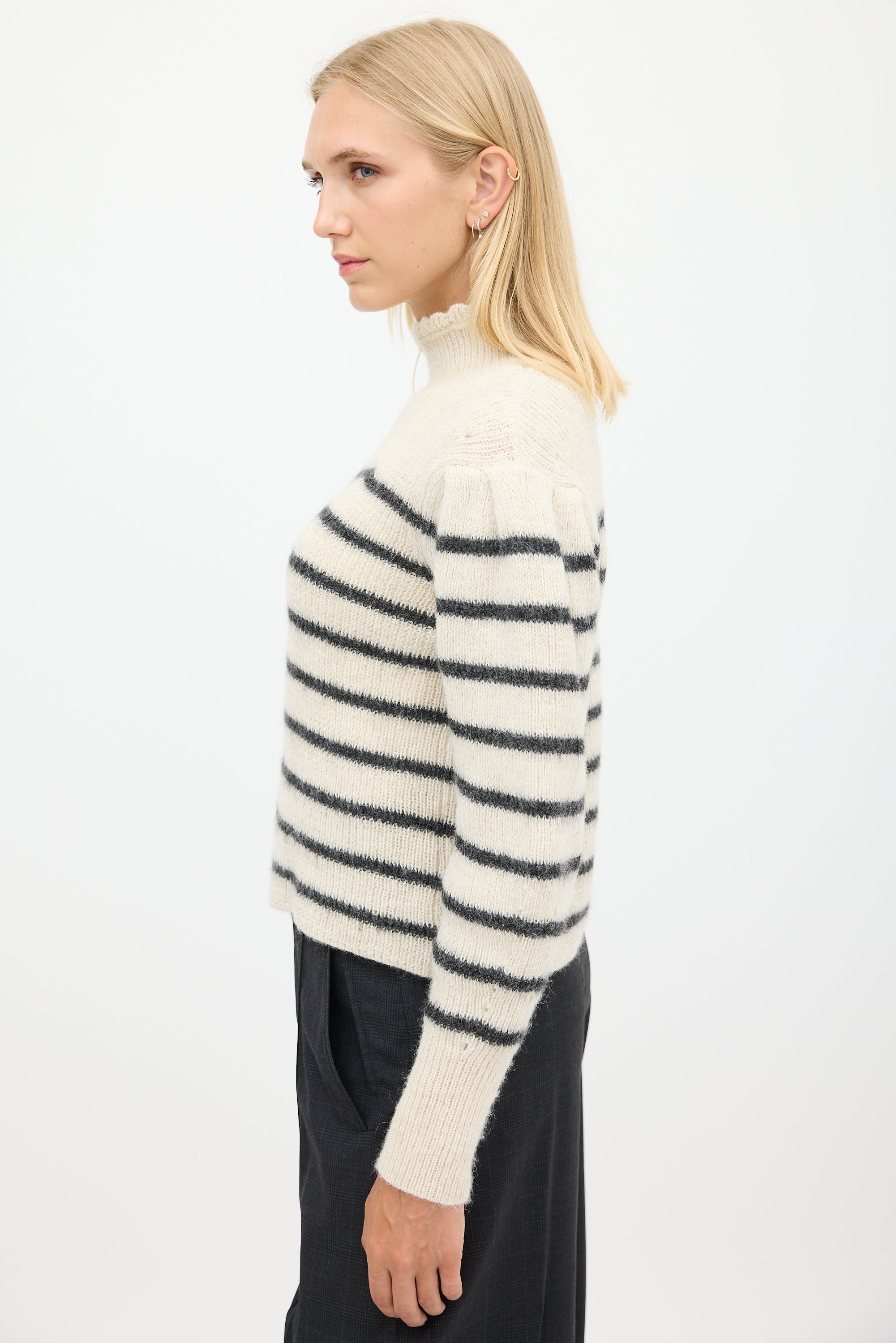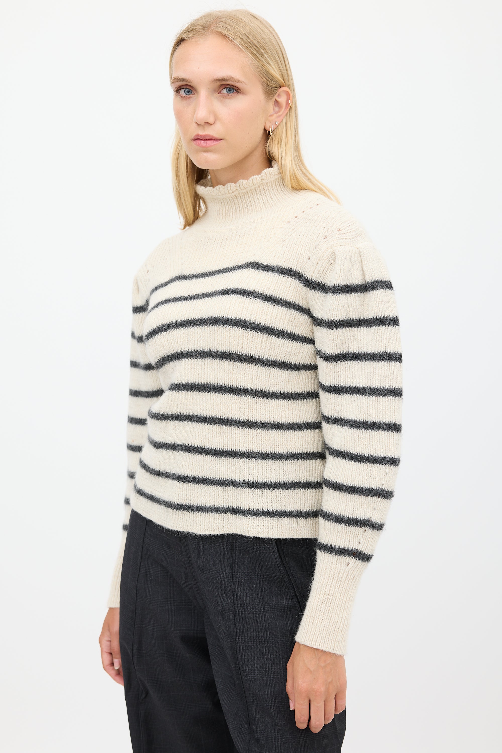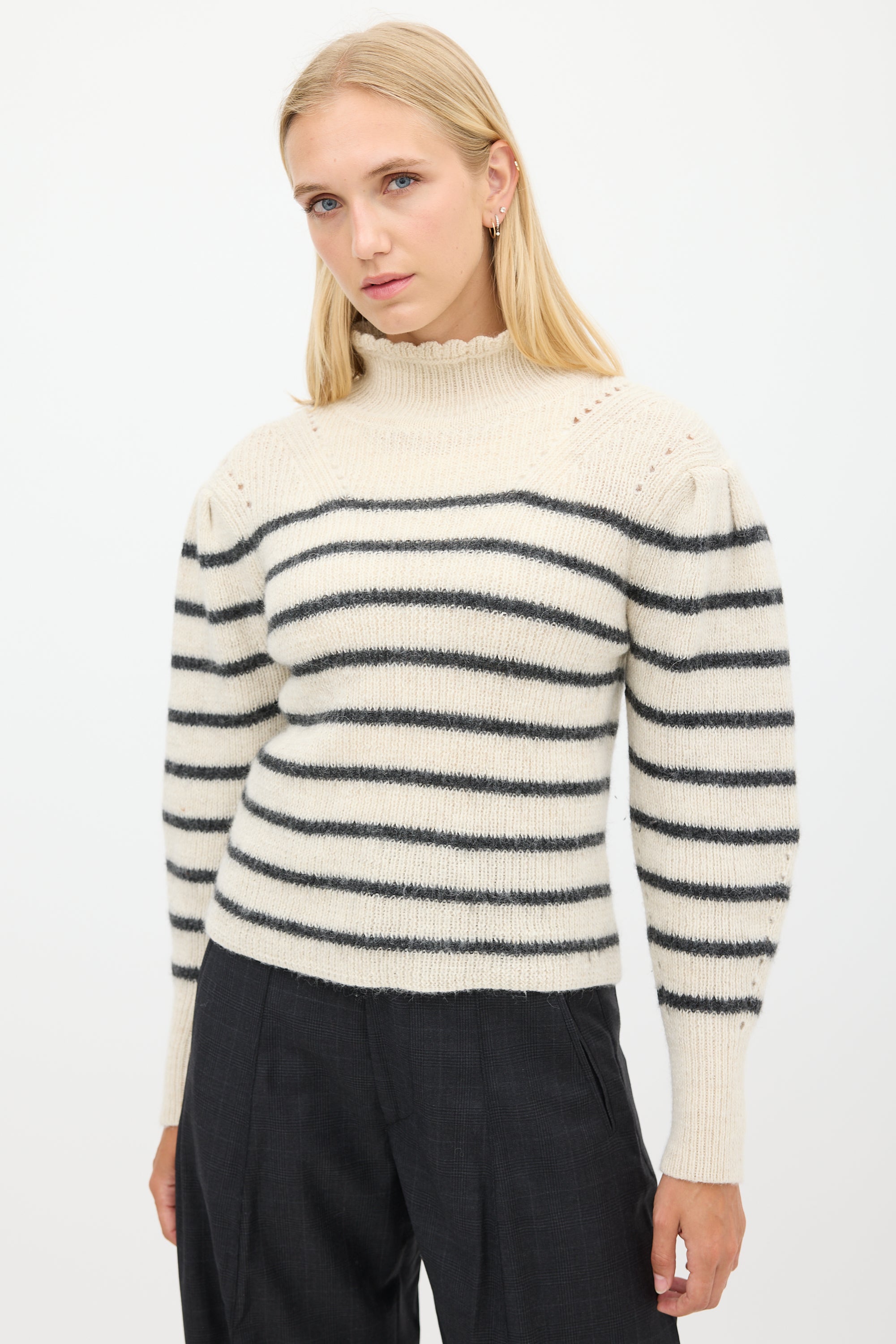 Pre-owned Isabel Marant Étoile cream wool sweater featuring a black striped pattern throughout, mock neck collar, long sleeves with gathered shoulders, and ribbed hem.