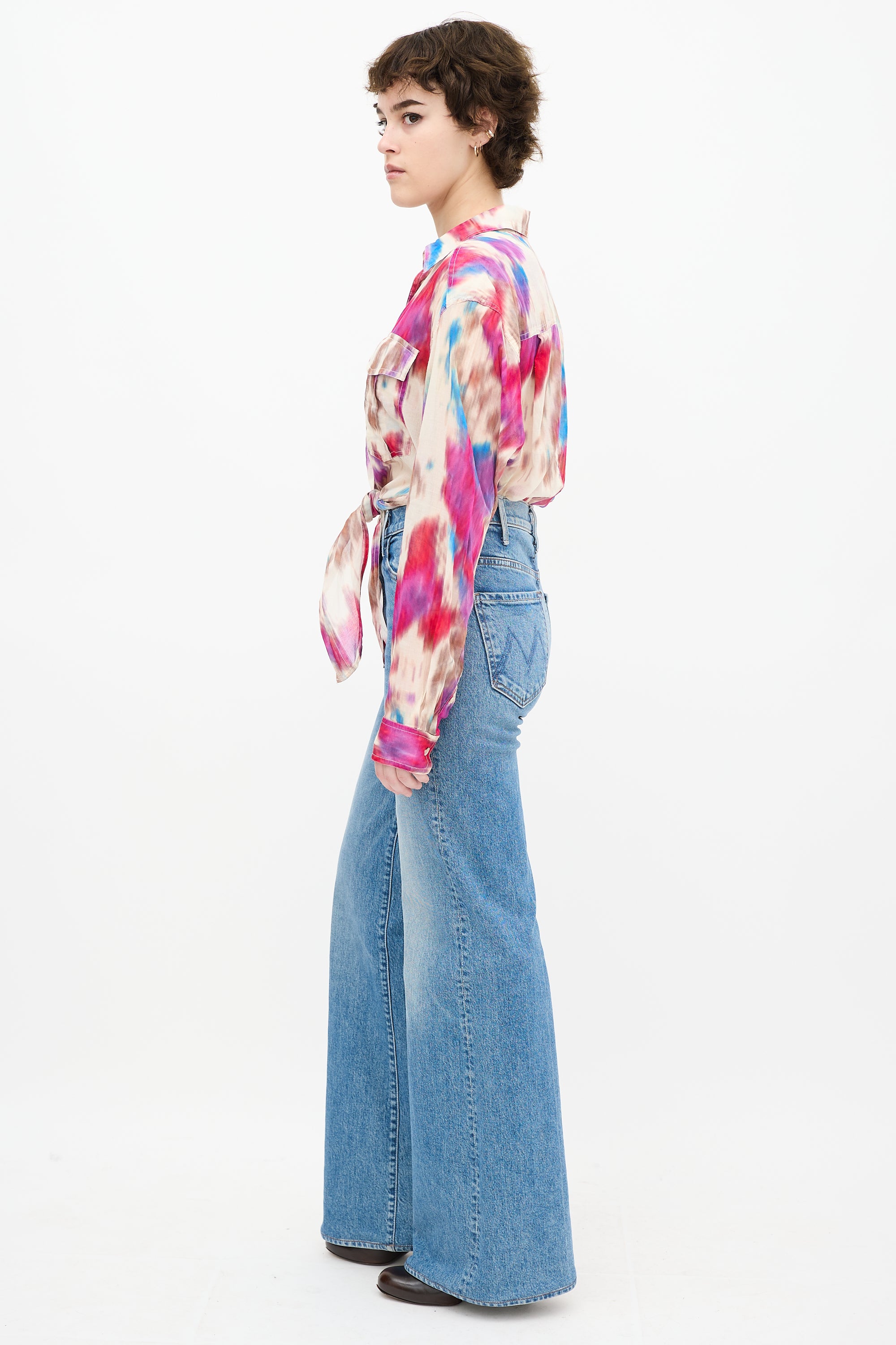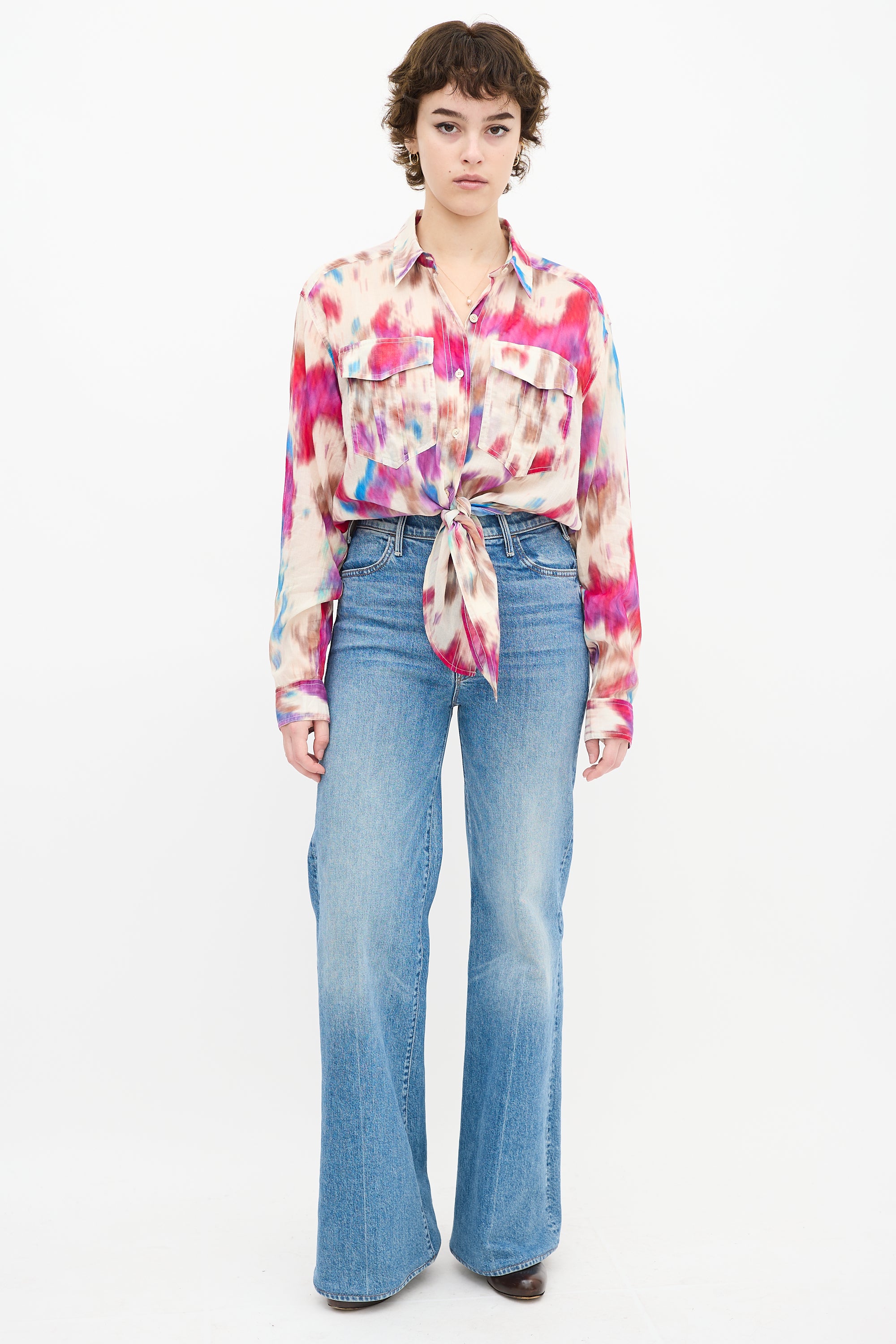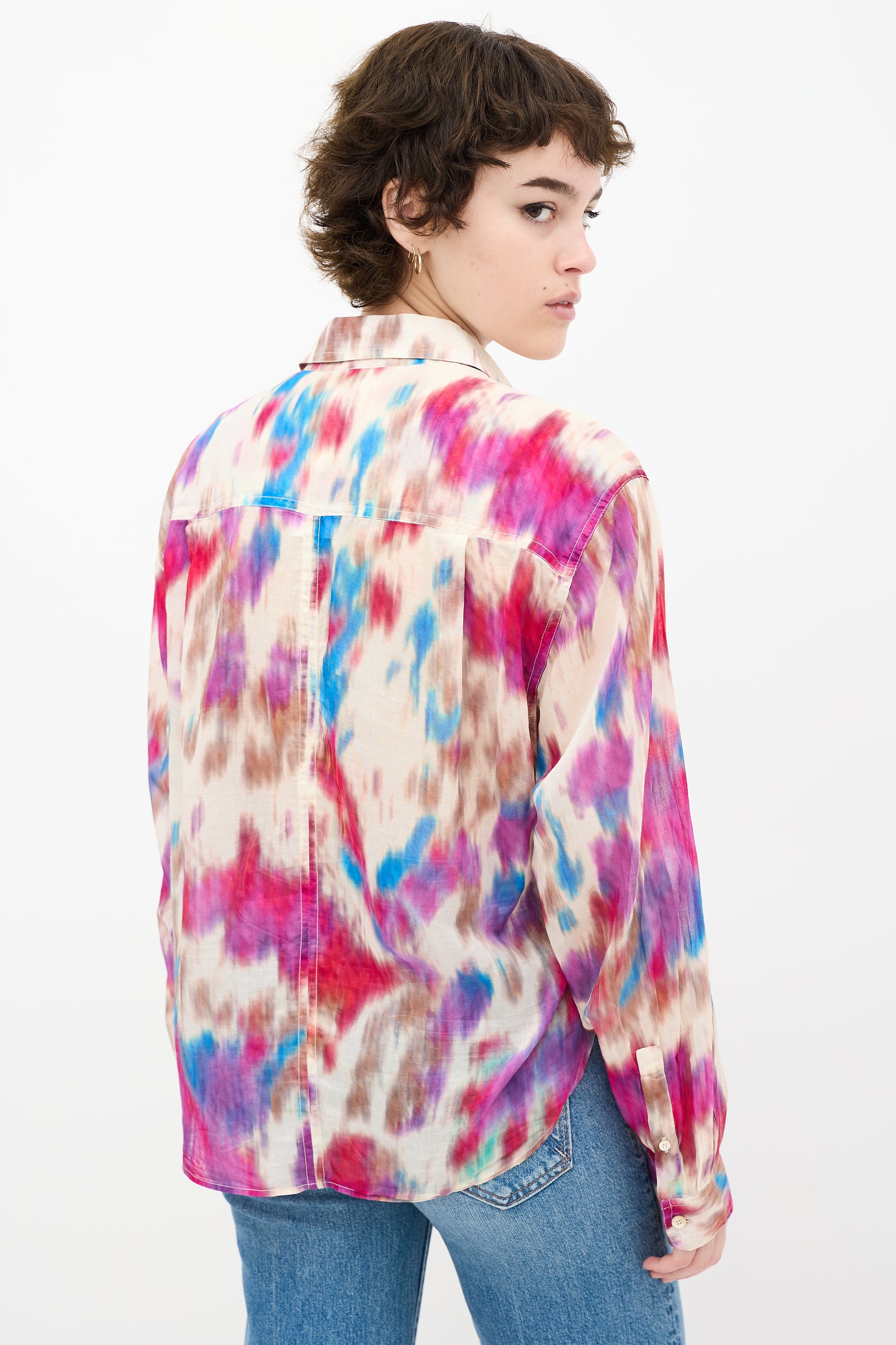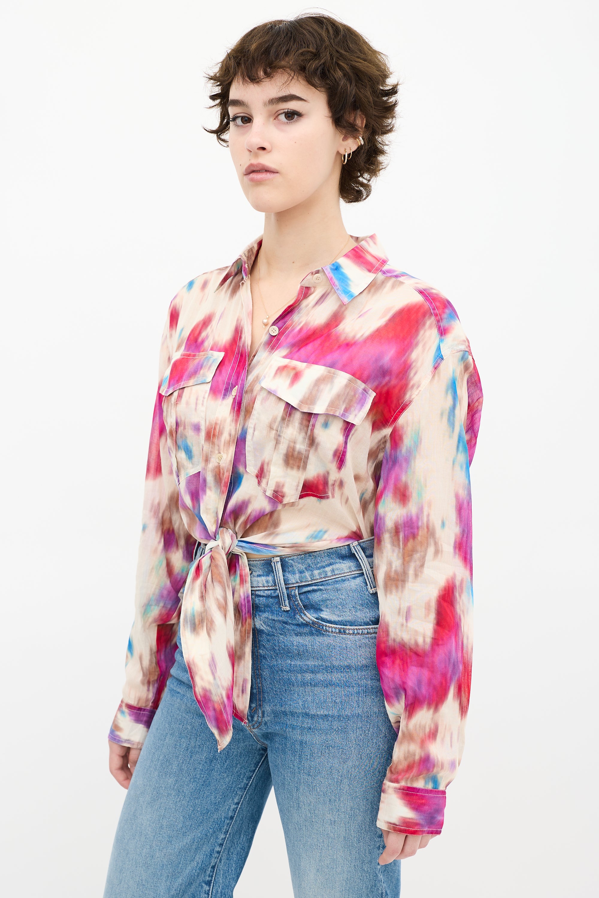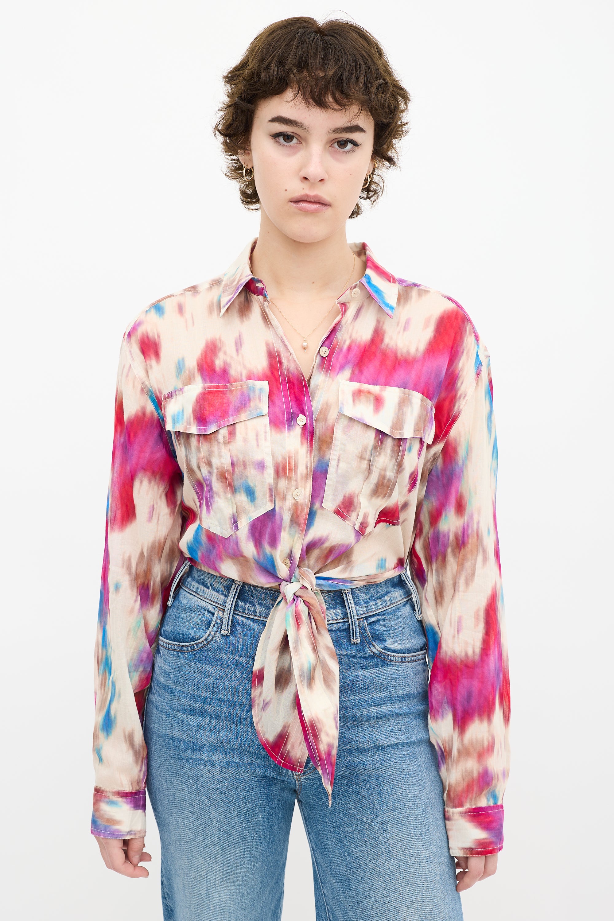 Pre-owned Isabel Marant Étoile cream shirt featuring a multicolour tie dye pattern throughout, pointed collar, long sleeves with buttoned cuffs, two cargo pockets at chest, and button up closure.