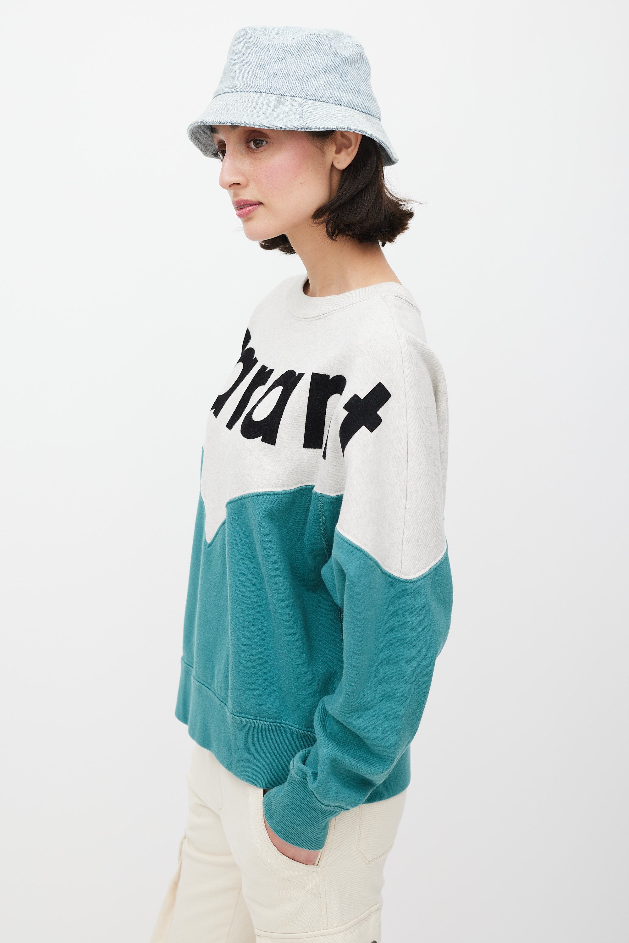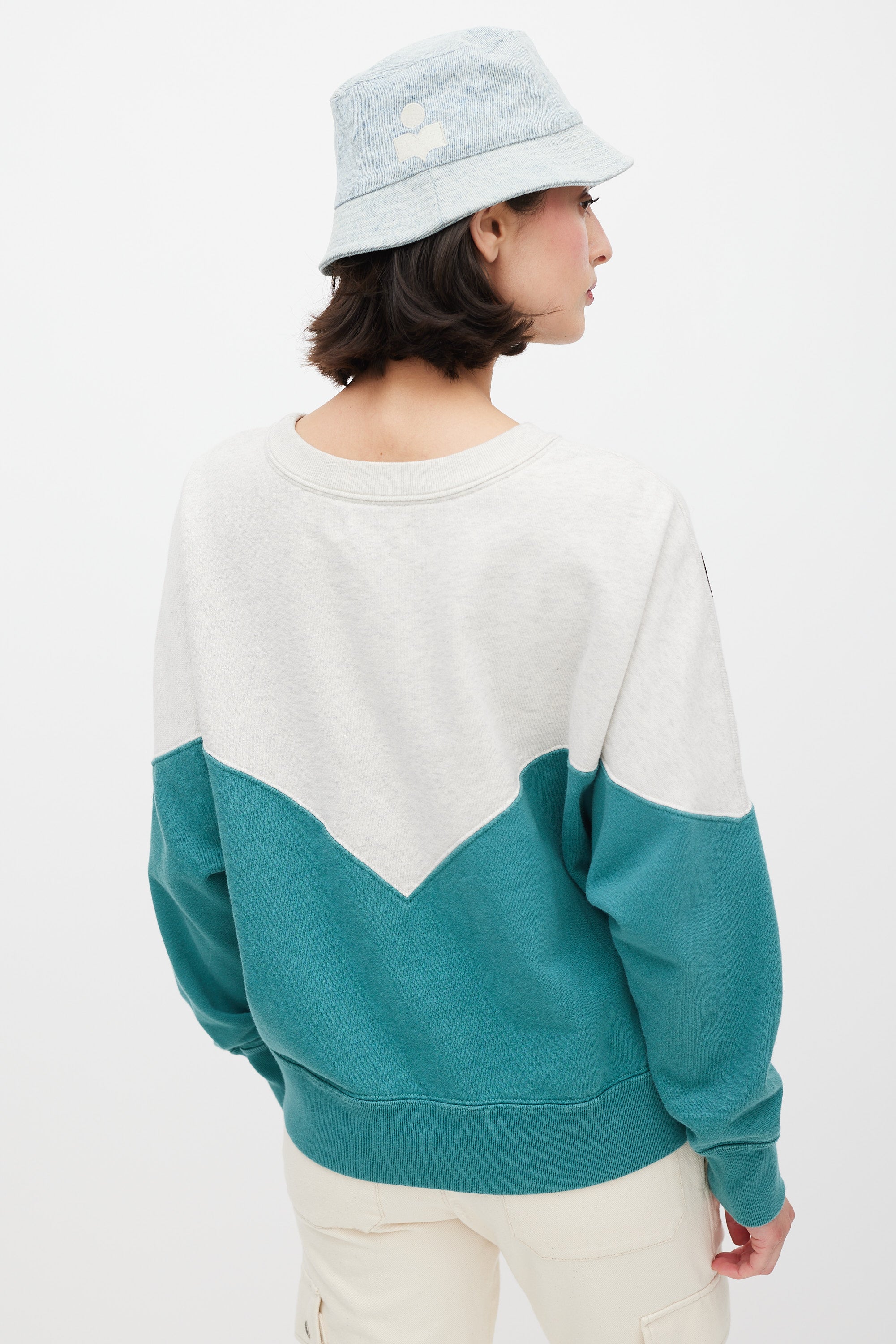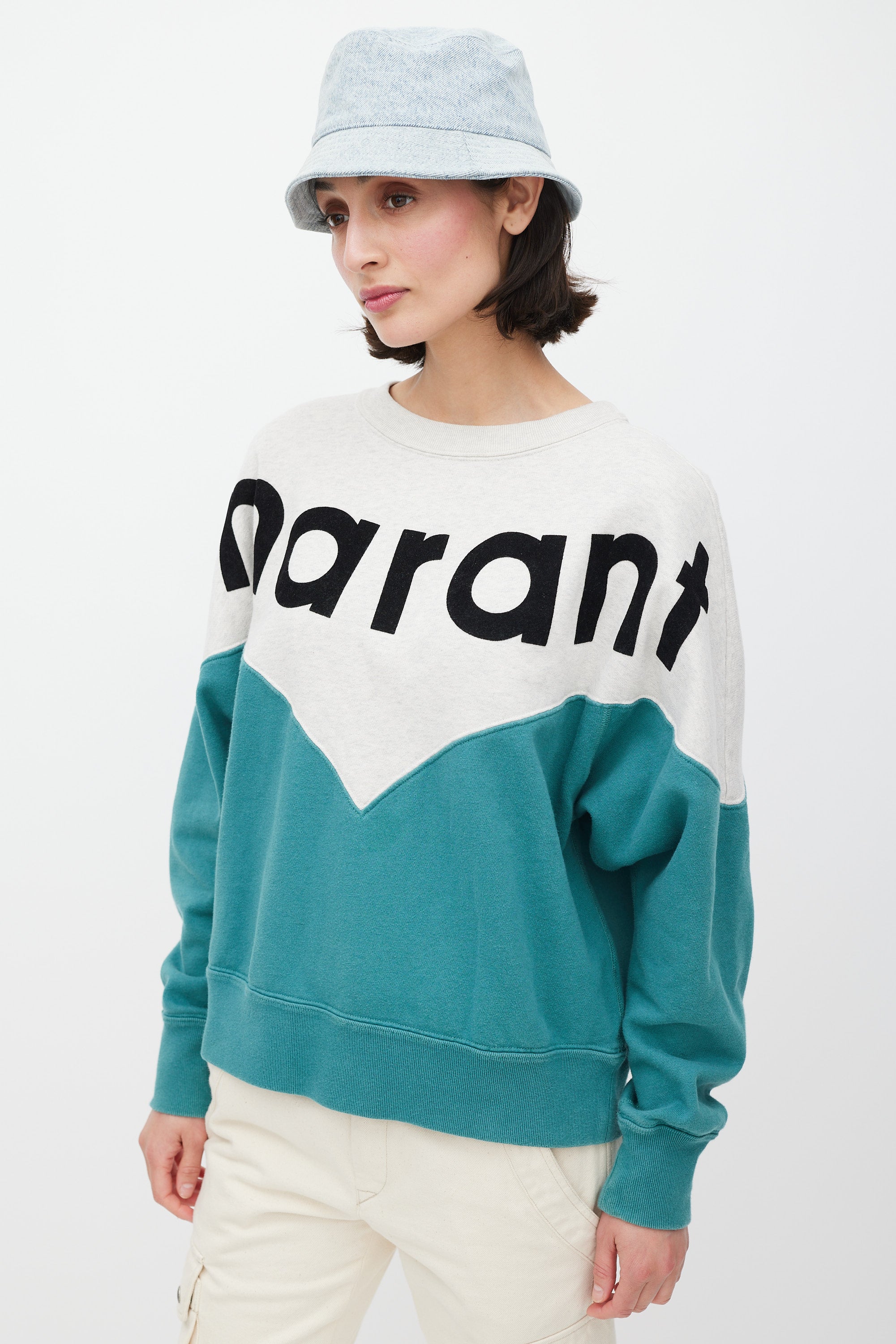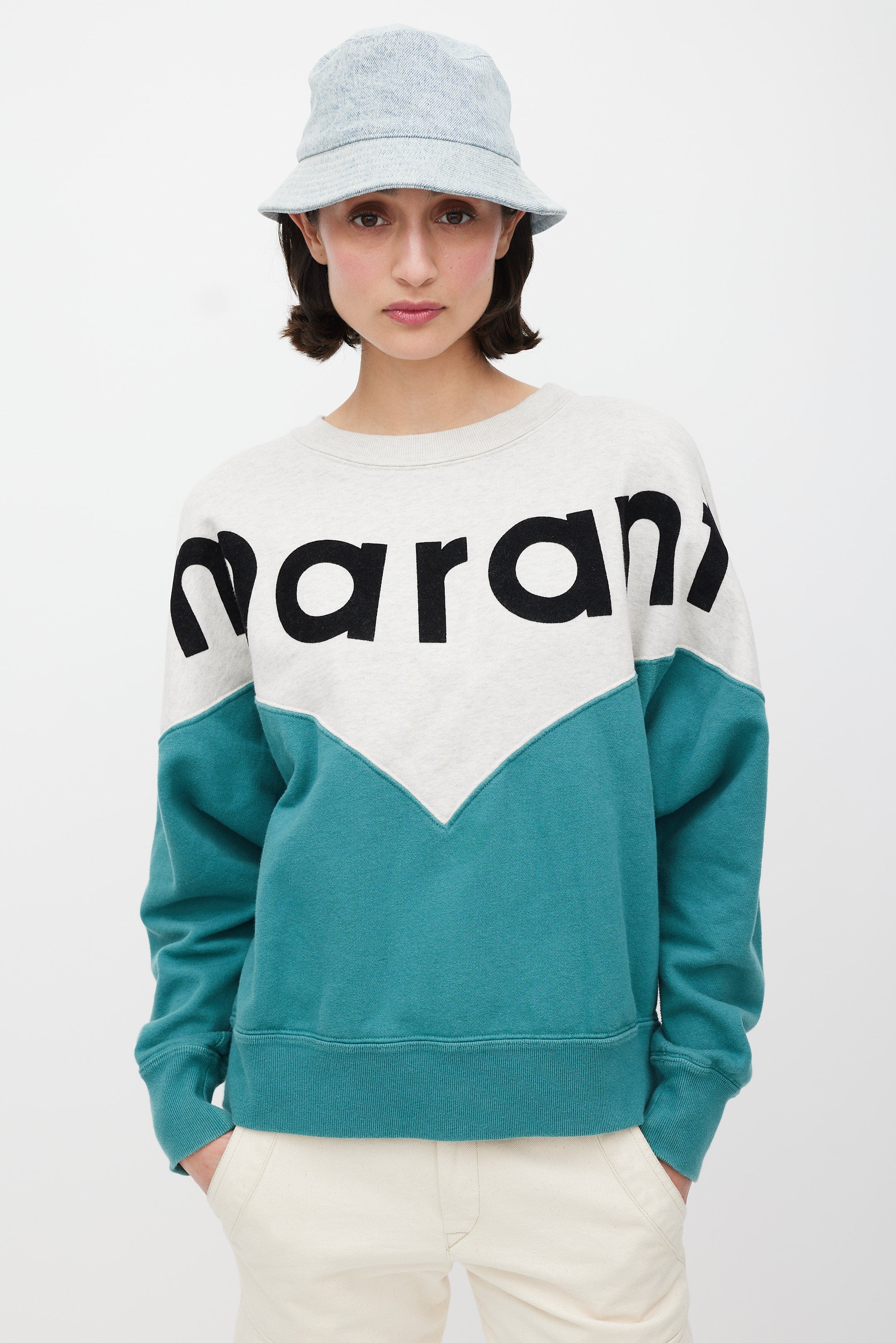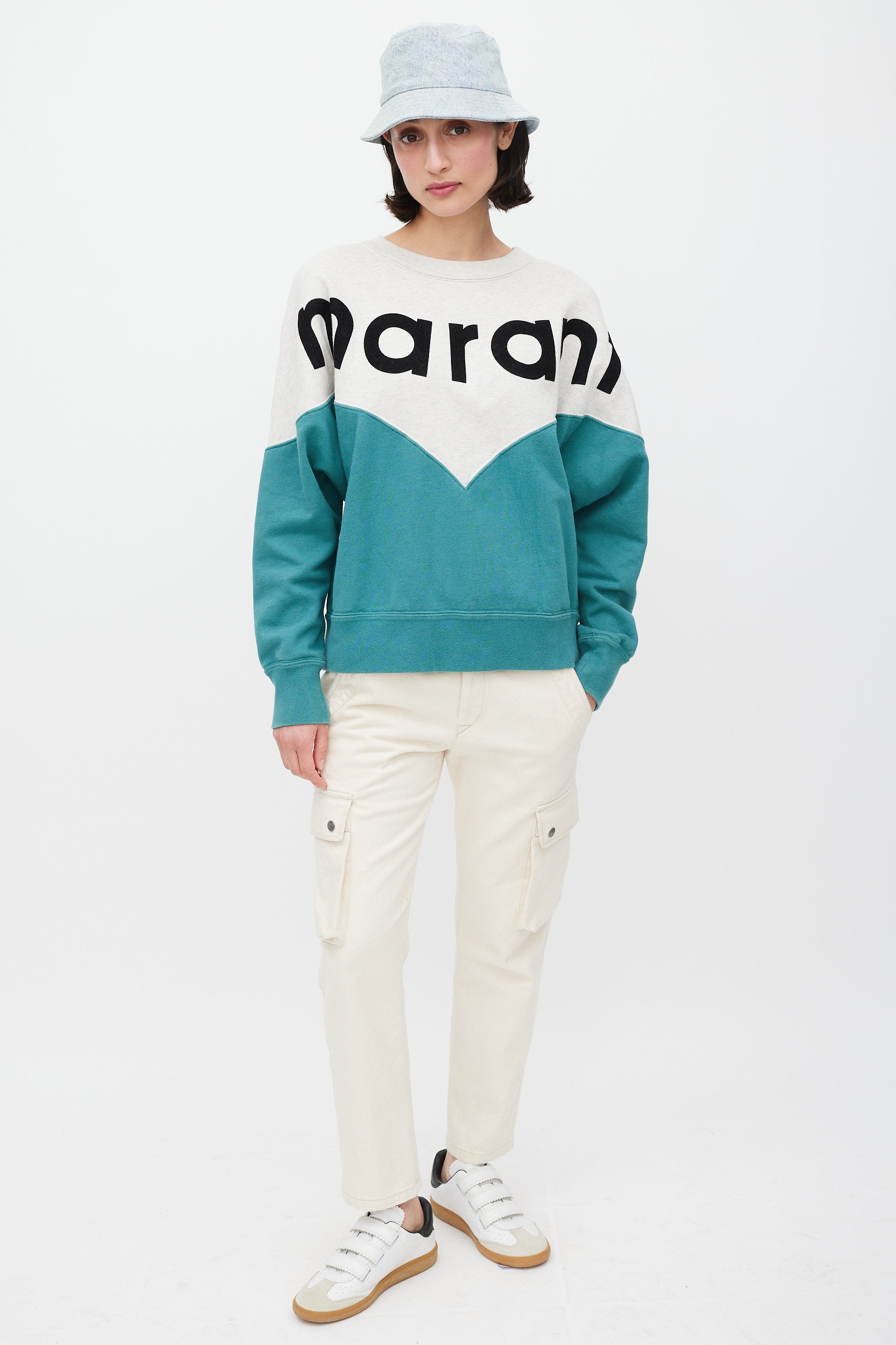 Pre-owned Isabel Marant Étoile green sweatshirt featuring a grey contrast panel at chest, black flocked logo at front, round neckline, long sleeves, and ribbed hem.