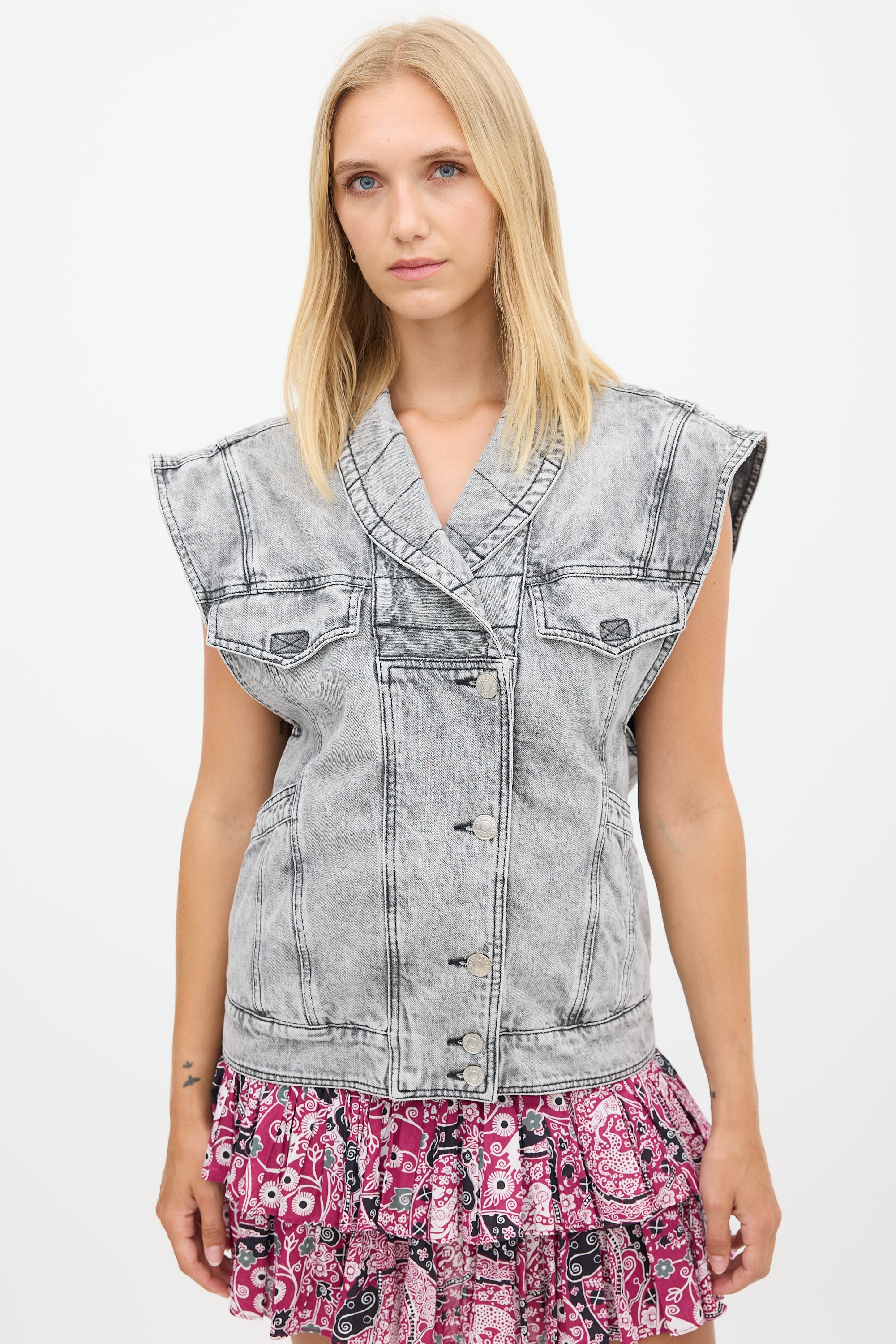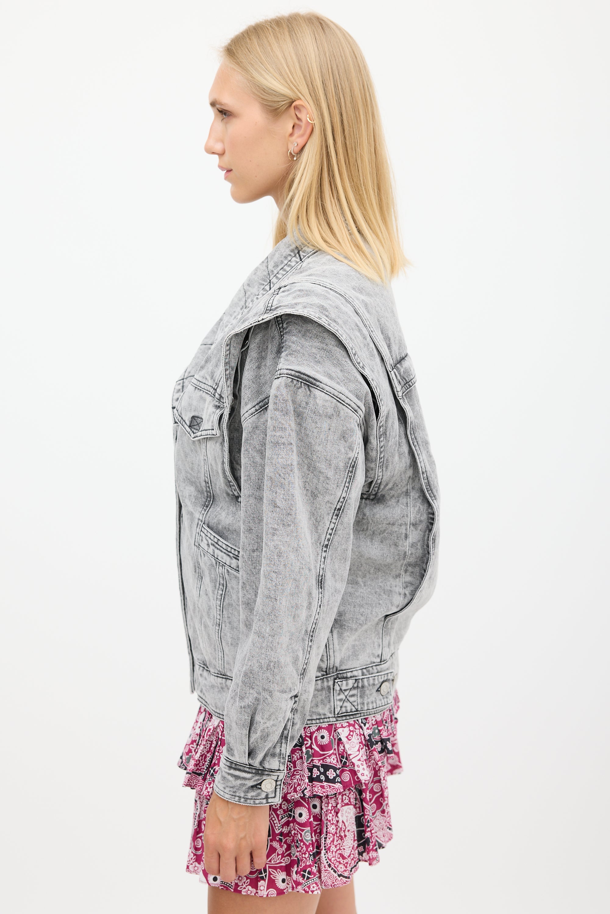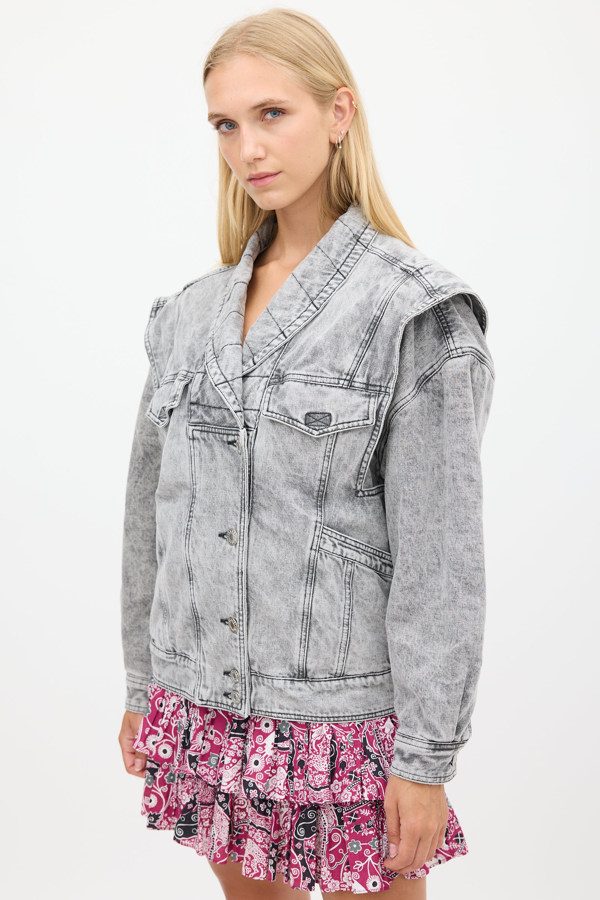 Isabel Marant Étoile grey washed denim jacket featuring a shawl collar, long removable sleeves, structured shoulders, two flap pockets at hip, two slip pockets at hip, and button up closure. Lined.