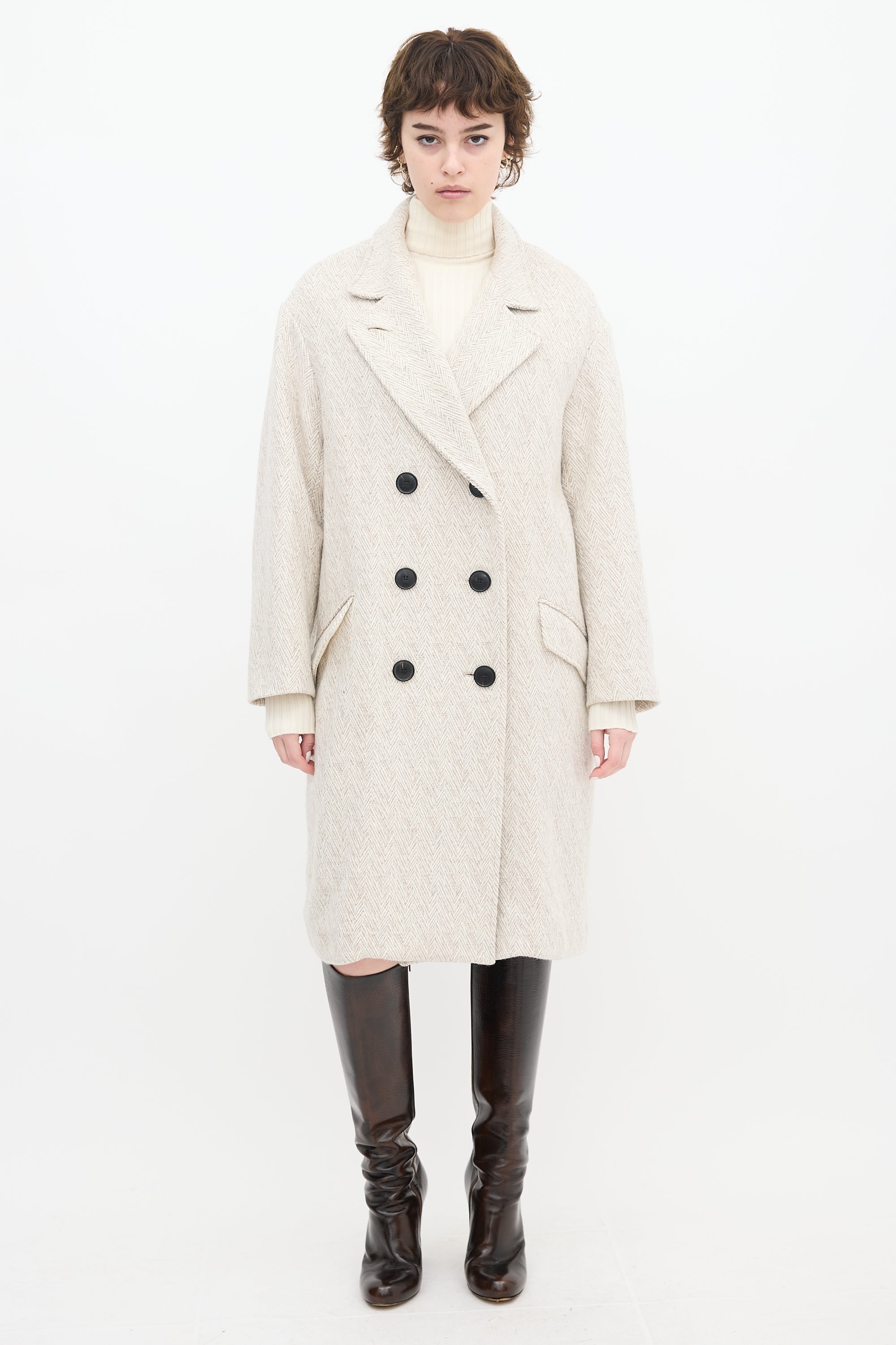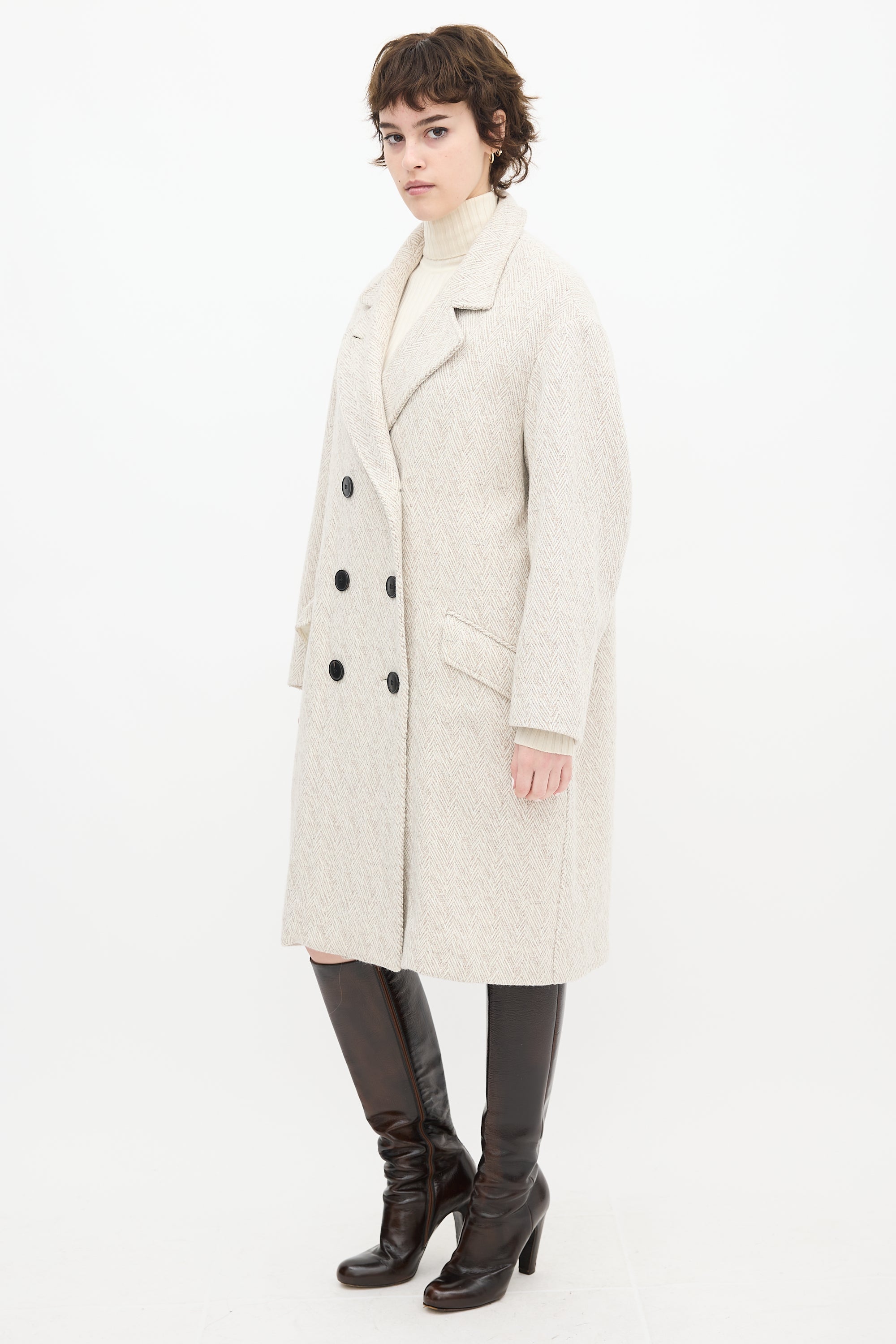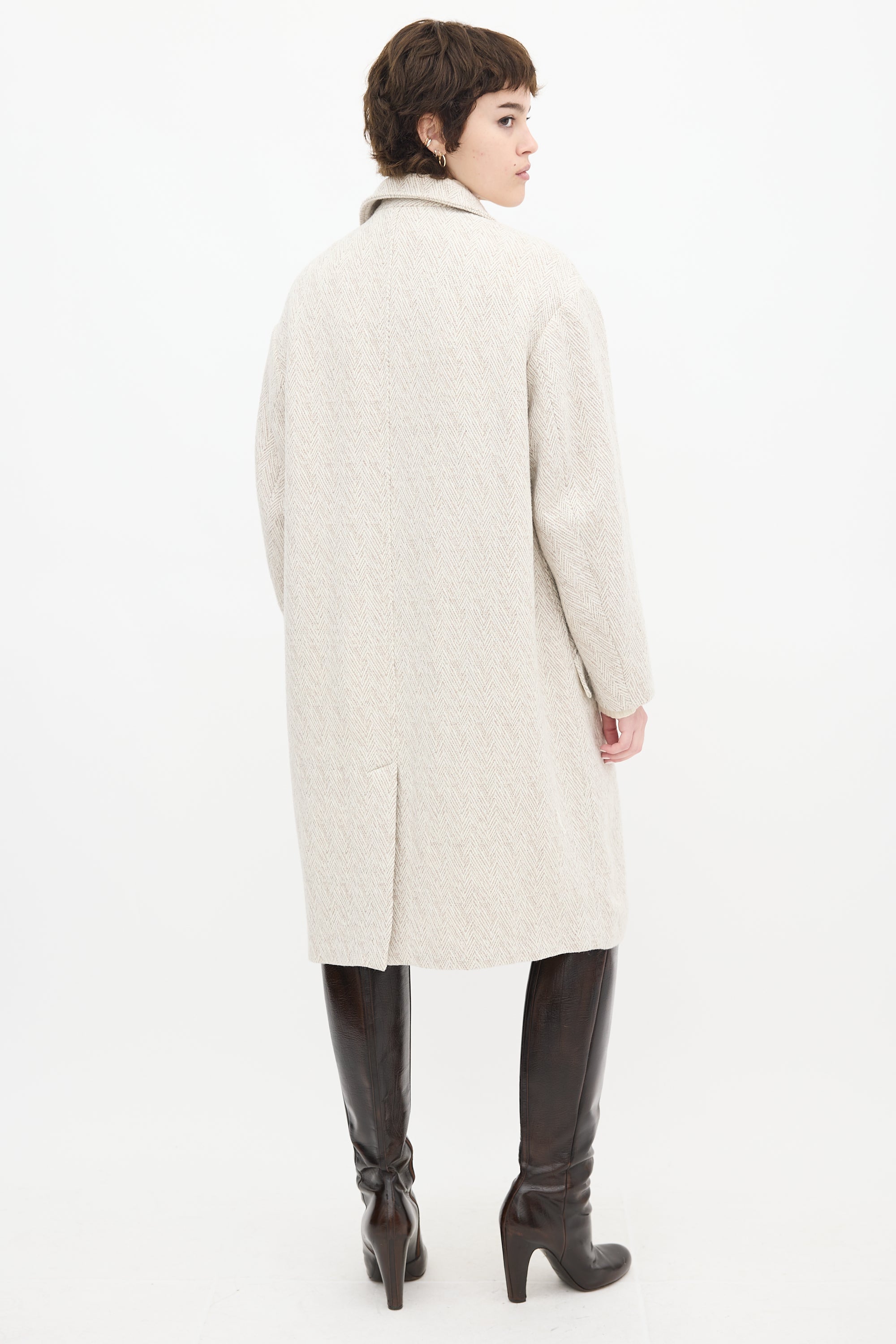 Pre-owned Isabel Marant Étoile grey and white wool blend long coat featuring a notched collar, double breasted button up front, two flap welt pockets at front hip, back vent, dropped shoulders, long sleeves, and herringbone pattern throughout. Partially lined.