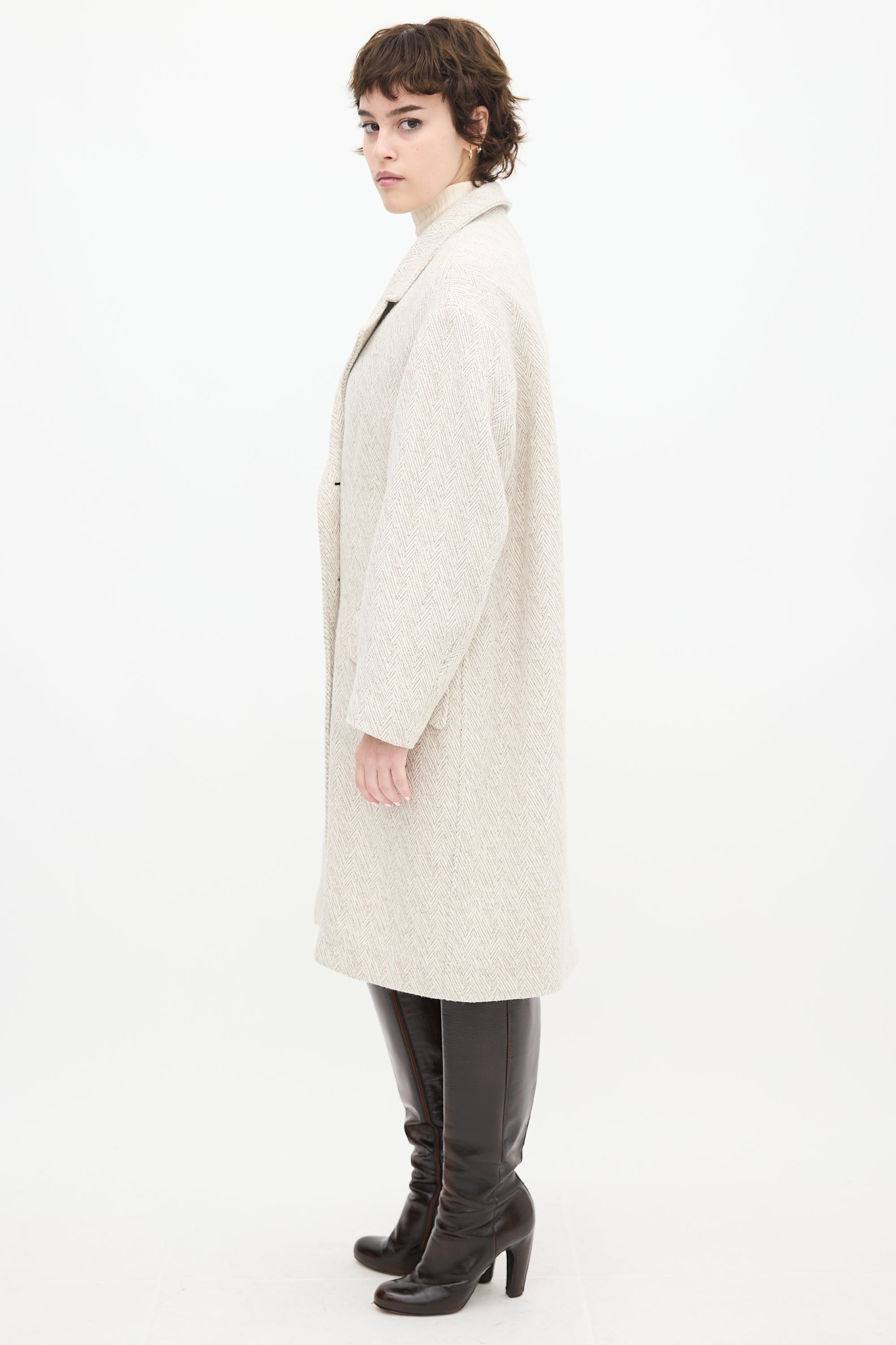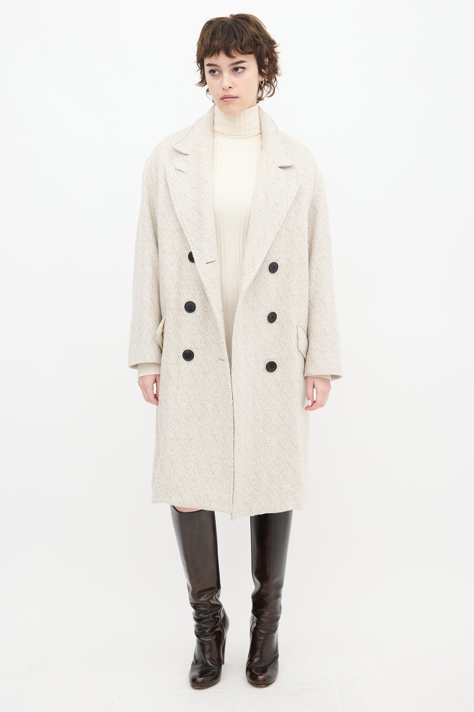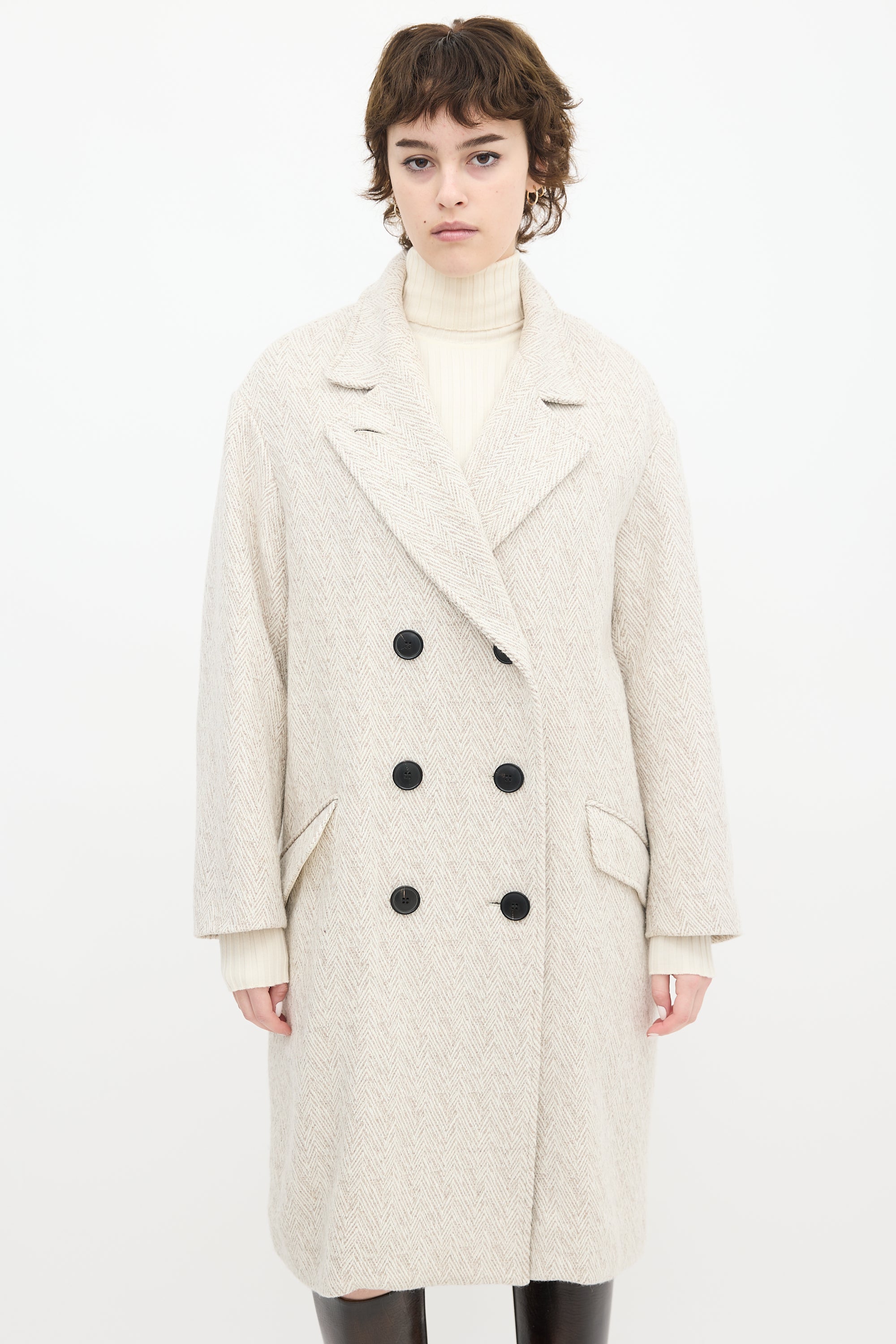 Pre-owned Isabel Marant Étoile grey and white wool blend long coat featuring a notched collar, double breasted button up front, two flap welt pockets at front hip, back vent, dropped shoulders, long sleeves, and herringbone pattern throughout. Partially lined.