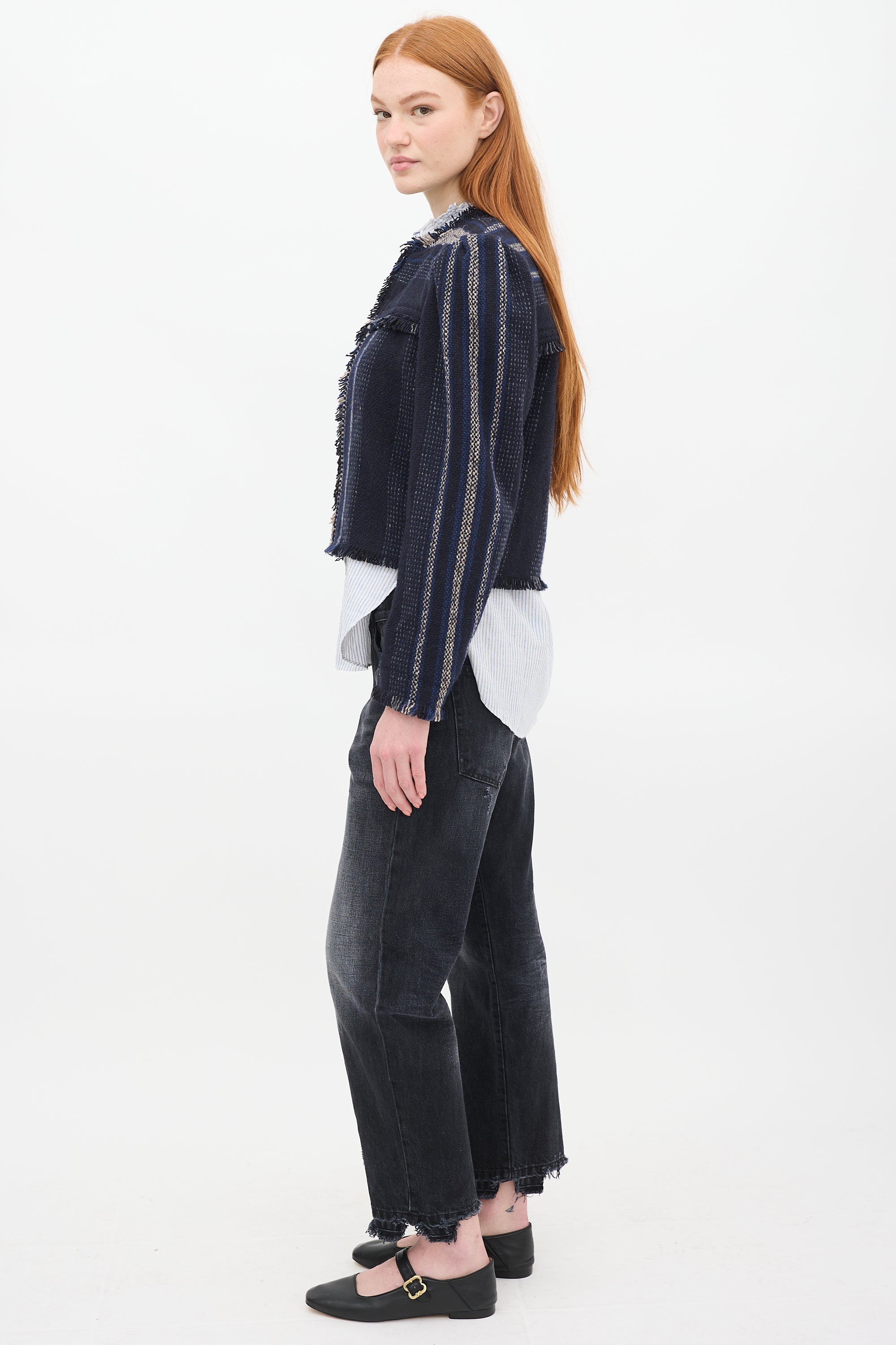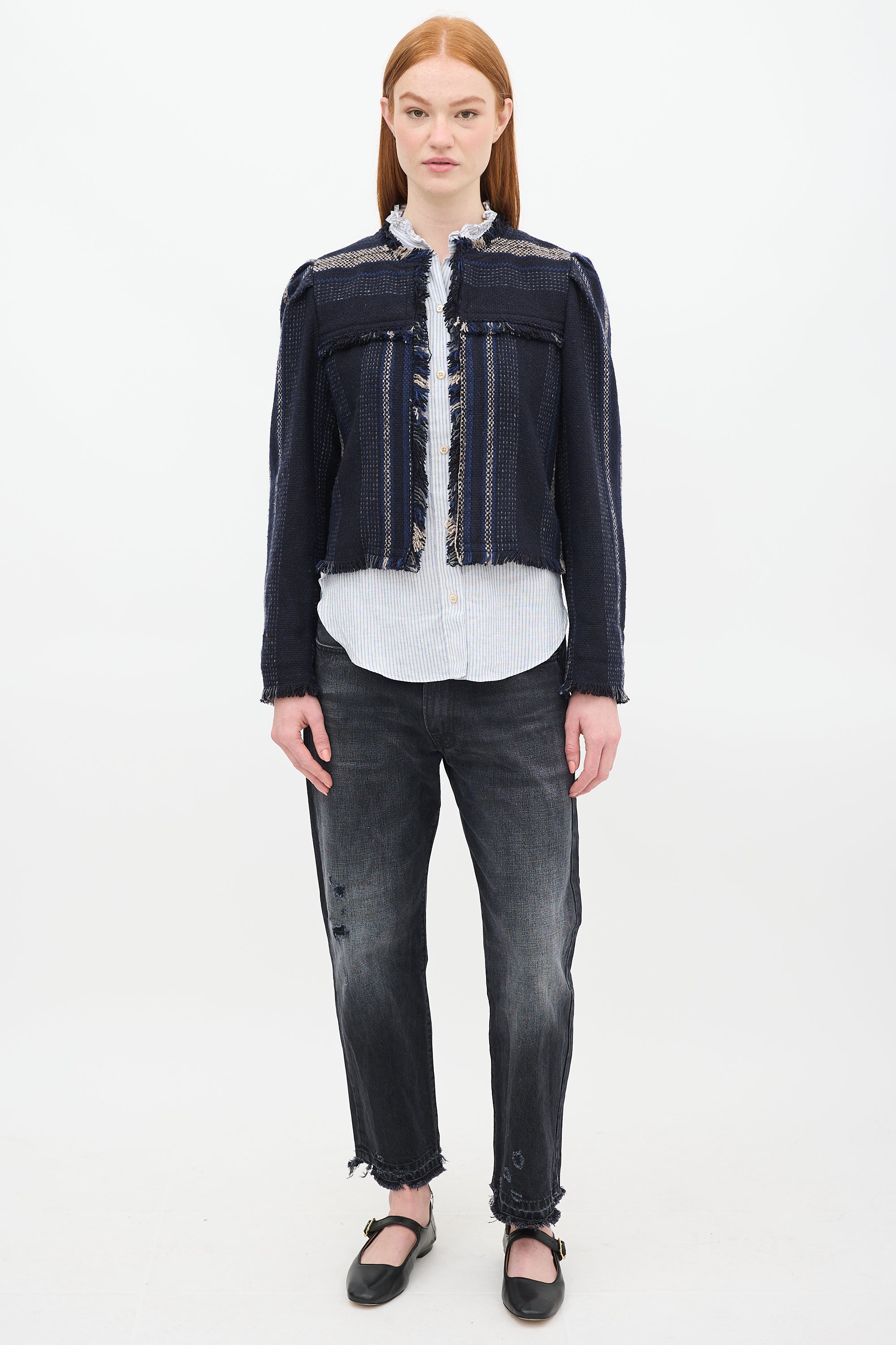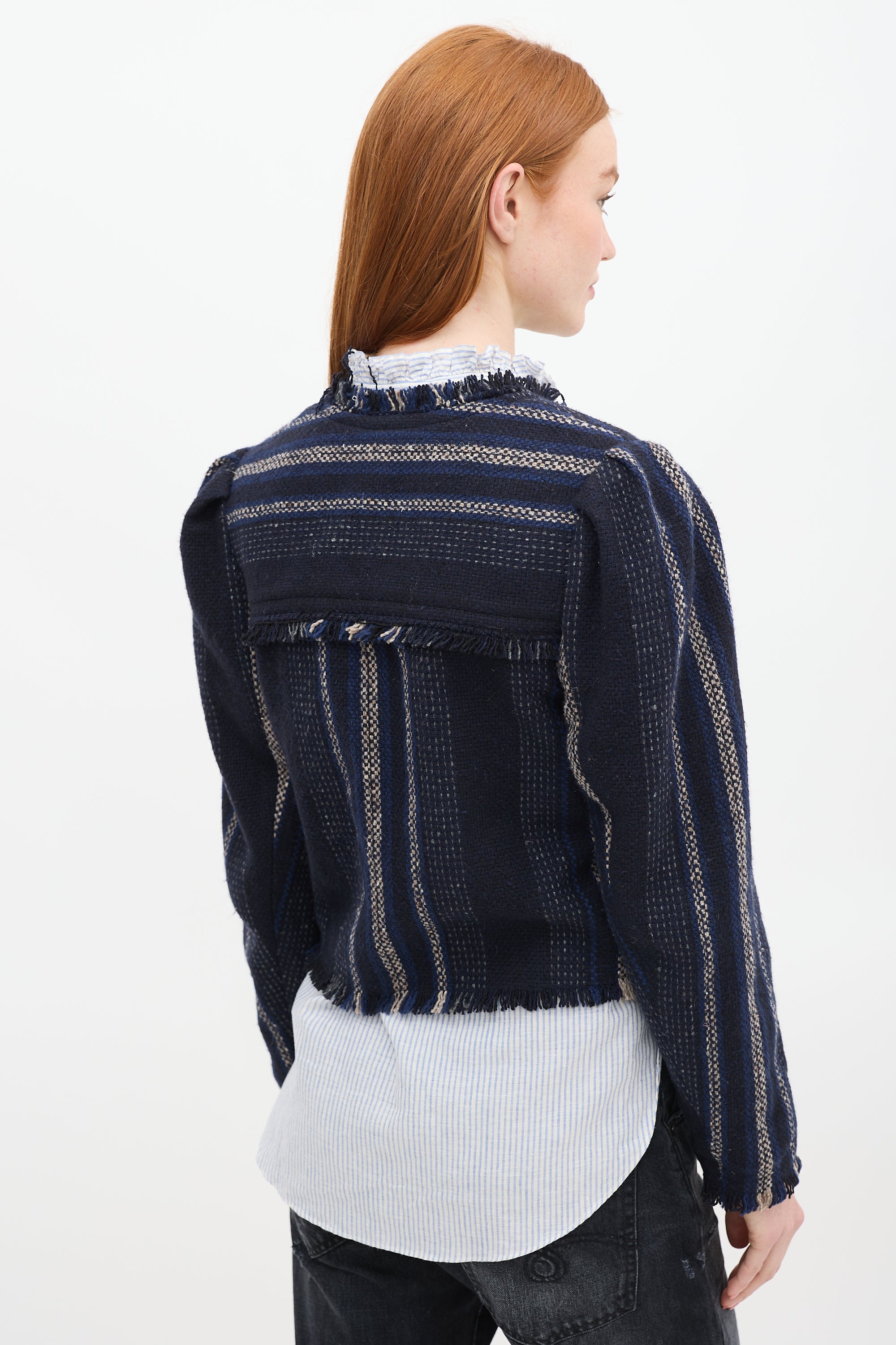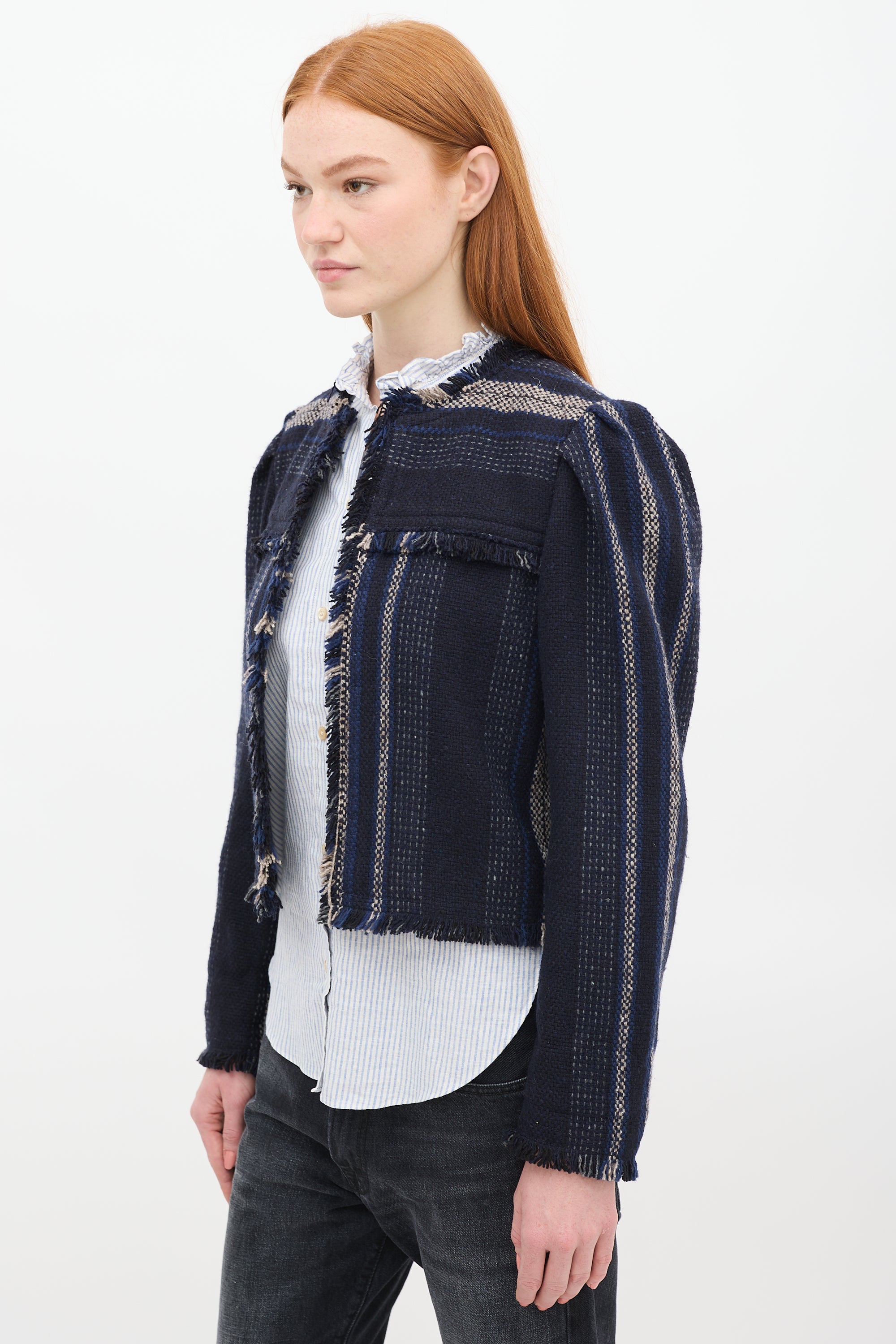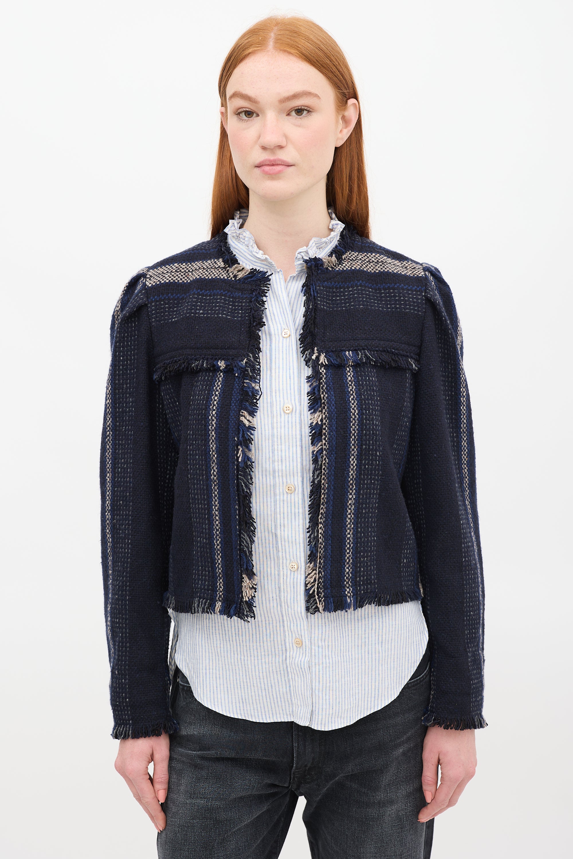 Pre-owned Isabel Marant Étoile navy and beige Jizaya cropped jacket featuring striped tweed throughout, round neckline, hook and eye closure at front, and frayed trim. Unlined.