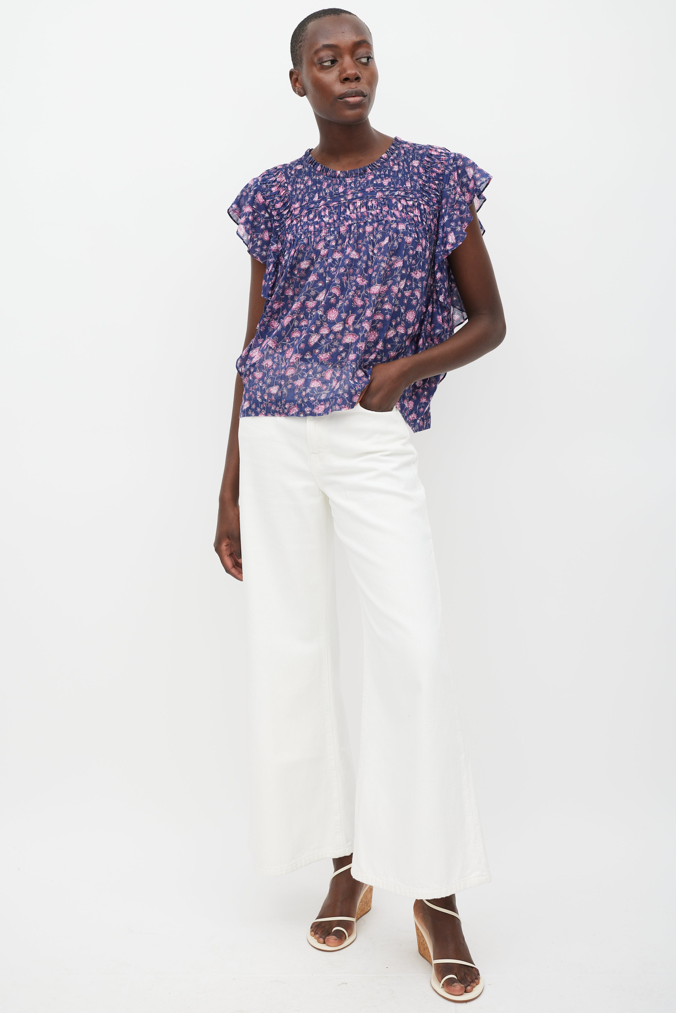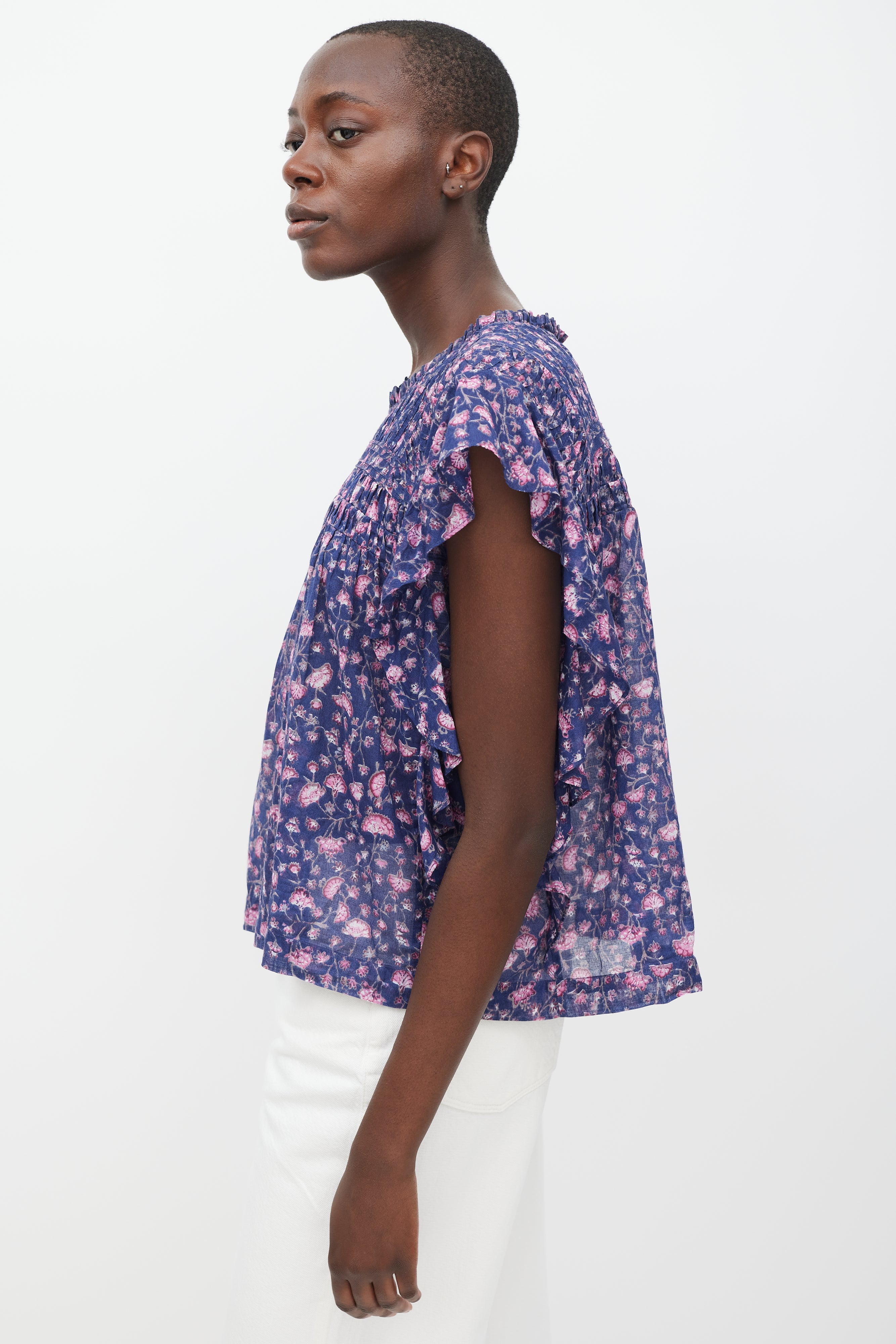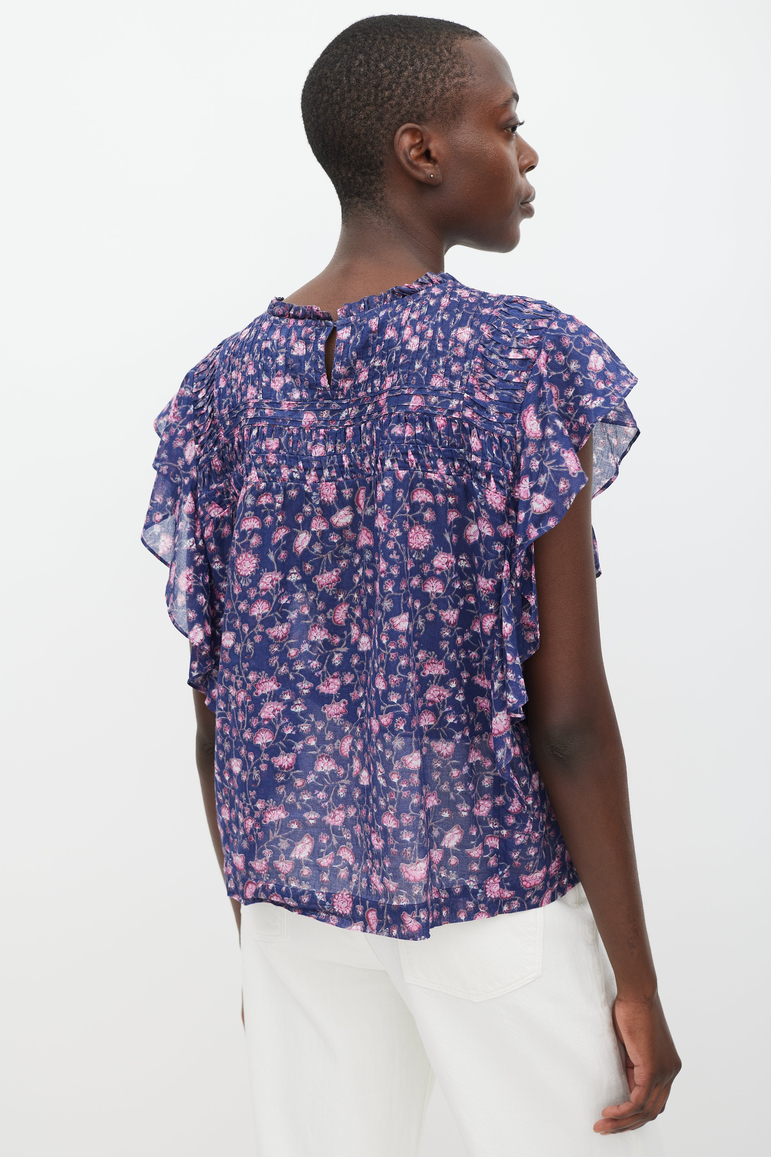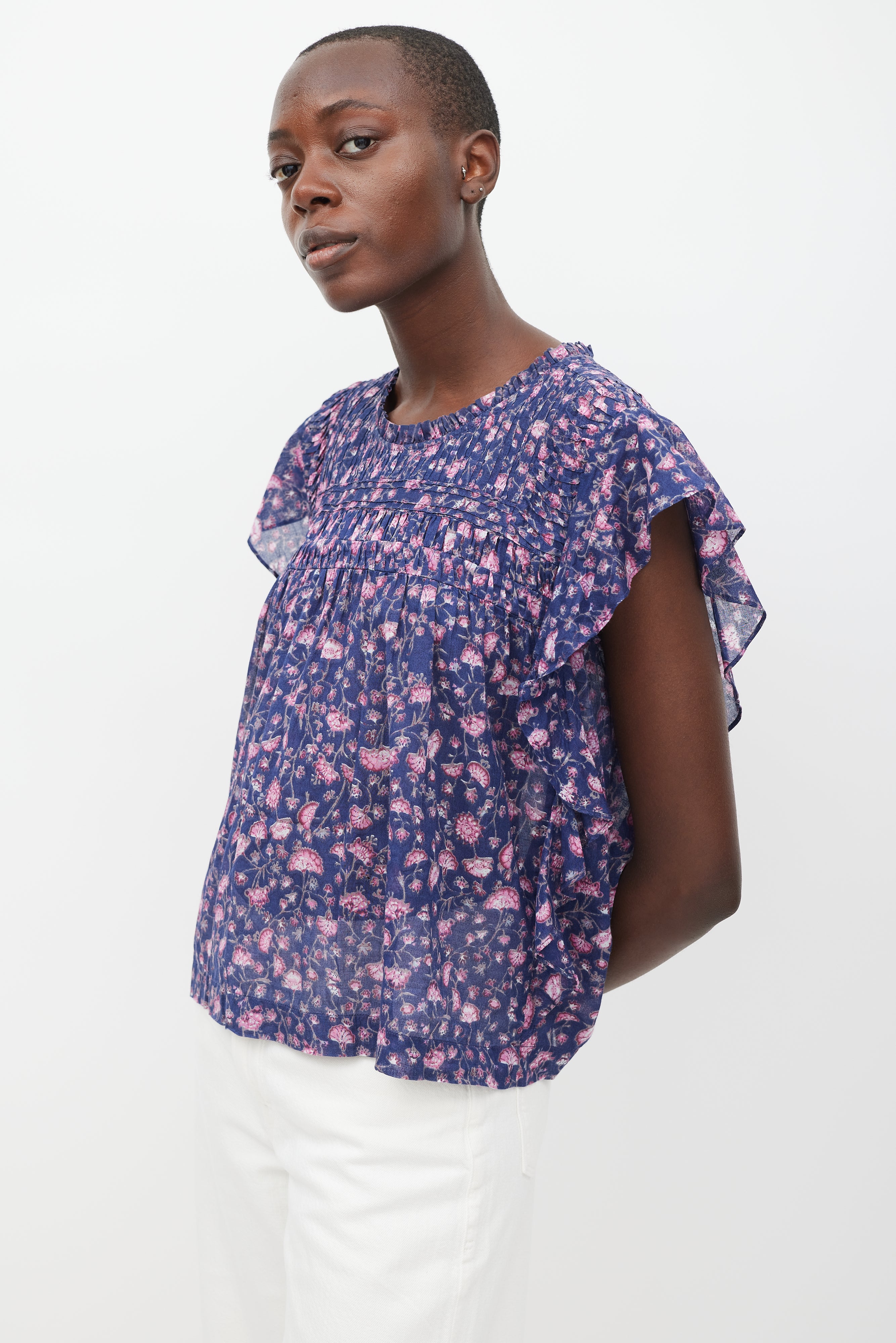 Pre-owned Isabel Marant Étoile navy top featuring a multicolour floral pattern throughout, round neckline, cap sleeves, ruffled detailing at sides, pleated bust, and button closure at back.