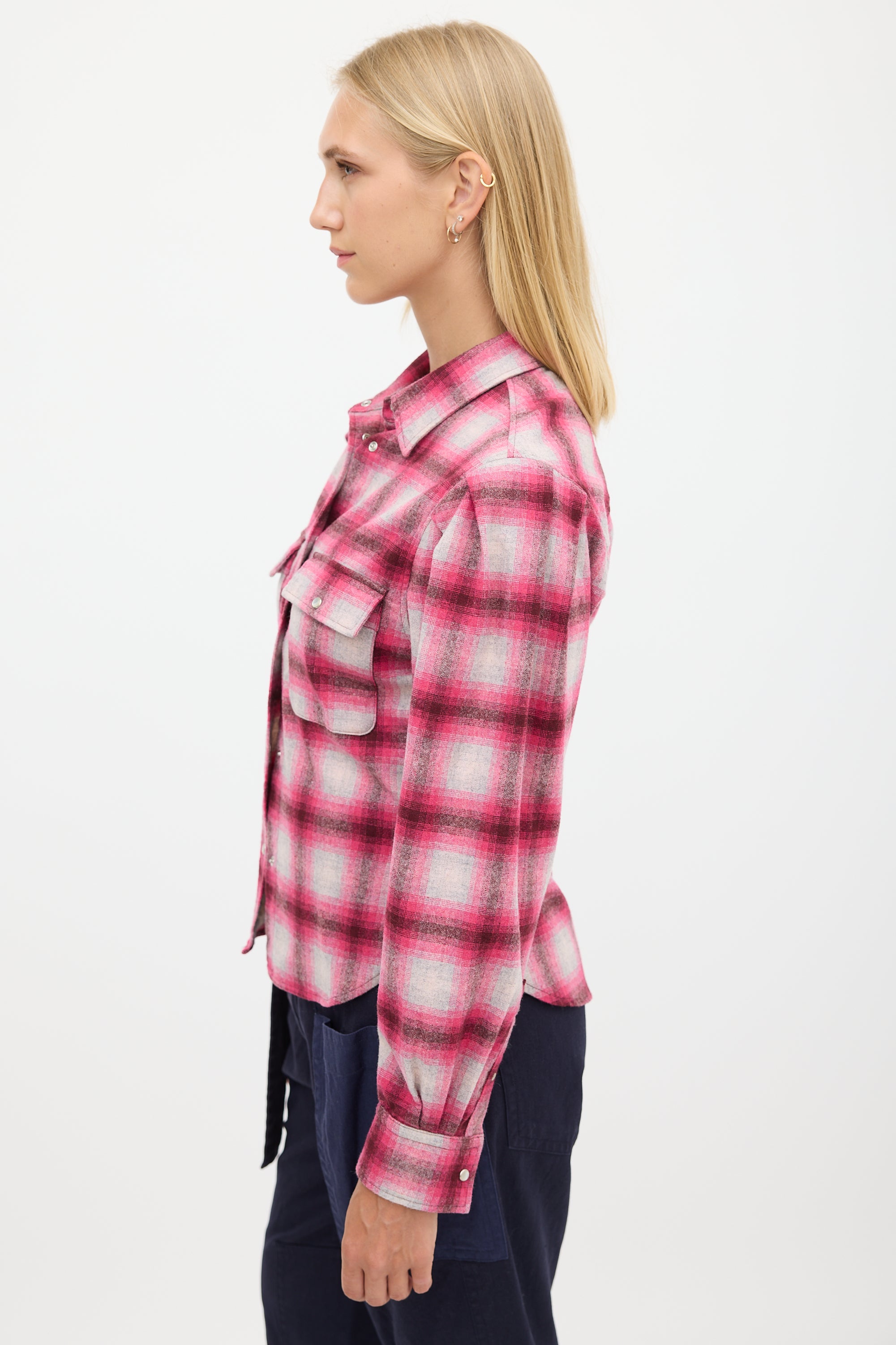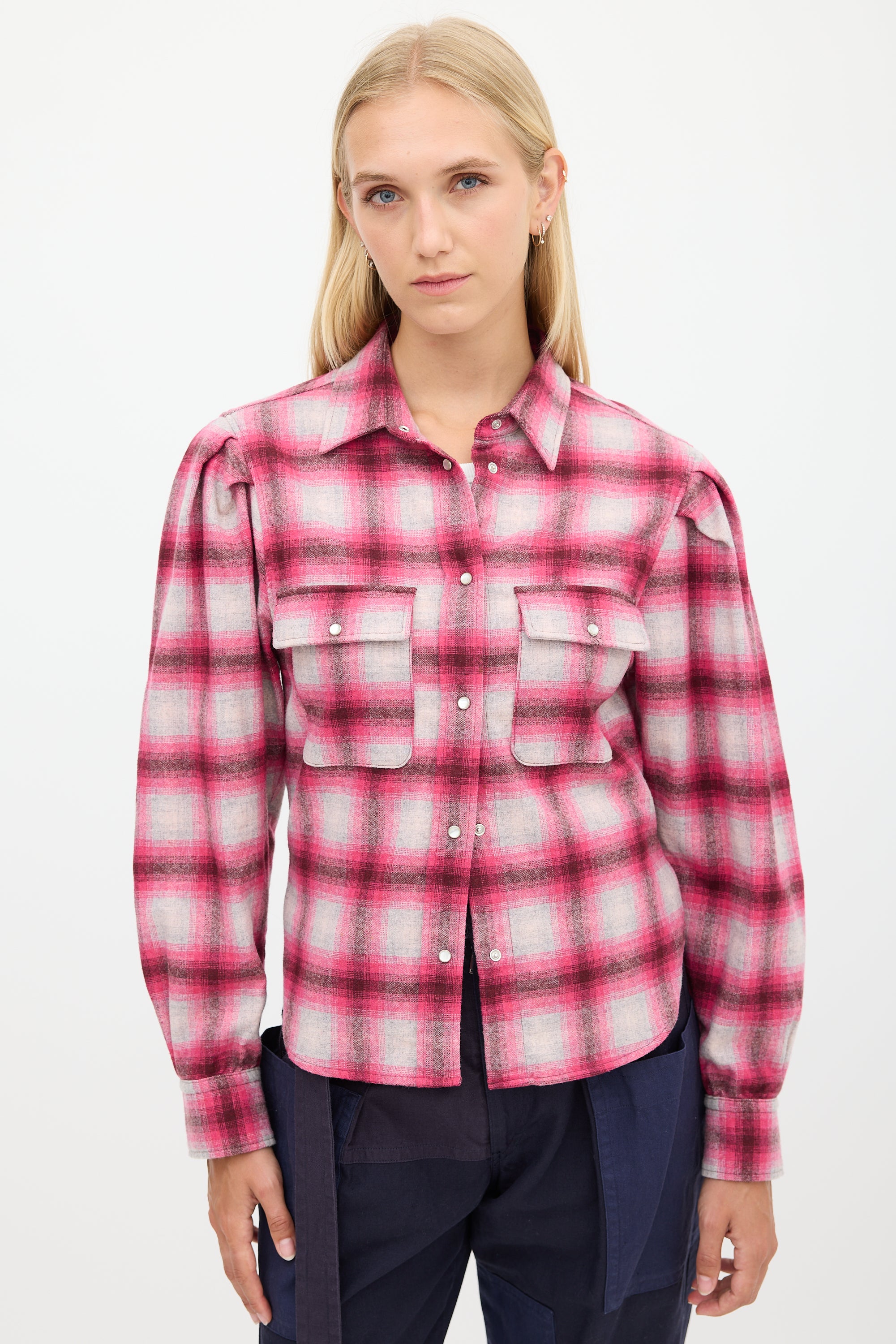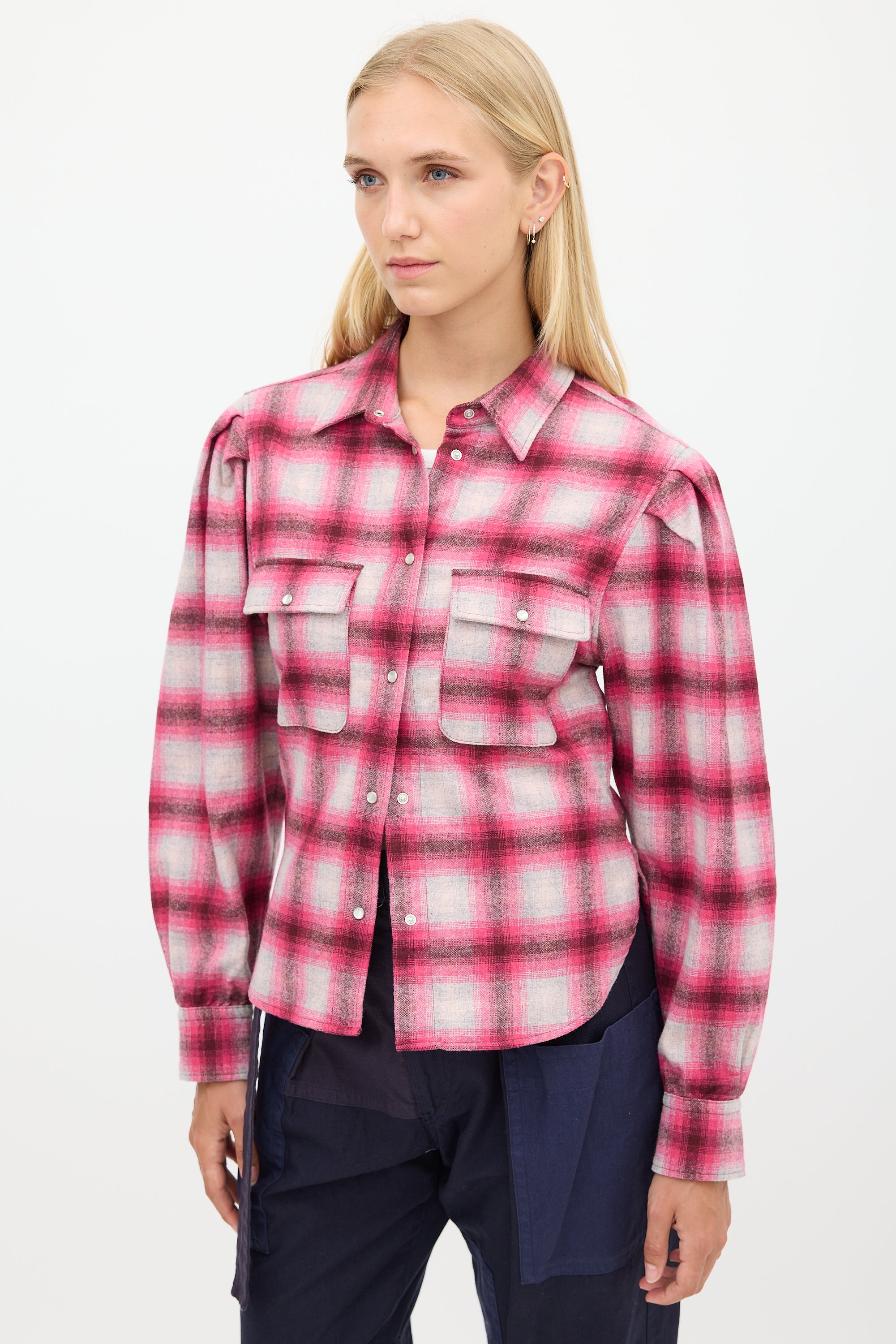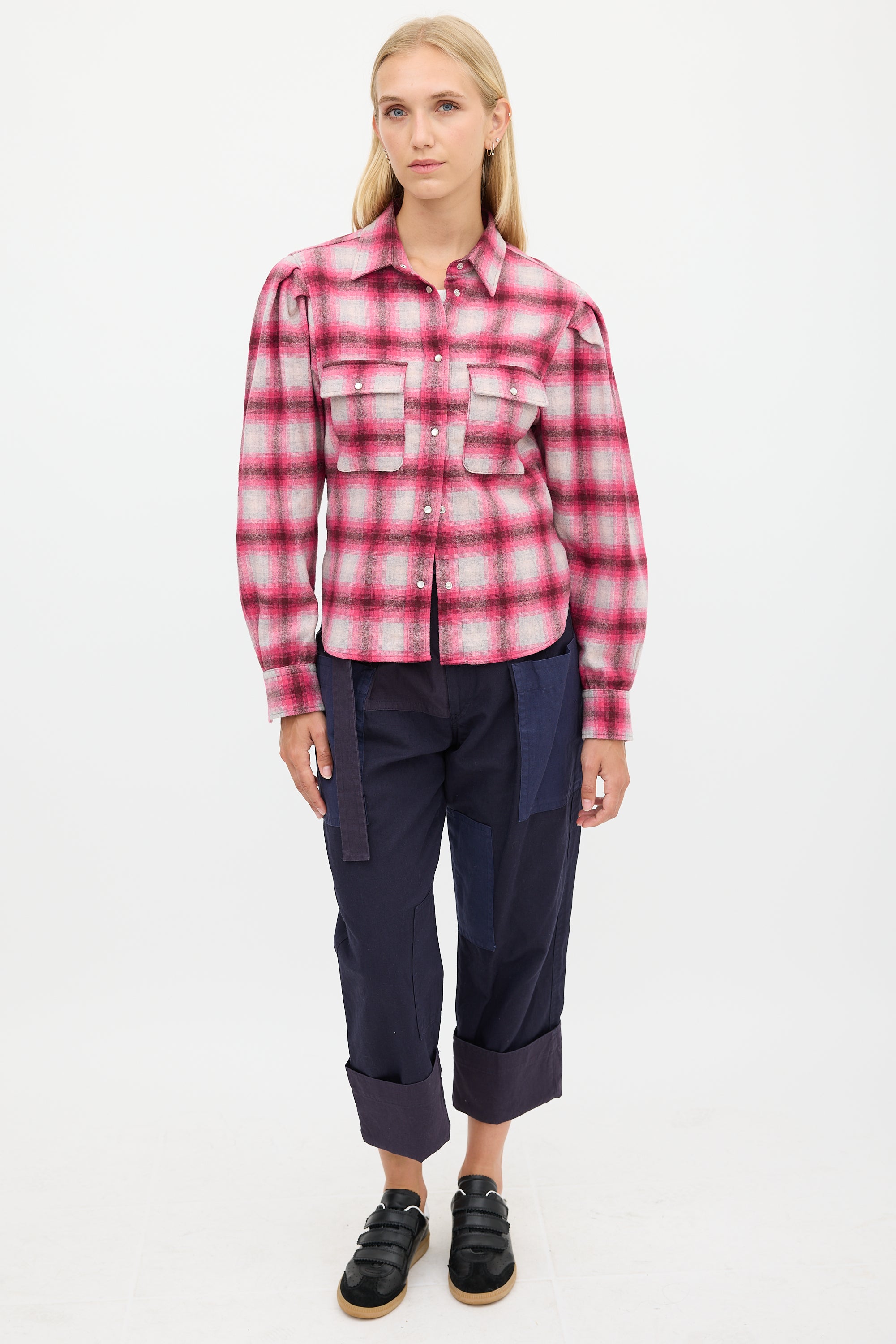 Pre-owned Isabel Marant Étoile pink wool shirt featuring a beige plaid pattern throughout, pointed collar, long sleeves with buttoned cuffs, two flap pockets at chest, and snap button up closure.