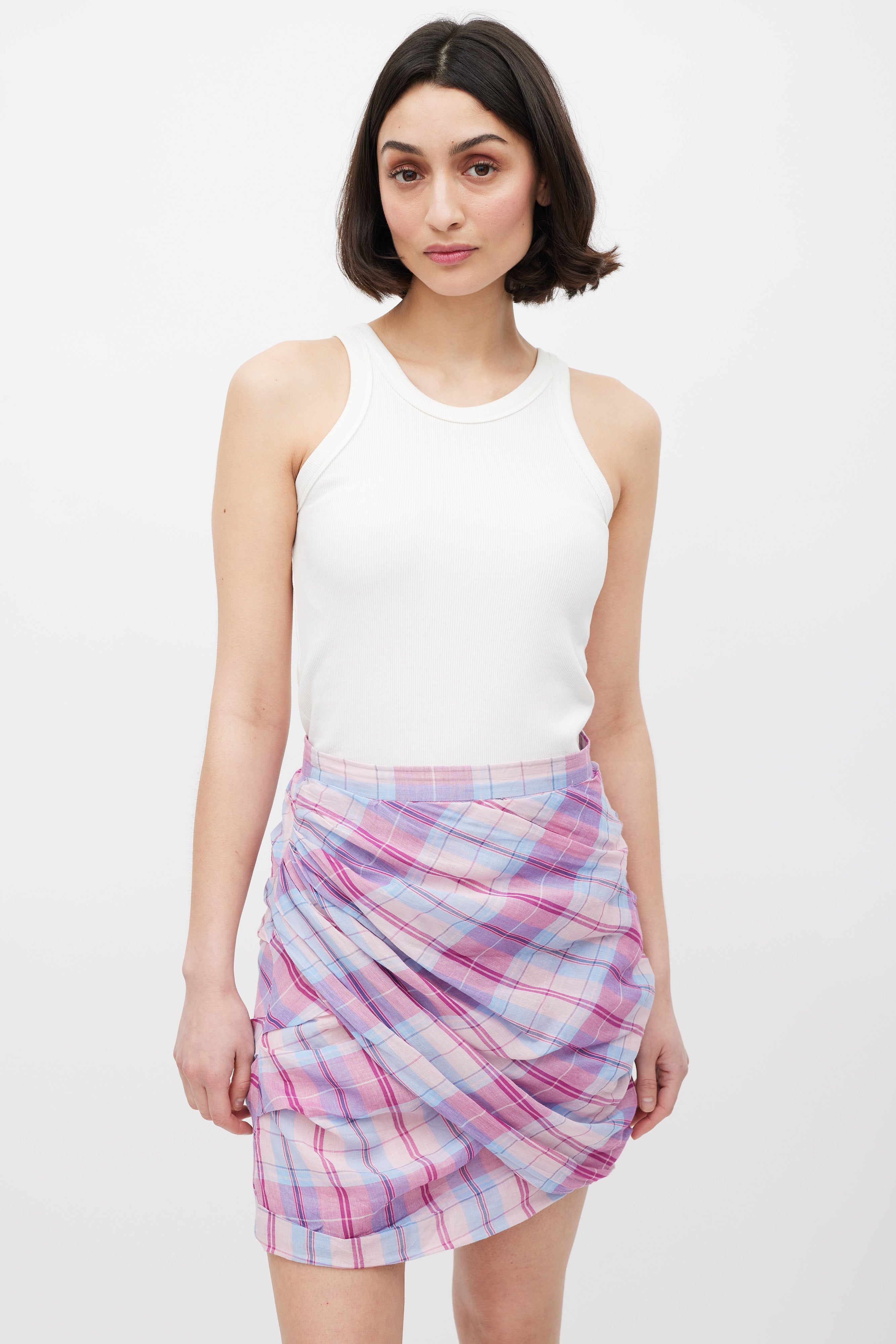 Pre-owned Isabel Marant Étoile pink and light blue plaid Birdy mini skirt featuring side pleating, draped front, and concealed side zip closure with top hook and eye fastening. Lined.