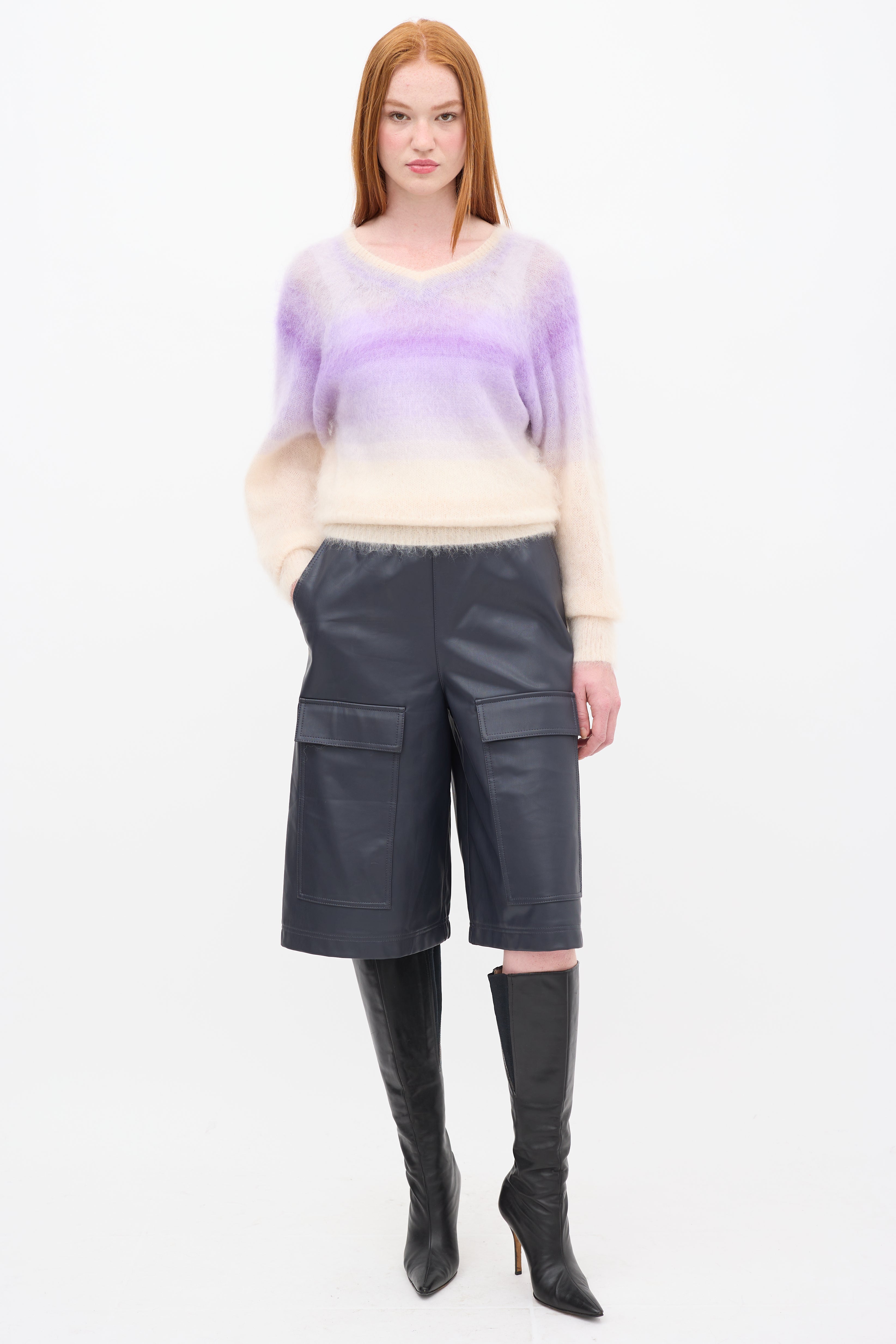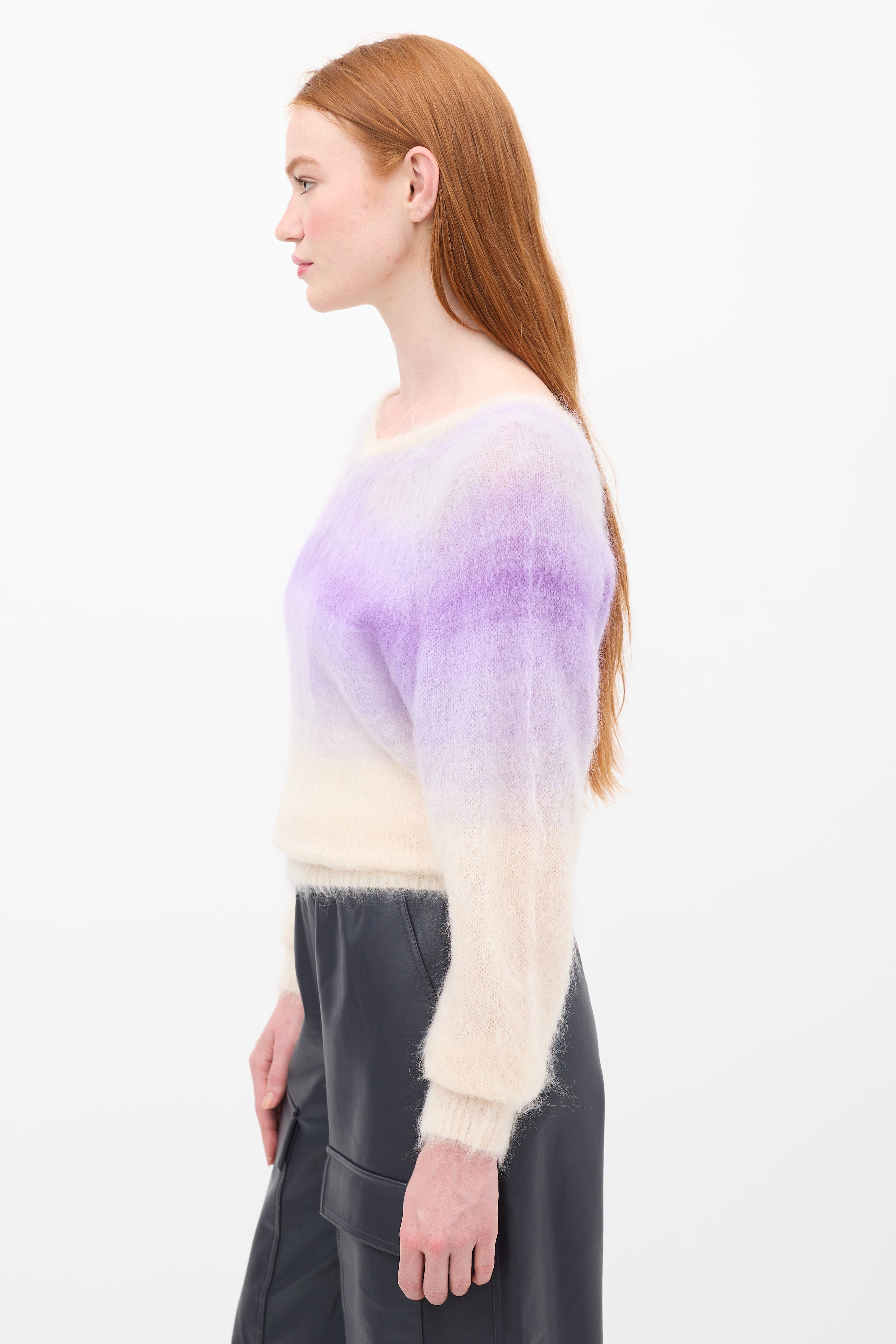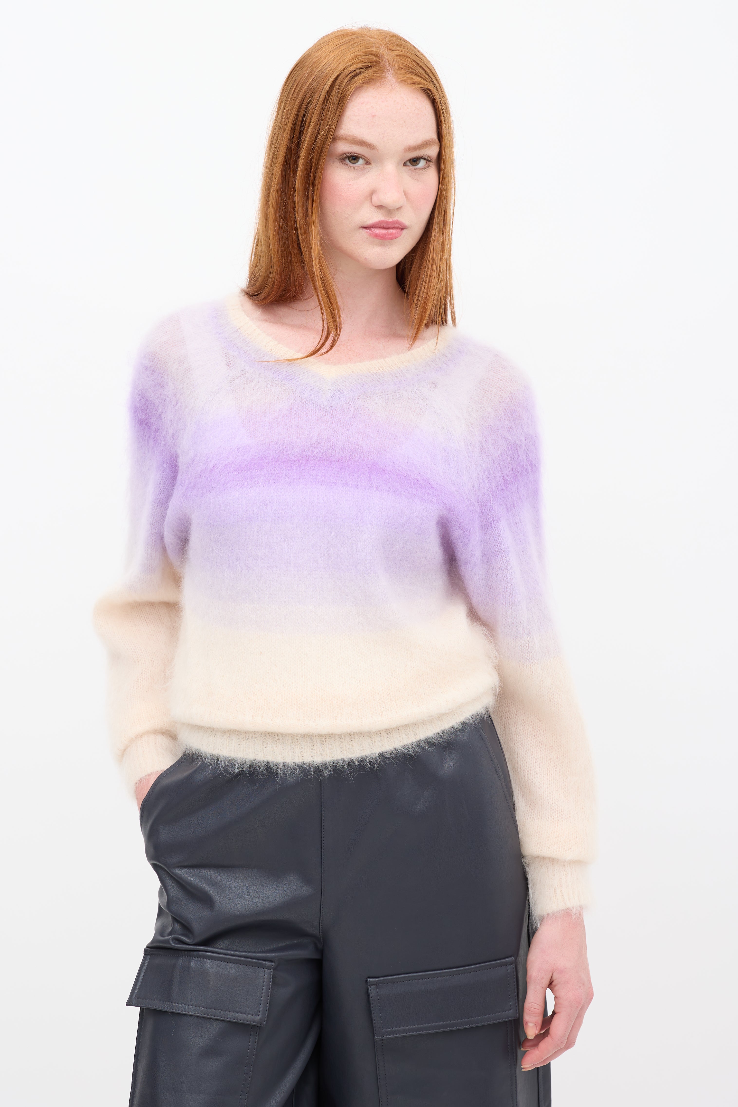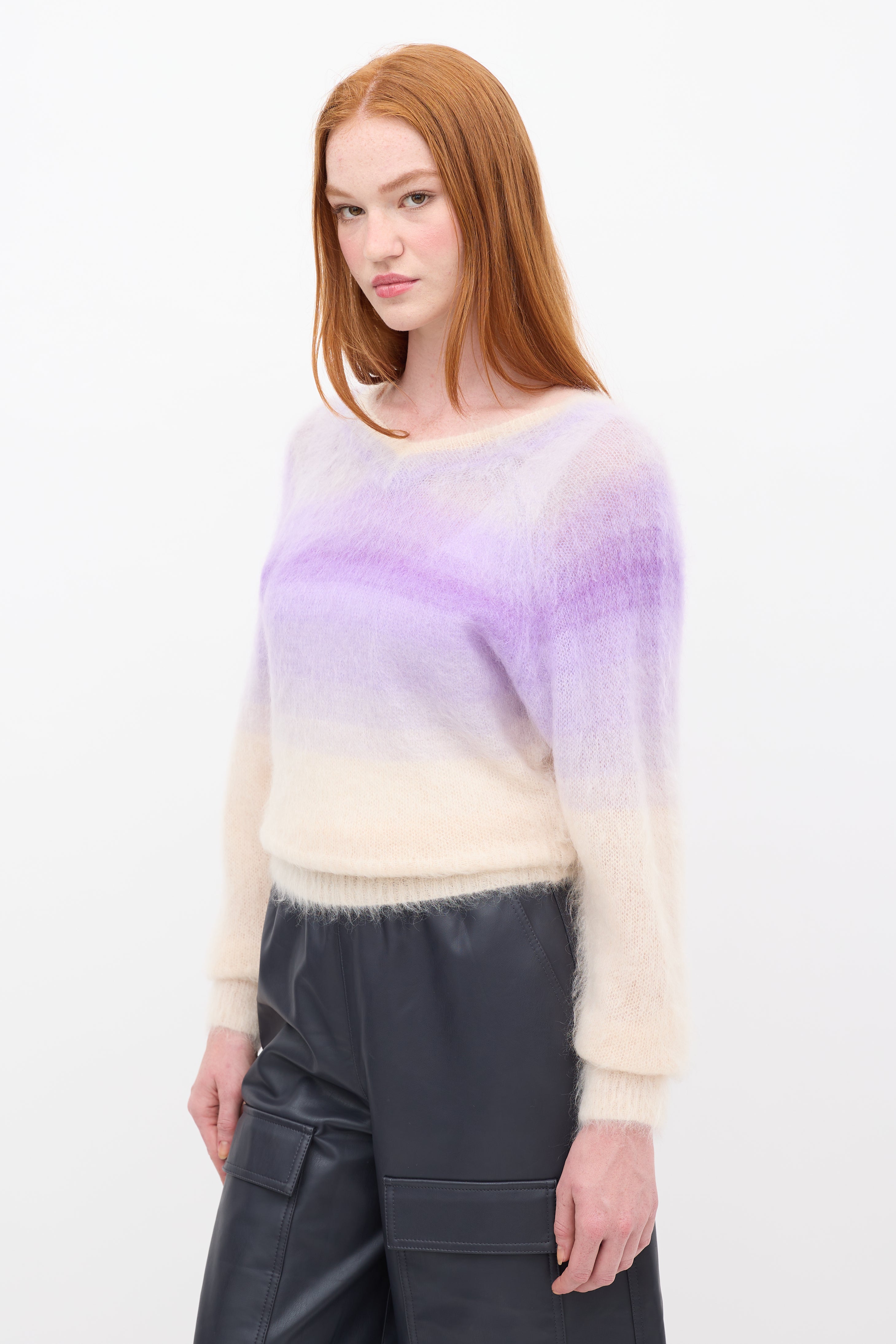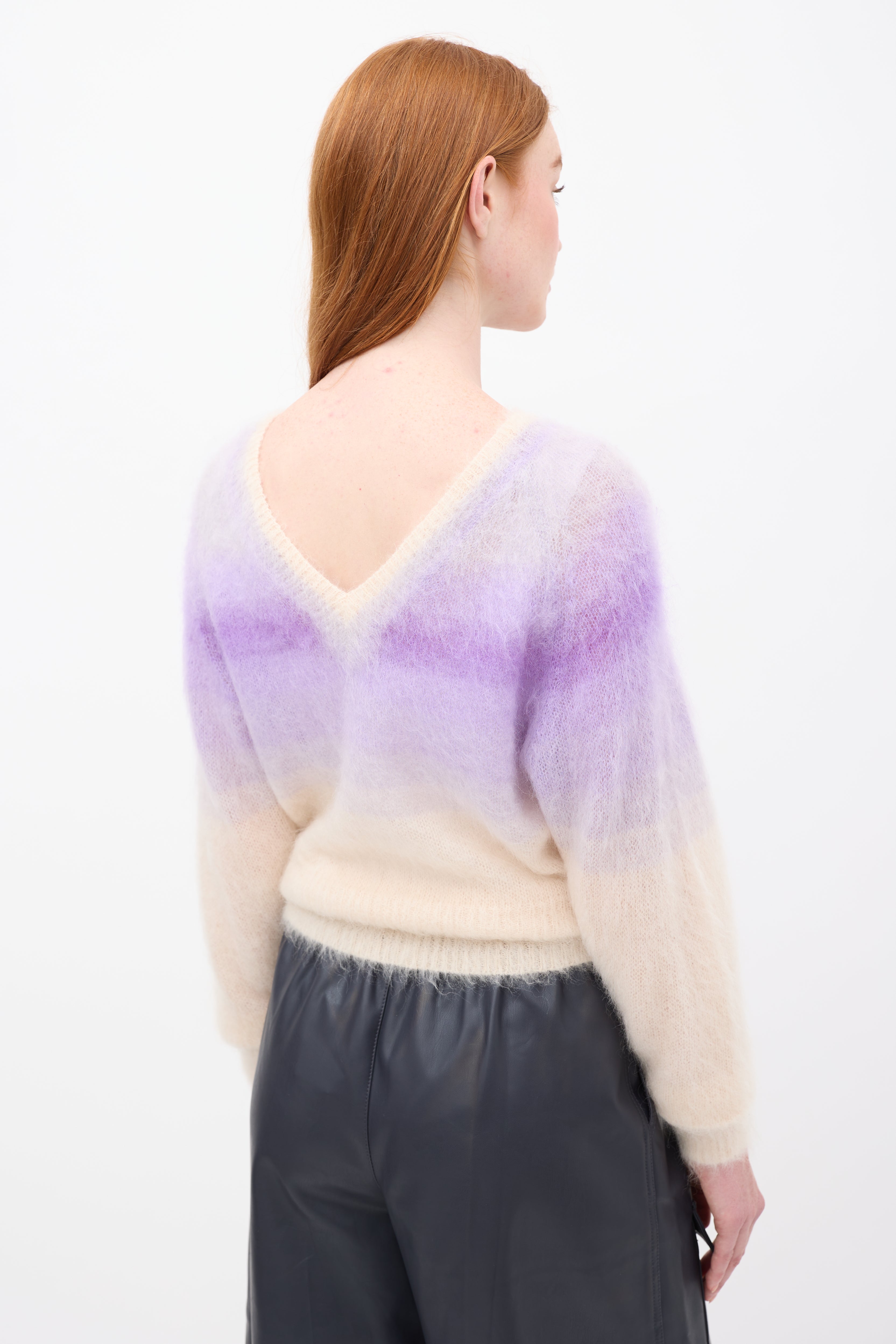 Pre-owned Isabel Marant Étoile purple and beige mohair blend Delphi sweater featuring a V-neck and back, gradient design throughout, even hem, long sleeves, and ribbing at neck, hem, and cuffs.