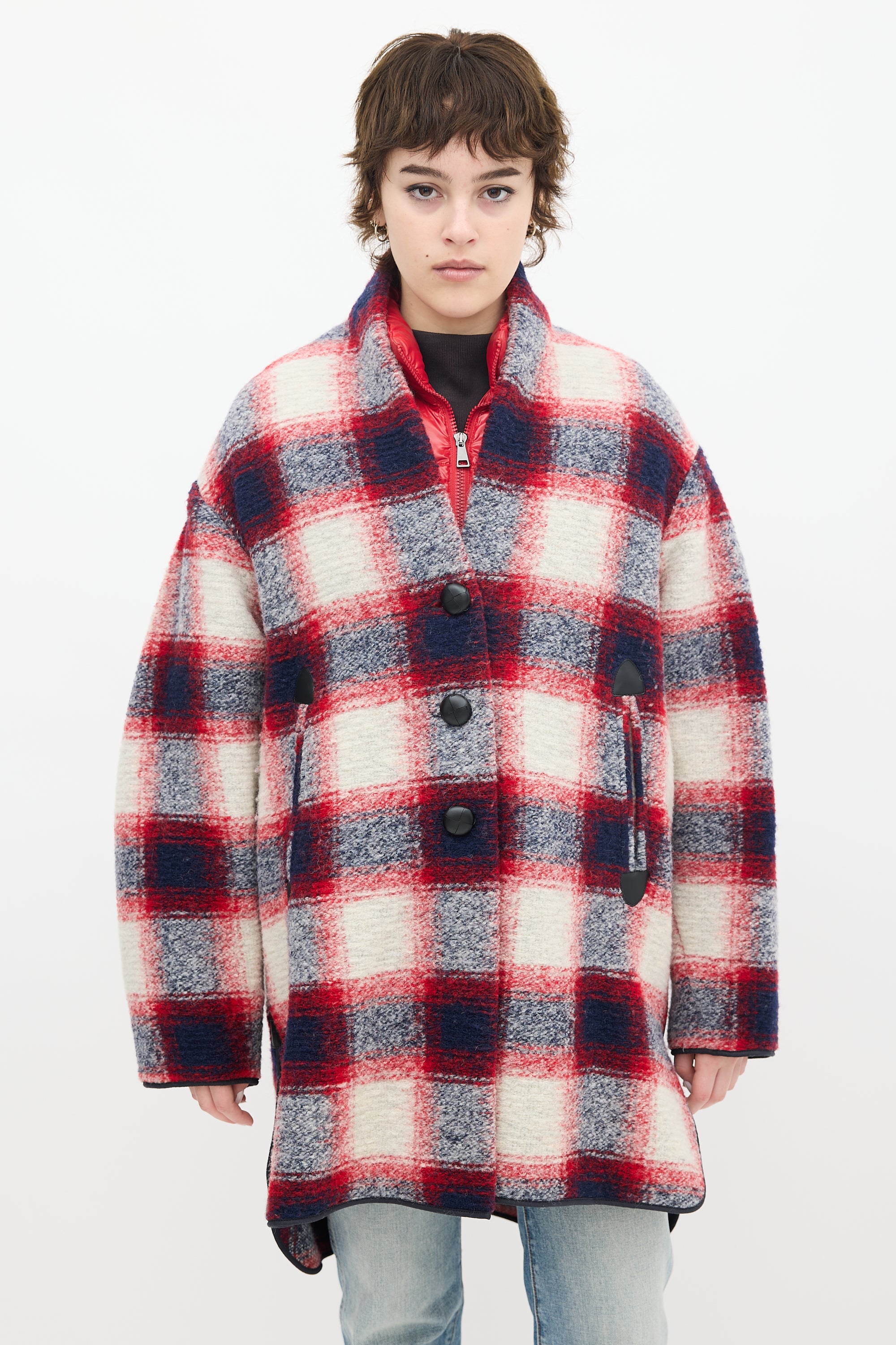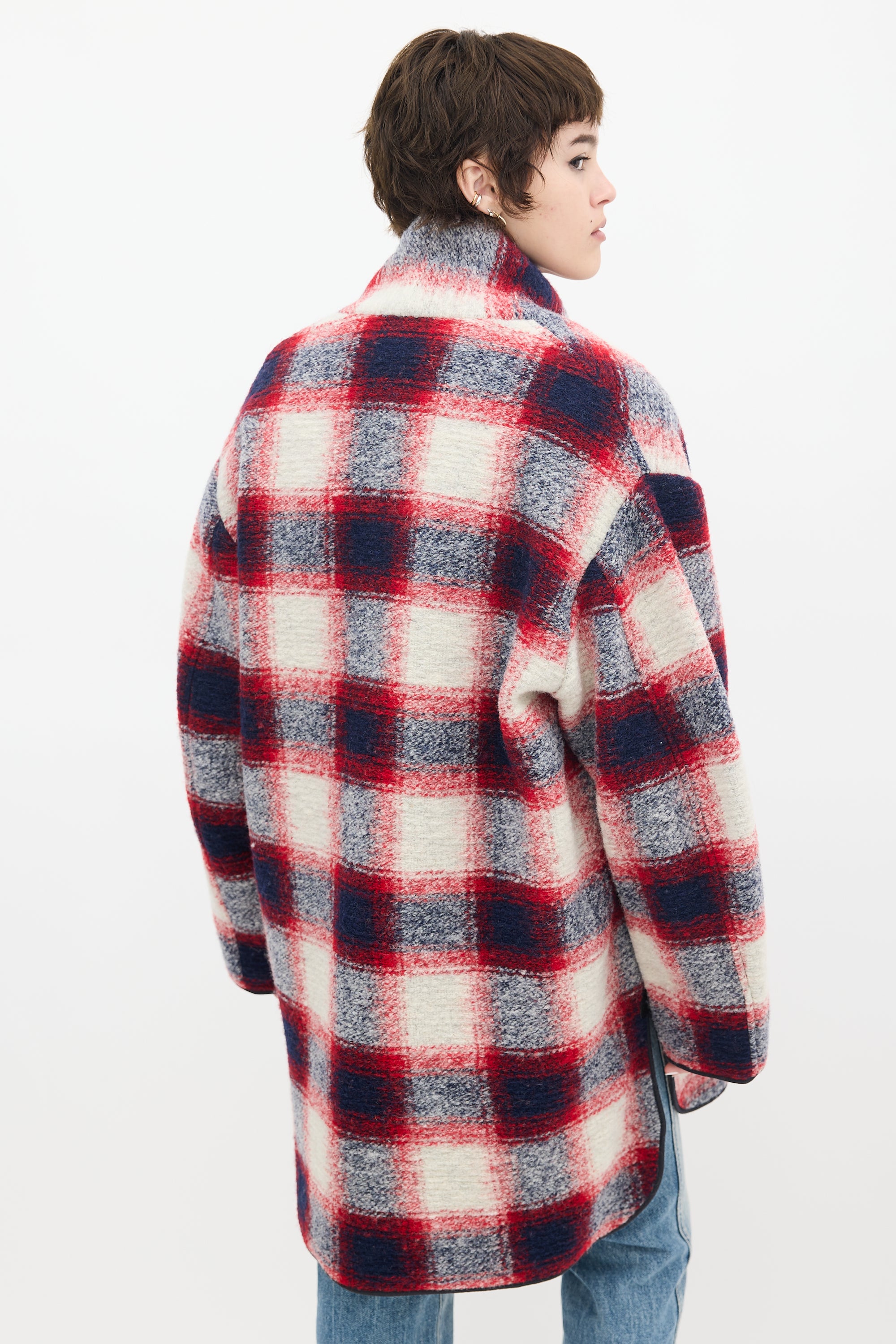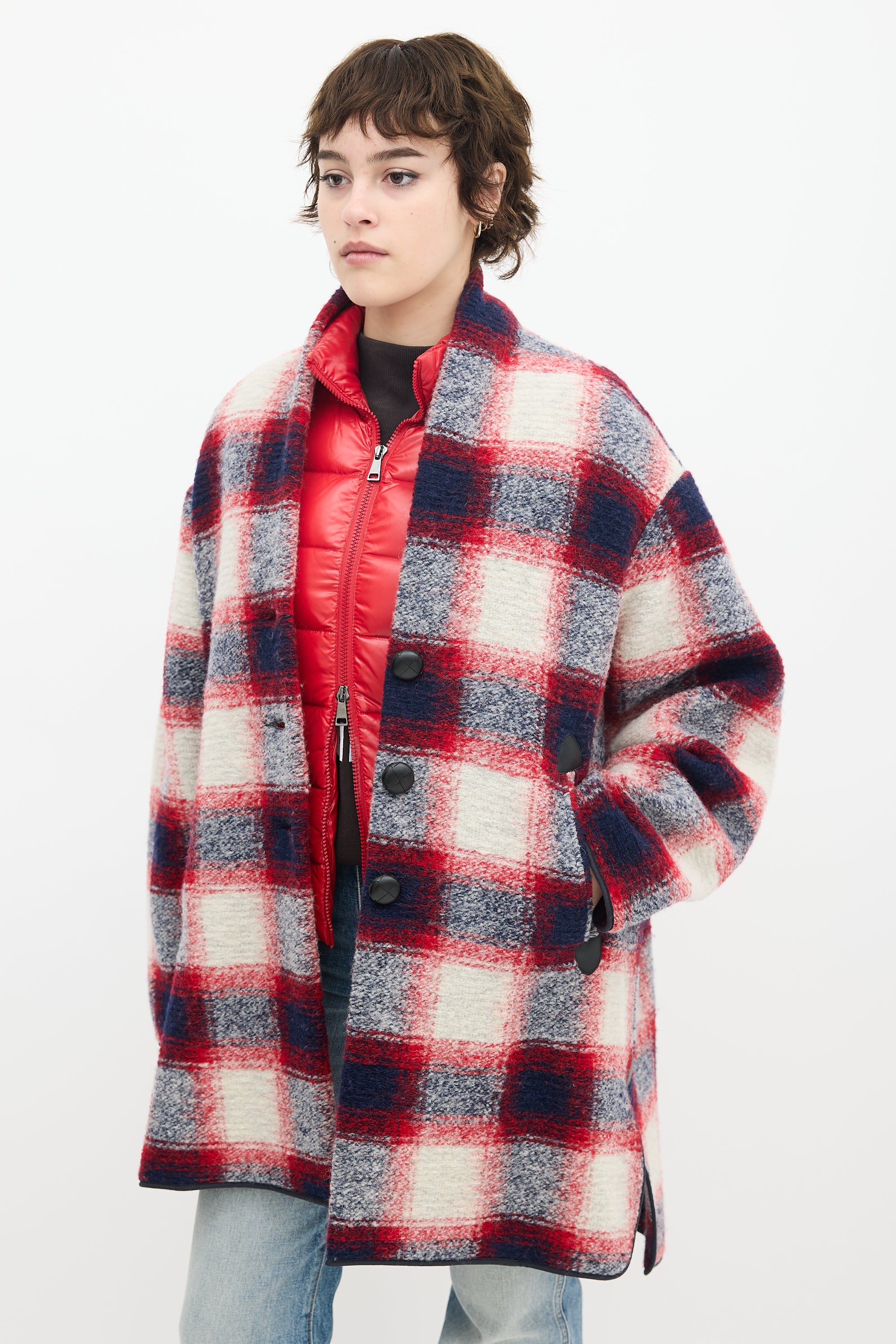 Pre-owned Isabel Marant Étoile red, navy, and white wool blend mid length coat featuring a shawl collar, button up front, two welt pockets at front hip, even hem, dropped shoulders, long sleeves, and plaid pattern throughout.
