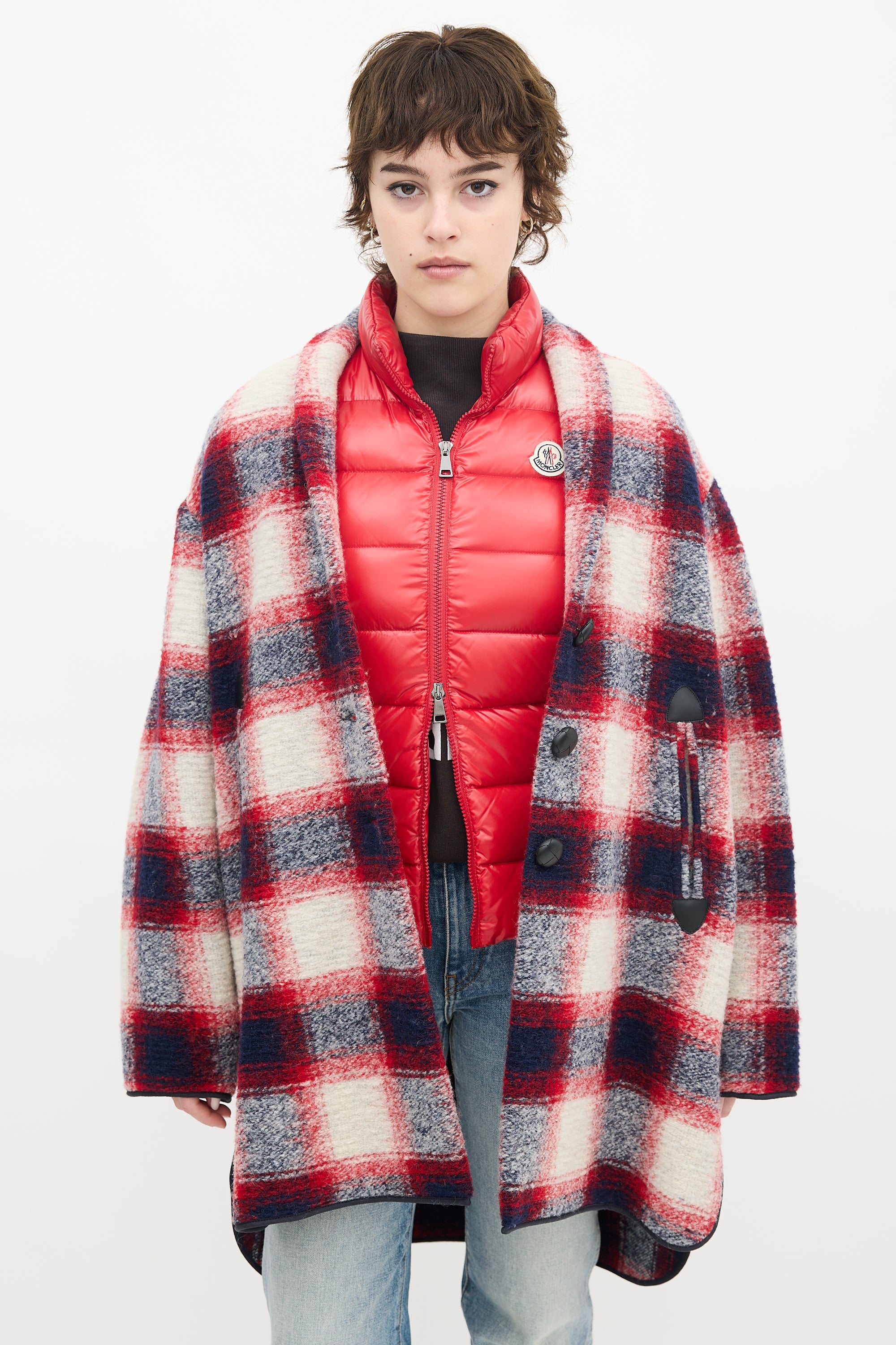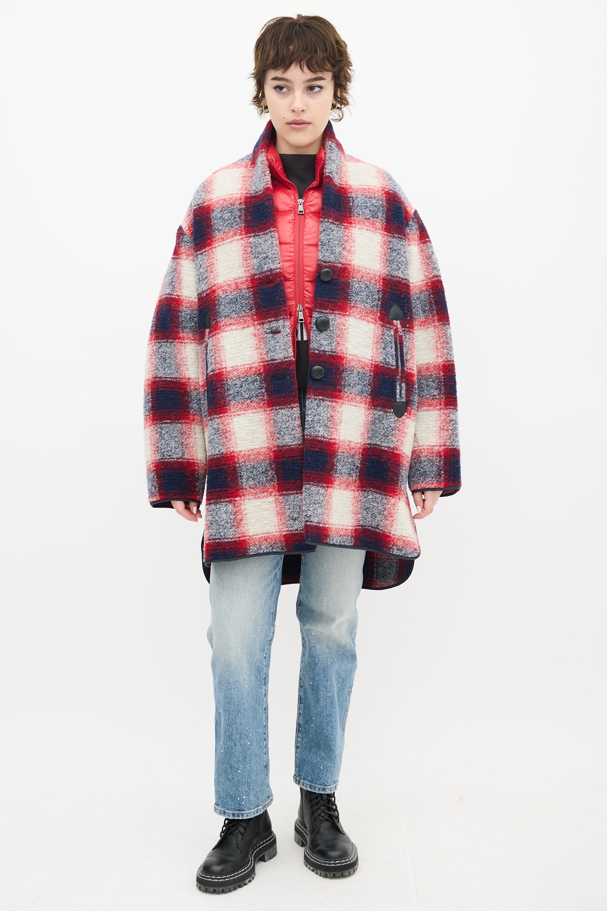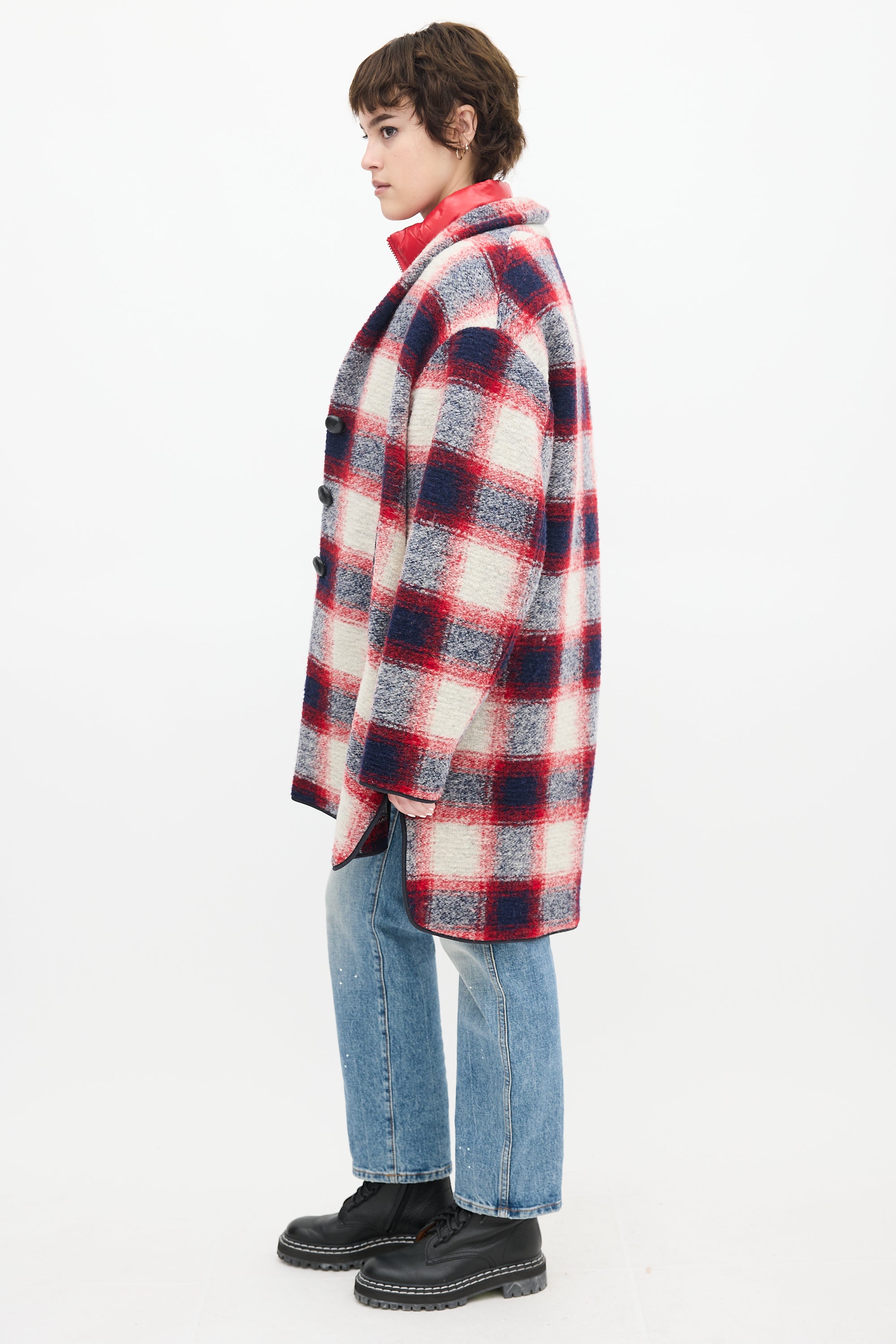 Pre-owned Isabel Marant Étoile red, navy, and white wool blend mid length coat featuring a shawl collar, button up front, two welt pockets at front hip, even hem, dropped shoulders, long sleeves, and plaid pattern throughout.