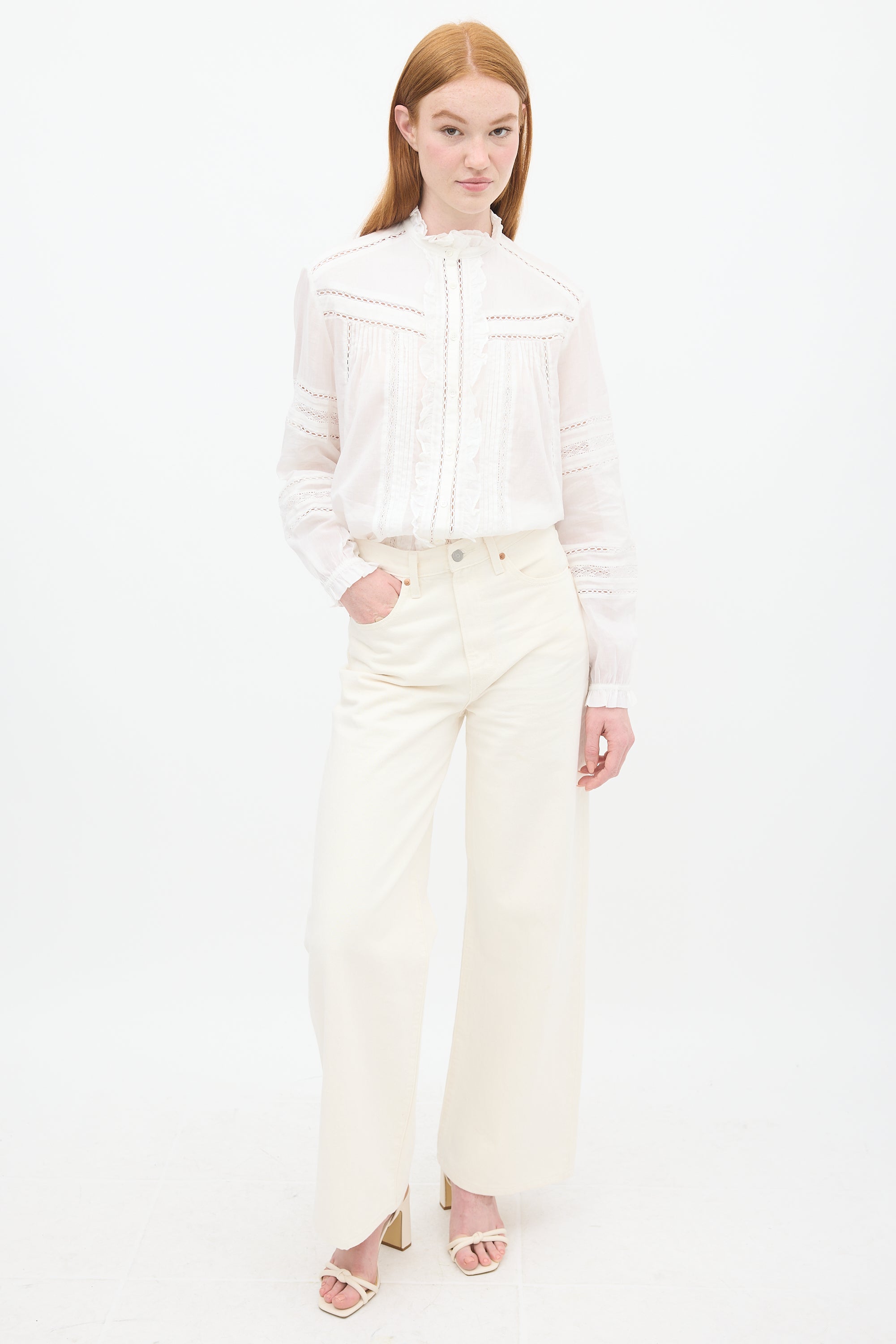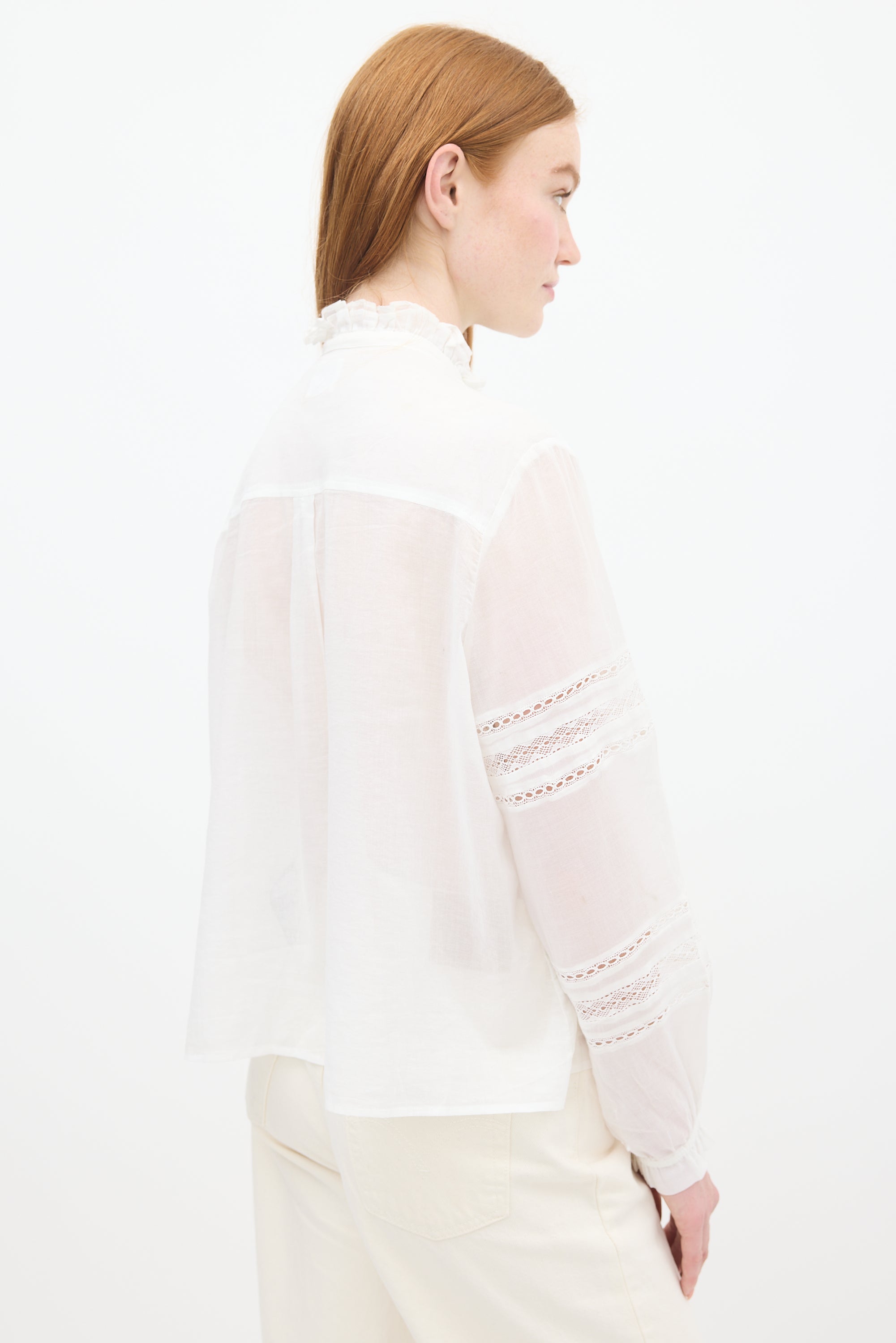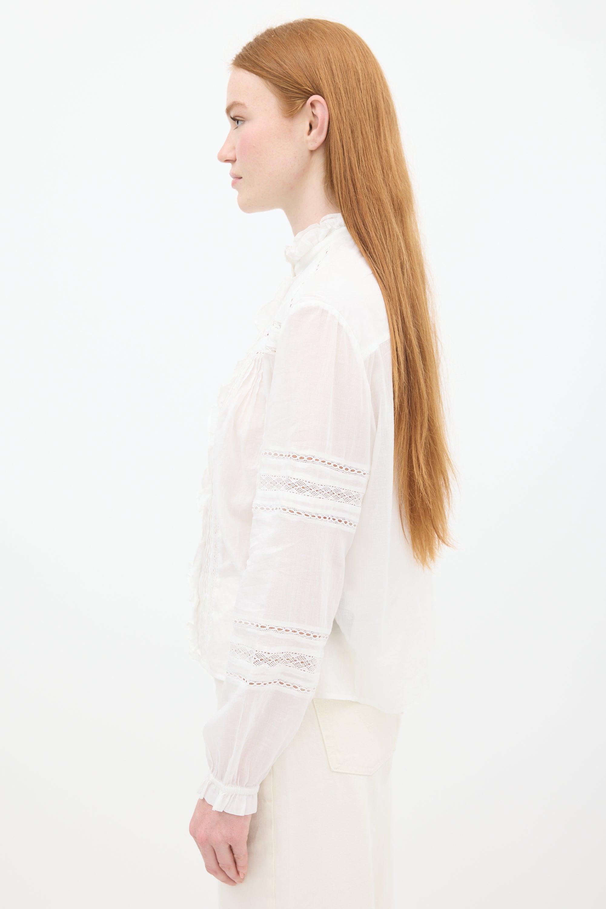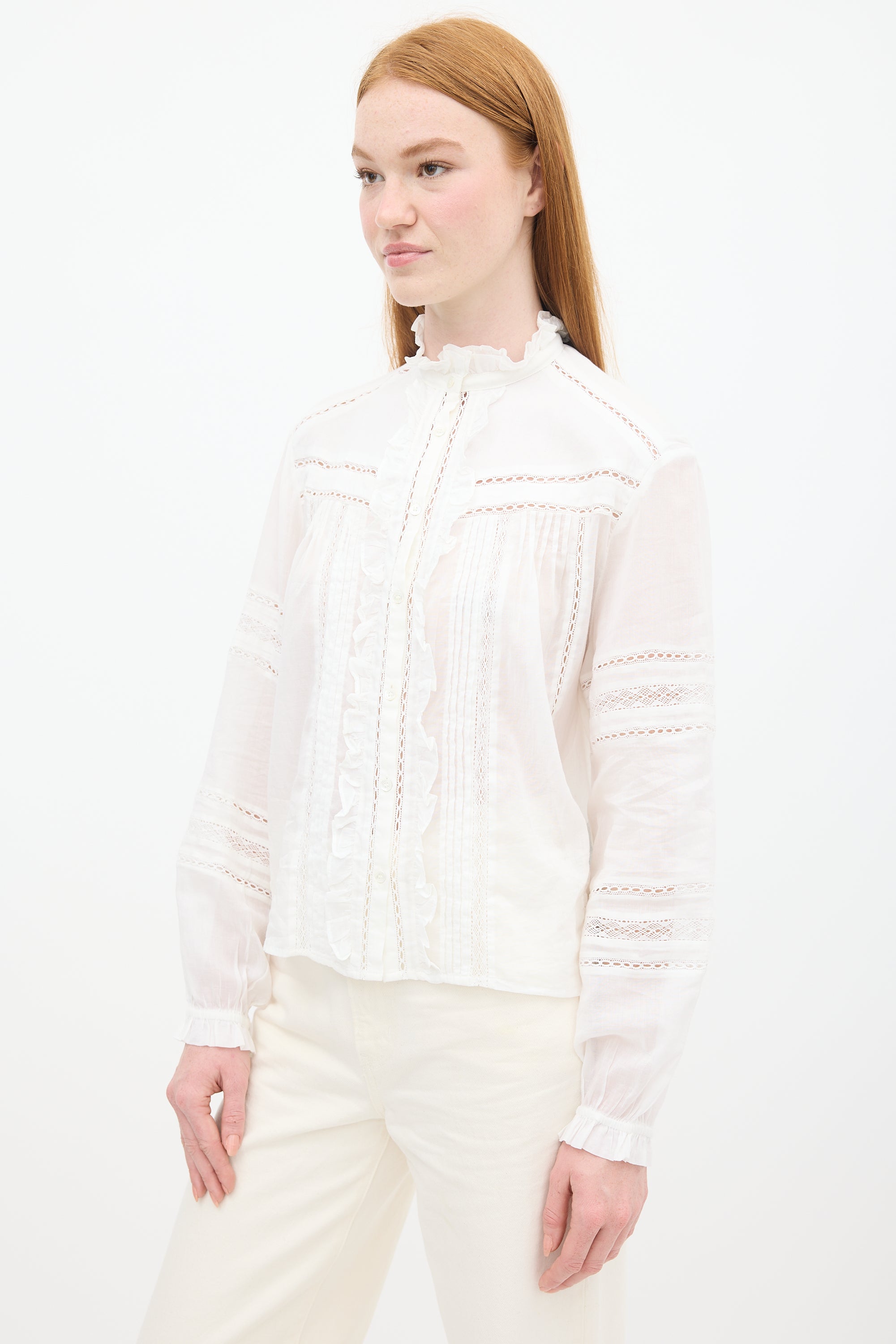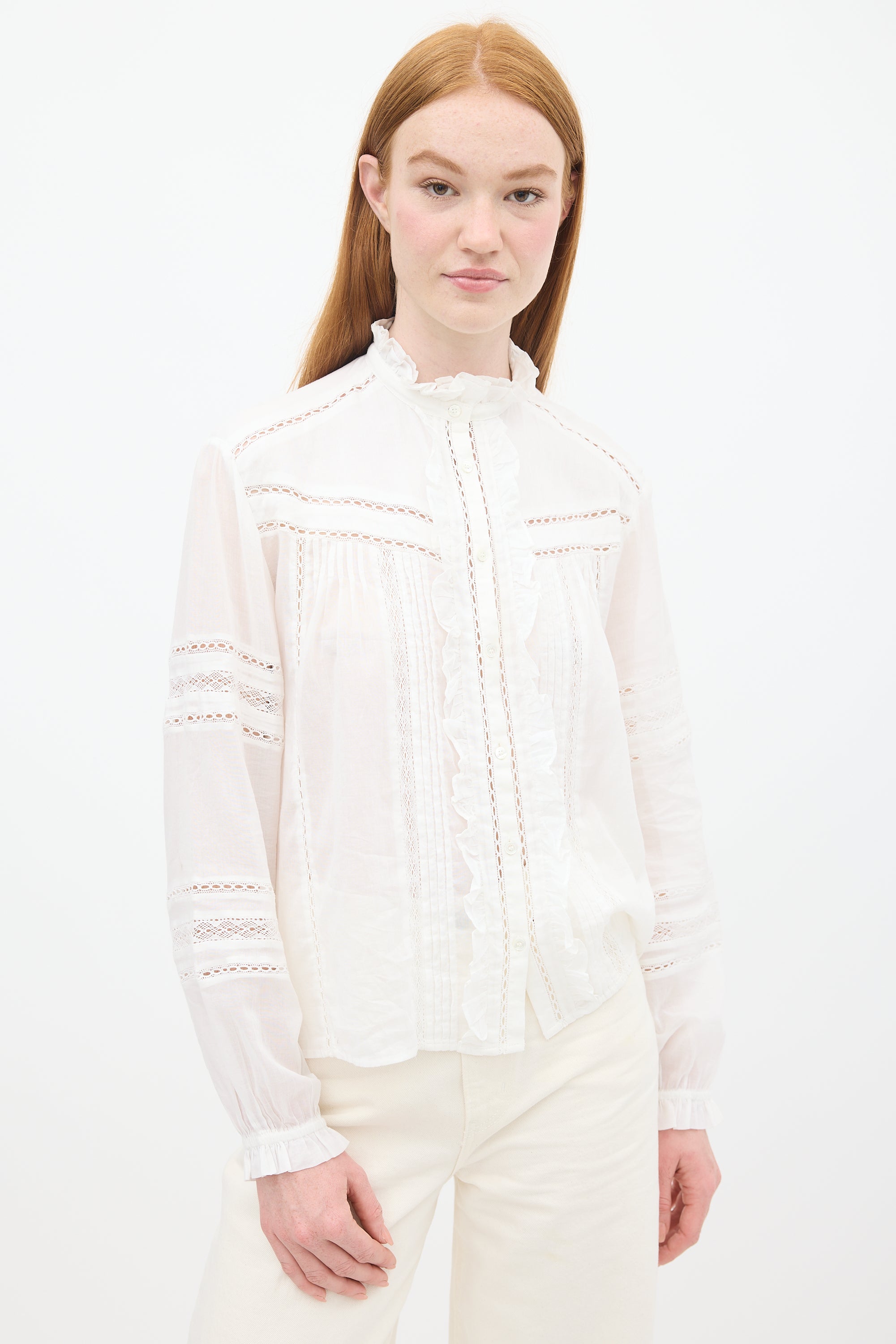 Pre-owned Isabel Marant Étoile white cotton Metina shirt featuring a ruffled stand collar, button up front with ruffle trim at placket, pleating at front and back yoke, panelled construction with eyelet lace inserts, and long sleeves with elasticized ruffle cuffs.