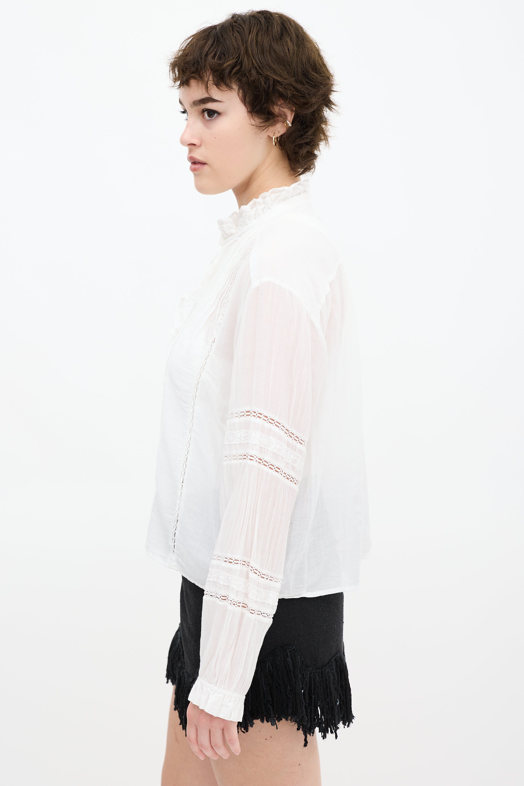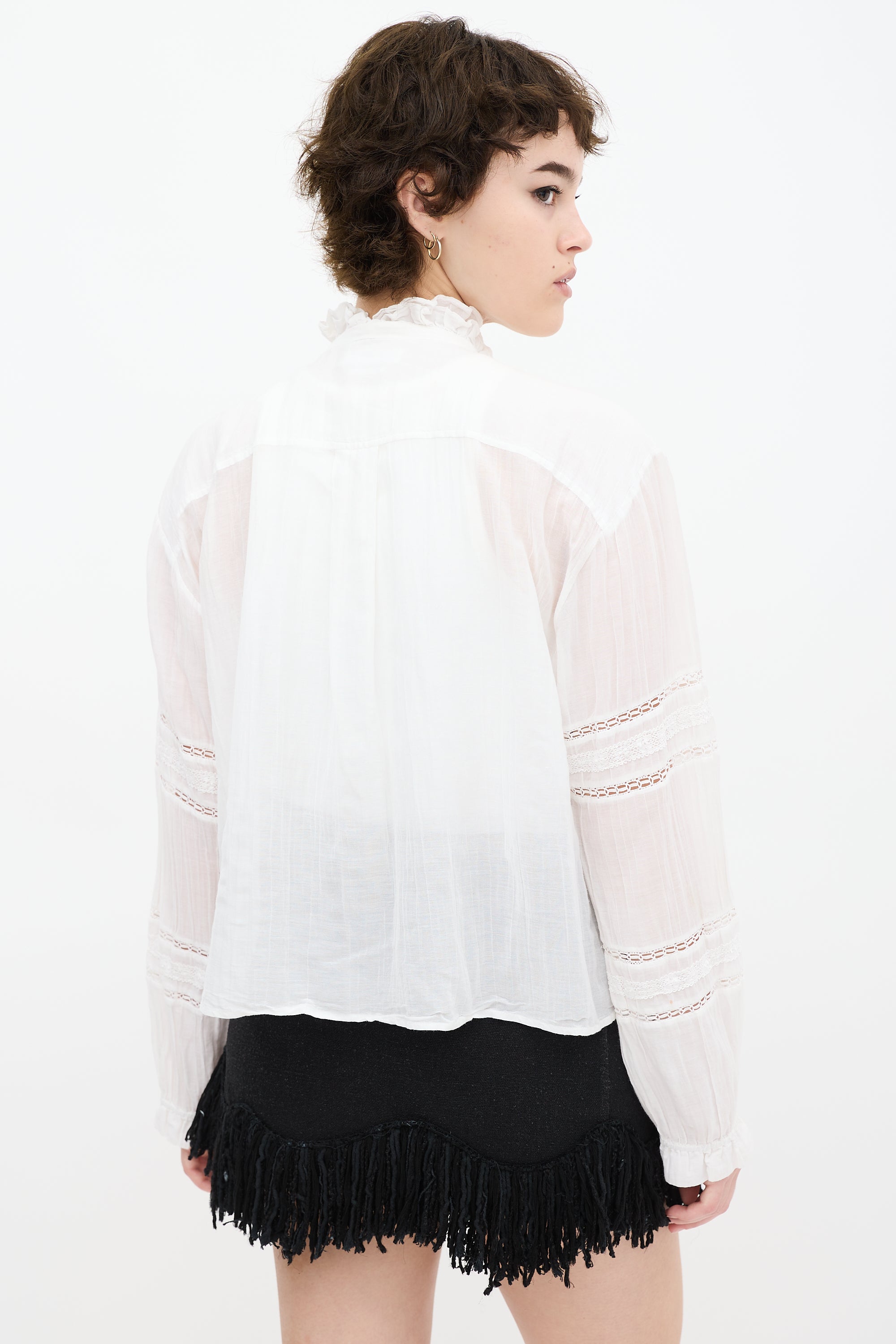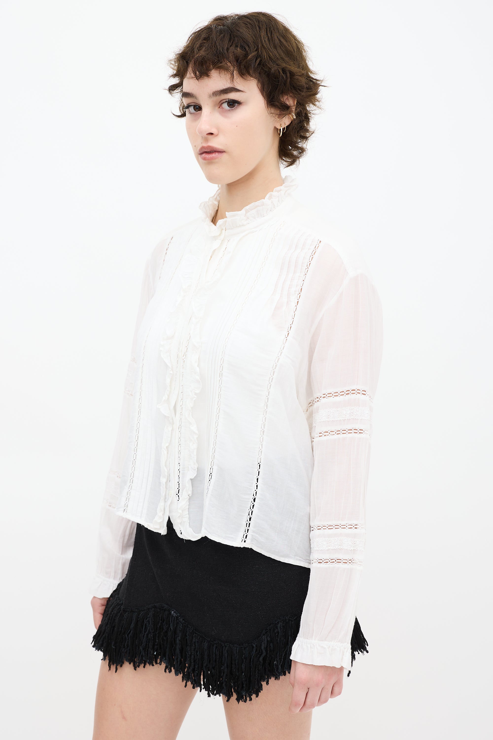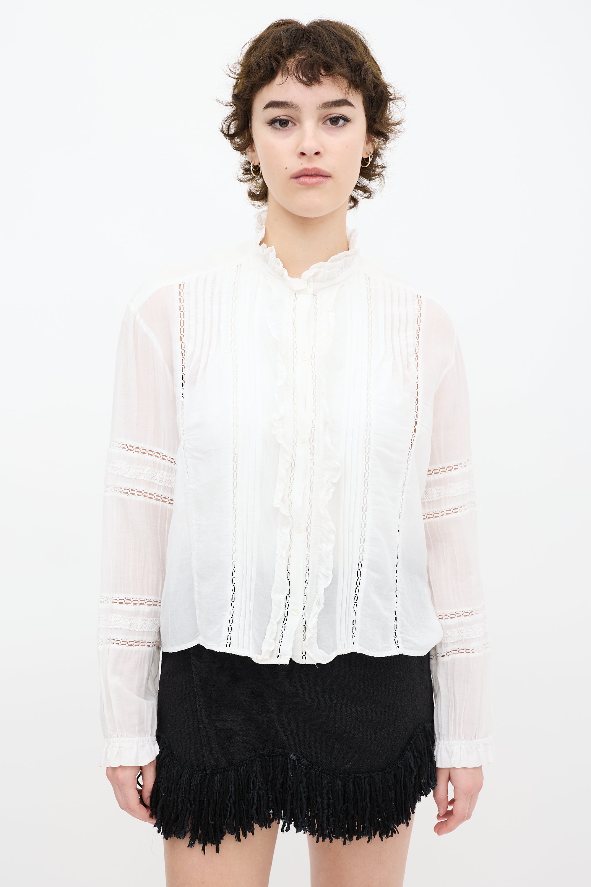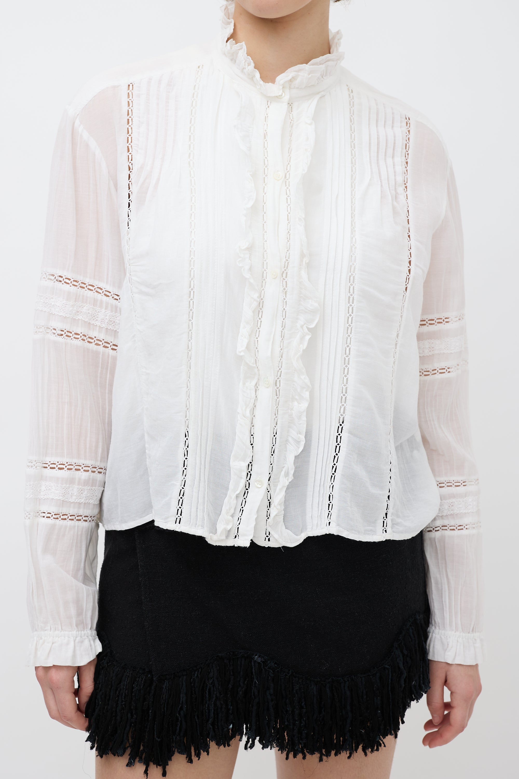 Pre-owned Isabel Marant Étoile white shirt featuring a round neckline, ruffled detailing, long sleeves, eyelet cut outs throughout, and button up closure.