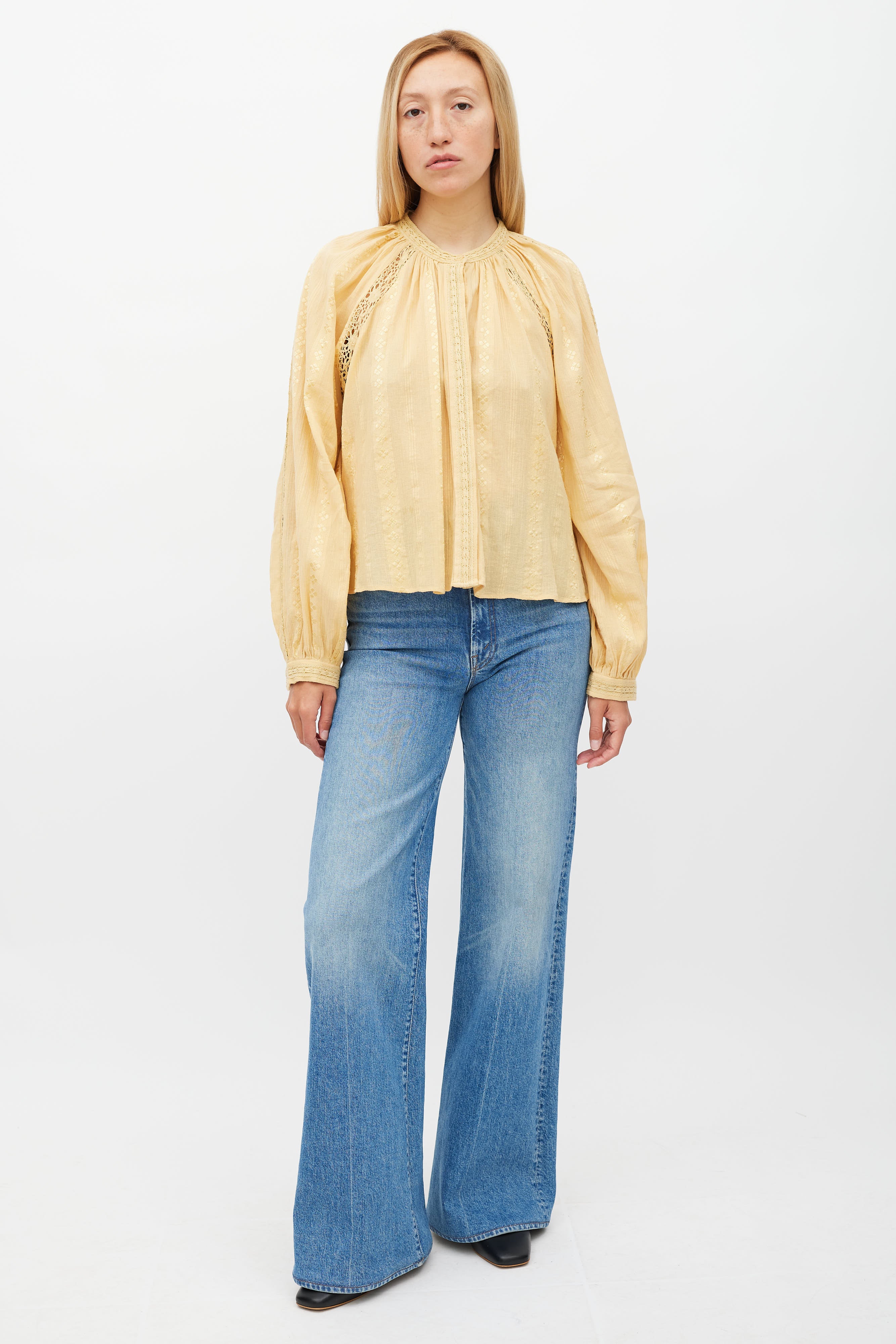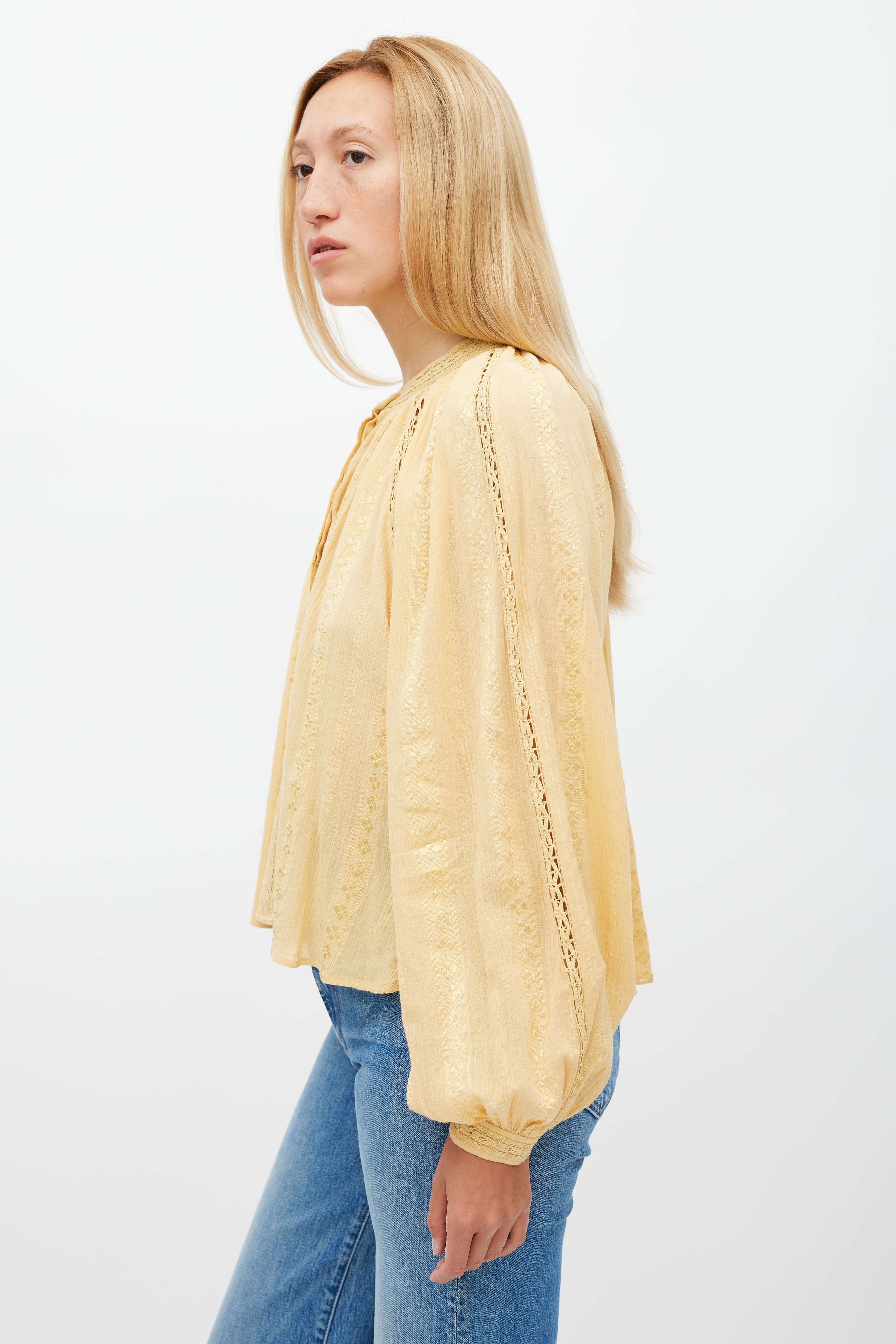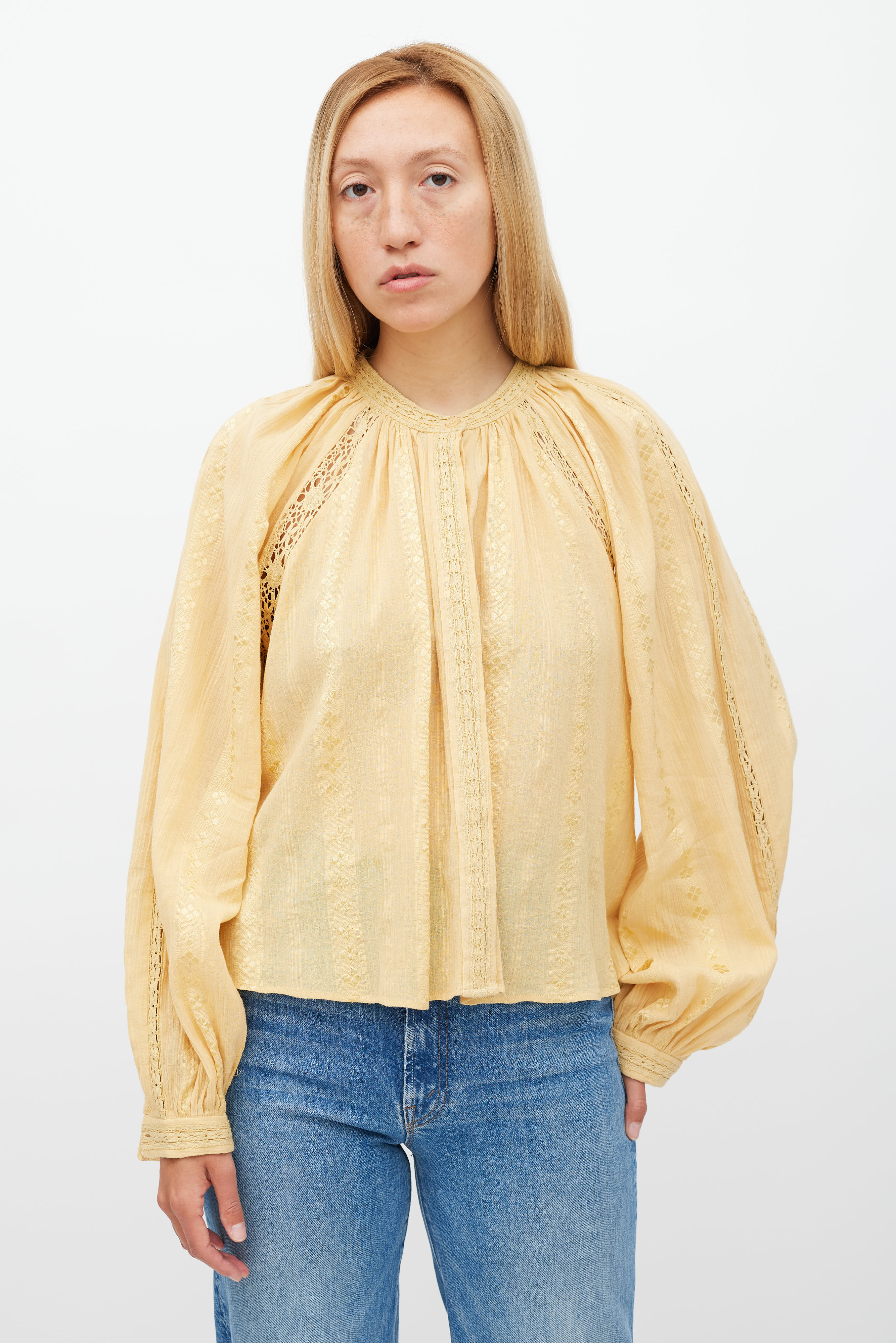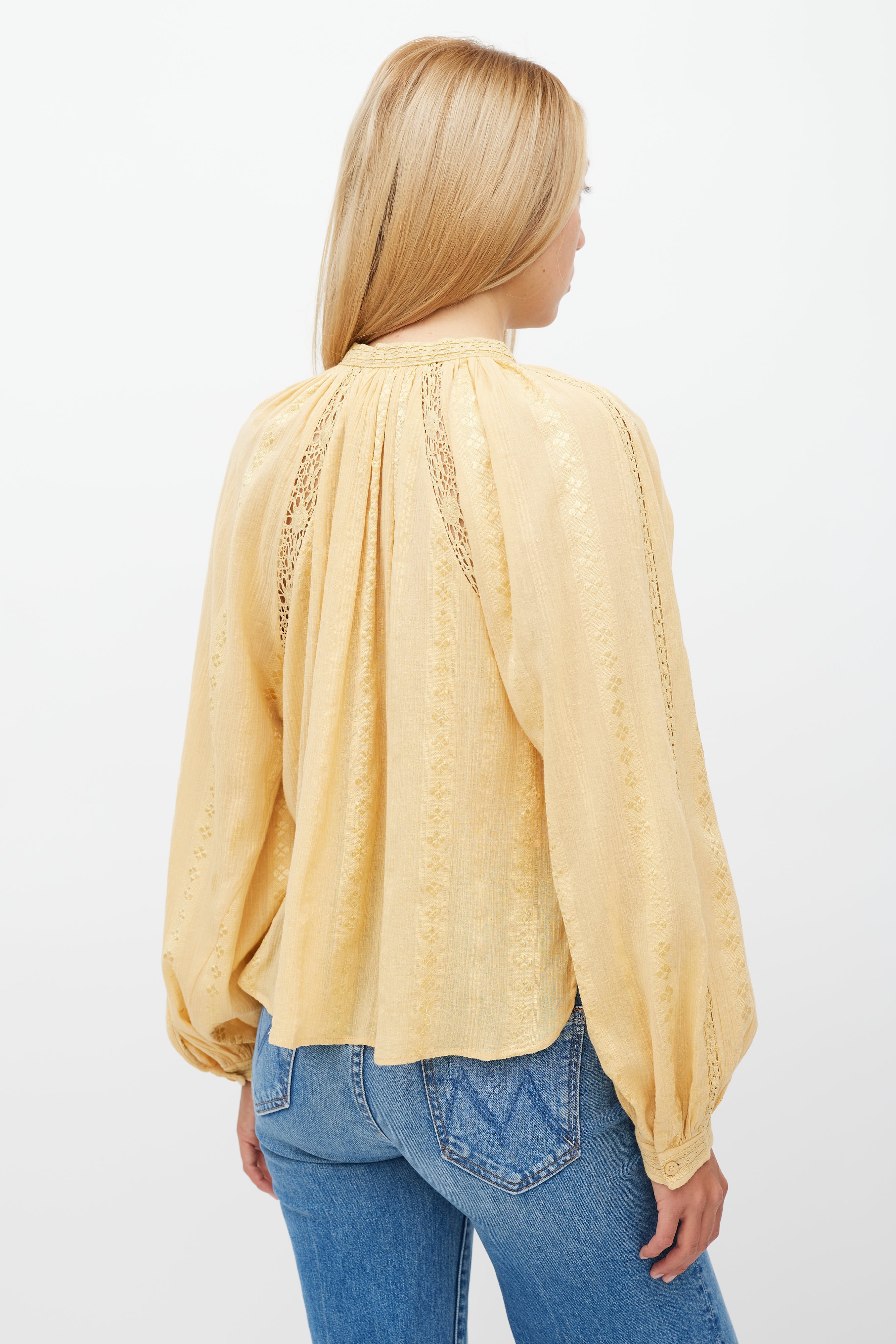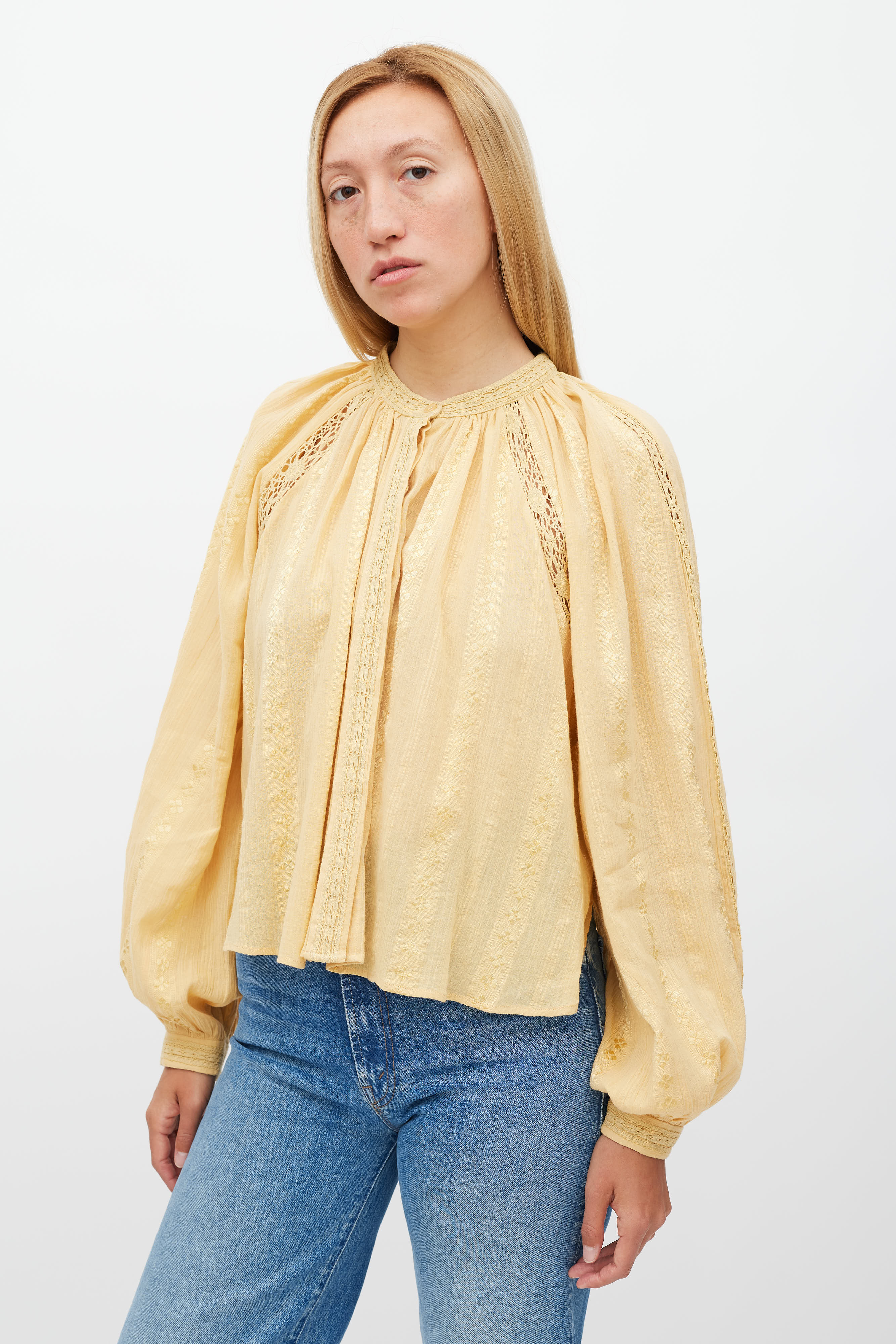 Pre-owned Isabel Marant Étoile yellow Janelle blouse featuring round neckline, eyelet lace and embroidery throughout, bishop sleeves, and concealed button up front.