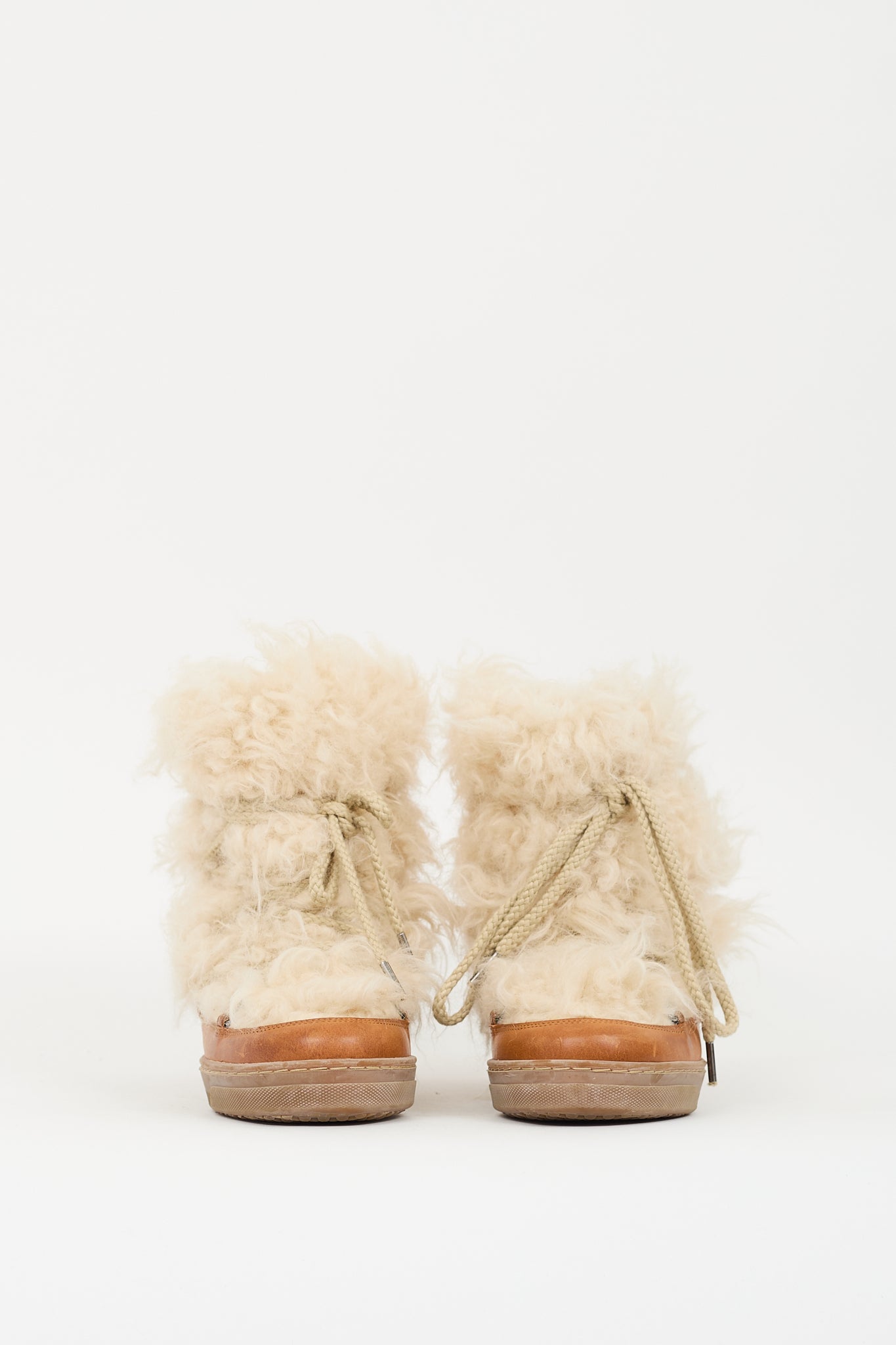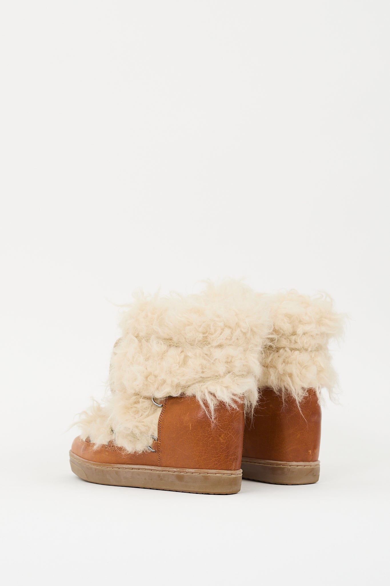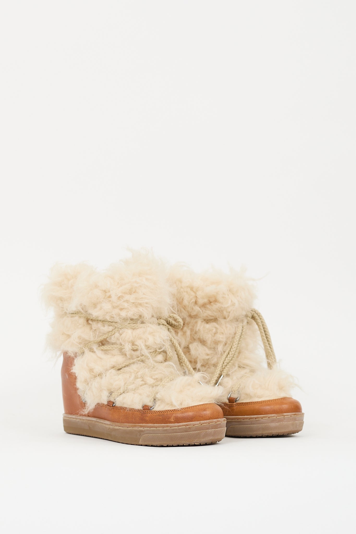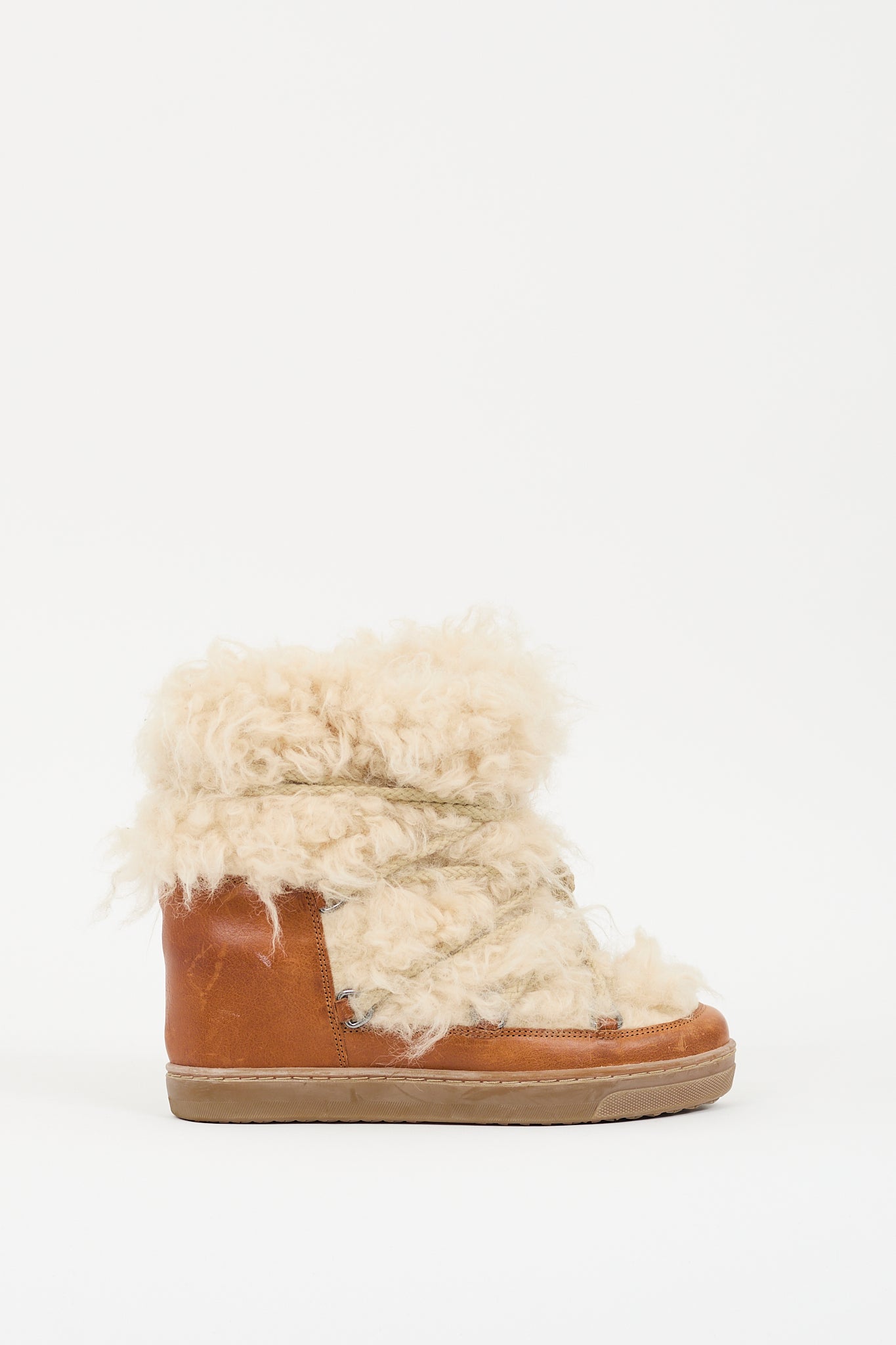 Pre-owned Isabel Marant brown leather and shearling boots featuring rounded toe, cream shearling upper, lace up front, concealed wedge, and gum sole.