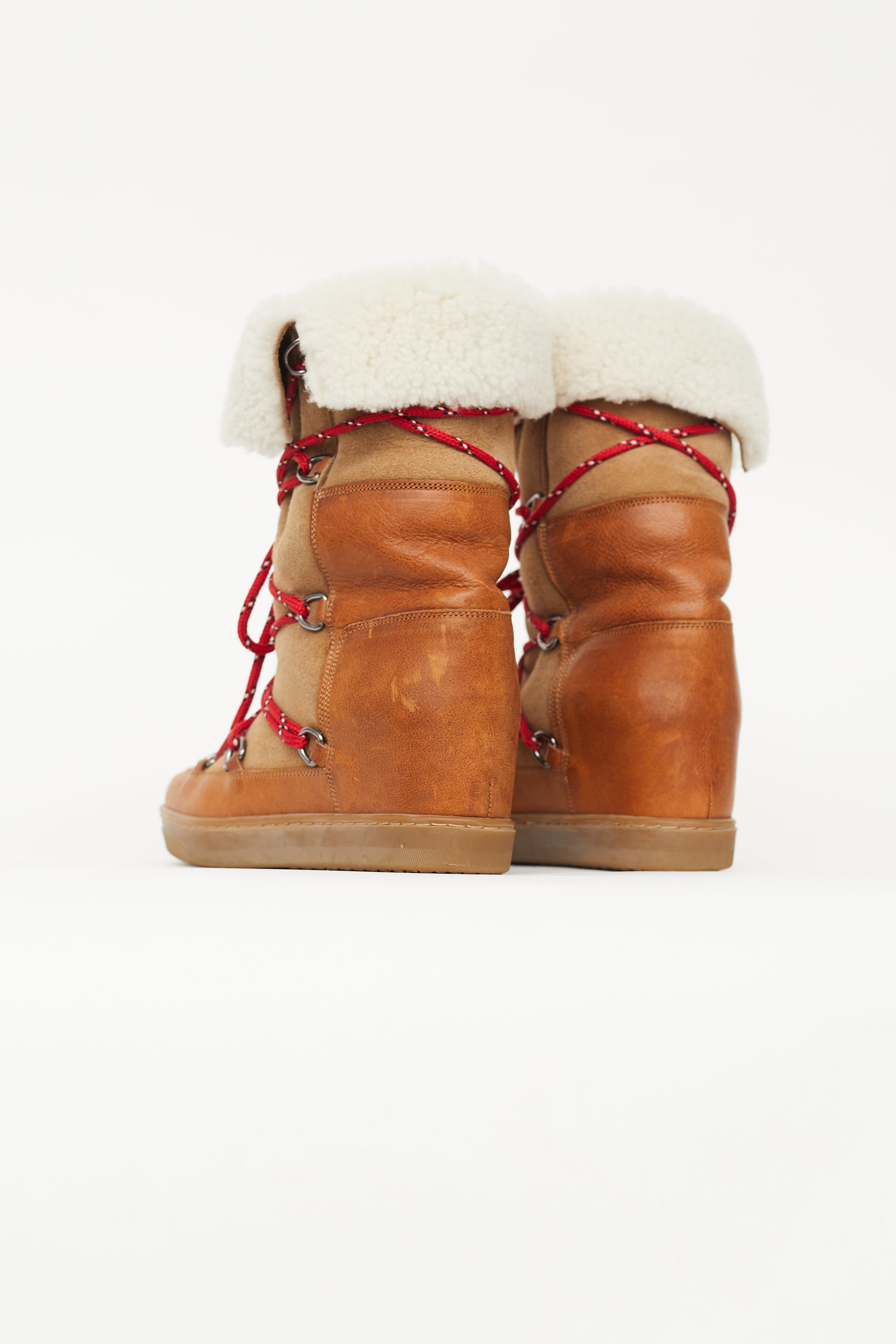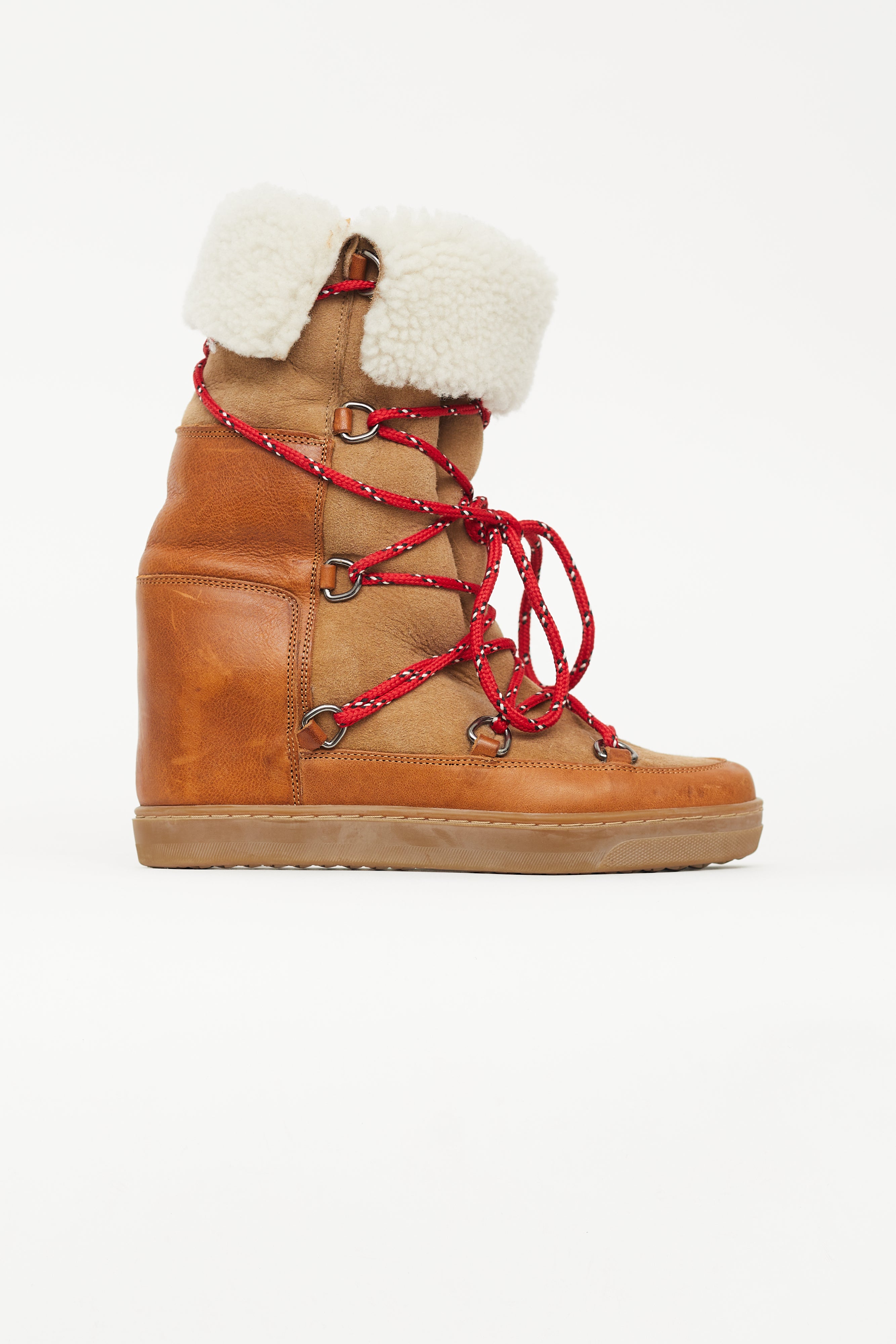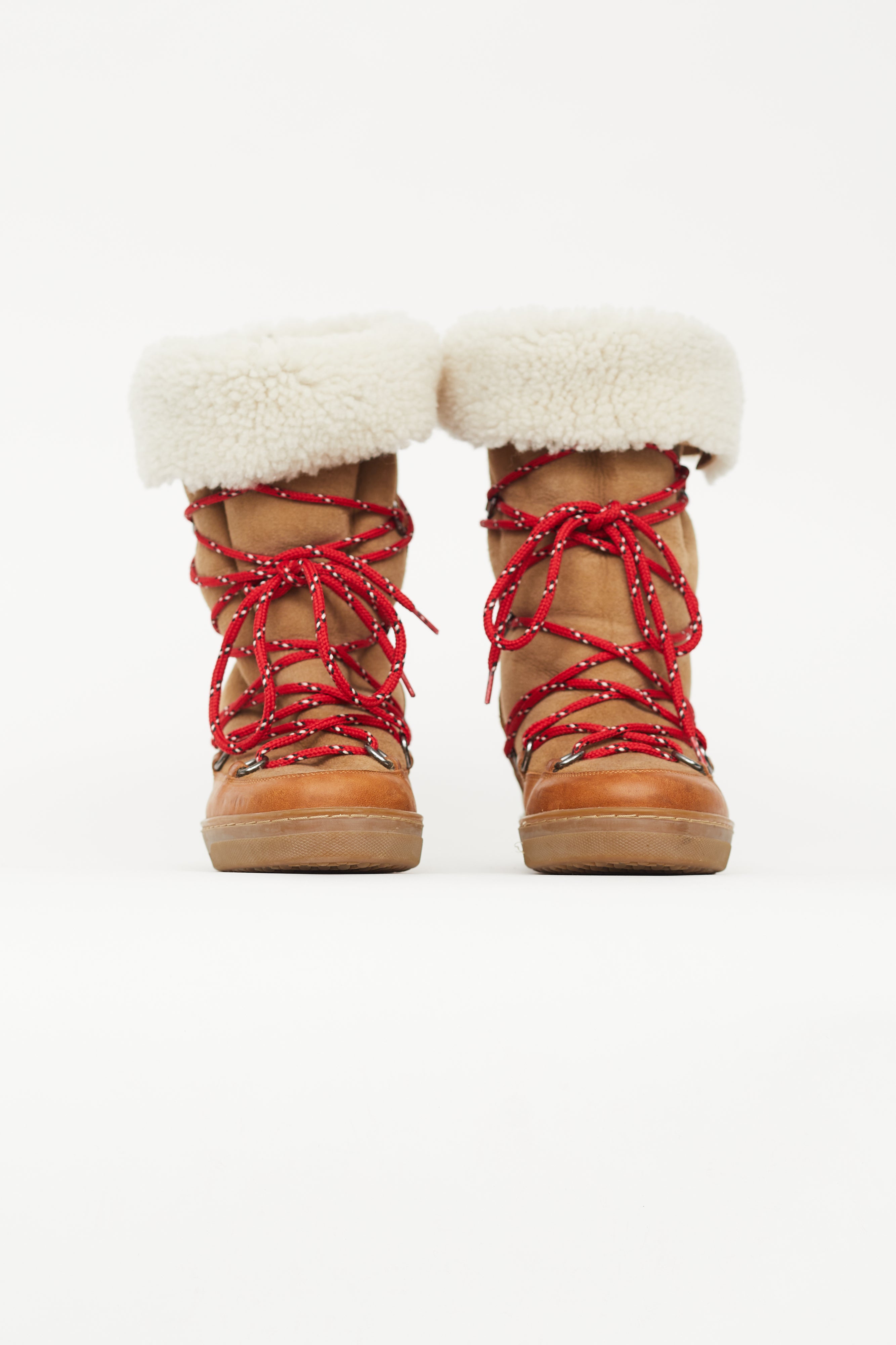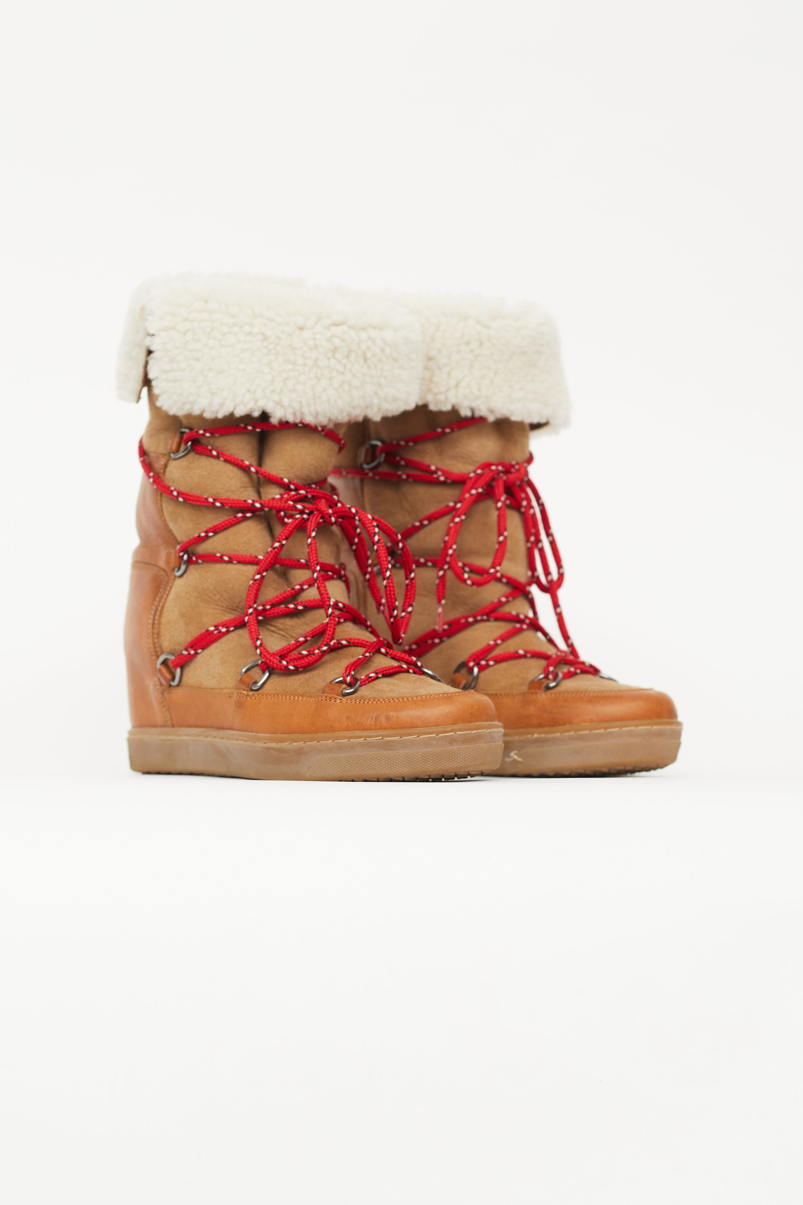 Pre-owned Isabel Marant Nowly boot featuring hidden wedge heel, round toe, treaded rubber sole, red lace up vamp with silver tone hardware, and shearling insole. Comes with extra pair of beige laces and original dust bag.