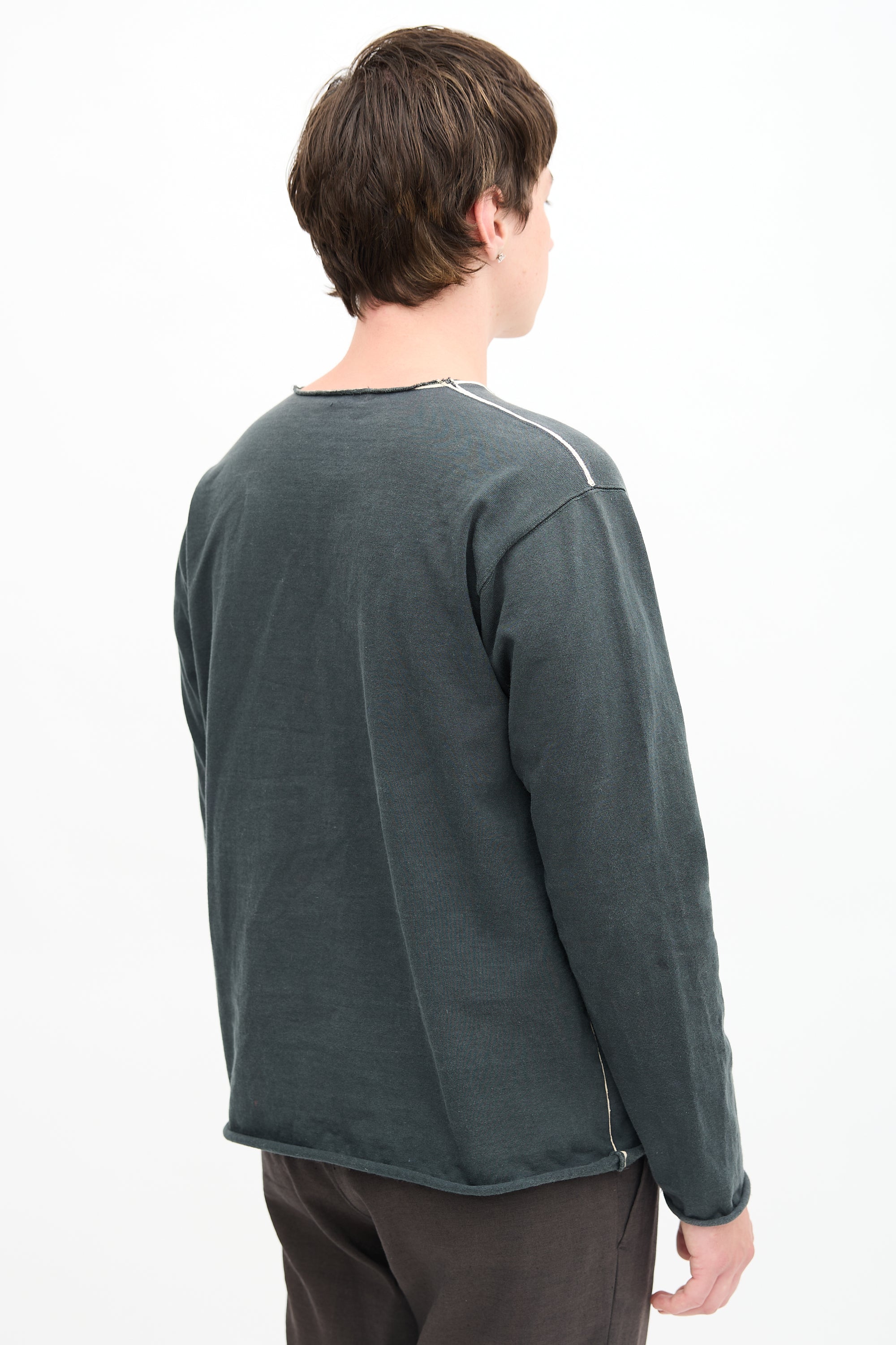 Pre-owned Issey Miyake green sweatshirt featuring round neckline, raw edges, and white stripe trim.