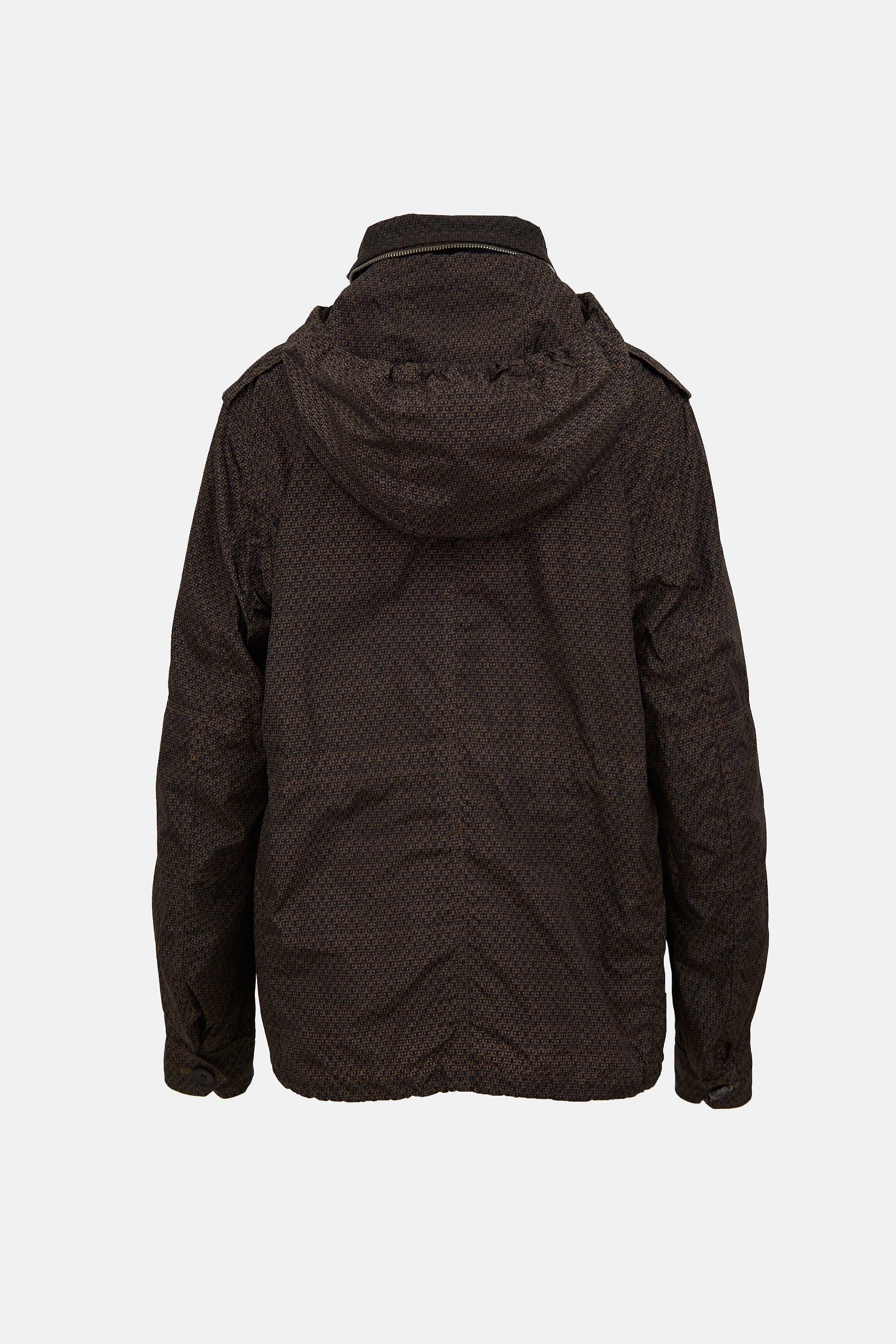 Pre-owned Burberry Brit brown and black rain jacket featuring zip front with button fastening, four cargo pockets, concealed attached hood, elasticized waist, and geometric print throughout.