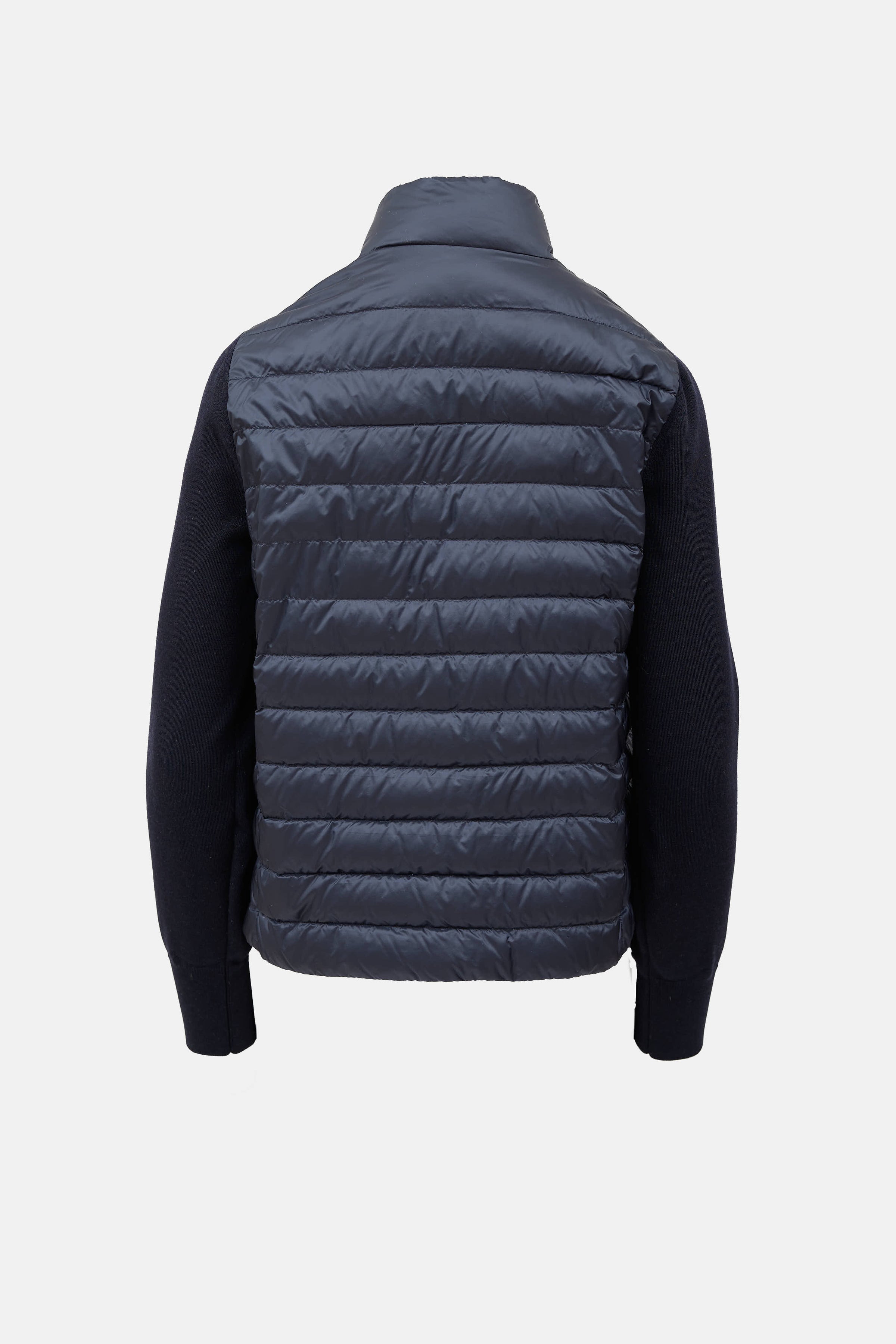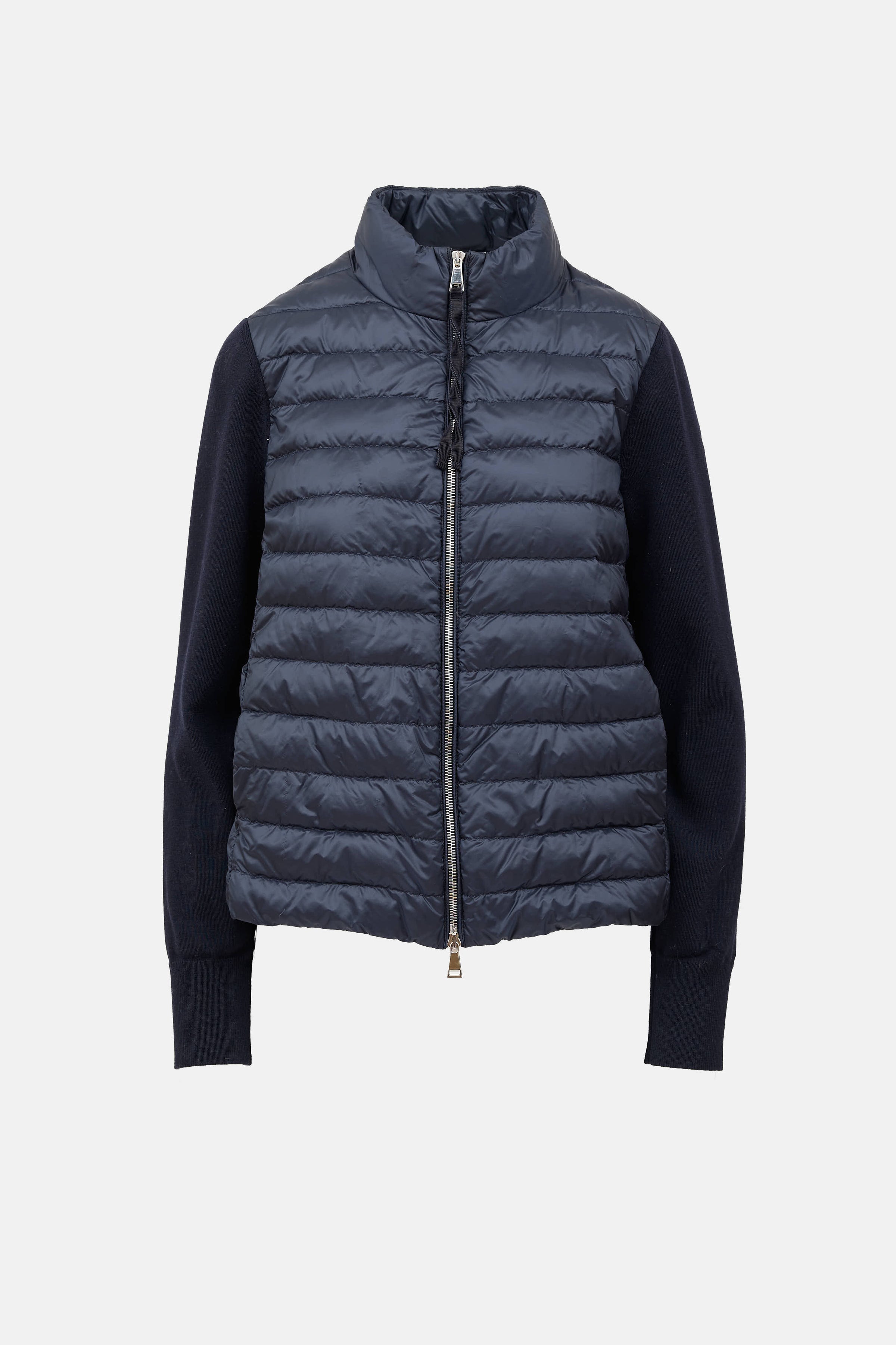 Pre-owned Moncler navy wool Tricot cardigan jacket featuring stand collar, double zip front, knit ribbed sleeves with embroidered logo patch, and slit pockets at side.