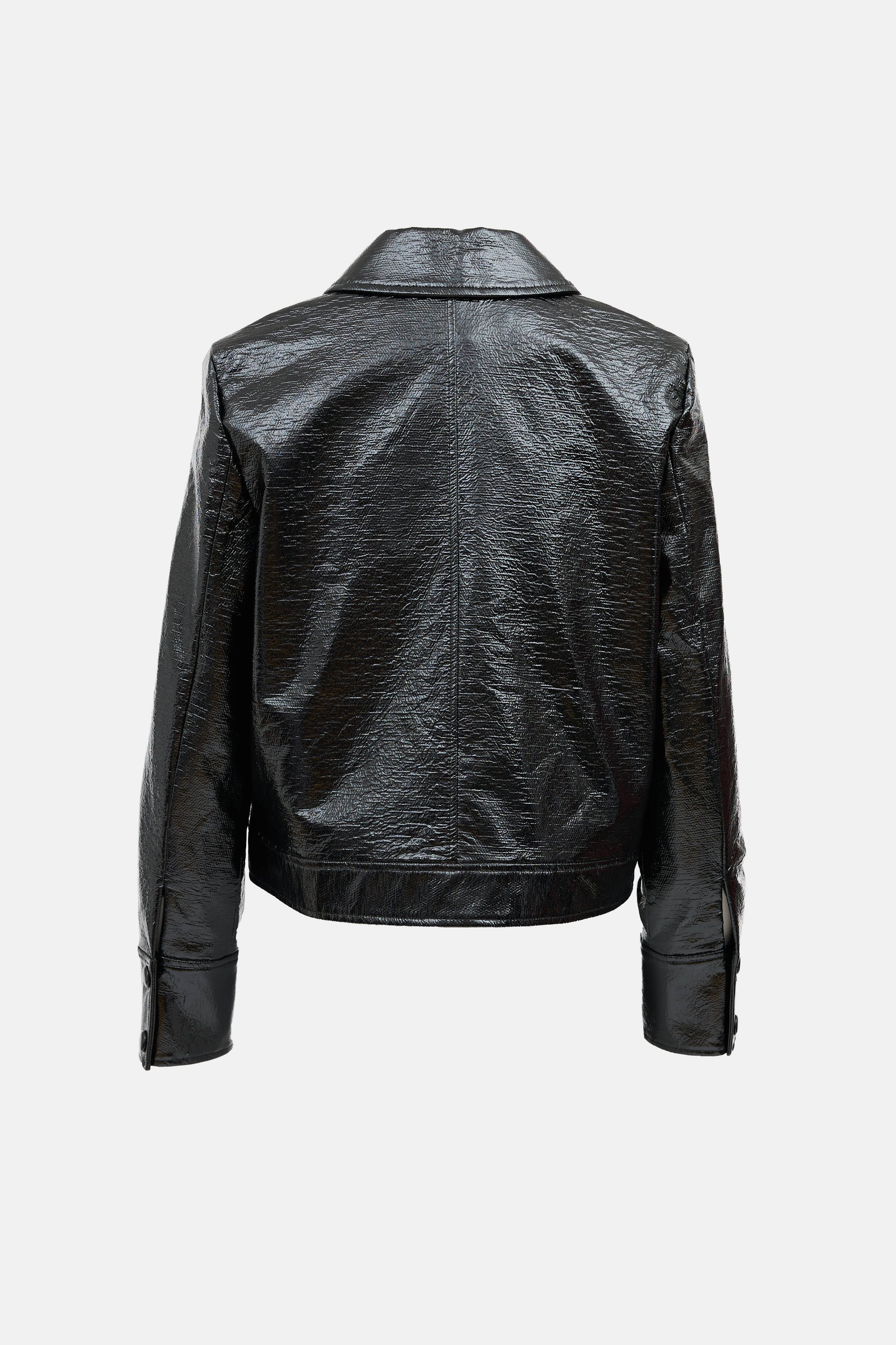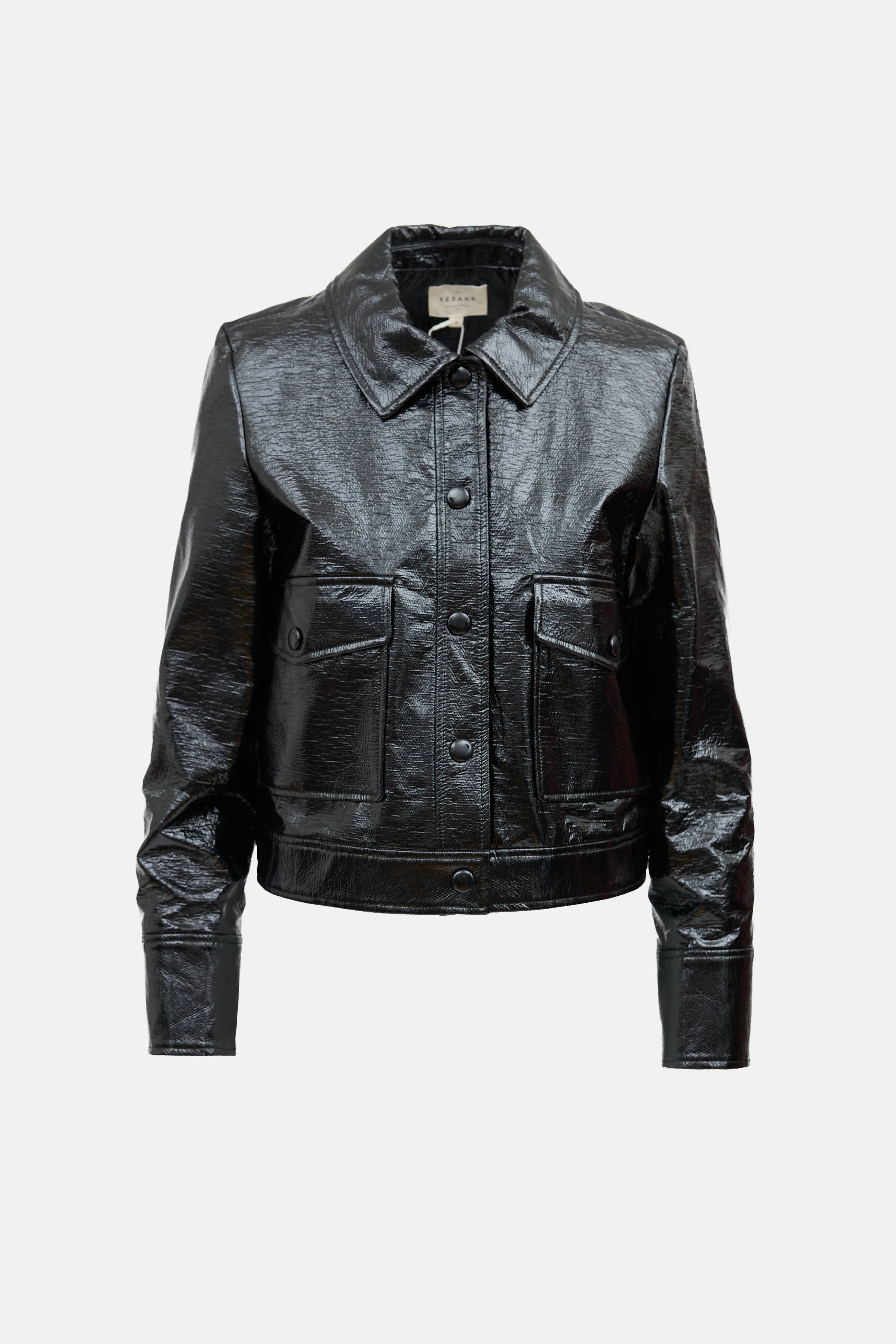 Pre-owned Sézane black Terry jacket featuring pointed collar, snap button closure, two flap pockets with snap button closure at front and buttoned cuffs. Lined.