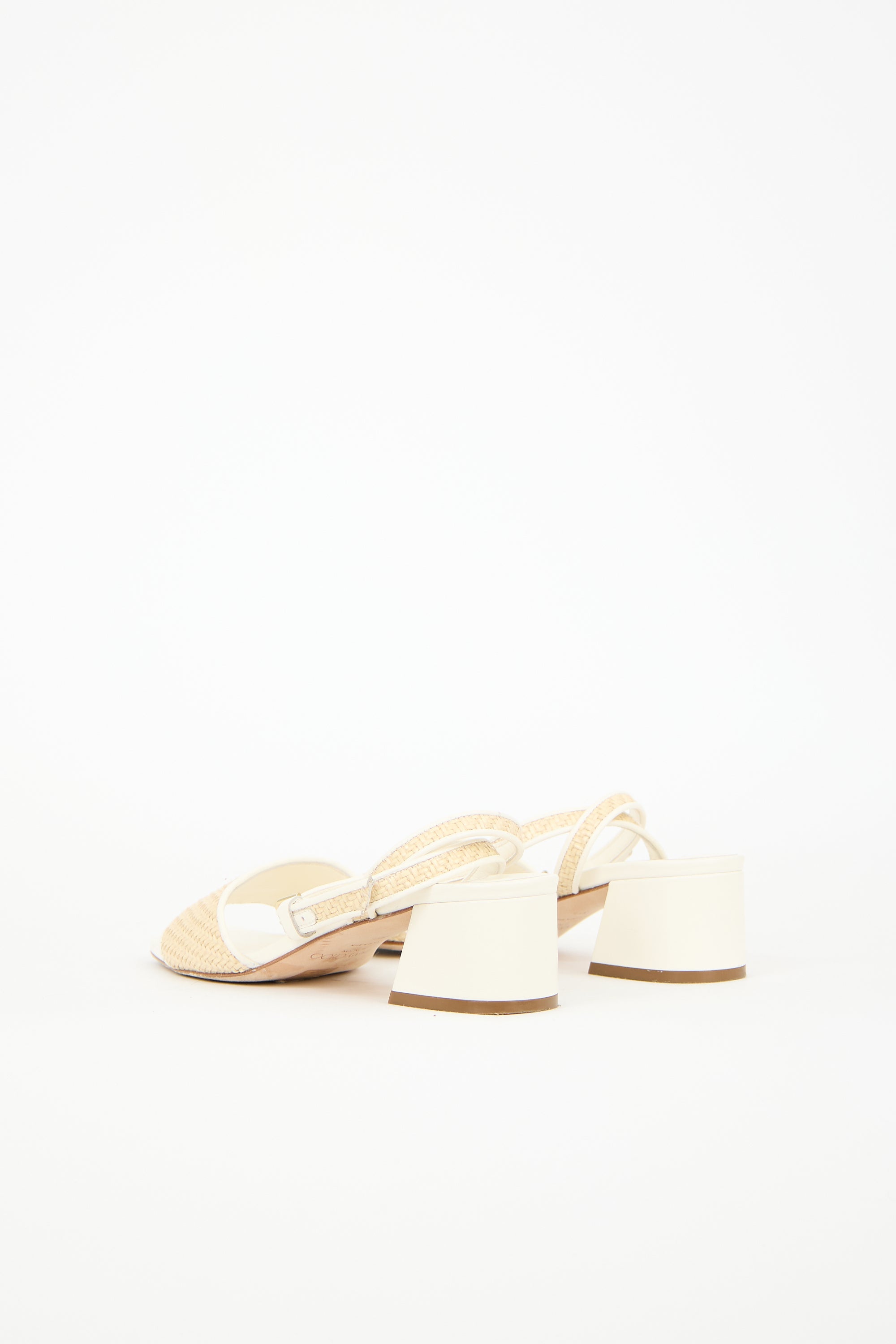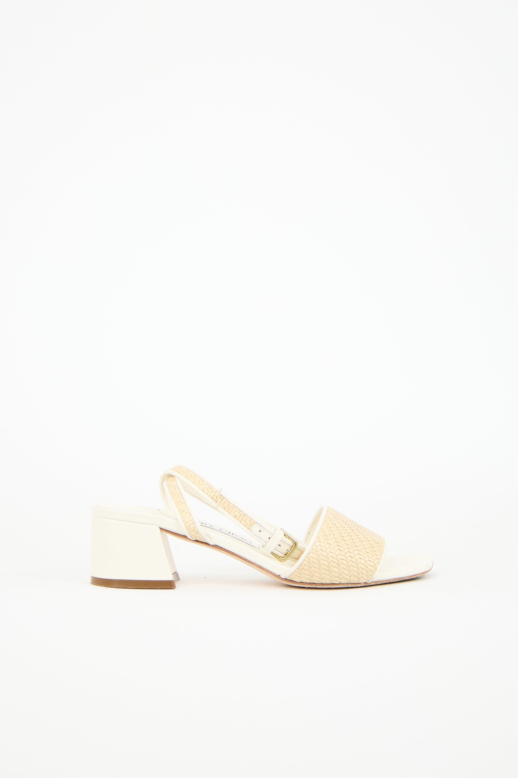 Pre-owned Jimmy Choo cream leather and beige raffia sandals featuring square toe, adjustable ankle strap, and covered block heel. Comes with original dust bag.
