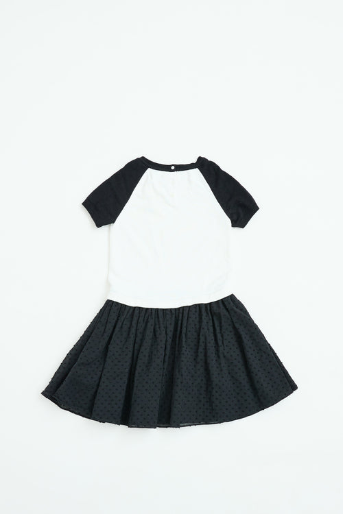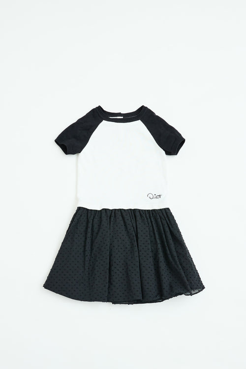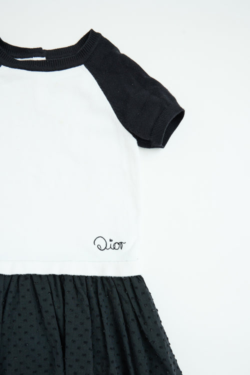 Pre-owned Dior black shirt dress featuring a white panelled bust, round neckline, short raglan sleeves, black embroidered logo at hip, textured skirt, and button up closure at back. Lined.