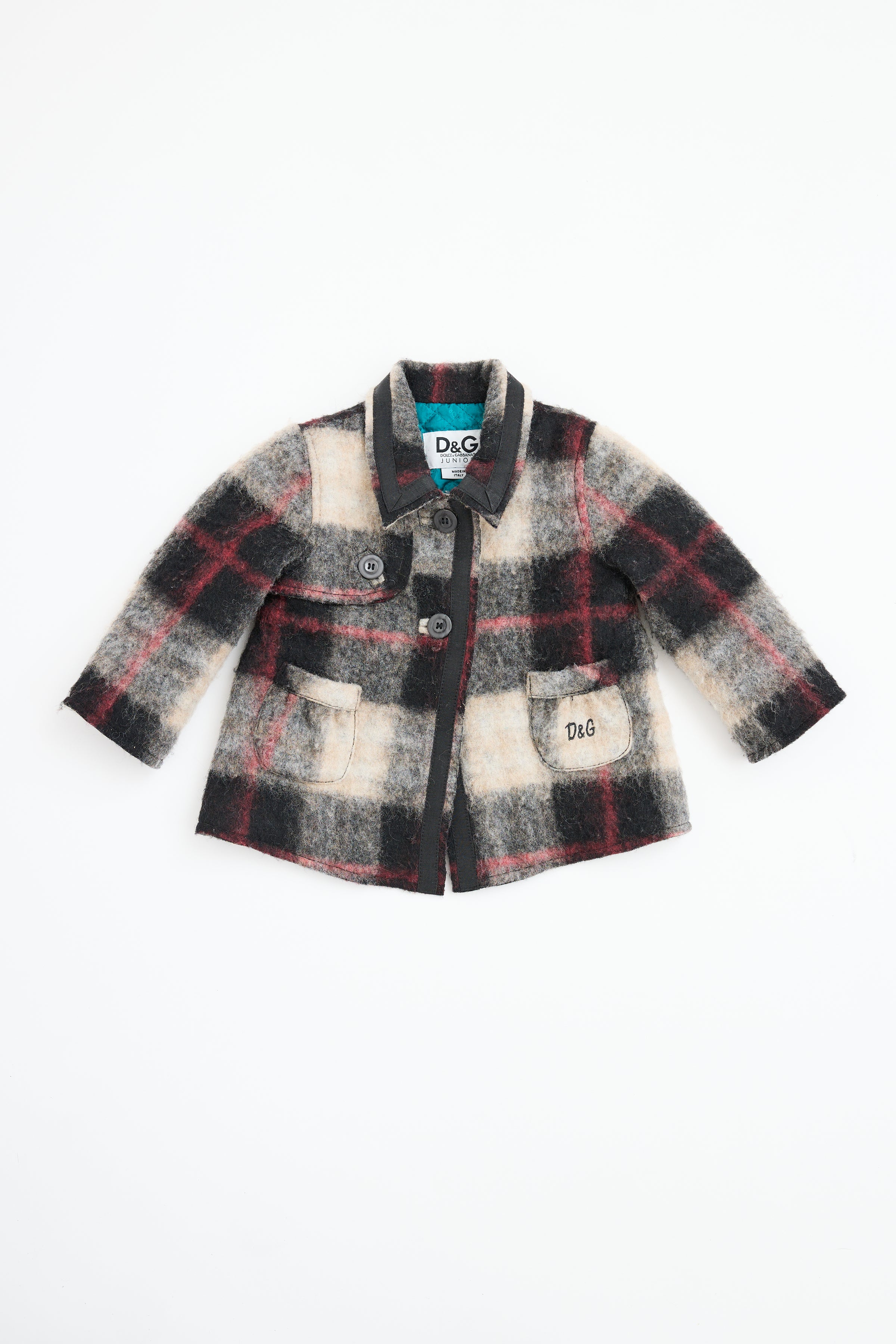 Pre-owned D&G Junior grey and multicolour boucle coat featuring point collar, check print, flap with button closure on chest, button up, dual slip pockets on waist with logo text embroidery and strap detail on back of waist.