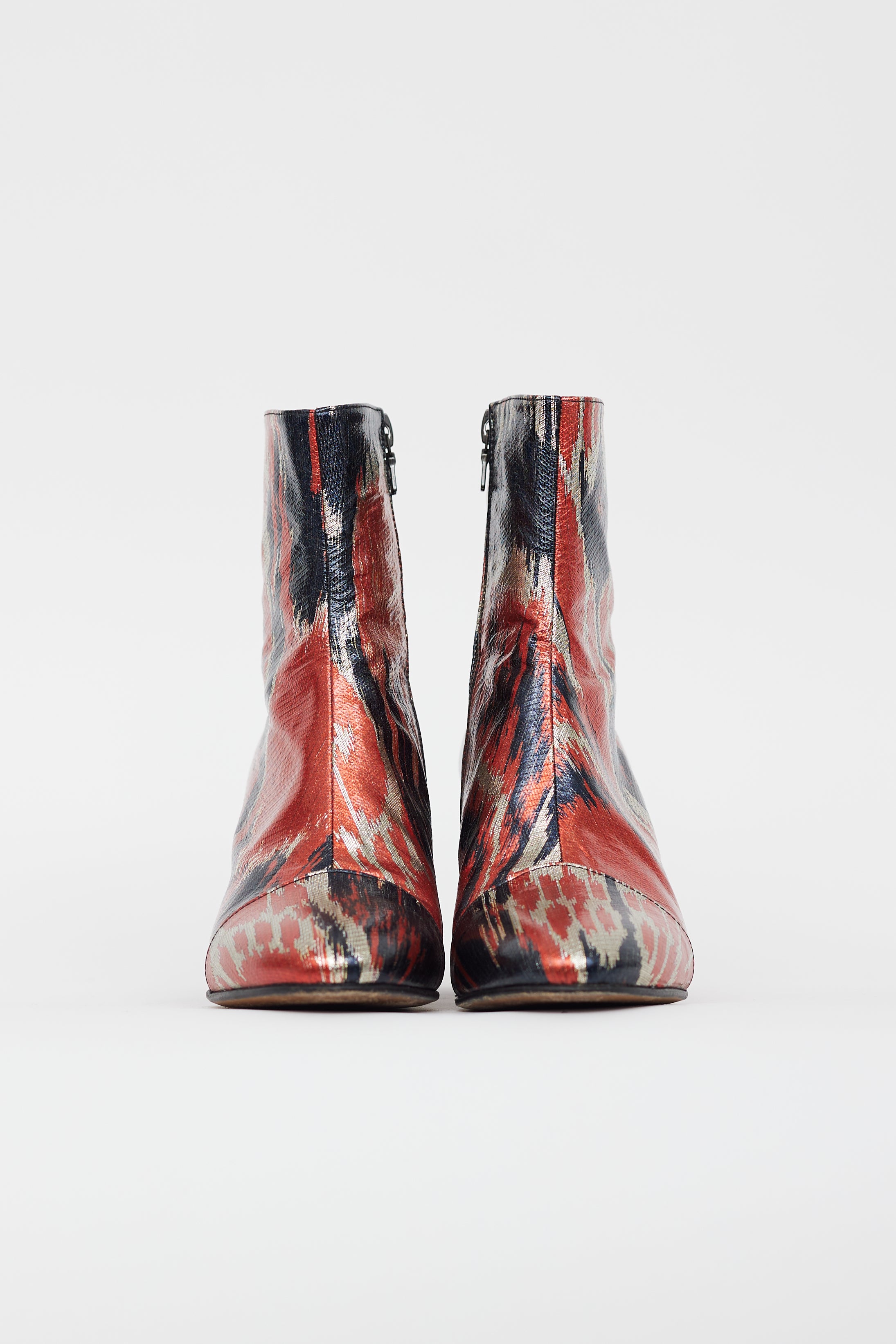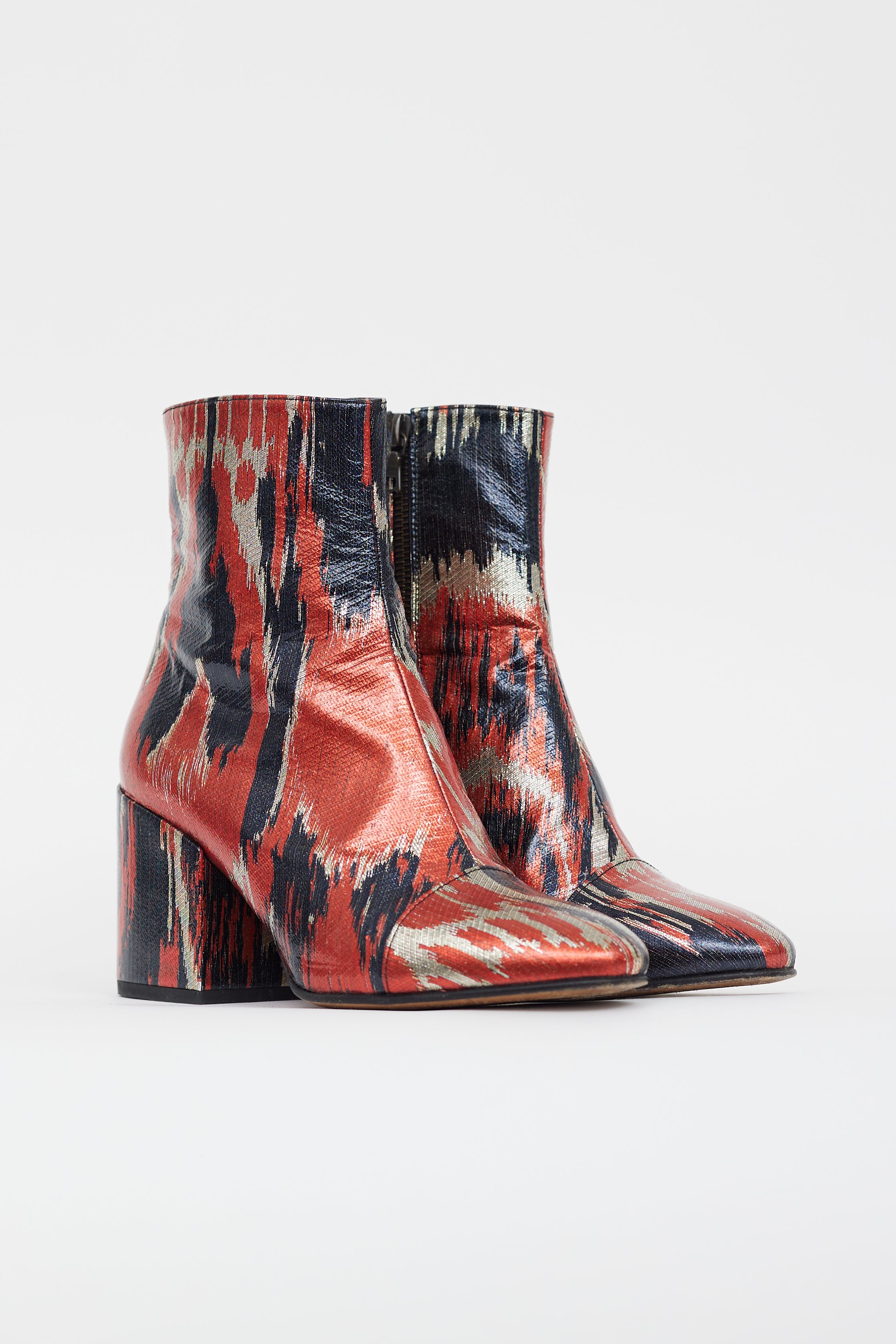 Pre-owned Dries Van Noten red leather boots featuring a multicolour metallic pattern throughout, covered block heel, zip closure at side, pointed toe, and leather insoles.