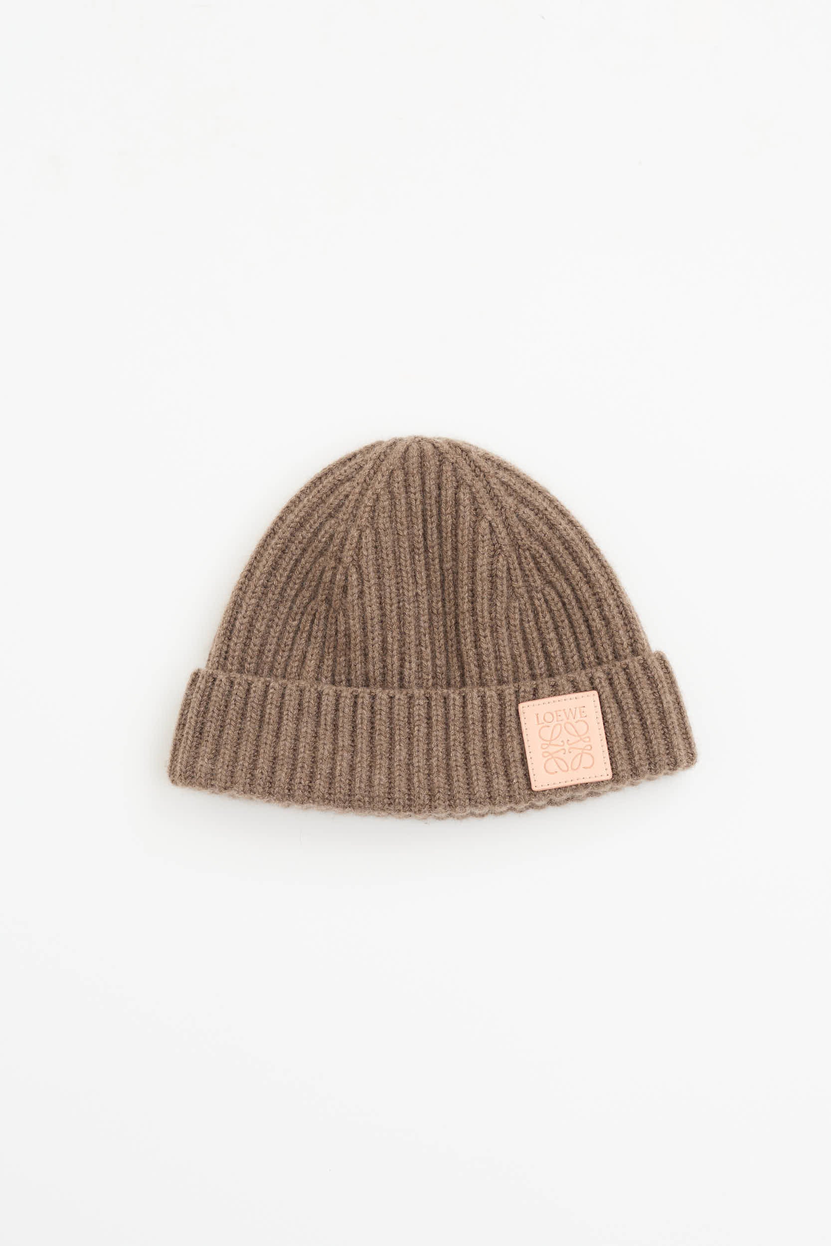 Pre-owned Loewe grey cashmere beanie featuring a brown square leather logo patch, fold over design, and thick ribbed knit.